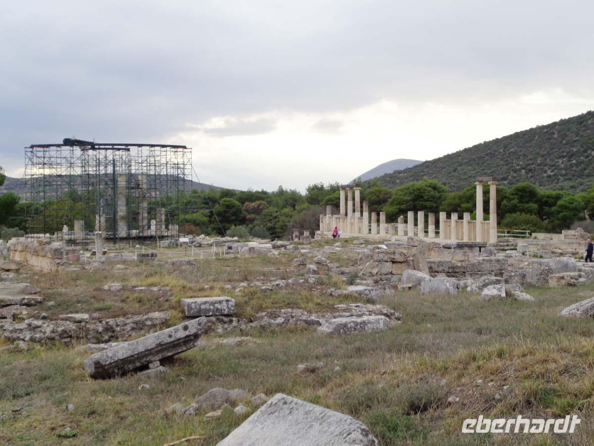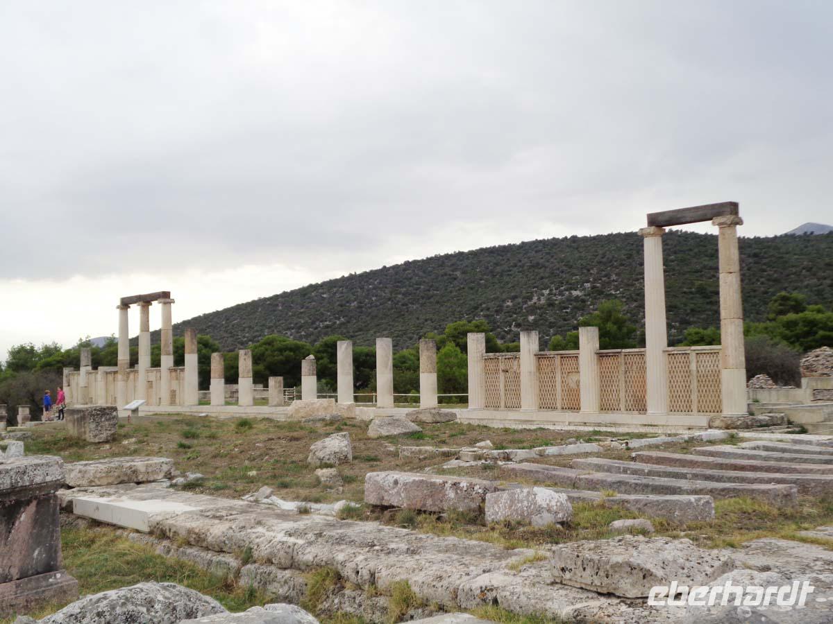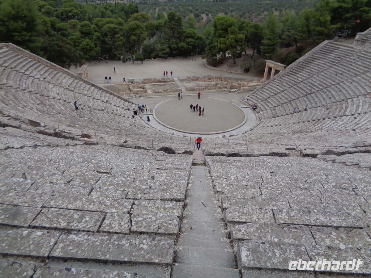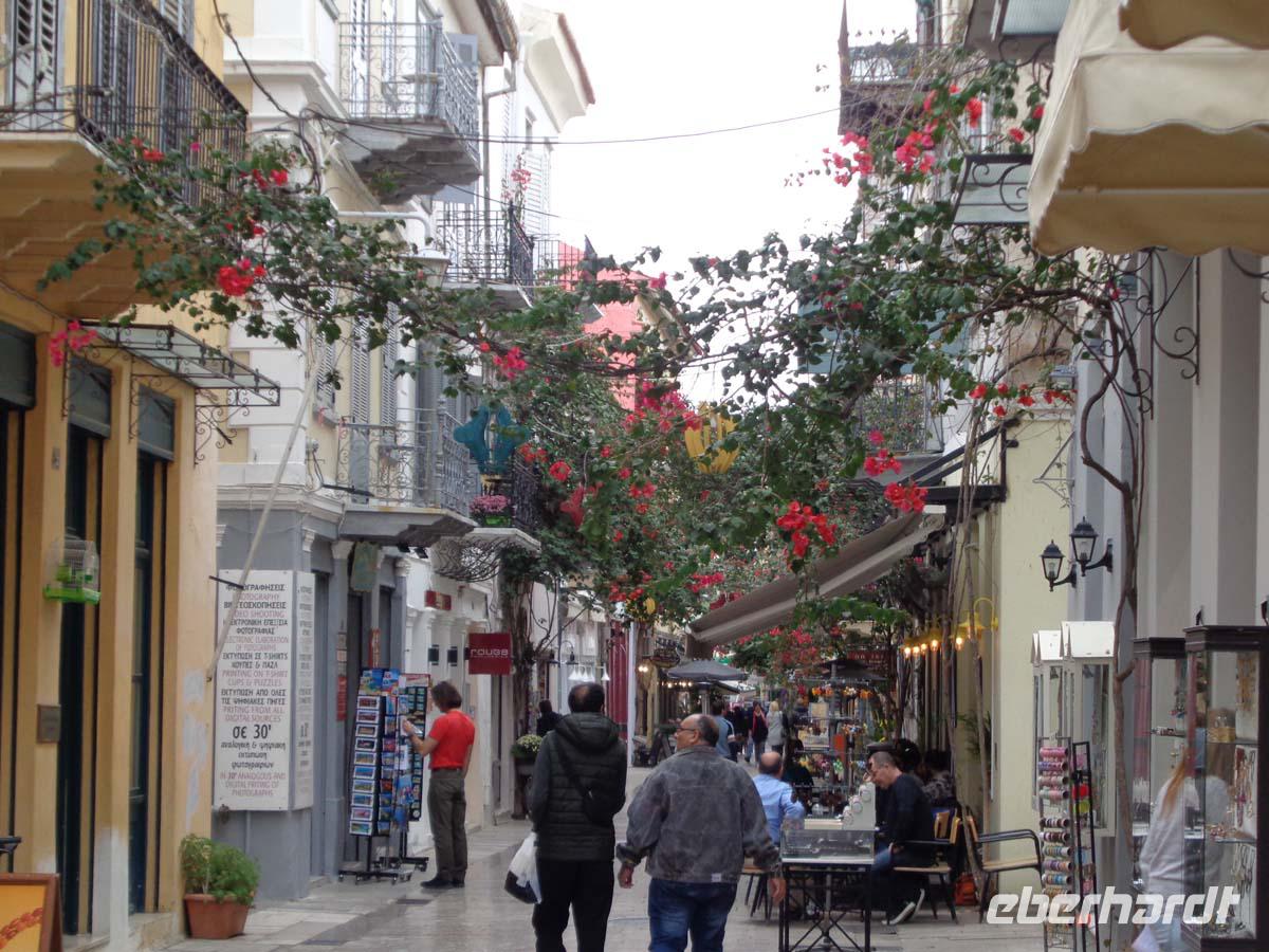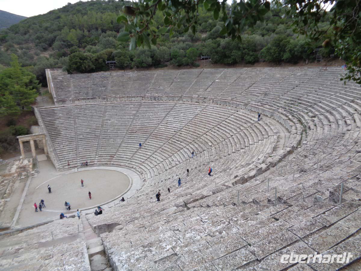 Heute bereisen wir die Argolis, jene Gegend südlich von Athen, deren Hauptort Argos heißt. Wir gehen zeitlich bis in die Bronzezeit zurück, als wir die Stadt Mykene besuchen, deren Blütezeit im 14. Jh. v. Chr. lag, und die wie so vieles andere auch Weltkulturerbe ist. Vor der Stadt liegt das so genannte Schatzhaus des Artreus, welches wir zuerst inspizieren. In Wirklichkeit ist es ein riesiges Fürstengrab, dessen Name ihm vom antiken Reiseberichtschreiber Pausanias gegeben wurde. Der mächtige Tumulus ist beeindruckend. Die Stadt betreten wir durch das weltberühmte Löwentor, und stehen auch gleich vor dem Gräberrund A, den so genannten Königsgräbern aus dem 16 Jh. v. Chr., in denen Heinrich Schliemann u. a. die von ihm so bezeichnete Goldmaske des Agamemnon fand. Weiter geht es hinauf zum Palast, zur ober- und unterirdischen Zisterne, sowie am zweiten Stadttor vorbei. Auch das Gräberrund B, direkt unterhalb des Löwentores nehmen wir in Augenschein und auch die Grabtumuli der Klytaimnestra und des Aigistos aus dem 15. Jh. v. Chr. Wer Muße hat kann noch einen keinen Abstecher zum Museum machen. Unsere Reise führt uns nun in ein idyllisches Städtchen Namens Nauplia. Es wartet mit engen Gassen, malerischen Plätzen und einer gepflegten Hafenpromenade auf. Nauplios, Sohn des Palamedos war Gründer der Stadt, die schon im 7. Jh. v. Chr. eine wichtige Funktion als Hafen von Argos hatte. Vom Hafen aus grüßen uns die gewaltige venezianische Festung Palamidi aus dem 18. Jh., die über 1000 Stufen zu erklimmen ist, so sagt man, und Akronauplia direkt über der Stadt, eine Festungsanlage auf der antiken Akropolis, in ihrer heutigen Gestalt aus dem 13. Jh. Die Venezianer hinterließen der Stadt 1471 zudem die kleine Festung Burdzi vor der Stadt im argolischen Golf. Nach einer Einführung auf dem Verfassungsplatz, der so heißt, weil hier in einer ehemaligen Moschee das erste Parlament Griechenlands nach der Unabhängigkeit tagte, erkundet man die kleine Stadt auf eigene Faust. Restaurants, Tavernen und Cafes, sowie kleine Läden mit diesem und jenem lenken die Blicke der Besucher auf sich. Sehr großen Anklang finden Läden mit einheimischen Pflegeprodukten, Süßigkeiten, Spezereien, Olivenöl und vor allem die vielen Schmuckgeschäfte, für die Nauplia berühmt ist. Der späte Nachmittag hält für uns Epidaurus mit einer Besichtigung des Asklepiosheiligtums bereit. Hierbei begeben wir uns auch in das besterhaltene Theater der antiken Welt. Das bietet Platz für über 12000 Besucher und weist zudem noch die hervorragendste Akustik von allen Theatern auf. Zum Hotel zurück reisen wir die Küstenstraße am saronischen Golf entlang. Auf der kurvigen Strecke bieten sich nach jeder Kehre neue Eindrücke aufs Meer und in die Landschaft.