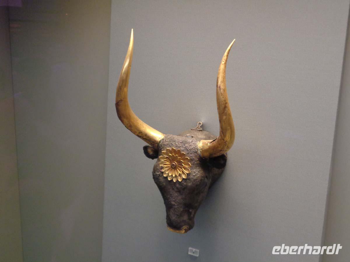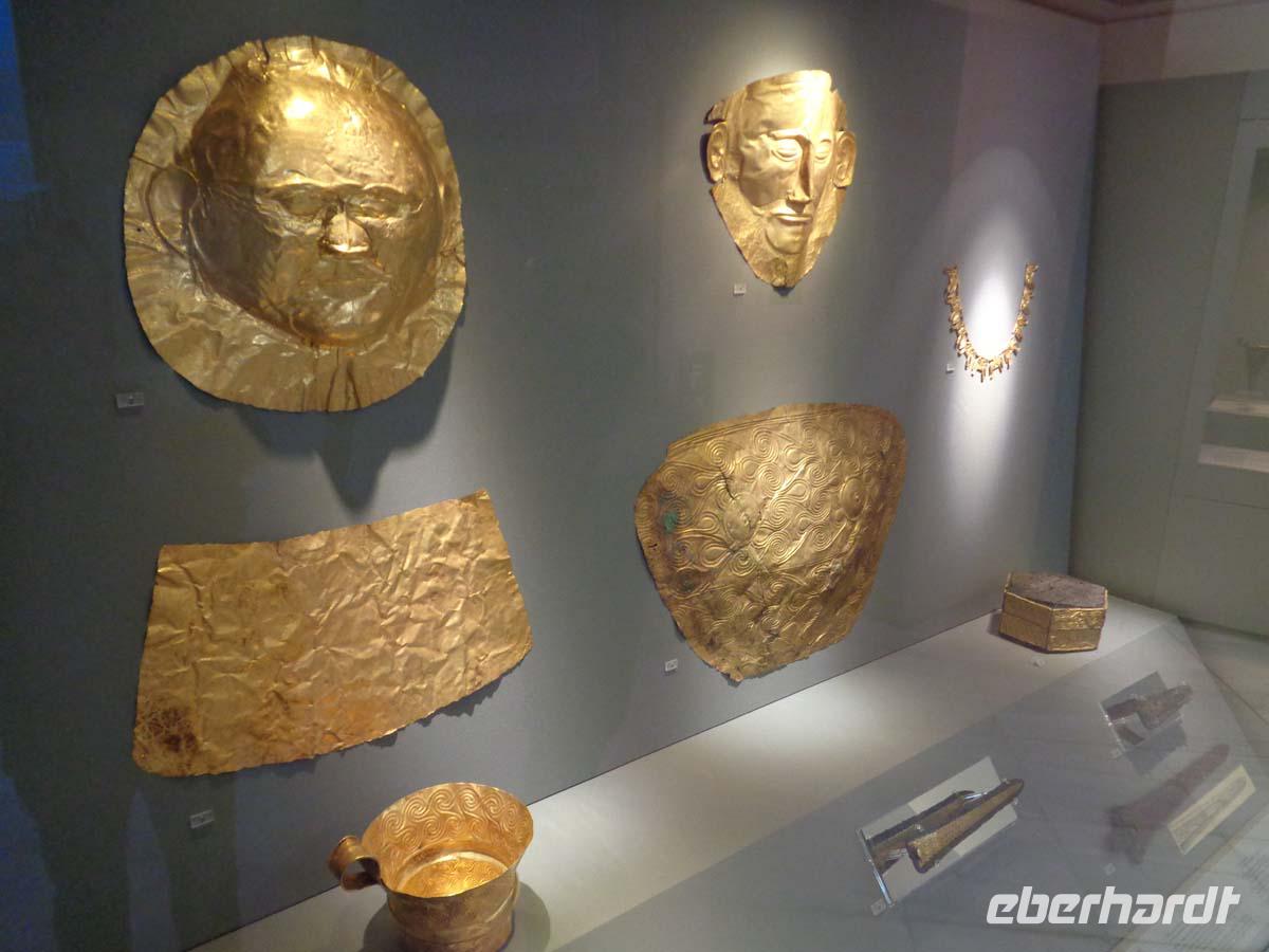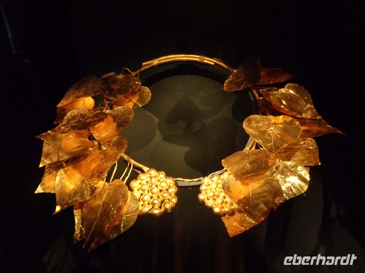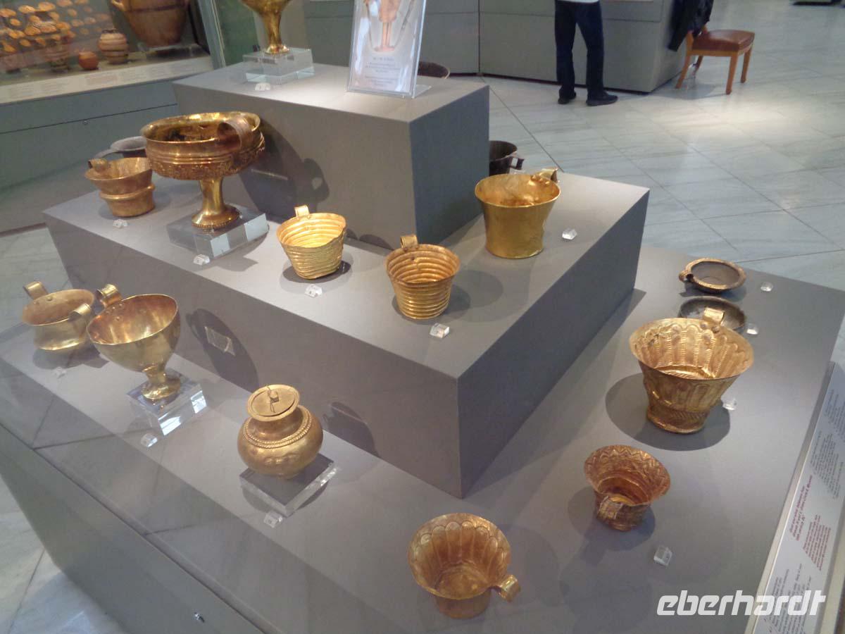 Pella, die alte Hauptstadt des Makedonierreiches steuern wir als erstes Tagesziel an. Von König Archelaos um 410 v. Chr. gegründet, wurde die Stadt zum Geburtsort von Phillip II. und seines Sohnes Alexander dem Großen. 196 v. Chr. durch die Römer zerstört, bedurfte es bis zur Gegenwart, um zahlreiche kostbare Fußbodenmosaiken aus den reichen Villen zu bergen, die wir im ganz neu gebauten Museum unweit der Grabungsstätte bestaunen. Erst ein Bruchteil der riesigen antiken Stätte ist ergraben worden. Und so hat man das Museum sehr großzügig konzipiert; in Erwartung der Dinge, die noch gefunden werden sollen. Die Besichtigung der Königsgräber von Vergina und des dazu gehörigen Museums ist unser nächstes Ziel. Die Anlage beeindruckt allein schon durch ihre Konzeption. Die Fürstengräber, allen voran das ungeplünderte Grab des Makedonierkönigs Phillip II. aus dem 4. Jh. v. Chr. wurden an ihrem ursprünglichen Ort samt Museum unter einem riesigen Tumulus verborgen. Dieser gibt noch heute beredtes Zeugnis davon ab, wie sich die Grabhügel der Mächtigen schon früher in der Landschaft ausnahmen. Die geborgenen Schätze suchen Ihresgleichen. Nach dem Grab von Tut Anch Amun soll es sich bei dem Tumulus Phillips II. um die zweitreichste Bestattung der alten Welt handeln, die bis heute entdeckt wurde. Und in der Tat sind wir geblendet von zentnerweisen Gold- und Silbergegenständen. Das muss man einfach gesehen haben. Leider ist photographieren streng verboten und auch nicht möglich, denn Museumspersonal steht an jeder Ecke. Kein Wunder bei diesen Kostbarkeiten.