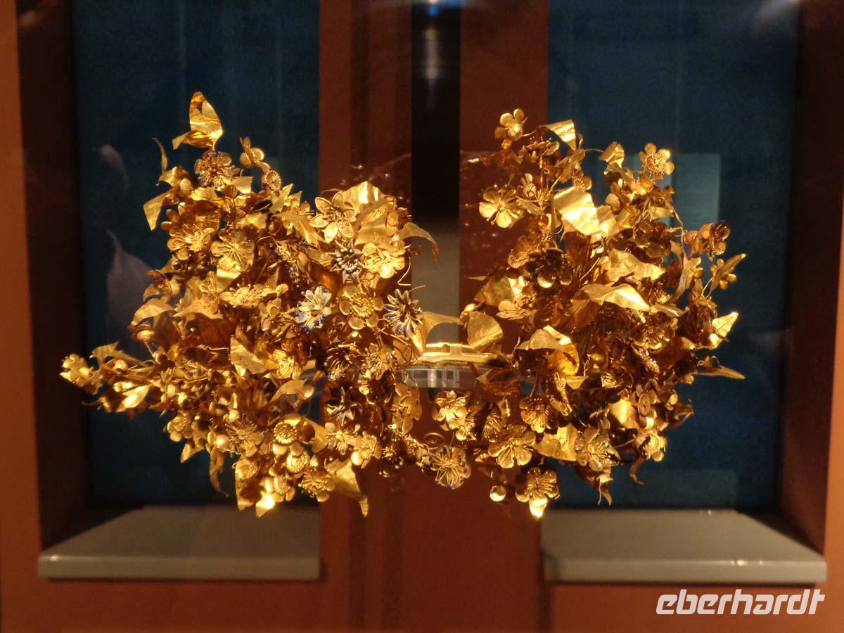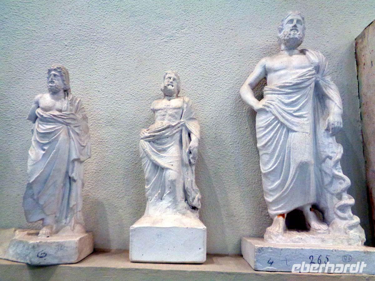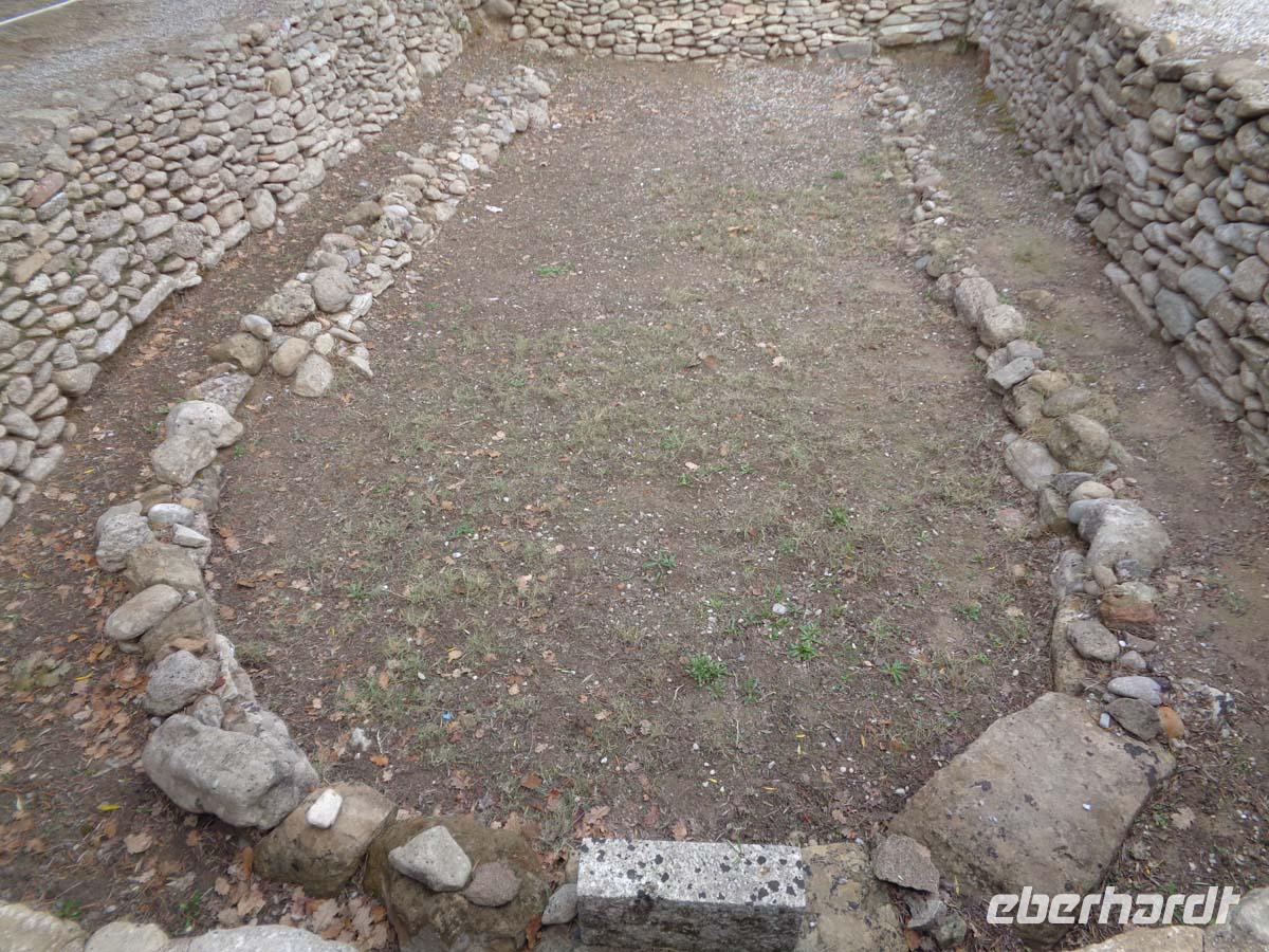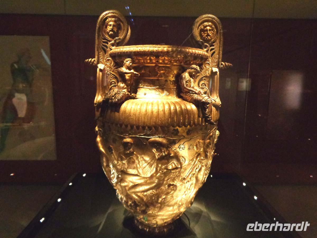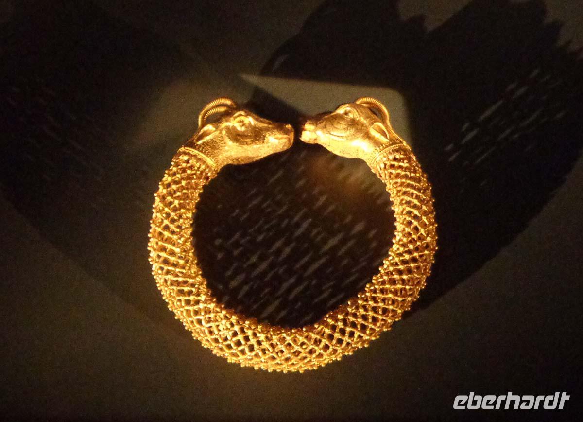 Pella, die alte Hauptstadt des Makedonierreiches steuern wir als erstes Tagesziel an. Von König Archelaos um 410 v. Chr. gegründet, wurde die Stadt zum Geburtsort von Phillip II. und seines Sohnes Alexander dem Großen. 196 v. Chr. durch die Römer zerstört, bedurfte es bis zur Gegenwart, um zahlreiche kostbare Fußbodenmosaiken aus den reichen Villen zu bergen, die wir im ganz neu gebauten Museum unweit der Grabungsstätte bestaunen. Erst ein Bruchteil der riesigen antiken Stätte ist ergraben worden. Und so hat man das Museum sehr großzügig konzipiert; in Erwartung der Dinge, die noch gefunden werden sollen. Die Besichtigung der Königsgräber von Vergina und des dazu gehörigen Museums ist unser nächstes Ziel. Die Anlage beeindruckt allein schon durch ihre Konzeption. Die Fürstengräber, allen voran das ungeplünderte Grab des Makedonierkönigs Phillip II. aus dem 4. Jh. v. Chr. wurden an ihrem ursprünglichen Ort samt Museum unter einem riesigen Tumulus verborgen. Dieser gibt noch heute beredtes Zeugnis davon ab, wie sich die Grabhügel der Mächtigen schon früher in der Landschaft ausnahmen. Die geborgenen Schätze suchen Ihresgleichen. Nach dem Grab von Tut Anch Amun soll es sich bei dem Tumulus Phillips II. um die zweitreichste Bestattung der alten Welt handeln, die bis heute entdeckt wurde. Und in der Tat sind wir geblendet von zentnerweisen Gold- und Silbergegenständen. Das muss man einfach gesehen haben. Leider ist photographieren streng verboten und auch nicht möglich, denn Museumspersonal steht an jeder Ecke. Kein Wunder bei diesen Kostbarkeiten.