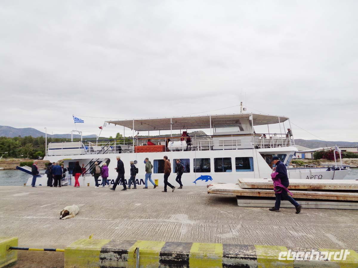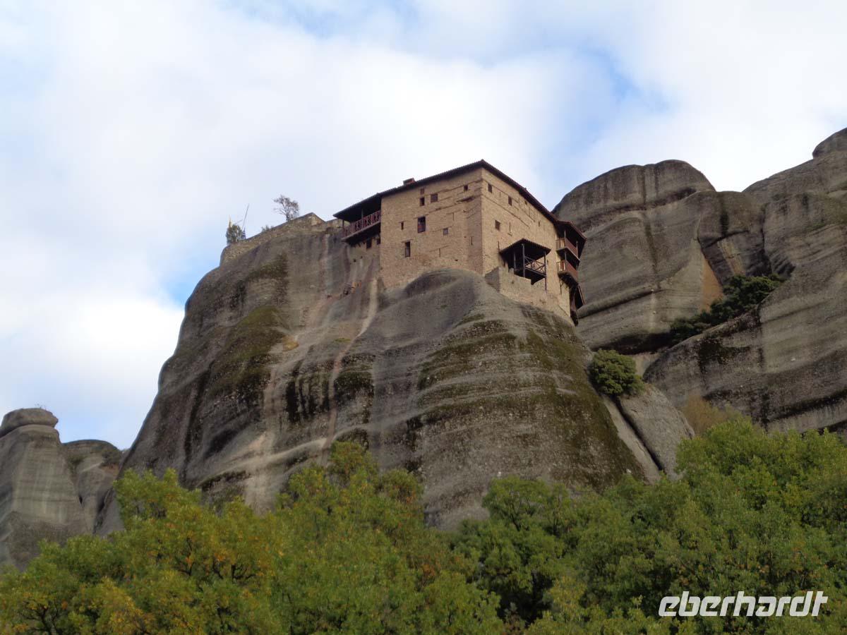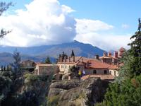 Das Frühstück nehmen wir noch an Bord ein. Im Restaurant sind die Tische für uns schon gedeckt, während die Masse der Reisenden anderer Veranstalter sich im Self-service Bereich drängelt. Zunächst sehen wir die albanische Küste, dann Korfu und bald schon kommt Igoumenitsa in Sicht, eine Stadt, die dem Fährhafen ihre Existenz verdank und von und mit ihm lebt. Hier empfängt uns unsere örtliche Reiseleiterin Anastasia. Wir verlassen Igoumenitsa recht schnell in Richtung Osten. Die Reise geht zunächst nach Dodona, der ältesten bekannten Orakelstätte Griechenlands. Aus dem Rauschen der Blätter einer heiligen Eiche vernahmen die Priester hier die Stimme von Zeus. Nächstes Ziel ist Ioannina. Hier machen wir einen Zeitsprung in die Jahrhunderte, in denen Griechenland zum Osmanischen Reich gehörte (1451 - 1827). In der ummauerten Altstadt wird die Aslan Pascha Moschee mit der Medresse sowie die darunter liegende Osmanische Bibliothek besichtigt. Danach geht es hinauf zur inneren Zitadelle mit dem Normannischen Turm, der Fetije Moschee und dem Ali Pascha Grab. Es bieten sich wunderschöne Ausblicke auf den Pamvotissee mit seiner kleinen Insel und den teils noch verschneiten Gipfeln des Pindos Gebirges. Die Einkehr in das dort vorhandene Cafe schließt den Besuch in Ioannina ab. Tapfer haben wir heute den Regen ertragen und am späten Nachmittag erreichen wir unser erstes Hotel in Kalambaka am Pinios Fluss. Schon von weitem sind die Meteorafelsen über dem Piniostal zu sehen, die alle beeindrucken. Das Hotel liegt direkt unterhalb der mächtigen Felsformation. Von dort oben grüßt uns schon das Kloster St. Stephanou. Das große und reichhaltige Buffet am Abend rundet den ersten Tag auf dem griechischen Festland wohltuend ab.