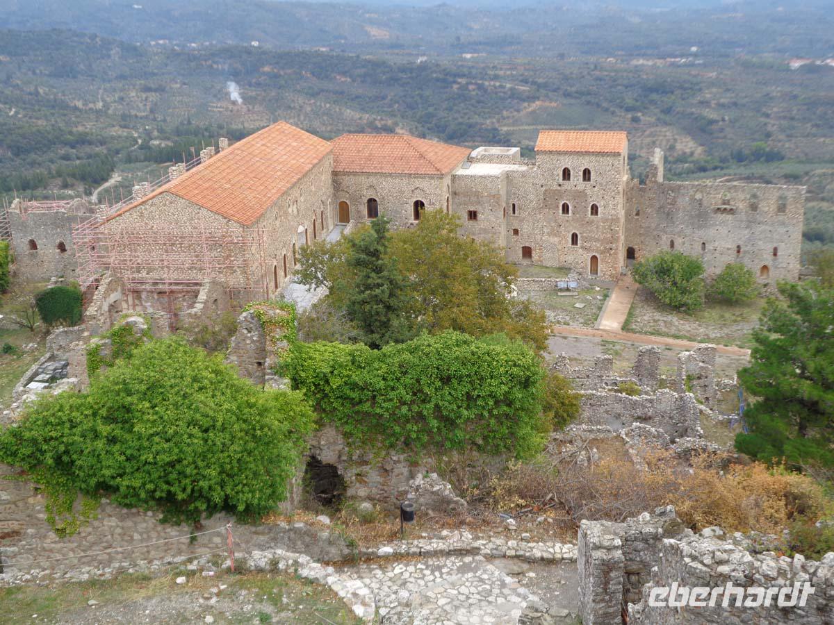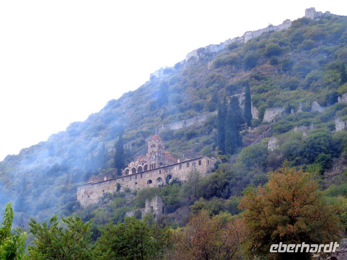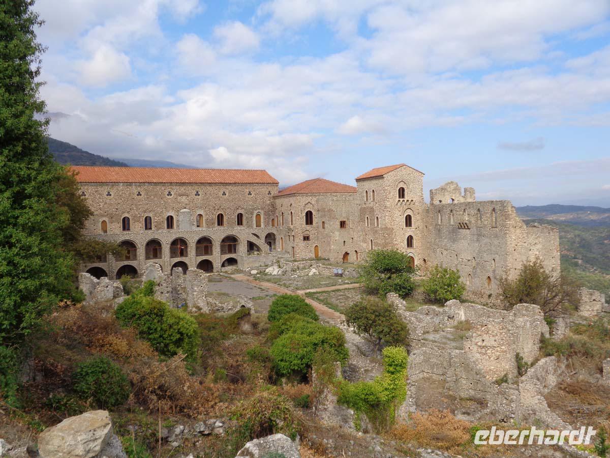 Zunächst zieht es uns heute in die Mitte der Peleponnes. Wir durchqueren die Landschaft von Arkadien und erreichen am späten Vormittag Mistras. Die Besichtigung des mittelalterlichen Mistras ist der heutige Tagespunkt. Es ist die Nachfolgesiedlung des antiken Sparta, das in der Ebene nicht gut zu verteidigen war, und dessen Bewohner sich im Mittelalter in den Schutz einer Burg am Hang des Taigetos-Gebirges ansiedelten, welche vom fränkischen Grafen William II. von Villehardouin 1249 errichtet wurde. Erst Mitte des 19. Jh. siedelten die Menschen nach und nach wieder an die Stelle des antiken Sparta, welches auf Geheiß von König Otto von Bayern neu errichtet wurde. Wir betreten die Anlage durch das obere Burgtor. Danach besichtigen wir die Kirchen Hagia Sophia und St. Nikolaus, lassen uns den Despotenpalst erläutern und besuchen das Pantanassas Kloster, wo die dort lebenden 6 Nonnen den Besuchern Decken und vieles andere selbstgefertigtes anbieten. Die Nonnen sind die einzigen Menschen, die in der verlassenen Ruinenstadt leben. Die letzten Bewohner siedelten in den 30er Jahren in das neu erbaute Sparta um. In diese Stadt, dem Hauptort der Landschaft Lakonien zieht es uns auch. Vom antiken Sparta steht nicht mehr viel. Zum einen nutzte man die Ruinen als Steinbruch zum Bau von Mistras, zum anderen wurde die neue Stadt direkt auf die Reste der antiken gebaut. Aber in Sparta kehren wir in eine Taverne ein und genießen ein gutes Essen im Garten unter Apfelsinenbäumen, und am Stadion grüßt uns überlebensgroß König Leonidas in Bronze. Die Reise zu unserem Hotel führt über den Taigetos Pass. Der Pass geht durch eine atemberaubende Landschaft über enge Kurven, Serpentinen, durch eine wilde Schlucht mit herrlichen Ausblicken und Eindrücken. Hinter dem Gebirge liegt Messenien. Im Hautort Kalamata liegt auch unser Hotel, direkt am messenischen Golf. Hier beschließen wir den Tag an einem guten Abendbüffet.