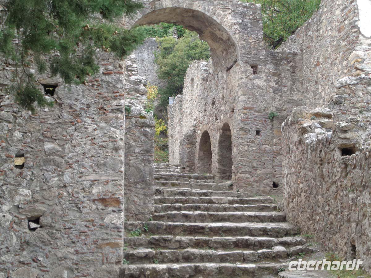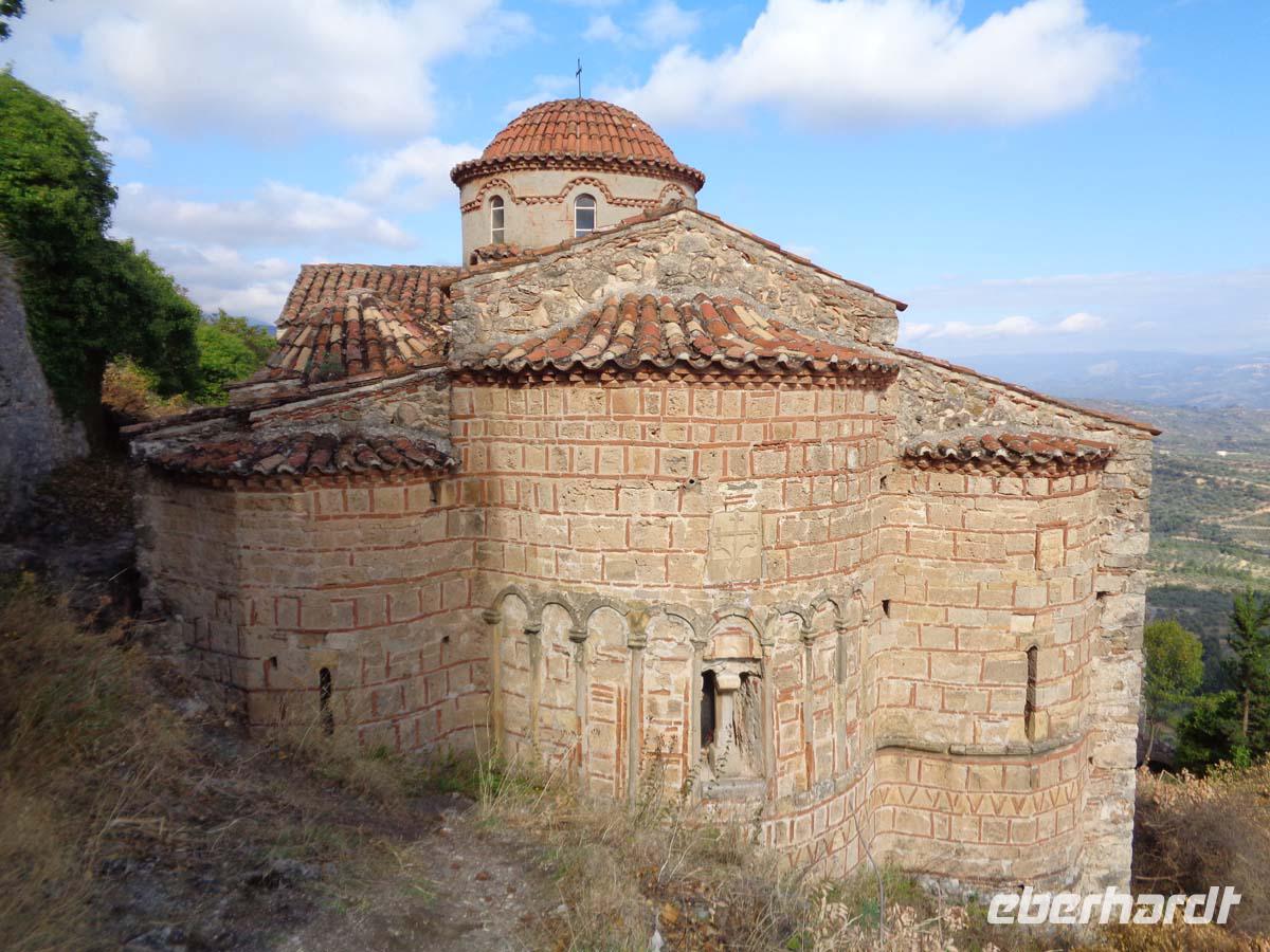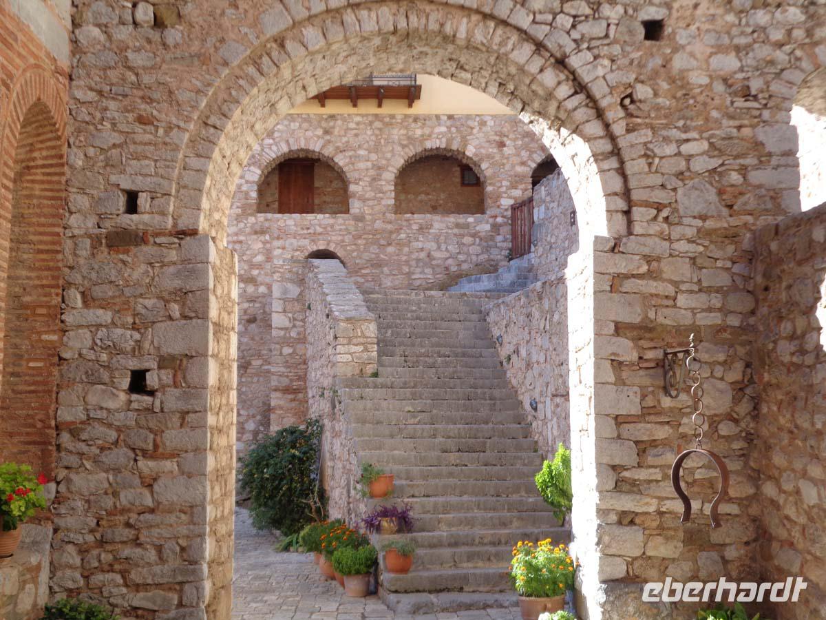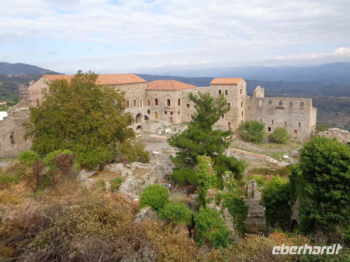 Zunächst zieht es uns heute in die Mitte der Peleponnes. Wir durchqueren die Landschaft von Arkadien und erreichen am späten Vormittag Mistras. Die Besichtigung des mittelalterlichen Mistras ist der heutige Tagespunkt. Es ist die Nachfolgesiedlung des antiken Sparta, das in der Ebene nicht gut zu verteidigen war, und dessen Bewohner sich im Mittelalter in den Schutz einer Burg am Hang des Taigetos-Gebirges ansiedelten, welche vom fränkischen Grafen William II. von Villehardouin 1249 errichtet wurde. Erst Mitte des 19. Jh. siedelten die Menschen nach und nach wieder an die Stelle des antiken Sparta, welches auf Geheiß von König Otto von Bayern neu errichtet wurde. Wir betreten die Anlage durch das obere Burgtor. Danach besichtigen wir die Kirchen Hagia Sophia und St. Nikolaus, lassen uns den Despotenpalst erläutern und besuchen das Pantanassas Kloster, wo die dort lebenden 6 Nonnen den Besuchern Decken und vieles andere selbstgefertigtes anbieten. Die Nonnen sind die einzigen Menschen, die in der verlassenen Ruinenstadt leben. Die letzten Bewohner siedelten in den 30er Jahren in das neu erbaute Sparta um. In diese Stadt, dem Hauptort der Landschaft Lakonien zieht es uns auch. Vom antiken Sparta steht nicht mehr viel. Zum einen nutzte man die Ruinen als Steinbruch zum Bau von Mistras, zum anderen wurde die neue Stadt direkt auf die Reste der antiken gebaut. Aber in Sparta kehren wir in eine Taverne ein und genießen ein gutes Essen im Garten unter Apfelsinenbäumen, und am Stadion grüßt uns überlebensgroß König Leonidas in Bronze. Die Reise zu unserem Hotel führt über den Taigetos Pass. Der Pass geht durch eine atemberaubende Landschaft über enge Kurven, Serpentinen, durch eine wilde Schlucht mit herrlichen Ausblicken und Eindrücken. Hinter dem Gebirge liegt Messenien. Im Hautort Kalamata liegt auch unser Hotel, direkt am messenischen Golf. Hier beschließen wir den Tag an einem guten Abendbüffet.
