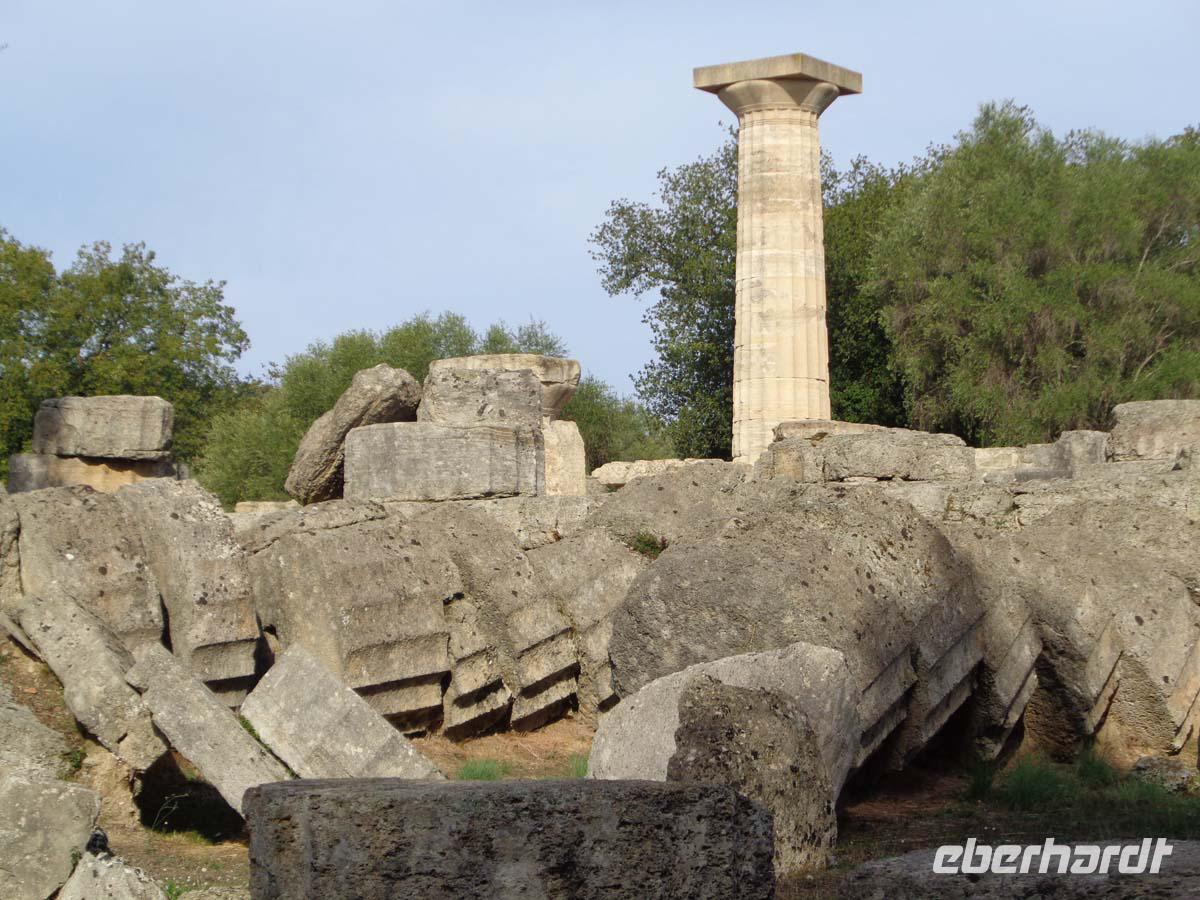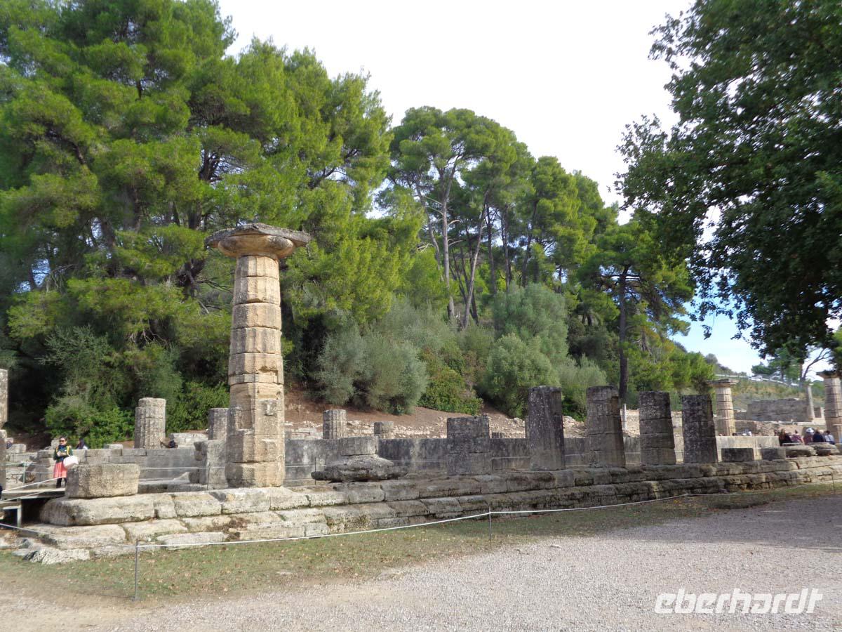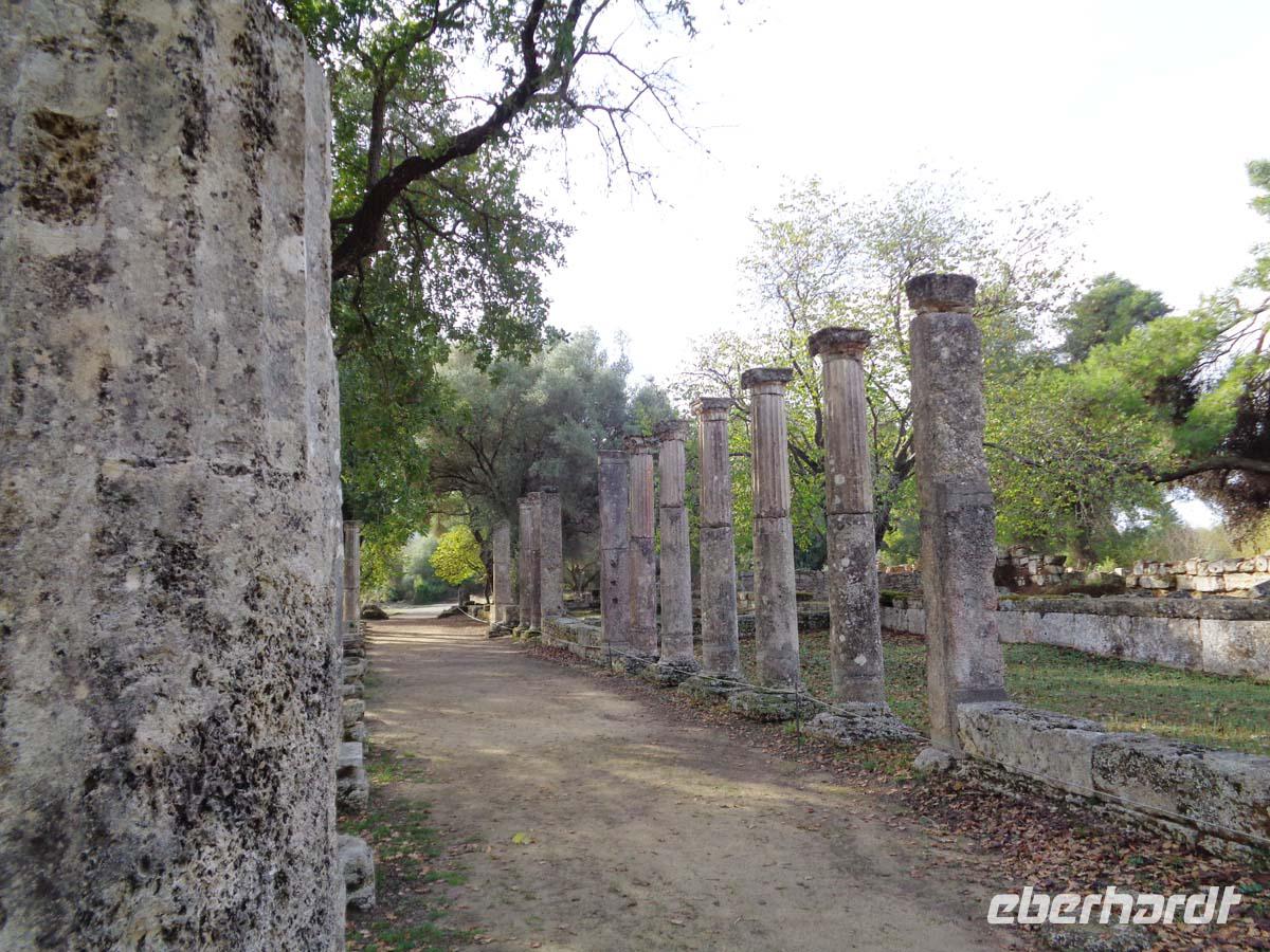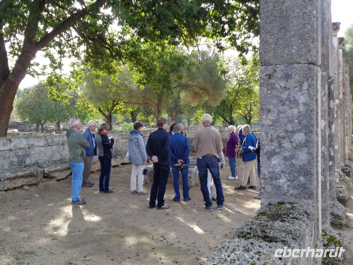 Mit der Besichtigung von Olympia geht unser Aufenthalt in Griechenland langsam dem Ende entgegen. Die Führung beginnt am Gymnasion, der Übungsstätte für die Atlethen und führt uns an der Basilika vorbei, die wohl vormals die Werkstatt des Bildhauers Phidias war, welcher hier die Tempelstatue anfertigte. Nach dem Leonidaion, einem Gästehaus und römischen Thermen gelangen wir in den heiligen Bezirk mit dem Zeustempel. Danach geht es weiter ins Stadion und am Standort der Schatzhäuser vorbei. Das riesige Stadion bot Platz für 45000 Menschen. Wir sehen einen prähistorischen Hausgrundriss aus dem frühen 3. Jt. V. Chr. , bevor es zum Heraaltar geht, auf dem auch heute noch das olympische Feure entzündet wird. Am Heratempel vorbei wird noch der Tholos des Phillippeions, wie auch die Palästra auf dem Rückweg in Augenschein genommen. Der Weg führt uns weiter zum Museum, wo neben vielen anderen Exponaten vor allem die hervorragende Plastik des Hermes mit Dionysosknaben vom Bildhauer Phidias zu bestaunen ist. Man weiß aus anderen Beispielen, dass der kleine Gott des Weines und Besäufnisses begierig nach den Weintrauben greifen will, welche der Hermes in der leider verlorenen Hand hält. Die Plastik datiert um 330 v. Chr. und staunend denkt man: Selbst Michelangelo konnte so etwas nicht übertreffen! Am frühen Nachmittag reisen wir nach Patras, wo wir von der Fähre aus noch einen guten Überblick in die Straßen der Stadt haben. Die Verabschiedung von unserer Reiseleiterin Anastasia kann herzlicher nicht sein. Noch längere Zeit grüßt uns die gewaltige Konstruktion der 2250 m langen Schrägseilbrücke, die hier seit 2004 die Peleponnes mit dem Festland verbindet.