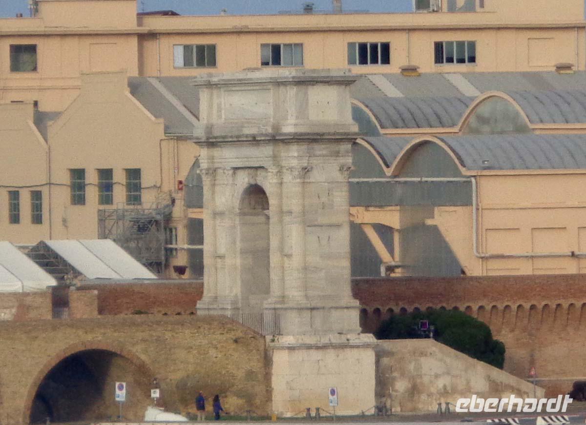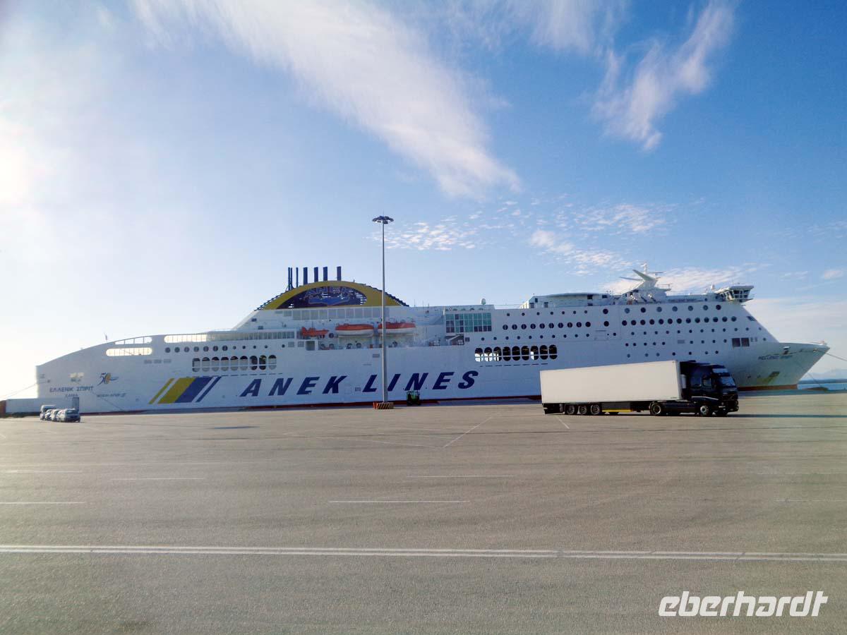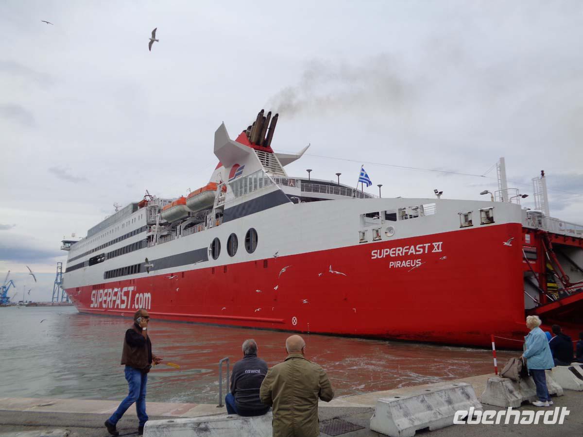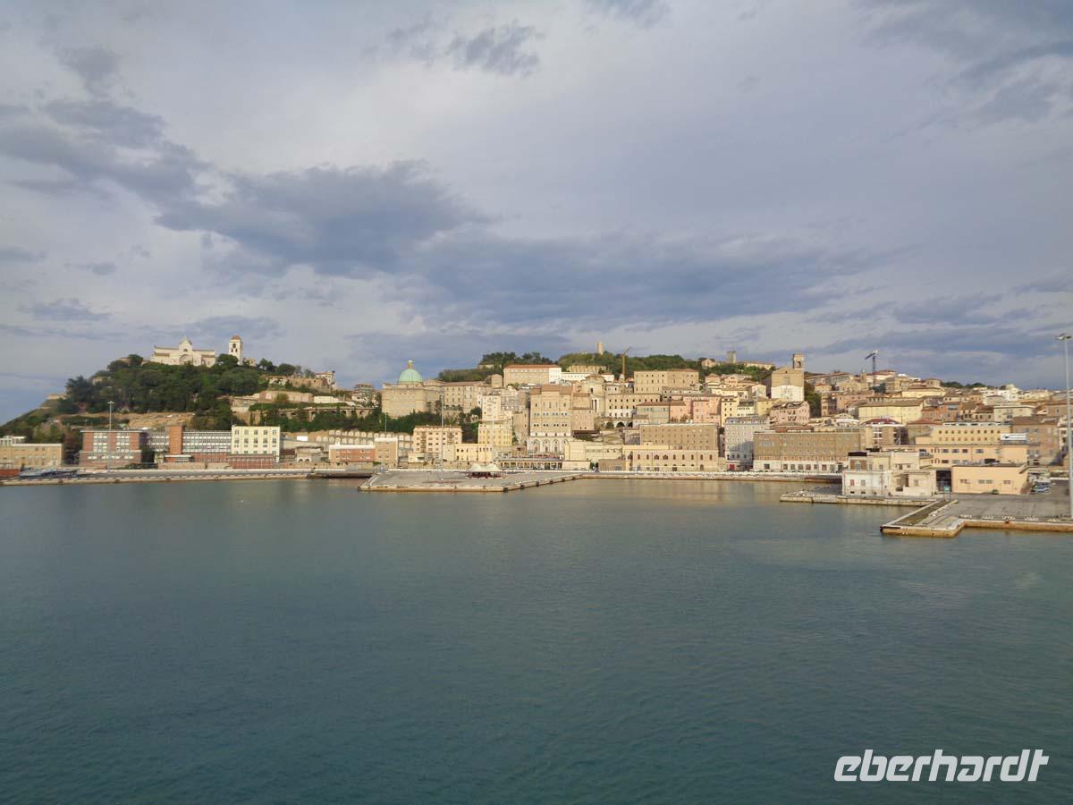 Die Ebene des Po mit seinen Zuflüssen ist morgens meist dunstverhangen, wenn nicht gar nebelig. Auch das hat seinen Reiz. Erst am frühen Nachmittag schafft sich die Sonne Platz. Schnell ist Bologna an uns vorbei gezogen und bei klarer Sicht grüßt uns der Staat San Marino der sich deutlich durch den spitzen Monte Titano zu erkennen gibt. Fast zeitgleich überqueren wir im wahrsten Sinne des Wortes den Rubicon, wie dies schon Julius Cäsar 46 v. Chr., allerdings mit weniger friedlichen Absichten vor uns getan hat. Schon bald kommt Ancona in Sicht. Hier wirft Griechenland schon seine Schatten voraus, denn die Stadt geht auf griechische Kolonisten zurück, die selbst aus der griechischen Kolonialgründung Syrakus stammten. Nach den Formalitäten bei Zoll und Hafenbüro läuft die Fähre der Anek-Superfast Line im Hafen ein. Man staunt immer wieder welche ungeheuere Menge an Bussen, LKWs und PKWs aus dem Bauch des Schiffes quellen. Auf der Fähre liegt uns Ancona zu Füßen. Lange noch ist der altehrwürdige Dom St. Cyriakus aus dem 11. Jahrhundert in der Ferne sichtbar. Nun wird das Schiff erkundet und danach finden wir uns am Restaurant ein, wo für uns Plätze für ein sehr reichhaltiges Abendmenü reserviert sind. An Bord bei ruhiger See klingt der Tag aus.