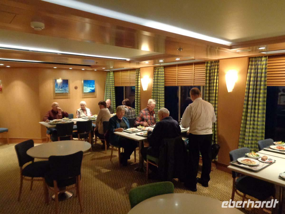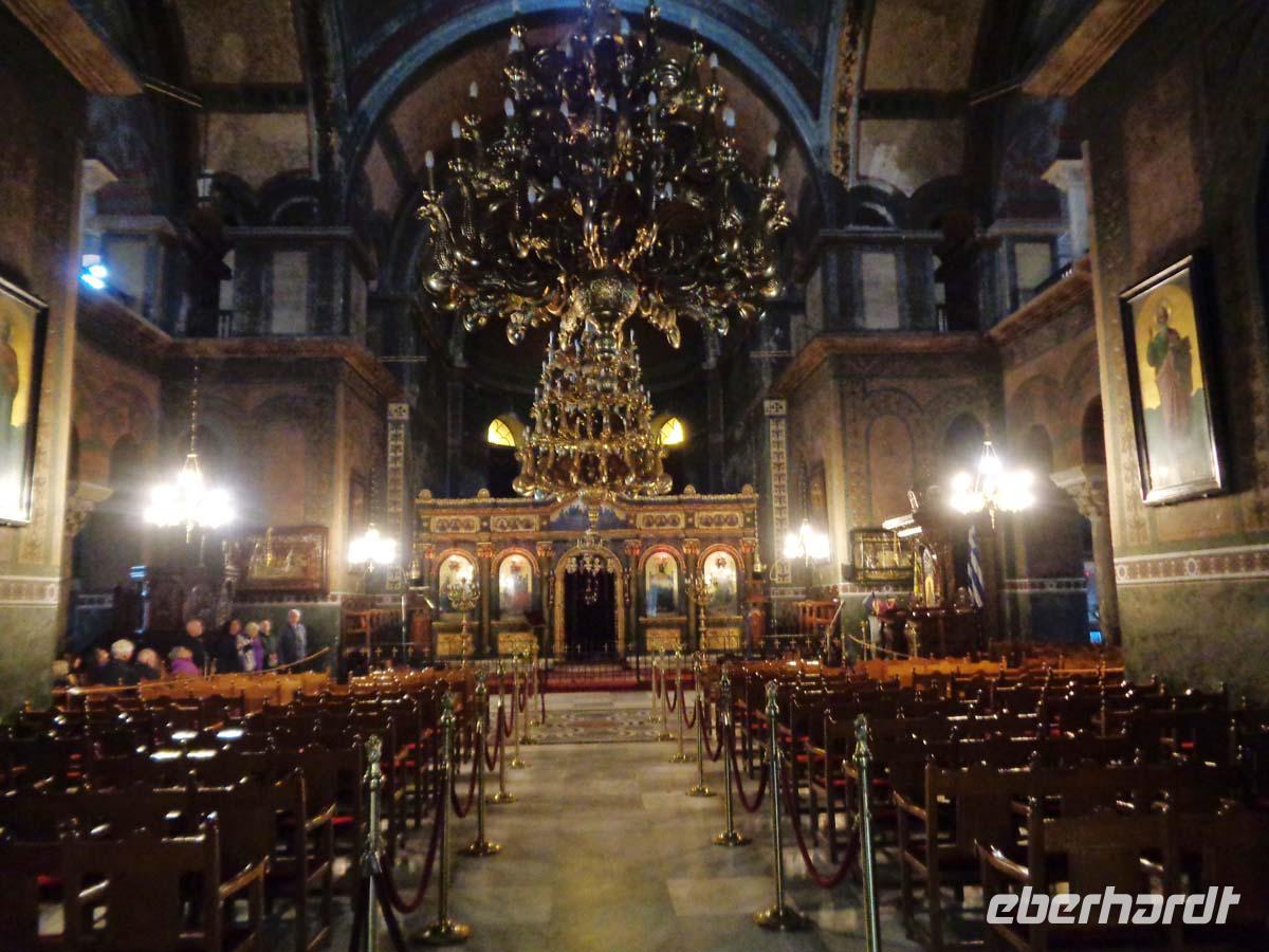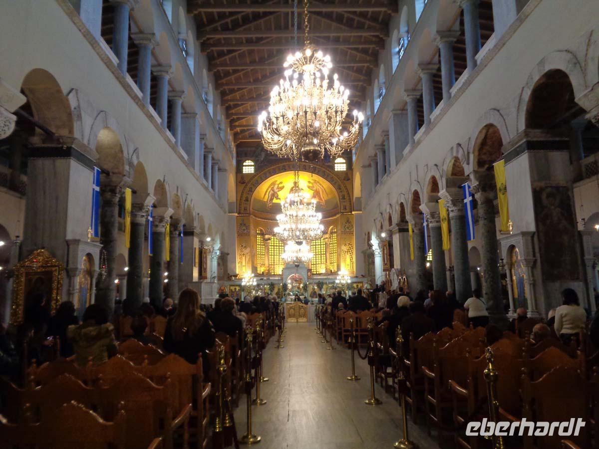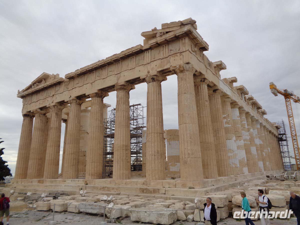 Mit einem griechischen Reisebus und Chauffeur besuchen wir heute die Hauptstadt Griechenlands. Unser Fahrer hat heute und morgen Lenkzeitruhe. Es ist sinnvoll eine halbe Stunde früher nach Athen zu fahren, weil so die täglichen Staus eher umgangen werden können. Der Großraum Athen mit Piräus hat 4,5 Mio. Einwohner und der Verkehr wird von Minute zu Minute dichter. Zunächst können wir im Nationalmuseum die wertvollsten Dinge bestaunen, welche die Archäologen aus den vielen antiken Stätten geborgen haben. So auch die überreichen Goldfunde aus den Schachtgräbern von Mykene. Auch die Statuensammlung mit wertvollsten Objekten aus Kalkstein, Marmor und Bronze durchstreifen wir zur Gänze. Neben der Prähistorie geht es nach und nach durch die Mykenische, geometrische, klassische und hellenistische Epoche bis zu den Römern. Man könnte hier einen ganzen Tag und mehr verbringen. Ein weiteres Highlight stellt die Besichtigung der Akropolis dar. Man hat neben dem Erlebnis der Bauten, von denen der Parthenon wie immer teilweise eingerüstet ist auch einen wunderbaren Blick über die gesamte Stadt einschließlich Piräus. Bis zum Horizont breitet sich das Häusermeer zu unseren Füßen aus. Zwischendrin die Stätten, die wir auch noch auf der Stadtrundfahrt am Nachmittag sehen werden. Das Olympiastadion, das Parlament, das neue Museum, den Turm der Winde, die antike Agora mit dem Hephaistostempel und das römische Forum. Direkt vor dem Aufgang erläutert uns Anastasie den Aeropag, von welchem aus der Apostel Paulus zu den Athenern sprach. Die Sicht reicht bis zum Hafen von Piräus. Freie Zeit ist für die Plakka vorgesehen. In Athens Altstadt kann man gemütlich essen gehen und sich noch das eine oder andere anschauen, wie z. B. die Kathedrale oder die Hadrianbibliothek. Die Plakka ist weitestgehend autofrei und so kann es auch in Athen mitunter abgasarm und ohne Hupkonzert zugehen. Alles in allem ist die Plakka ein schöner recht stiller Stadtteil, wo man prima schlendern und in Ruhe die Schaufenster inspizieren kann, während der Verkehr in der Ferne tobt. Auf dem Weg aus der Stadt machen wir natürlich noch einen Stop am Olympiastadion von 1896 und schauen uns die Wachablösung vor dem Parlamentsgebäude am Syntagmaplatz an. Langsam fahren wir an der so genannten Athener Trilogie vorbei, also dem klassizistischen Ensemble aus Akademie, alter Universität und Nationalbibliothek. Am Abend lassen wir es uns wieder beim reichhaltigen Büffet schmecken.