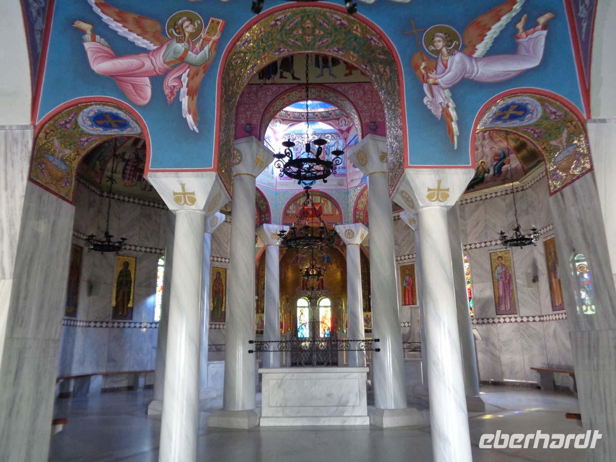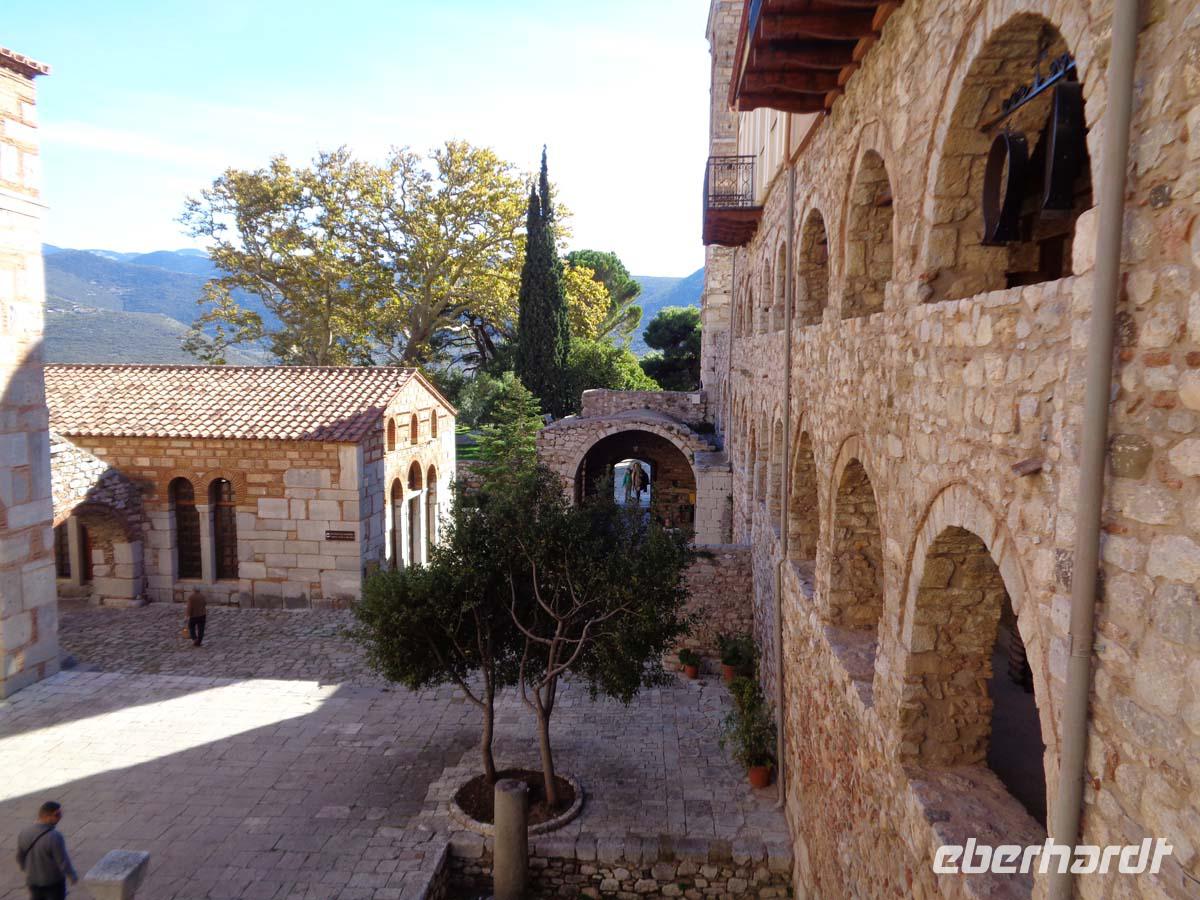 Auf der Fahrt zu unserem Hotel in Vrahati legen wir eine halbstündige Pause auf einem Parkplatz gegenüber dem malerisch gelegenen Ort Arachova ein, dem St. Moritz von Griechenland. Bevor wir unser Resort-Hotel in Vrahati am Golf von Korinth erreichen steht aber noch die Besichtigung des Klosters Ossios Loukas mit den berühmten Goldmosaiken aus dem 11. Jh. Auf dem Programm. Danach gibt es Gelegenheit in den beiden Klosterläden Spezereien aus dem Kloster zu erwerben, oder den Blick für einige Zeit auf der ausgedehnten Ebene zu Füßen des Klosters ruhen zu lassen. Den Tag lassen wir an einem überaus reichhaltigen Buffet ausklingen.