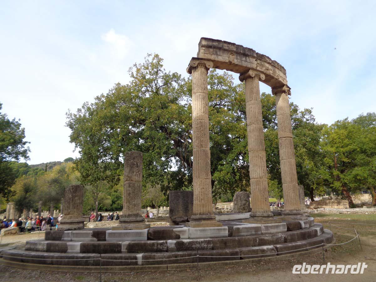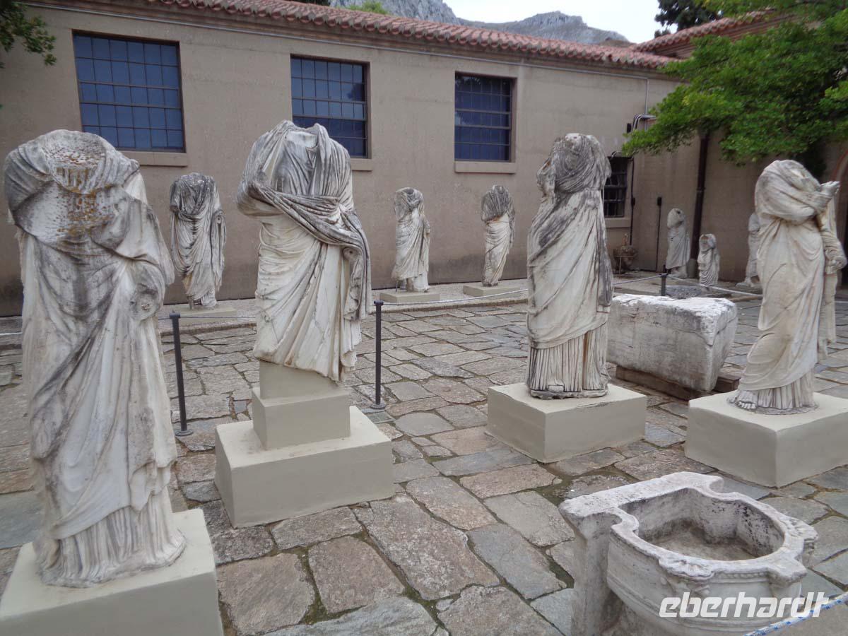 Die wichtigste und berühmteste Orakelstätte der Antike ist heute unser Ziel. Delphi, am Hang des Parnassos und mit Blick auf den Golf von Korinth gelegen erlebte seine erste Blüte ab dem 7. Jh. v. Chr. Hier fiel die Phytia mittels berauschender Dämpfe aus einer Erdspalte in Trance und wurde so zum Medium des Gottes Apollon. Wir schreiten vorbei an den Resten von Schatzhäusern der griechischen Stadtstaaten, die in diesen Ihre Weihegaben aufbewahrten. Schließlich stehen wir vor dem Tempel des Apollon, aber berauschende Dämpfe steigen nicht mehr auf. Das Orakel ist seit langem erloschen. Dafür bietet der Besuch des Museum einen guten Ersatz. Hier ist alles zu bestaunen, was die langjährigen Ausgrabungen im heiligen Bezirk zu Tage gefördert haben, u. a. die weltberühmte Bronzestatue des Wagenlenkers aus Delphi, die bei einem Erdbeben im 4. Jh. V. Chr. verschüttet wurde. Den Abschluss in Delphi bietet eine Betrachtung des Tholos (Rundtempel) der Athene Pronaia. Es ist DAS Photomotiv aus Delphi obwohl es gar nicht zum eigentlichen heiligen Bezirk gehört.