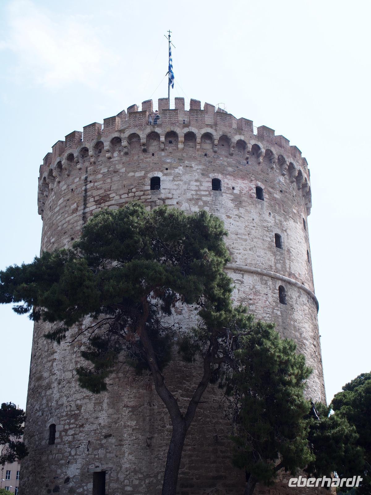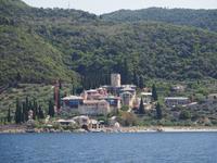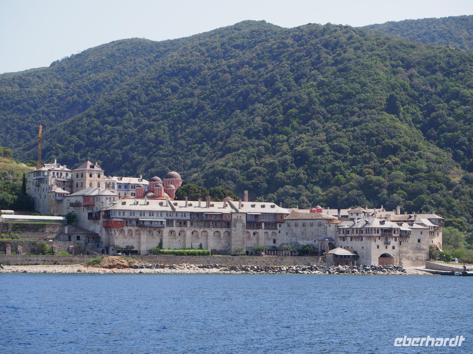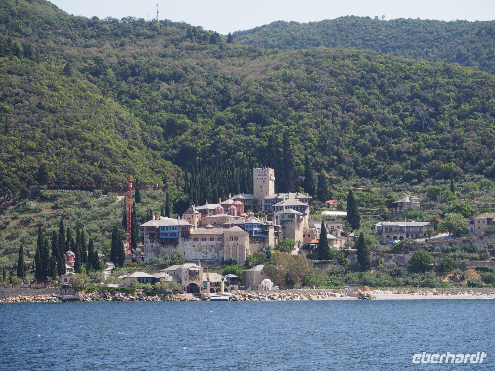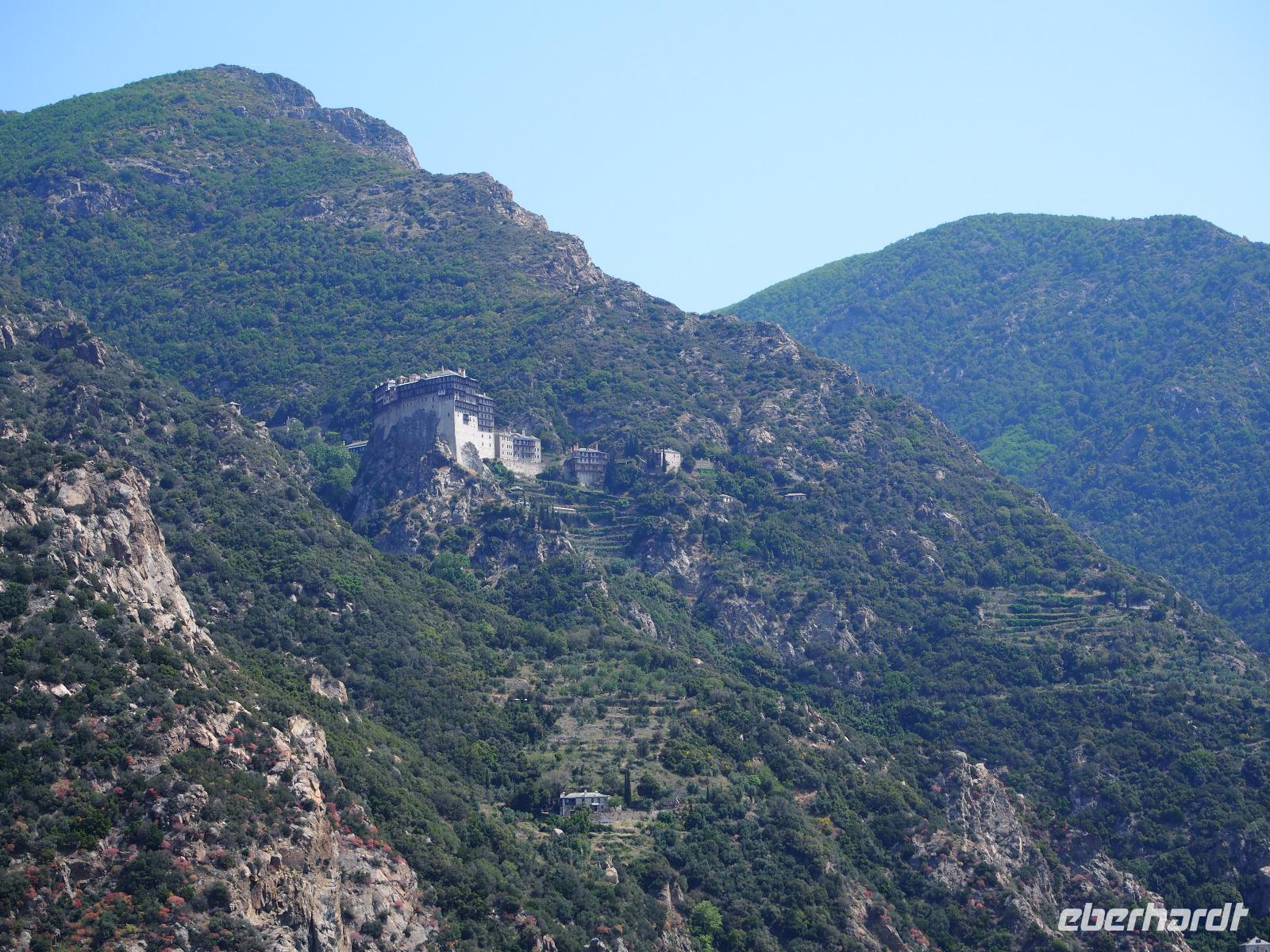 Am nächsten Morgen erwarten uns Fahrer Petros und sein griechischer Reisebus, da Roy seinen ersten lenkfreien Tag hat. Wir verlassen Thessaloniki gen Osten und erreichen nach einiger Zeit die Halbinsel Chalkidiki, die mit ihren endlosen Olivenhainen im strahlenden Sonnenschein eine wunderbare Aussicht bietet. Der Bus bringt uns in das Hafenstädtchen Ouranopolis, von wo aus wir nach einer kleinen Kaffeepause zu unserer Bootstour entlang der Küste der Mönchsrepubik Athos starten. Für Frauen ist diese Art die Besichtigung auch heute noch die einzige Möglichkeit einen Blick auf die uralten Klöster und Eremitagen zu erlangen, denn auch heute noch ist es ihnen nicht gestattet, die Republik zu betreten. Aus ebendiesem Grund muss auch unser Schiff einen Mindestabstand von 500 Metern zum Festland einhalten. Es bieten sich uns herrliche Impressionen bei bestem Wetter, bis wir schließlich am südlichen Ende der Landzunge den 2033 Meter hohen Berg Athos erreichen. Nach guten drei Stunden erreichen wir schließlich wieder den Hafen von Ouranopolis, wo wir im Anschluss Zeit für ein gemütliches Mittagessen und einen kleinen Spaziergang durch die engen und malerischen Gassen haben. Am späten Nachmittag treten wir dann, mit vielen schönen Eindrücken und einem leichten Sonnenbrand, die Rückfahrt Richtung Thessaloniki an.