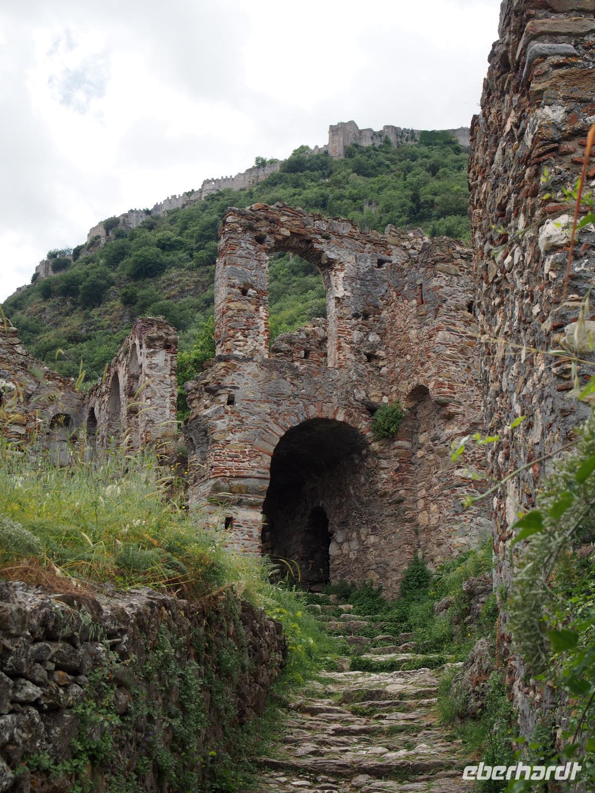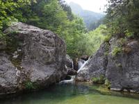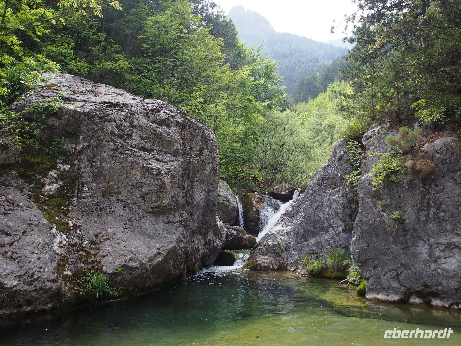 Nach dem Mittagessen treffen wir uns am Bus, der am weißen Turm auf uns wartet, und verlassen Thessaloniki in Richtung Süden. Schon nach etwa einer Stunde Fahrt können wir am Horizont den 2925m hohen Gipfel des Olymps erkennen, der heute gar nicht so sehr in Wolken gehüllt ist, wie es alle Erzählungen erwarten lassen. Die Götter scheinen uns wohlgesonnen zu sein und so entschließen wir uns für einen Abstecher nach Prionia in den Hängen des Olymp-Massivs, wohin uns eine mitunter aufregende Serpentinenstraße bringt. Von dort aus unternehmen wir eine kleine Wanderung, die uns nach etwa 25 Minuten an einen kleinen Wasserfall bringt - nach dem Großstadttreiben am Vormittag ist das eine willkommene Abwechslung. Nichtsdestotrotz war der Ausflug aufgrund der warmen Temperaturen doch relativ anstrengend und wir sind alle froh, als wir wieder in die bequemen Sitze sinken können, während uns der Bus weiter Richtung Kalampaka bringt.