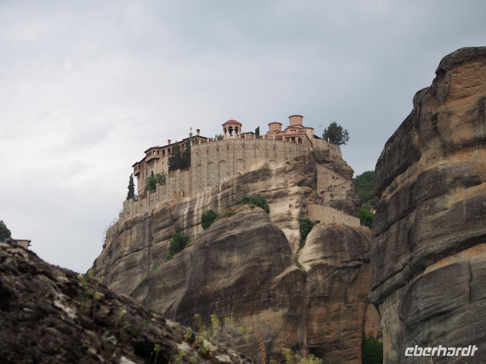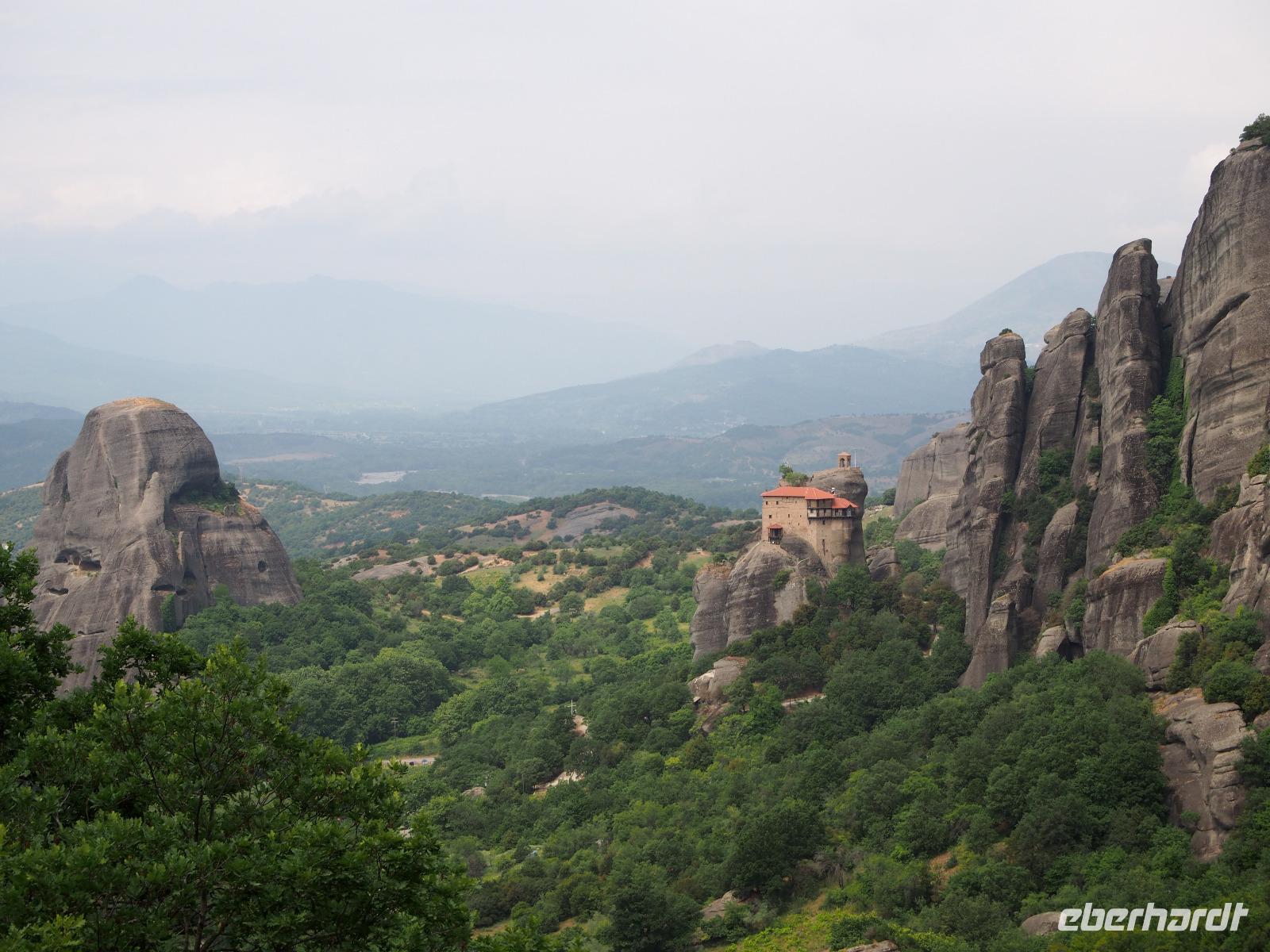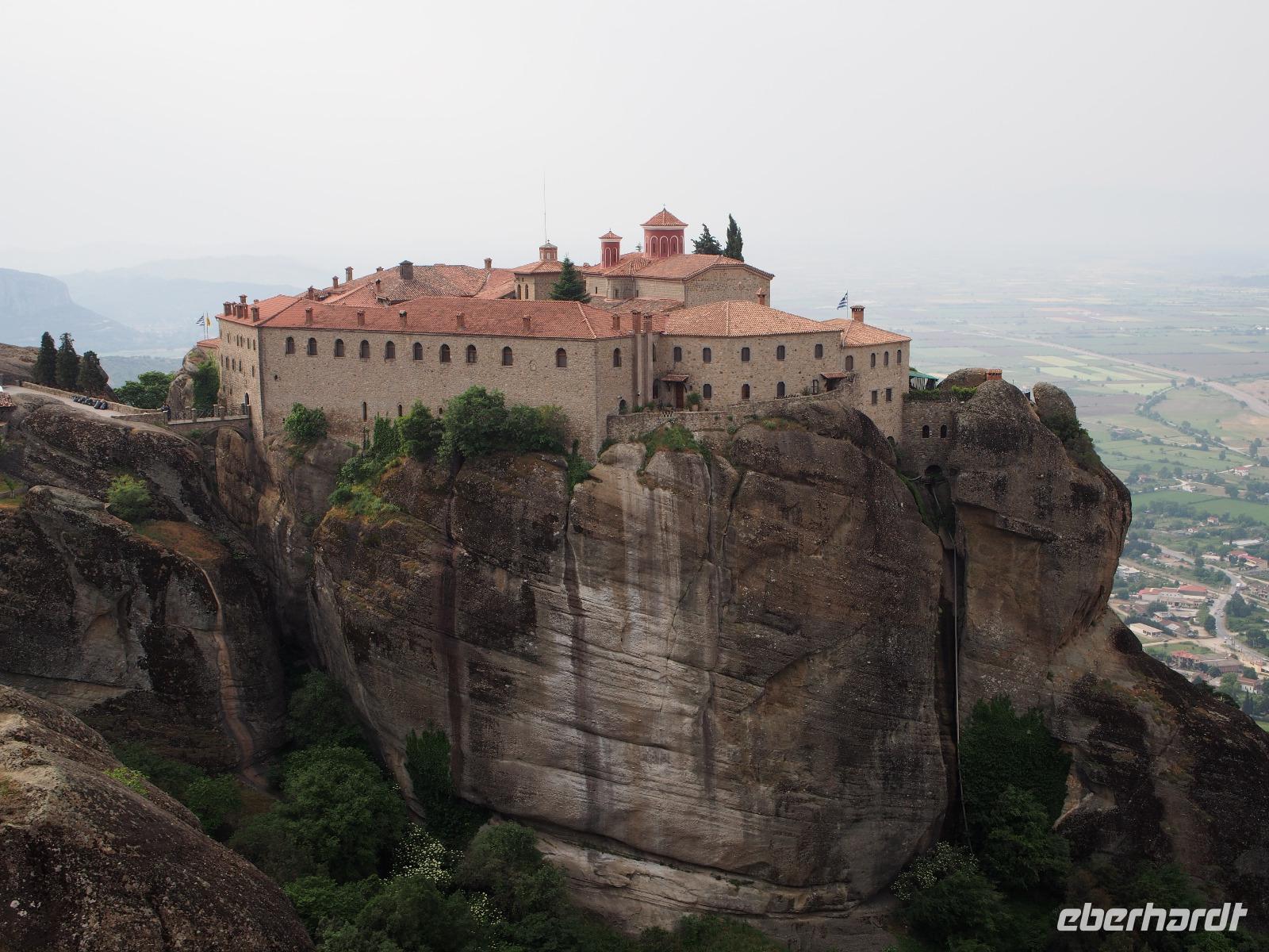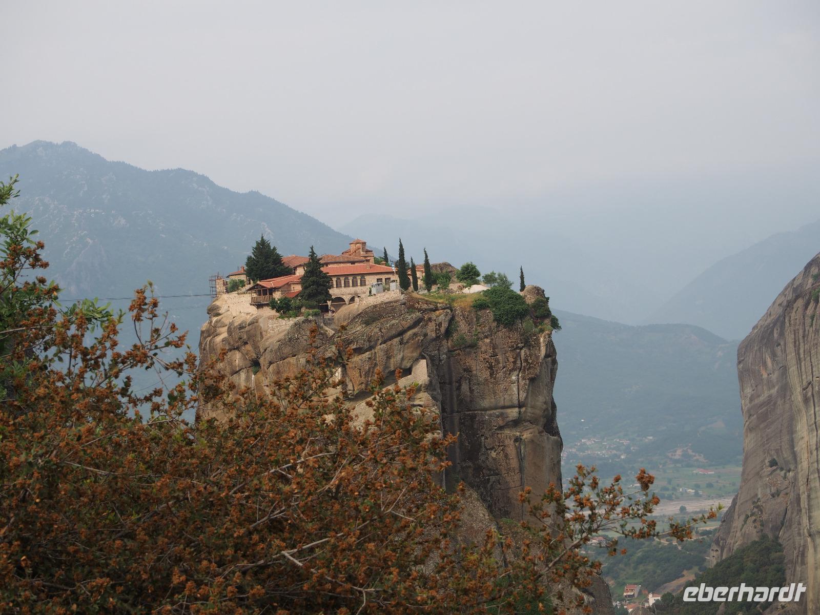 Für den heutigen Tag steht einer der Höhepunkte der Reise auf dem Plan: die Besichtigung der berühmten schwebenden Klöster in den Felsen weit über dem Städtchen Kalampaka. Schon am Vorabend konnten wir vom Fuße des Gebirges erahnen, was uns am nächsten Tag erwarten würde und wir staunten darüber, wie die jahrhundertealten Bauwerke in dieser abgeschiedenen Lage überhaupt entstehen konnten. Nach dem Frühstück bringt uns der Bus eine kurze Serpentinenstraße am Ortseingang Kalampakas herauf - und schon nach wenigen Minuten eröffnet sich uns die erste faszinierende Aussicht auf das Kloster Agia Triada, welches 1981 als Filmkulisse für den James Bond Film „In tödlicher Mission" weltweite Bekanntheit erlangte. Auf dem Weg zum Kloster Agio Stefanos machen wir zwei Fotostopps, um die herrlichen Ausblicke festzuhalten. Dann erreichen wir unser erstes Ziel: das heute von Nonnen bewohnte Kloster Agio Stefanos ist gleichzeitig auch eines der meist besuchten, da der Weg dorthin am einfachsten zu bewältigen ist: nur eine kurze Brücke in schwindelerregender Höhe muss überwunden werden, und schon können wir uns das Innere des Klosterhofes, die wunderschöne, mit Mosaiken ausgestaltete Kirche, sowie ein kleines Museum ansehen. Direkt im Anschluss geht es weiter zu einem Aussichtspunkt, von dem man noch einmal herunter auf Kalampaka schauen kann. Gleichzeitig ist dies der Startpunkt für einen kleinen Abstieg zum zweiten Kloster. Nach wenigen Treppenstufen, die durch ein kleines Wäldchen führen, erreichen wir Rousanou, welches neben seinen wunderbaren Wandmalereien aus dem 16. Jahrhundert auch eine herrliche Aussicht auf die Klöster Varlaam und das Metamorphosis, auch Megalo Meteoro genannt, bietet. Nach vielen gesammelten Eindrücken geht es für uns zurück nach Kalampaka, wo wir uns beim Mittagessen für die lange Fahrt nach Itea stärken.