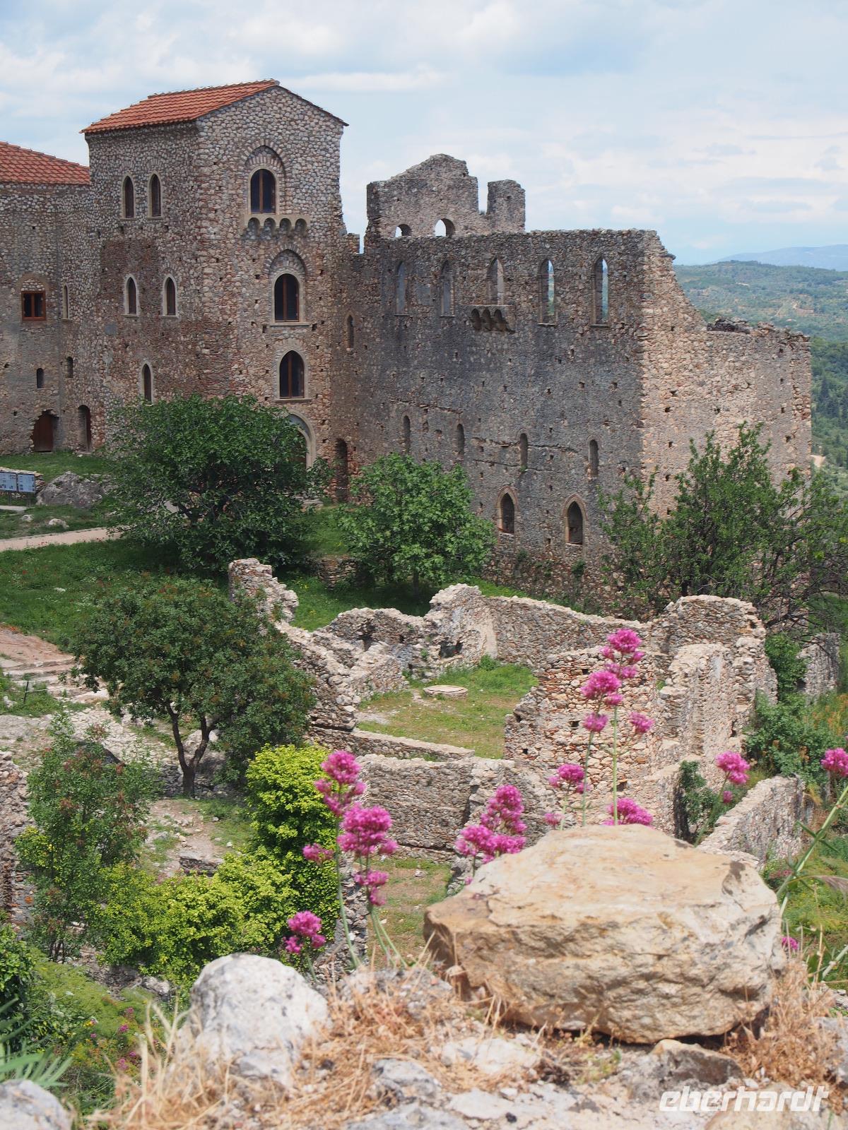 Die Zeit ist gekommen, unser Resort Hotel in Vrachati zu verlassen um noch ein wenig weiter in den Süden der Peloponnes vorzudringen. Wir durchfahren die berühmten Landschaften Arkadiens, die vor allem im 18. und 19. Jahrhundert viele Künstler anlockte und so zum Inbegriff des gelobten paradiesischen Sehnsuchtsziels avancierte. Am Vormittag erreichen wir die sagenumwobende Stadt Sparta, allerdings zeugt in der neuzeitlichen Hauptstadt Lakoniens kaum noch etwas von der großartigen antiken Vergangenheit. Alleine das bronzene Leonidas Denkmal erinnert noch einmal an den glorreichen Sieg über die Perser bei der Schlacht bei den Thermopylen. So führt uns unser Weg schnell weiter in die mittelalterliche Nachfolgesiedlung Spartas, nach Mystras. Strategisch besser, am Hang des Taigetos-Gebirges gelegen, wurde diese Stadt 1249 unter dem fränkischen Grafen William II. von Villehardouin erbaut. Wir besichtigen die byzantinische Ruinenstadt vom oberen Burgtor aus und steigen langsam den steilen Treppenpfad hinab. Dabei besichtigen wir die Kirchen Agia Sophia und Agios Nikolaos und anschließend den Despotenpalast. Zum Schluss besuchen wir das Pantanassas Kloster, das heute von sechs Nonnen bewohnt wird, welche seit der Neugründung Spartas in den 30er Jahren die einzigen Bewohnerinnen der verlassenen Stadt sind.