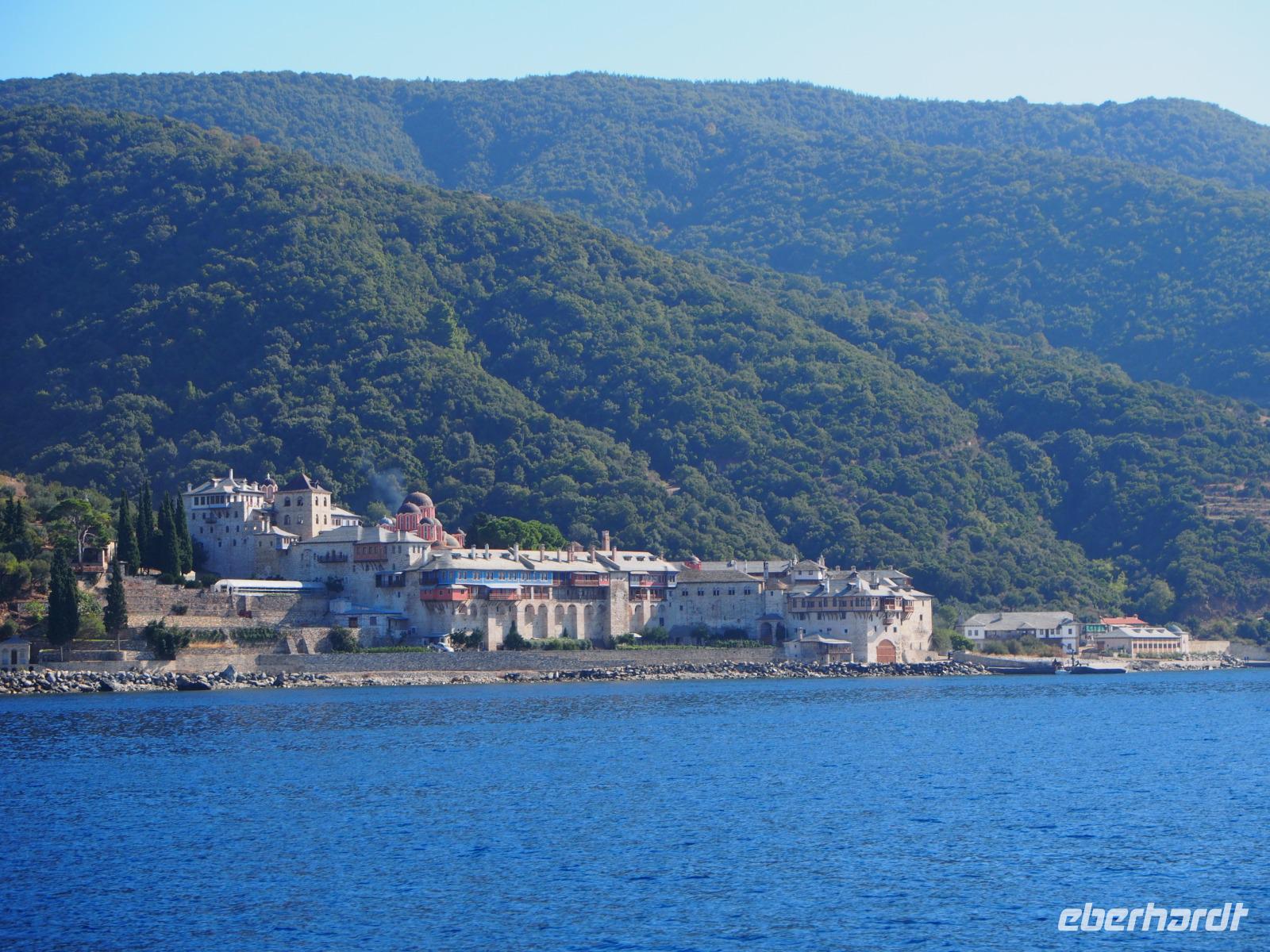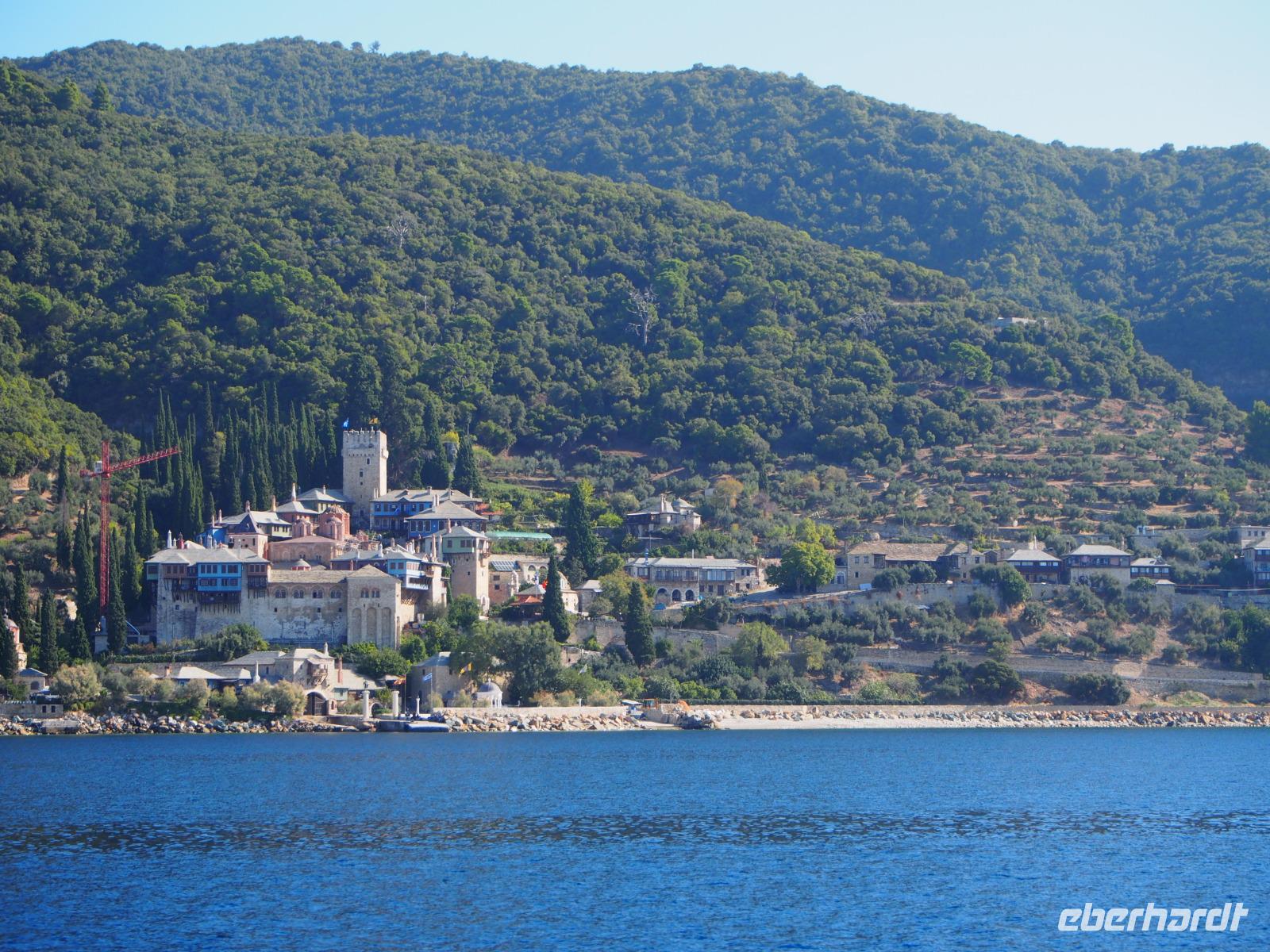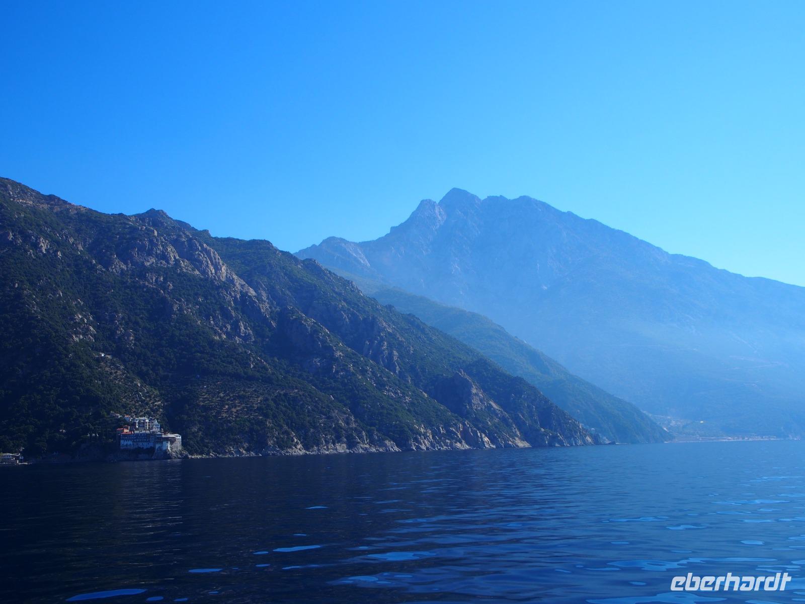 Der heutige Tag beginnt früh - viel zu früh für echte Griechen, wie uns Anastasia nach besteigen des griechischen Busses erzählen wird. Jan hat heute seinen ersten lenkfreien Tag und so bringt uns Fahrer Leonidas heute Richtung Osten und Halbinsel Chalkidiki. Auf dem Programm steht heute der fakultative Ausflug zur Mönchsrepublik Athos, die außer von männlichen Pilgern und Arbeitskräften nicht betreten werden darf. Die einzige Möglichkeit einen Blick auf die uralten Klöster und Eremitagen zu erlangen ist also ein Schiffsausflug entlang der Küste, für den wir zunächst in das Hafenörtchen Ouranopolis gelangen müssen. Auf etwa halber Strecke dorthin machen wir Halt beim „Haus der Versuchungen", wie Anastasia es nennt - einer Konditorei die, neben Espresso und Frappé, allerlei griechische und internationale Köstlichkeiten anbietet. Gut gestärkt geht es schließlich weiter über die engen Straßen, vorbei an endlosen Olivenhainen bis wir gerade rechtzeitig den Hafen erreichen. Bei schönstem Wetter bieten uns herrliche Aussichten auf die Küste der Mönchsrepublik - von der unser Schiff immer einen Mindestabstand von 500 Metern einhalten muss. Am südlichen Ende der Landzunge kann man schon bald den 2033 Meter hohen Berg Athos erkennen, von wo aus es dann zurück Richtung Ouranopolis geht. Begleitet von zwei Delfinen laufen wir nach etwas mehr als drei Stunden wieder in den Hafen ein.
