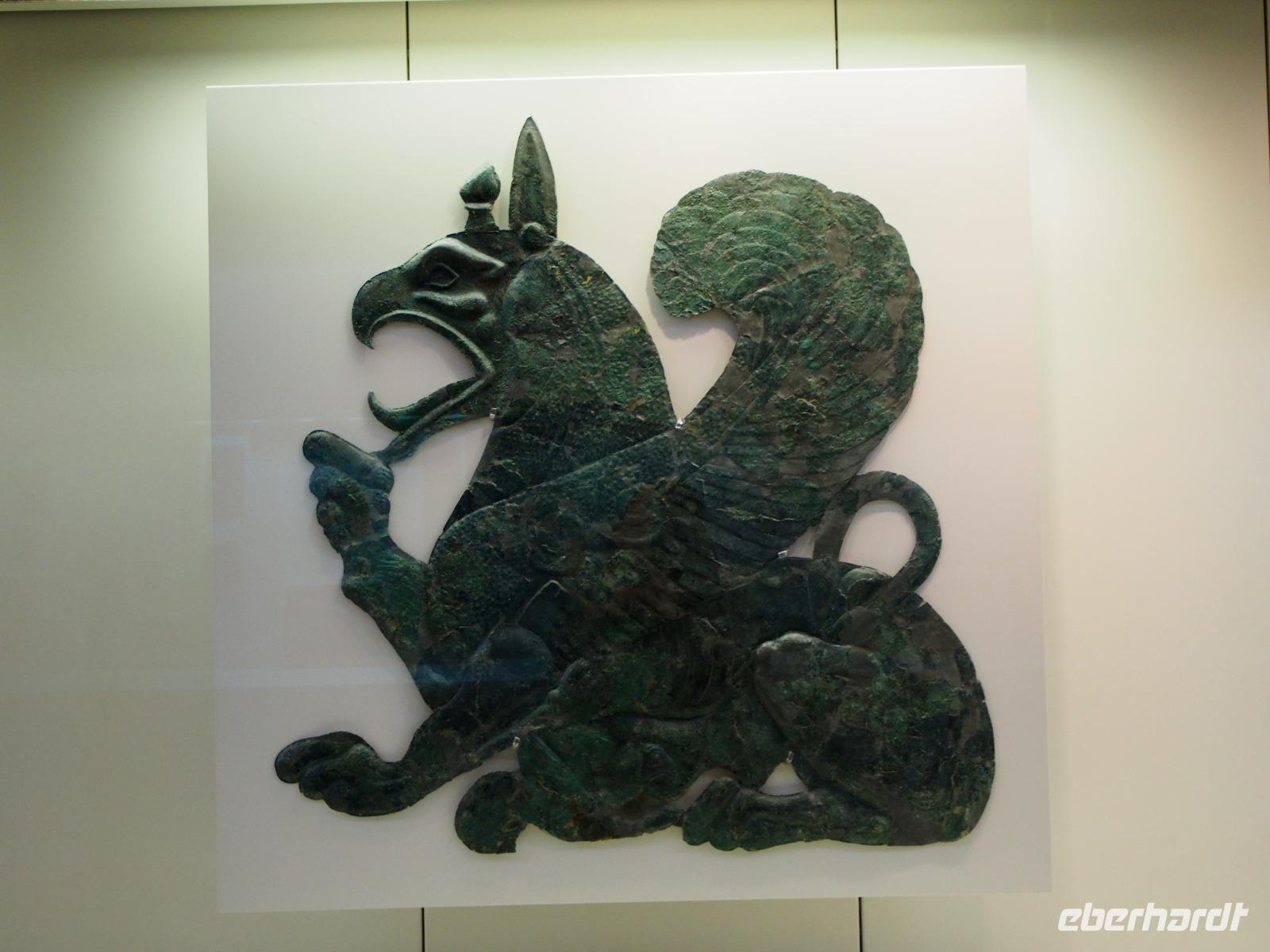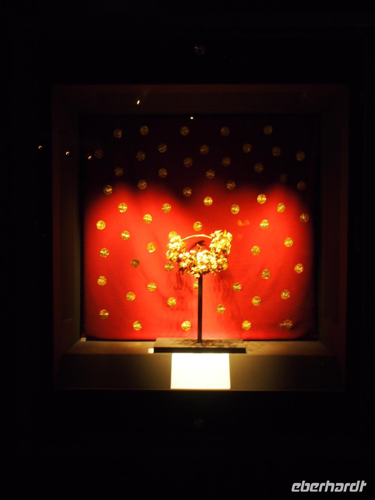 Nach etwa einstündiger Fahrt erreichen wir die ältere Hauptstadt, Vergina, ebenfalls ein überschaubares Dorf heutzutage. Nichtsdestotrotz eine der wichtigsten archäologischen Stätten des Landes, denn dieser Ort diente über Jahrhunderte als Begräbnisstätte für die makedonischen Könige. Neun dieser Gräber konnte man in der Gegend von Vergina finden, der Höhepunkt war 1977 der Fund von vier Gräbern, unter ihnen das ungeplünderte Grab des Makedonierkönigs Phillip II. aus dem 4. Jh. v. Chr. Heute sind die Gräbers an ihrem ursprünglichen Ort samt Museum für die Öffentlichkeit zugänglich und wie zu antiken Zeiten unter einem riesigen Grabhügel verborgen. In der authentischen Dunkelheit des Museums sind wir geblendet von den beeindruckenden Gold- und Silberschätzen - nach dem Grab von Tut Anch Amun soll es sich bei der Begräbnisstätte Philipps II. um die zweitreichste Bestattung der alten Welt handeln, die bis heute entdeckt wurde.