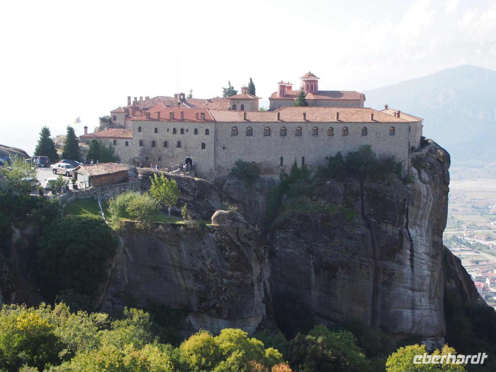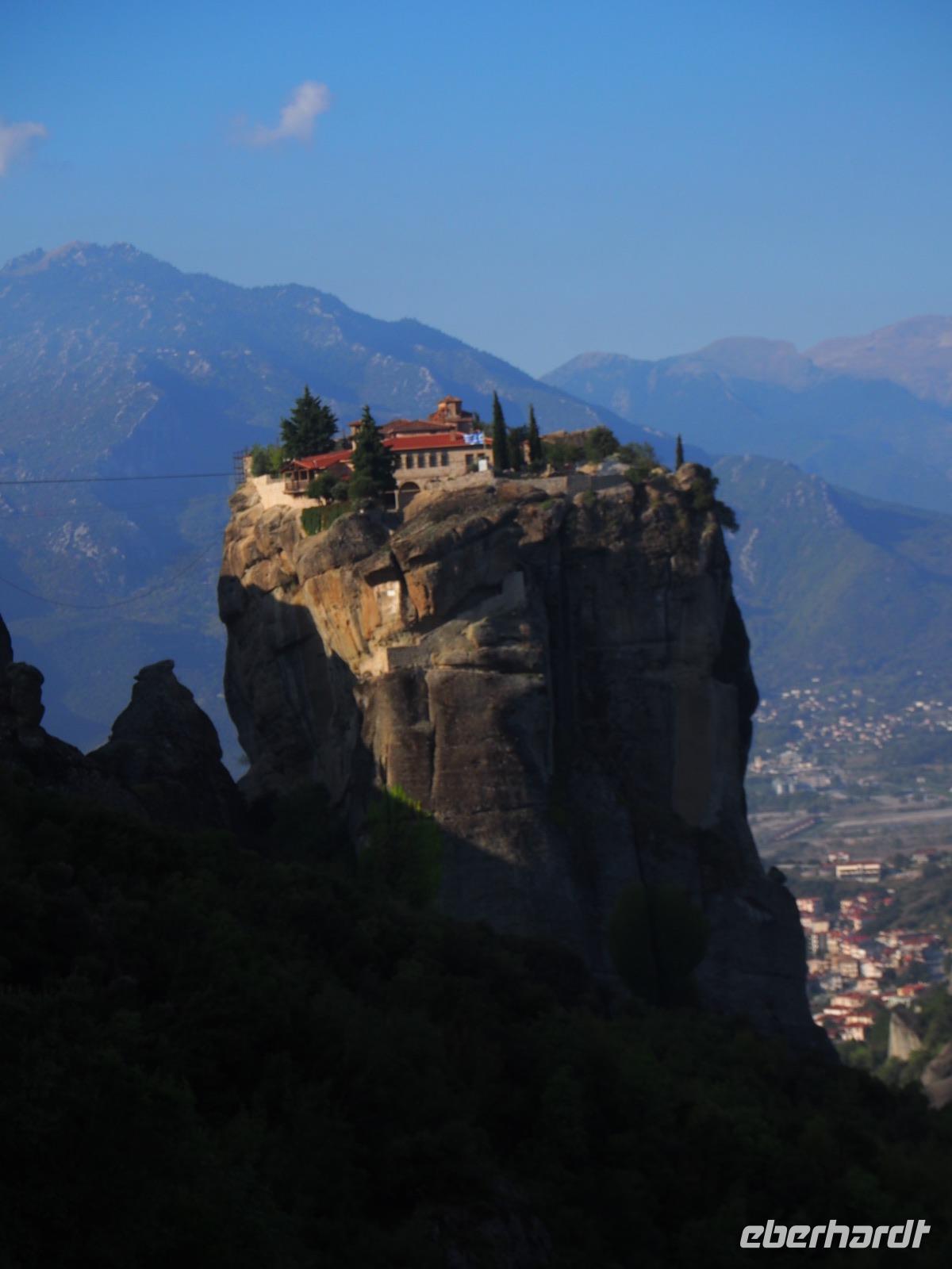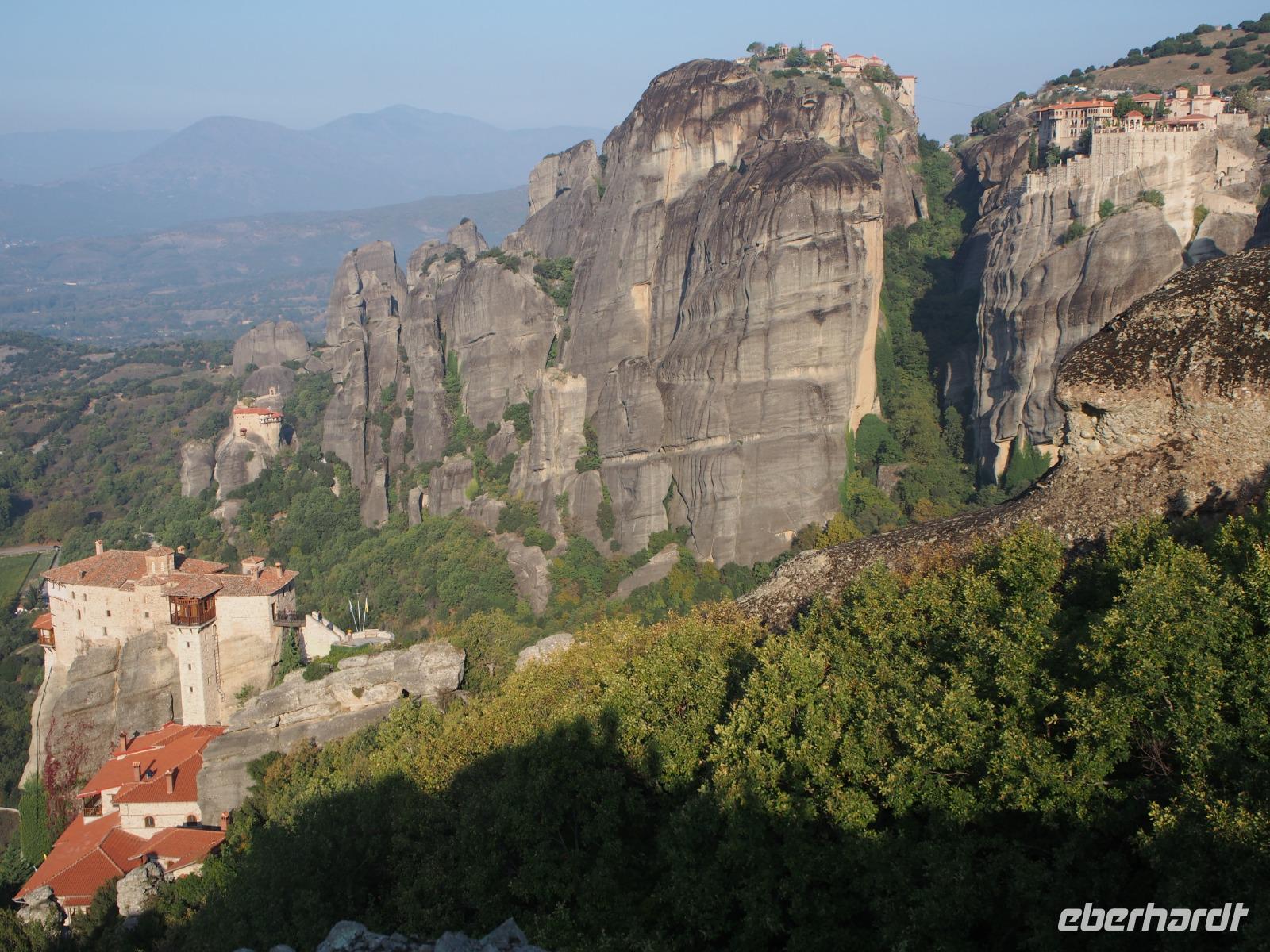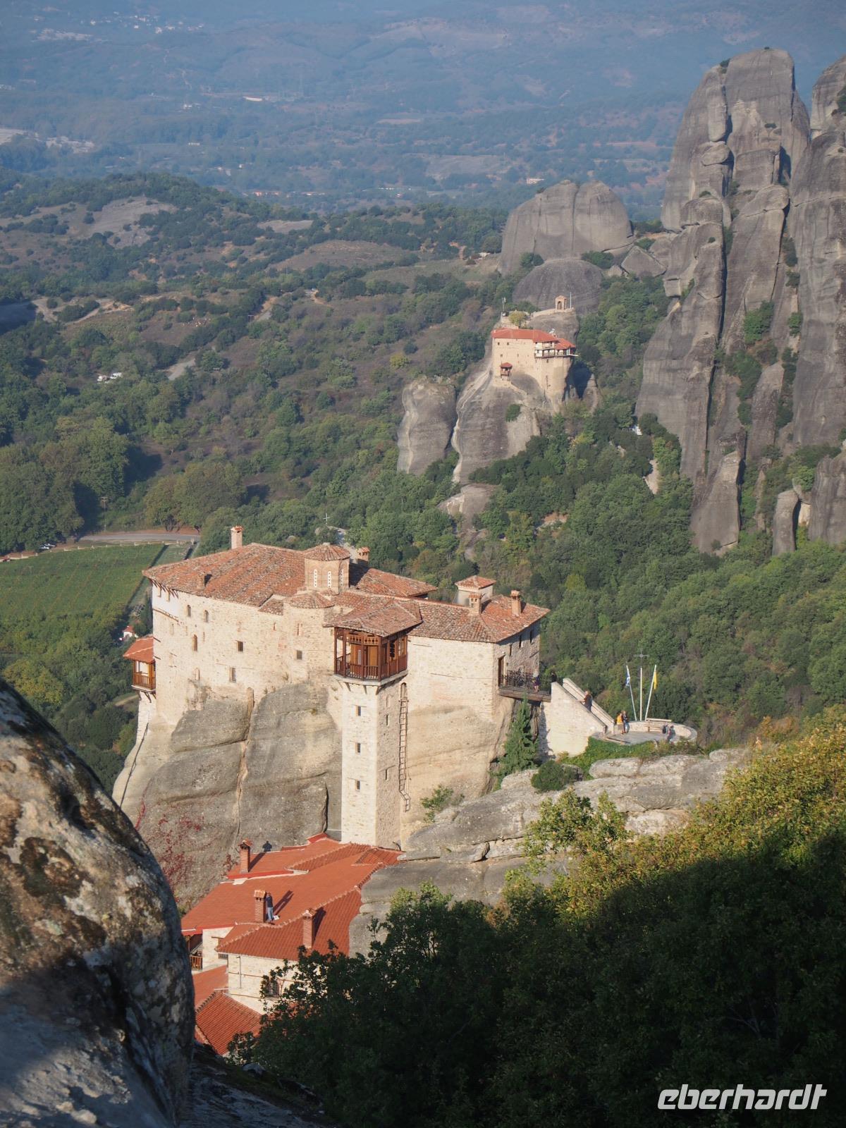 Heute steht einer der Höhepunkte der Reise auf dem Plan: die Besichtigung der berühmten schwebenden Klöster in den Felsen weit über dem Städtchen Kalampaka. Schon am Vorabend konnten wir vom Fuße des Gebirges erahnen, was uns am nächsten Tag erwarten würde und wir staunten darüber, wie die jahrhundertealten Bauwerke in dieser abgeschiedenen Lage überhaupt entstehen konnten. Von unserem Hotel aus fahren wir ein paar enge Dorfstraßen entlang und schon nach wenigen Minuten haben wir herrliche Ausblicke auf das erste der sieben noch existierenden Klöster, Agios Nikolaos, und auf die Ruinen der Eremitage des Heiligen Georgs der Tücher. Licht und Wetter sind heute perfekt, deshalb legen wir auf dem Weg zu unserem ersten Klosterbesuch zunächst einen Fotostopp ein, von wo aus man vier der fünf besuchbaren Klöster sehen kann: Agia Triada, Roussanou, Varlaam und das Metamorphosis, auch Megalo Meteoron genannt. Wir setzen unsere Fahrt fort und fahren zunächst vorbei am Kloster Agia Triada, welches 1981 als Filmkulisse für den James Bond Film „In tödlicher Mission" weltweite Bekanntheit erlangte und besonders fotogen auf einer schmalen Felsspitze thront.