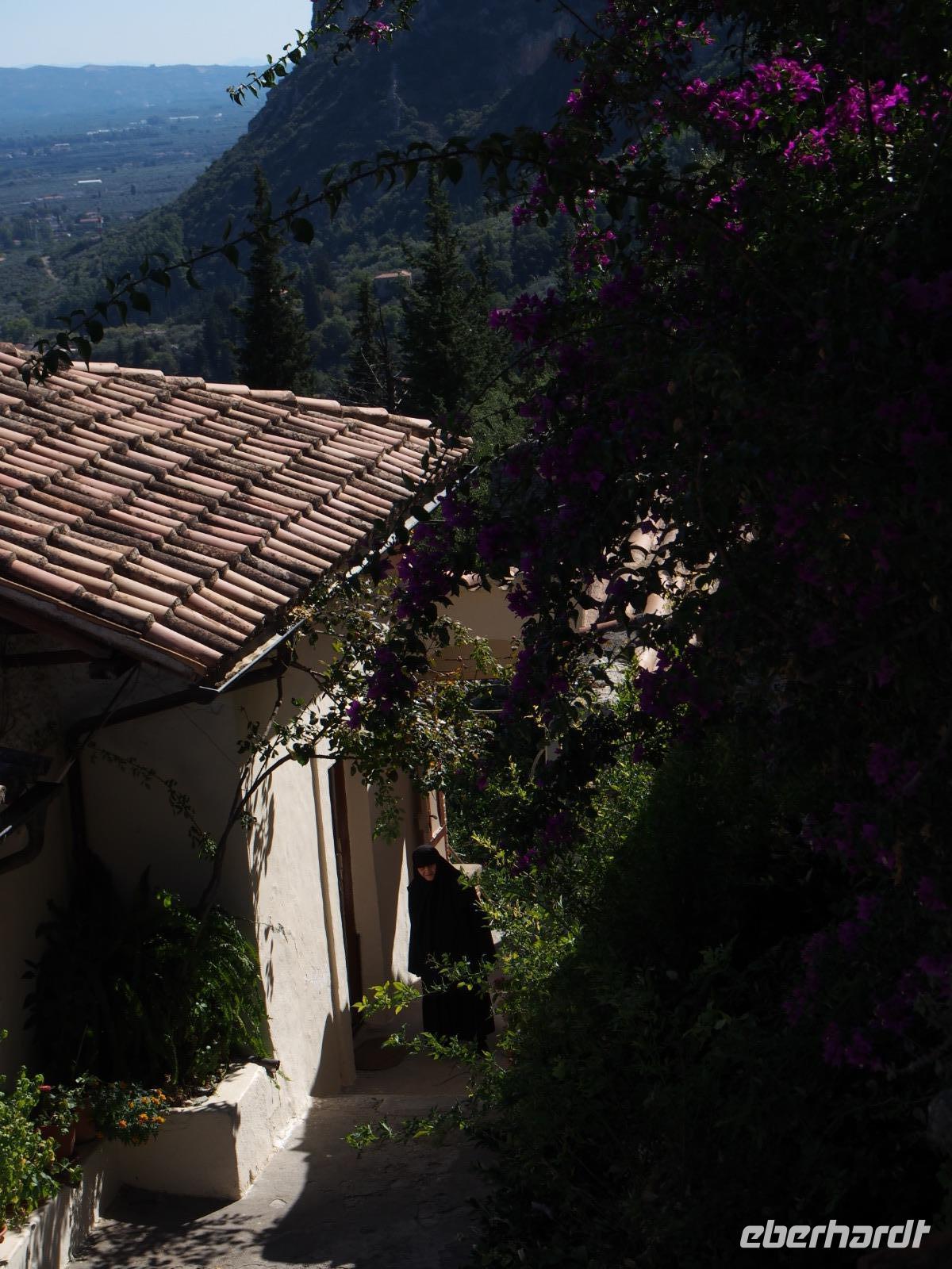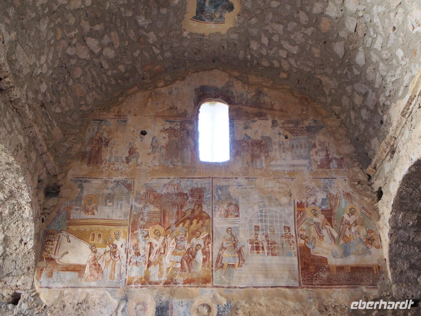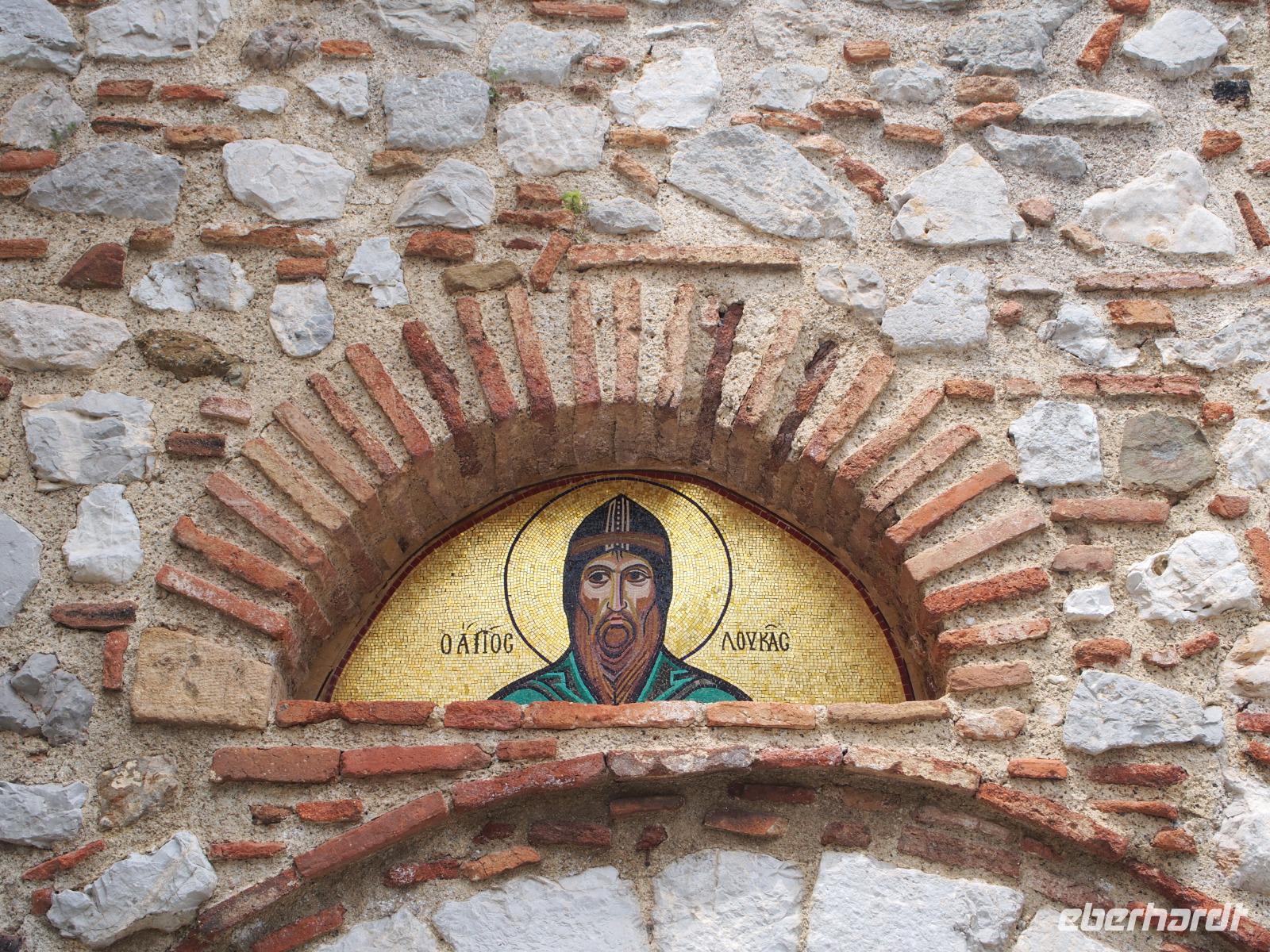 Schließlich erreichen wir das Kloster Agio Stefanos, das gleichzeitig auch das meist besuchte ist, da der Weg dorthin am einfachsten zu bewältigen ist: nur eine kurze Brücke in schwindelerregender Höhe muss überwunden werden, und schon können wir uns das Innere des Klosterhofes, die wunderschöne, mit Mosaiken ausgestaltete Kirche, sowie ein kleines Museum ansehen. Wir haben Glück und haben das Kloster beinahe für uns alleine, sodass Anastasia uns die kunstvollen Wandmalereien ausführlich erklären kann und wir gleichzeitig auch noch die Restaurierung der kleinen Kirche mitverfolgen können.