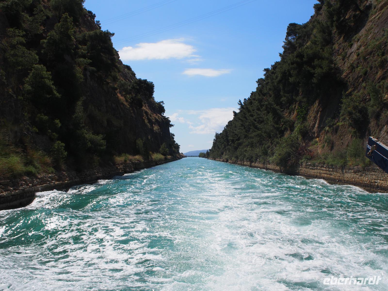 Wir fahren hinunter an das östliche Ende des Kanals von Korinth, wo wir unser Schiff besteigen. Vorher machen wir jedoch noch Halt an der Nationalstraße, wo wir von einer ca. 80 Meter hohen Brücke aus, den Kanal erst einmal von oben betrachten können. Wenig später bahnt sich unser Schiff schon seinen Weg durch den nur 25 Meter breiten Einschnitt. Die hohen Wände zu beiden Seiten scheinen vom Wasser aus noch imposanter als von oben. Pläne für den Bau dieses etwa sechs Kilometer langen Kanals, der das griechische Festland von der Peleponnes trennt und so einen Seeweg von 325 Kilometern einspart, gab es schon in der Antike. Nachdem viele Pläne gescheitert waren gelang es jedoch erst im Jahr 1893 den Kanal von Korinth zu eröffnen. Bei der etwa einstündigen Fahrt werden wir mit Ouzo und Meze, griechischen Vorspeisen, versorgt, bevor es anschließend zurück Richtung Vrachati geht.
