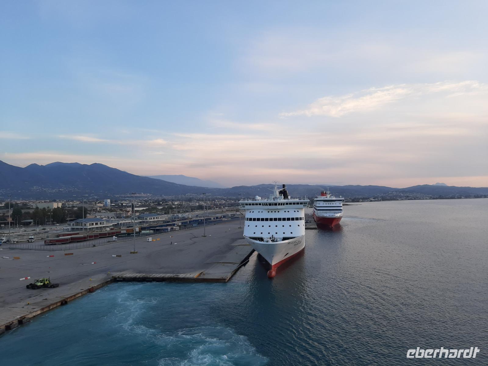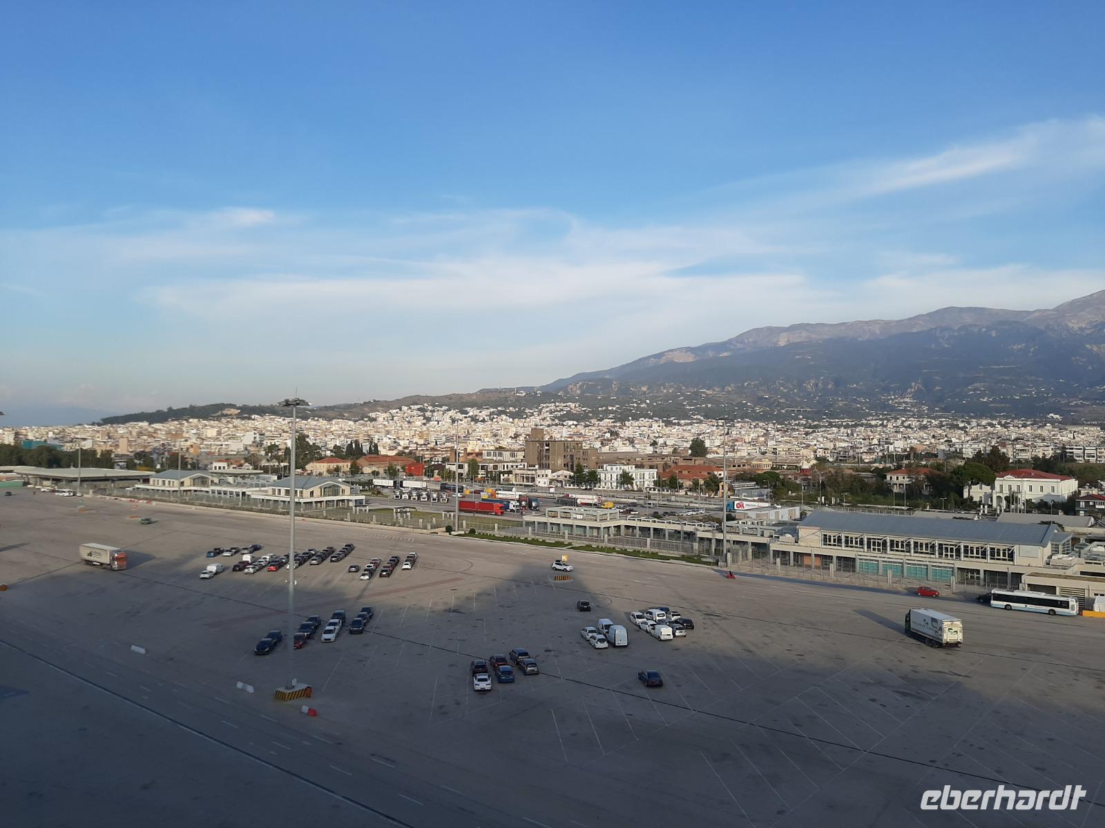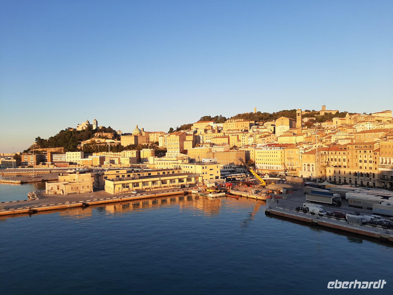 Gut gestärkt vom Frühstück ging es auf der Brennerautobahn weiter in Richtung Süden. Der Sonntagmorgen versprach weniger Verkehr als üblich und so passierten wir recht zügig die Region Emilia-Romagna bzw. die Städte Modena und Bologna am Südrand der Po-Ebene. Von Bologna aus ging es dann vorbei an der auf einem Felskamm des Monte Titano liegenden Republik San Marino bis Rimini. Kurz danach passierten wir bereits die Grenze zur Region Marken und am frühen Nachmittag erreichten wir die Hafenstadt Ancona, auch Hauptstadt dieser Region. Bei Ankunft am Hafenbüro unserer Fährgesellschaft Minoan Lines wurden uns sehr zügig die Bordkarten bzw. die Kabinenkarten ausgehändigt. Nun mussten wir nur noch durch die Zollkontrolle und die Formalitäten waren damit bereits erledigt. Mittlerweile wurde bekannt, dass unser Schiff "Cruise Europa" große Verspätung hatte und somit eine Einschiffung frühestens ab 17 Uhr erfolgen konnte. Das war allerdings kein Problem, denn wer wollte, konnte so noch einen kleinen Spaziergang in die benachbarte Innenstadt Anconas unternehmen. Wir konnten unsere Fähre später auch beim Einlaufen in den Hafen beobachten und bei der Prozedur der Entladung unzähliger Lastwagen zusehen. Während unser Bus mitsamt unserem Chauffeur Jörg noch über zwei Stunden geduldig warten musste, konnten wir jedoch als Fußgänger zumindest noch weit vor dem Abendessen auf die Fähre und hatten so ausreichend Zeit, das Schiff zu erkunden. Zum Abendessen wurden wir im Restaurant "Greco" auf Deck 10 erwartet, wo wir mit einem reichlichen und sehr schmackhaften 4-Gänge-Menü bzw. ersten griechischen Spezialitäten verwöhnt wurden. Mit einer etwa 2-stündigen Verspätung verließen wir gegen 21 Uhr den Hafen von Ancona. Nach und nach zogen wir uns zur Übernachtung in unsere Kabinen zurück.