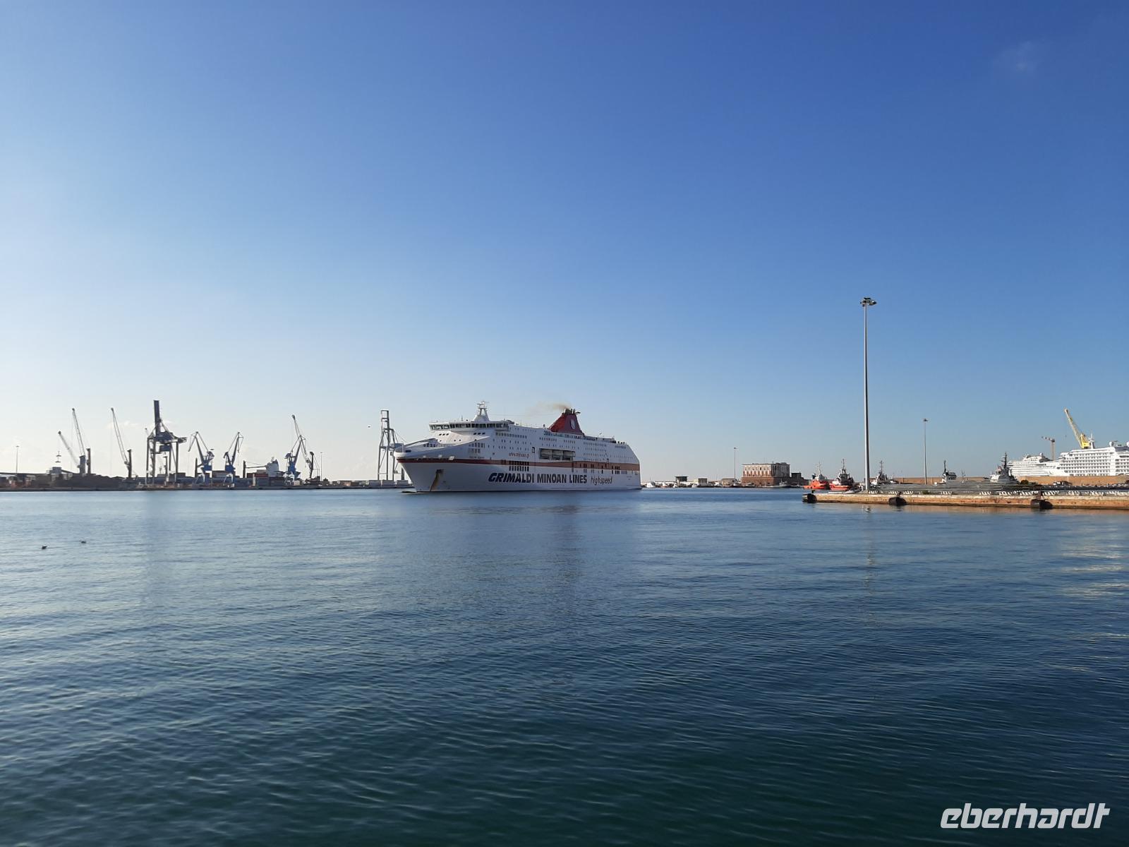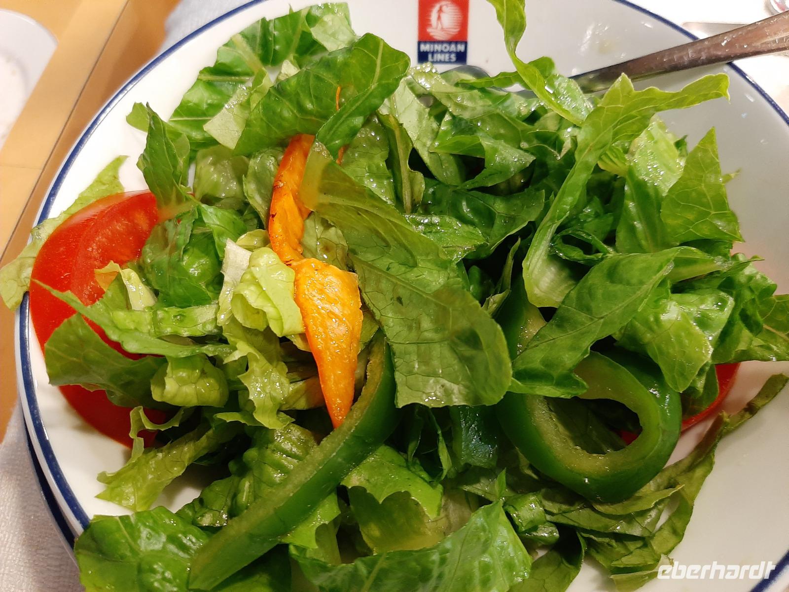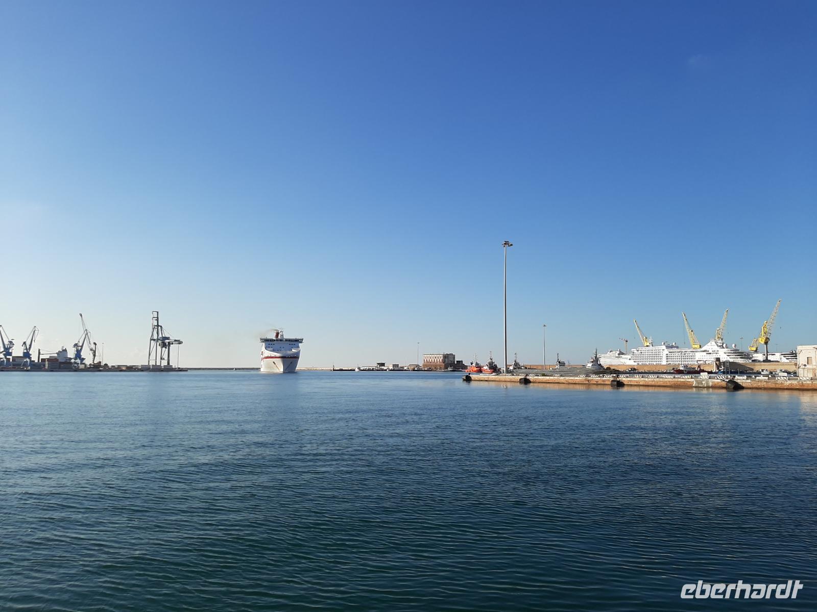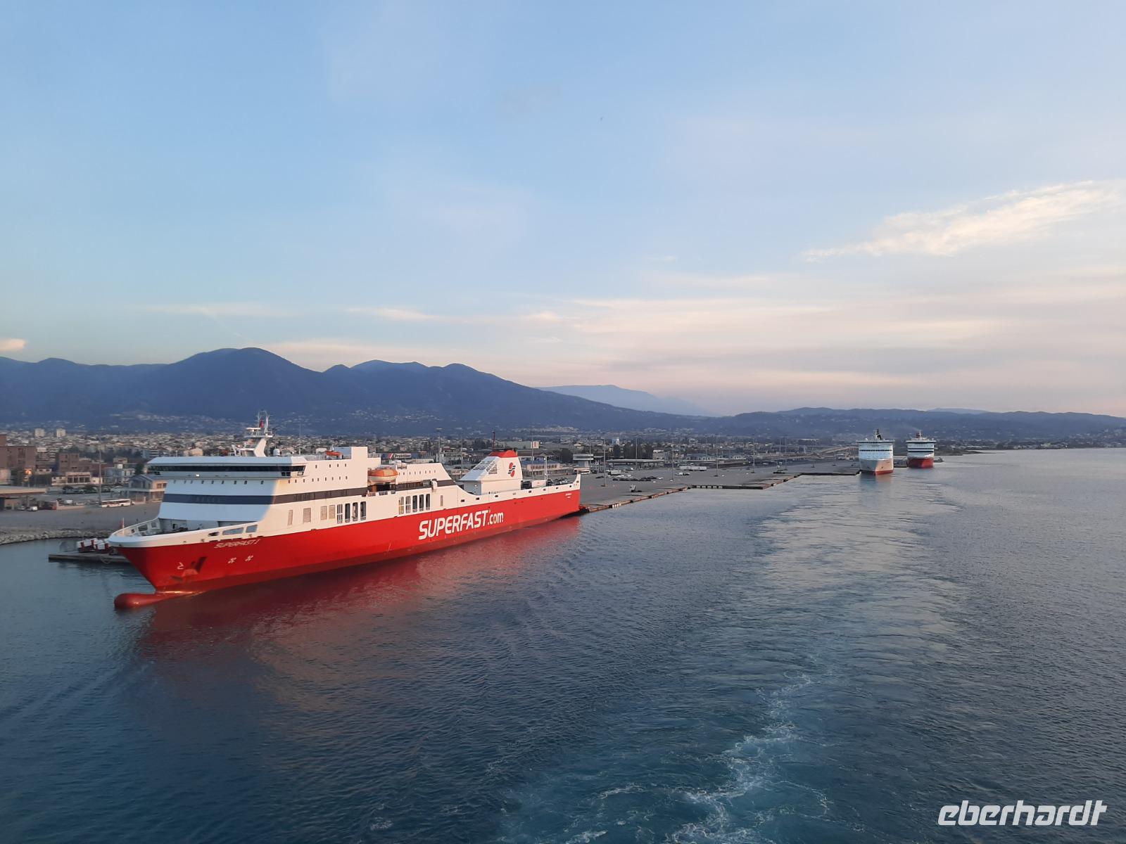 Gut gestärkt vom Frühstück ging es auf der Brennerautobahn weiter in Richtung Süden. Der Sonntagmorgen versprach weniger Verkehr als üblich und so passierten wir recht zügig die Region Emilia-Romagna bzw. die Städte Modena und Bologna am Südrand der Po-Ebene. Von Bologna aus ging es dann vorbei an der auf einem Felskamm des Monte Titano liegenden Republik San Marino bis Rimini. Kurz danach passierten wir bereits die Grenze zur Region Marken und am frühen Nachmittag erreichten wir die Hafenstadt Ancona, auch Hauptstadt dieser Region. Bei Ankunft am Hafenbüro unserer Fährgesellschaft Minoan Lines wurden uns sehr zügig die Bordkarten bzw. die Kabinenkarten ausgehändigt. Nun mussten wir nur noch durch die Zollkontrolle und die Formalitäten waren damit bereits erledigt. Mittlerweile wurde bekannt, dass unser Schiff "Cruise Europa" große Verspätung hatte und somit eine Einschiffung frühestens ab 17 Uhr erfolgen konnte. Das war allerdings kein Problem, denn wer wollte, konnte so noch einen kleinen Spaziergang in die benachbarte Innenstadt Anconas unternehmen. Wir konnten unsere Fähre später auch beim Einlaufen in den Hafen beobachten und bei der Prozedur der Entladung unzähliger Lastwagen zusehen. Während unser Bus mitsamt unserem Chauffeur Jörg noch über zwei Stunden geduldig warten musste, konnten wir jedoch als Fußgänger zumindest noch weit vor dem Abendessen auf die Fähre und hatten so ausreichend Zeit, das Schiff zu erkunden. Zum Abendessen wurden wir im Restaurant "Greco" auf Deck 10 erwartet, wo wir mit einem reichlichen und sehr schmackhaften 4-Gänge-Menü bzw. ersten griechischen Spezialitäten verwöhnt wurden. Mit einer etwa 2-stündigen Verspätung verließen wir gegen 21 Uhr den Hafen von Ancona. Nach und nach zogen wir uns zur Übernachtung in unsere Kabinen zurück.