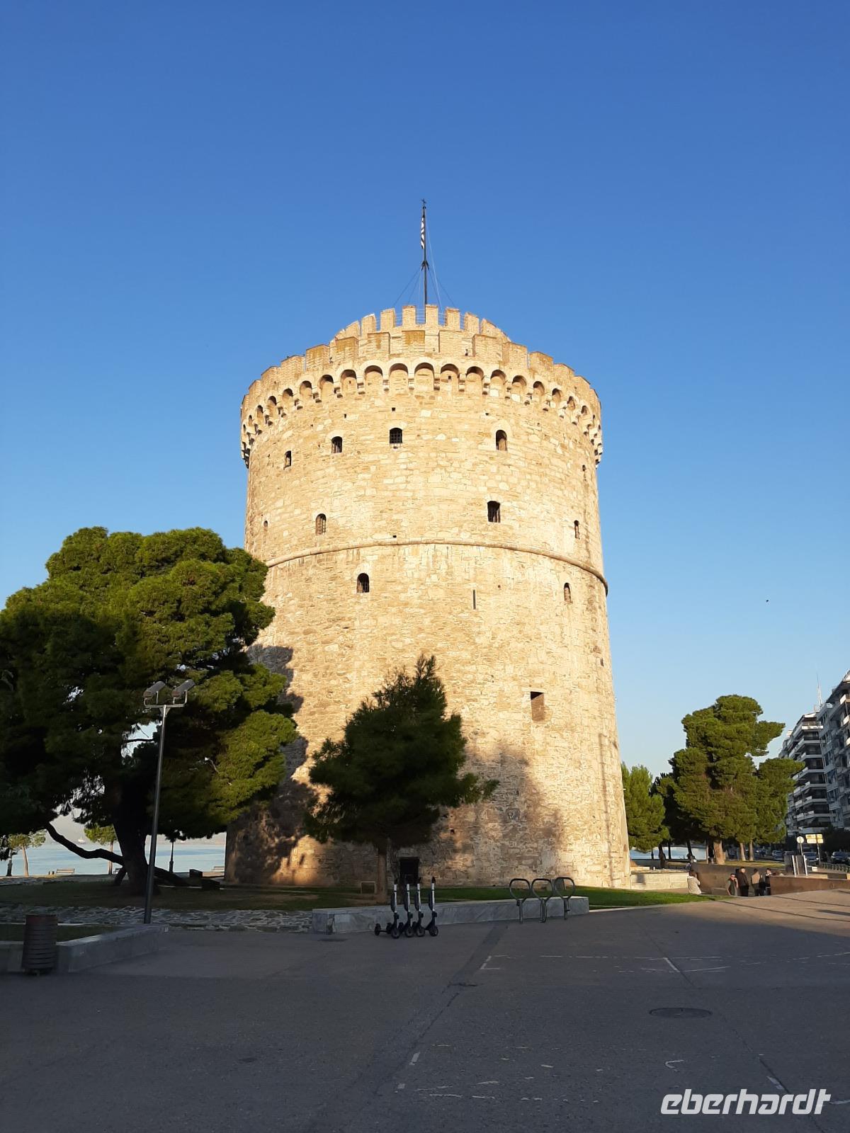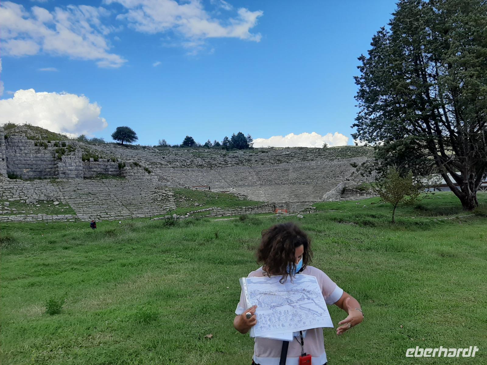 Nach einer ruhigen nächtlichen Überfahrt trafen wir uns zu einem gemeinsamen Frühstück wieder. Im Laufe des Vormittags erspähten wir die Küste Albaniens und später die griechische Insel Korfu. Unsere Fähre konnte die Verspätung vom Vortag über Nacht leider nicht einholen und so erreichten wir den Hafen von Igoumenitsa erst gegen Mittag. Dort werden wir bereits sehnsüchtig von unserer örtlichen Reiseleiterin Anastasia erwartet und auf der anschließenden Fahrt durch die bergige Epirus-Landschaft erzählte sie uns zunächst von sich und davon, warum Deutsch nicht ihre Muttersprache, sondern ihre Großmuttersprache ist. Nach einer kurzweiligen Fahrt kamen wir an unserem ersten Ziel, der Ausgrabungsstätte Dodona, an. Nach Delphi war Dodona einst das bedeutendste Orakel der griechischen Welt und gilt gleichzeitig als das älteste seiner Art. Durch das Rauschen der Blätter einer heiligen Eiche vernahmen die Priester hier die Stimme des Göttervaters Zeus, um ihre Weissagungen zu treffen. Bereits hier faszinierte uns das unglaubliche Wissen von Anastastia! Schon hier lernten wir zum Beispiel die offensichtlichen Unterschiede zwischen griechischen und römischen Bauten kennen und erfuhren, dass ein Theater und ein Amphitheater nicht dasselbe sind. Unser Weg führte uns weiter nach Ioannina und gleichzeitig machten wir damit auch einen Sprung von der Antike in die Neuzeit, genauer gesagt in die Zeit Griechenlands als Teil des Osmanischen Reiches. Bei einem kleinen Stadtrundgang erkundeten wir die pittoreske Altstadt sowie die Akropolis mit der Zitadelle, dem Normannischen Turm, der Fetije Moschee und den Überresten des Ali Pascha-Mausoleums. Es gab auch die Gelegenheit einen griechischen Frappé einzunehmen und dabei die schöne Aussicht auf die Ali Pascha Moschee und den Pamvotisee auf sich wirken zu lassen. Mittlerweile war es früher Abend und weitere 250 Kilometer lagen bis Thessaloniki vor uns. Es wurde also ein langer Tag, denn erst gg. 20.45 Uhr kamen wir in unserem zentral gelegenen modernen "Capsis Hotel" in Thessaloniki an. Dies sollte für die nächsten vier Nächte auch unser Ausgangspunkt für kommende Ausflüge sein.
