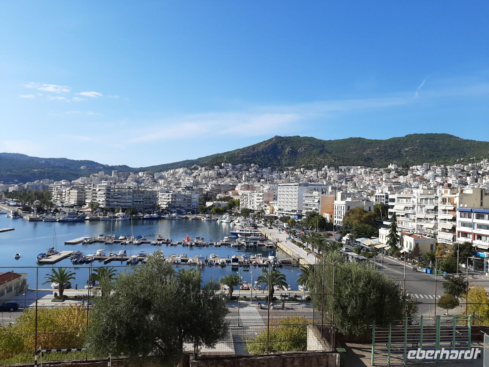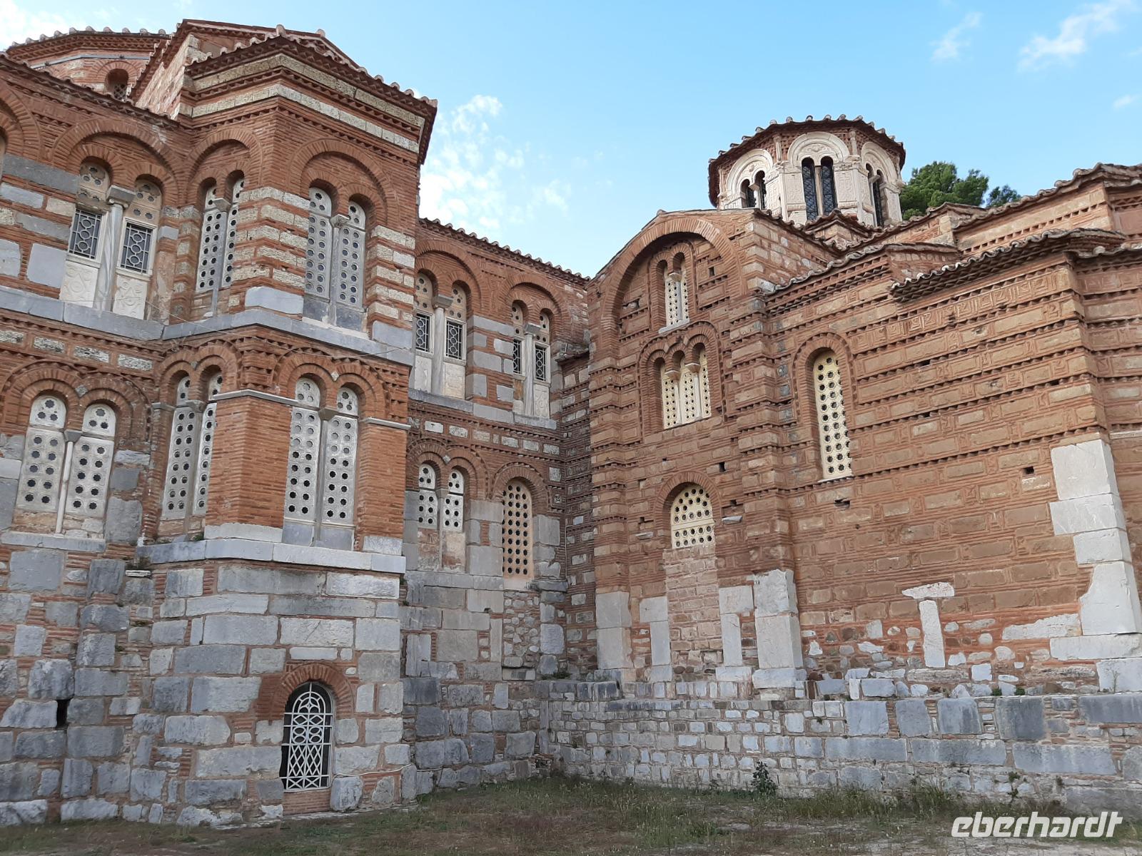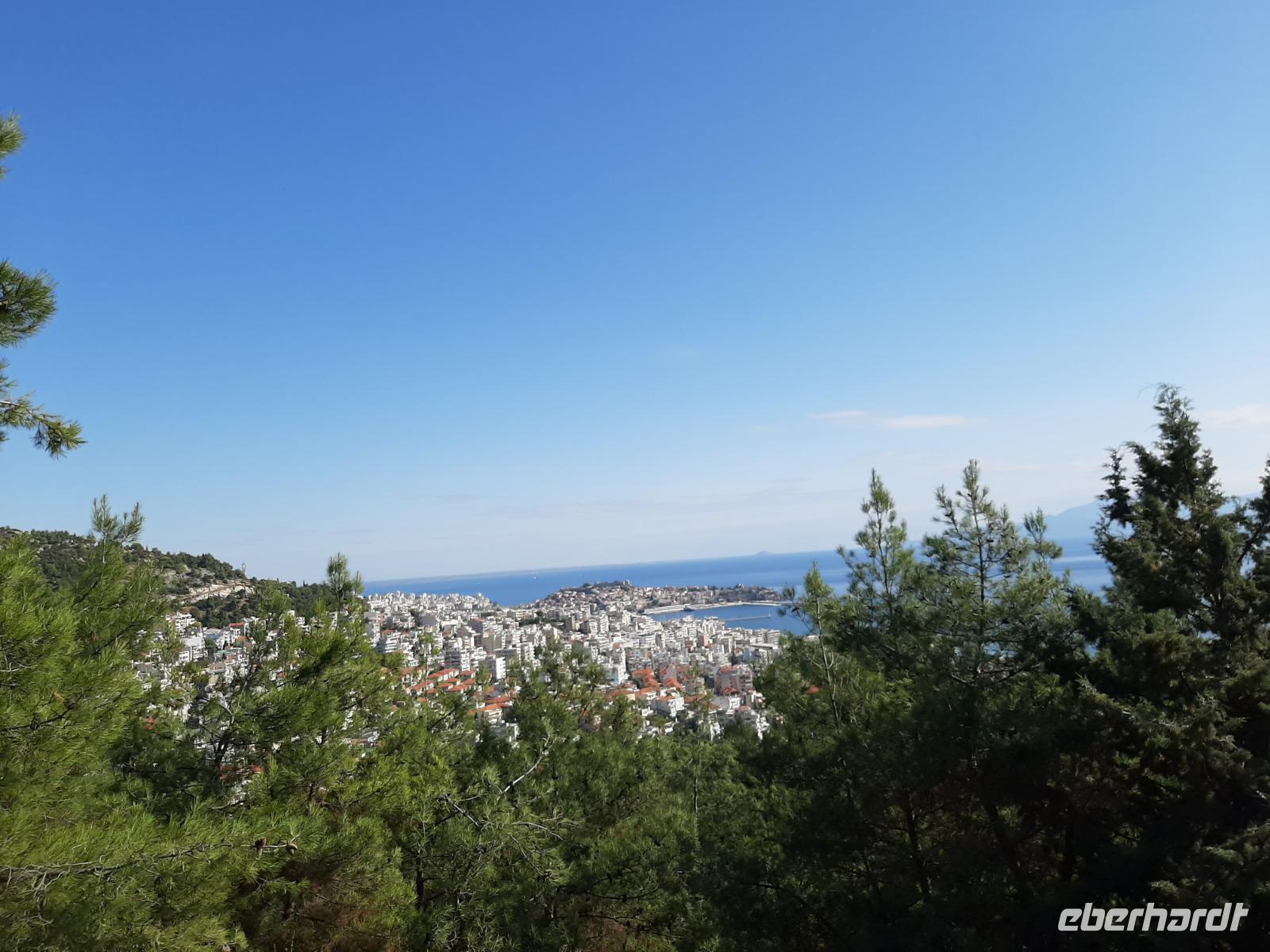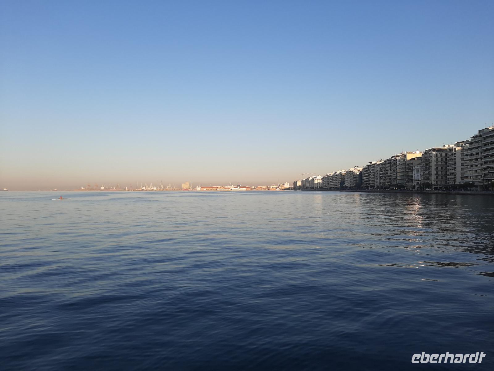 Für den heutigen Tag hatte sich der Großteil unserer Reisegruppe für den fakultativen Ausflug zum Berg Athos entschieden. Pünktlich am Morgen stand dafür ein griechischer Reisebus bereit, um uns nach Ouranopolis zu fahren. Unser Buschauffeur Jörg hatte nämlich aufgrund der gesetzlich vorgeschriebenen Lenk- und Ruhezeiten seinen ersten lenkfreien Tag! Die Fahrt führte uns in östliche Richtung und vorbei an zahlreichen Olivenhainen bis an die Westküste des sogenannten "3. Fingers" der Halbinsel Chalkidiki. Anastasia verkürzte uns die Fahrt und erklärte uns zunächst erst einmal wie der Großteil der Griechen ihren Morgen bestreitet. Sie verdeutlichte uns dies, indem sie den konstanten Streit zwischen beiden Beinen erklärte, von denen eben nur eines aufstehen möchte, während das andere unbedingt liegen bleiben möchte. Natürlich hat man bei solch einem Drama absolut keine Zeit für ein Frühstück, wie wir Deutschen es gewohnt sind. Trotzdem sollten wenig später alle auf ihre Kosten kommen - auf etwa halber Strecke zum Hafenstädtchen Ouranopolis machten wir Halt beim "Haus der Versuchungen", wie Anastasia es nannte (davon gibt es in Griechenland übrigens mehr als genug!!!). Erneut handelte es sich hier um eine Konditorei die, neben Espresso und Frappé allerlei griechische und internationale Köstlichkeiten anbietet. Gut gestärkt ging es schließlich weiter und pünktlich erreichen wir Ouranopolis, von wo aus wir zu unserem Schiffsausflug entlang der Küste der Mönchsrepublik Athos starteten. Für Frauen ist diese Art die Besichtigung auch heute noch die einzige Möglichkeit einen Blick auf die uralten Klöster und Eremitagen zu erlangen, denn es ist ihnen nach wie vor nicht gestattet, die Republik zu betreten. Aus ebendiesem Grund musste auch unser Schiff einen Mindestabstand von 500 Metern zum Festland einhalten. Es boten sich uns herrliche Impressionen bei bestem Wetter, bis wir schließlich am südlichen Ende der Landzunge den 2.033 Meter hohen Berg Athos erreichten. Nach guten drei Stunden waren wir am Hafen von Ouranopolis zurück, wo wir im Anschluss Zeit für ein gemütliches Mittagessen und einen kleinen Spaziergang durch die engen und malerischen Gassen hatten. Am späten Nachmittag traten wir dann, mit vielen schönen Eindrücken die Rückfahrt nach Thessaloniki an.