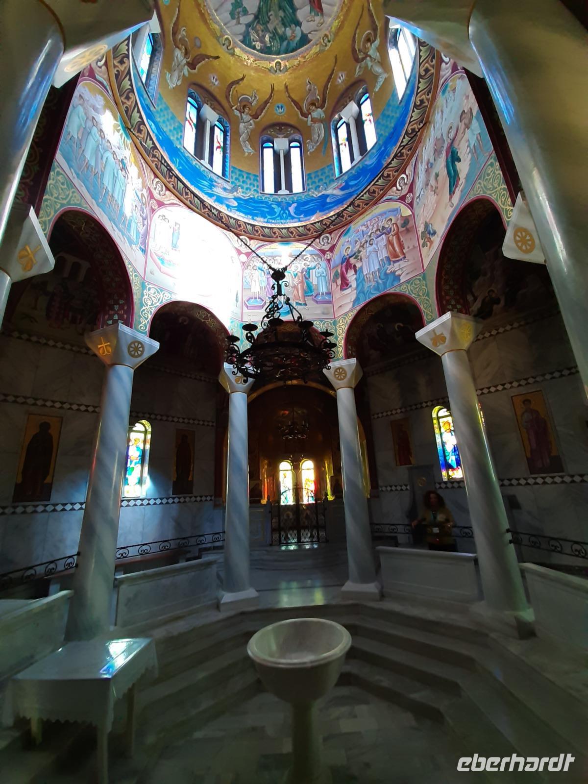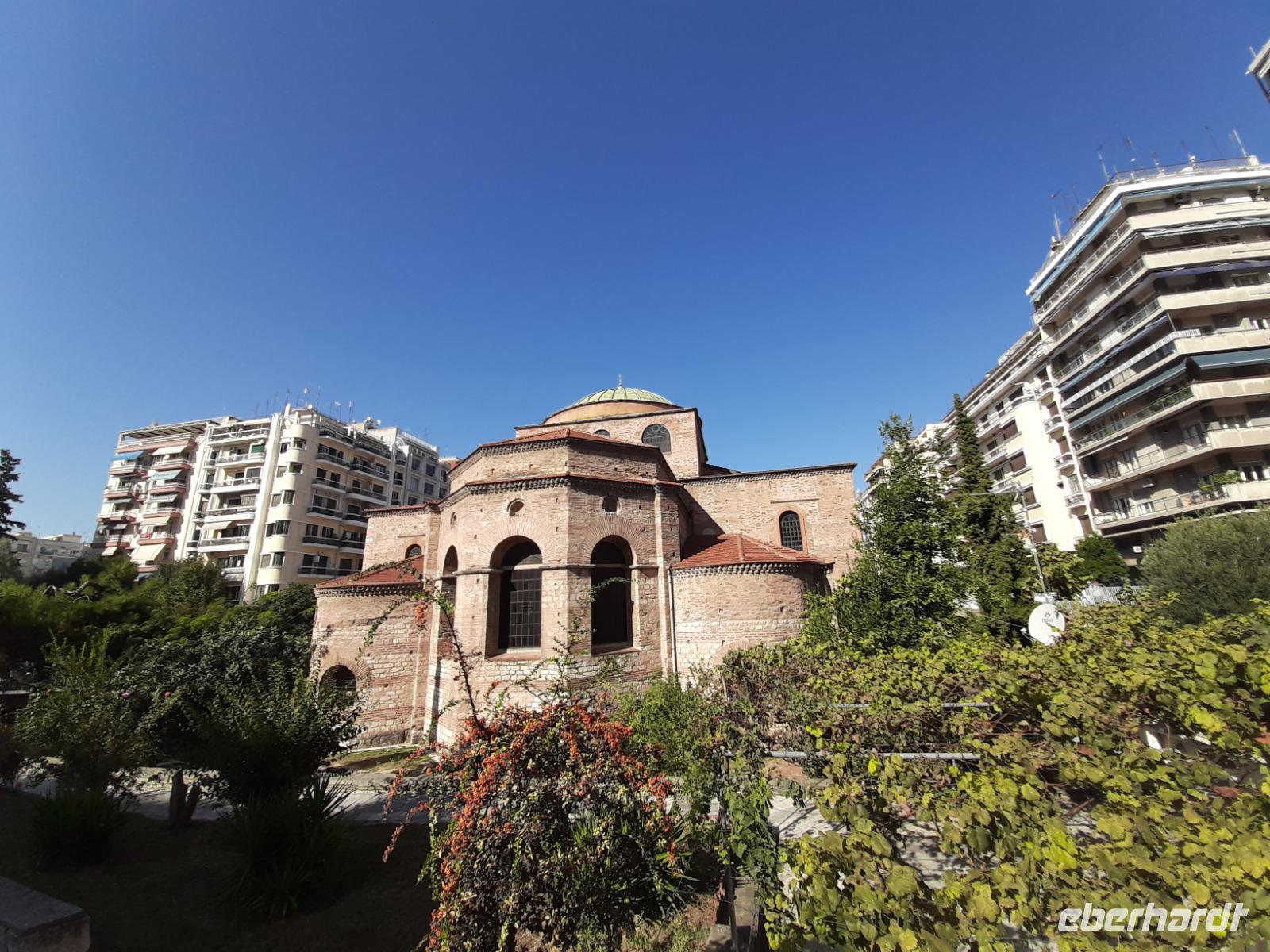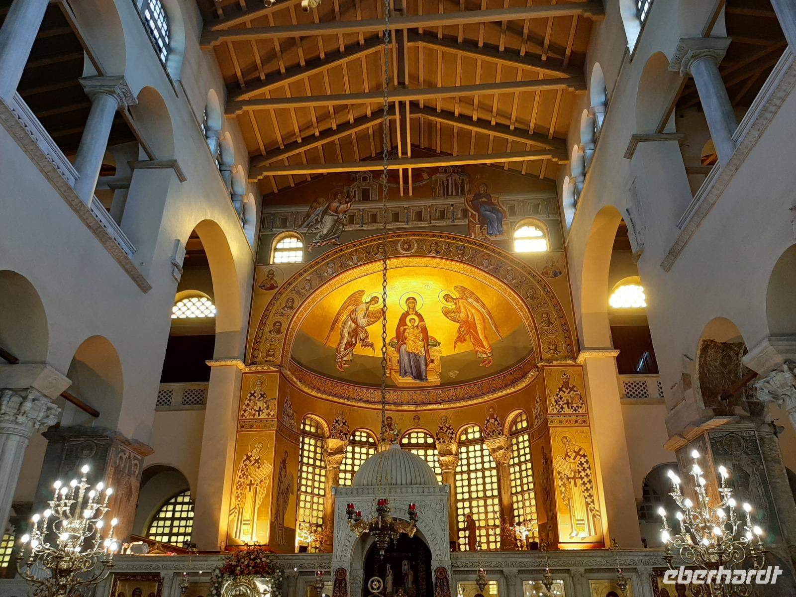 Für den heutigen Tag hatte sich der Großteil unserer Reisegruppe für den fakultativen Ausflug zum Berg Athos entschieden. Pünktlich am Morgen stand dafür ein griechischer Reisebus bereit, um uns nach Ouranopolis zu fahren. Unser Buschauffeur Jörg hatte nämlich aufgrund der gesetzlich vorgeschriebenen Lenk- und Ruhezeiten seinen ersten lenkfreien Tag! Die Fahrt führte uns in östliche Richtung und vorbei an zahlreichen Olivenhainen bis an die Westküste des sogenannten "3. Fingers" der Halbinsel Chalkidiki. Anastasia verkürzte uns die Fahrt und erklärte uns zunächst erst einmal wie der Großteil der Griechen ihren Morgen bestreitet. Sie verdeutlichte uns dies, indem sie den konstanten Streit zwischen beiden Beinen erklärte, von denen eben nur eines aufstehen möchte, während das andere unbedingt liegen bleiben möchte. Natürlich hat man bei solch einem Drama absolut keine Zeit für ein Frühstück, wie wir Deutschen es gewohnt sind. Trotzdem sollten wenig später alle auf ihre Kosten kommen - auf etwa halber Strecke zum Hafenstädtchen Ouranopolis machten wir Halt beim "Haus der Versuchungen", wie Anastasia es nannte (davon gibt es in Griechenland übrigens mehr als genug!!!). Erneut handelte es sich hier um eine Konditorei die, neben Espresso und Frappé allerlei griechische und internationale Köstlichkeiten anbietet. Gut gestärkt ging es schließlich weiter und pünktlich erreichen wir Ouranopolis, von wo aus wir zu unserem Schiffsausflug entlang der Küste der Mönchsrepublik Athos starteten. Für Frauen ist diese Art die Besichtigung auch heute noch die einzige Möglichkeit einen Blick auf die uralten Klöster und Eremitagen zu erlangen, denn es ist ihnen nach wie vor nicht gestattet, die Republik zu betreten. Aus ebendiesem Grund musste auch unser Schiff einen Mindestabstand von 500 Metern zum Festland einhalten. Es boten sich uns herrliche Impressionen bei bestem Wetter, bis wir schließlich am südlichen Ende der Landzunge den 2.033 Meter hohen Berg Athos erreichten. Nach guten drei Stunden waren wir am Hafen von Ouranopolis zurück, wo wir im Anschluss Zeit für ein gemütliches Mittagessen und einen kleinen Spaziergang durch die engen und malerischen Gassen hatten. Am späten Nachmittag traten wir dann, mit vielen schönen Eindrücken die Rückfahrt nach Thessaloniki an.