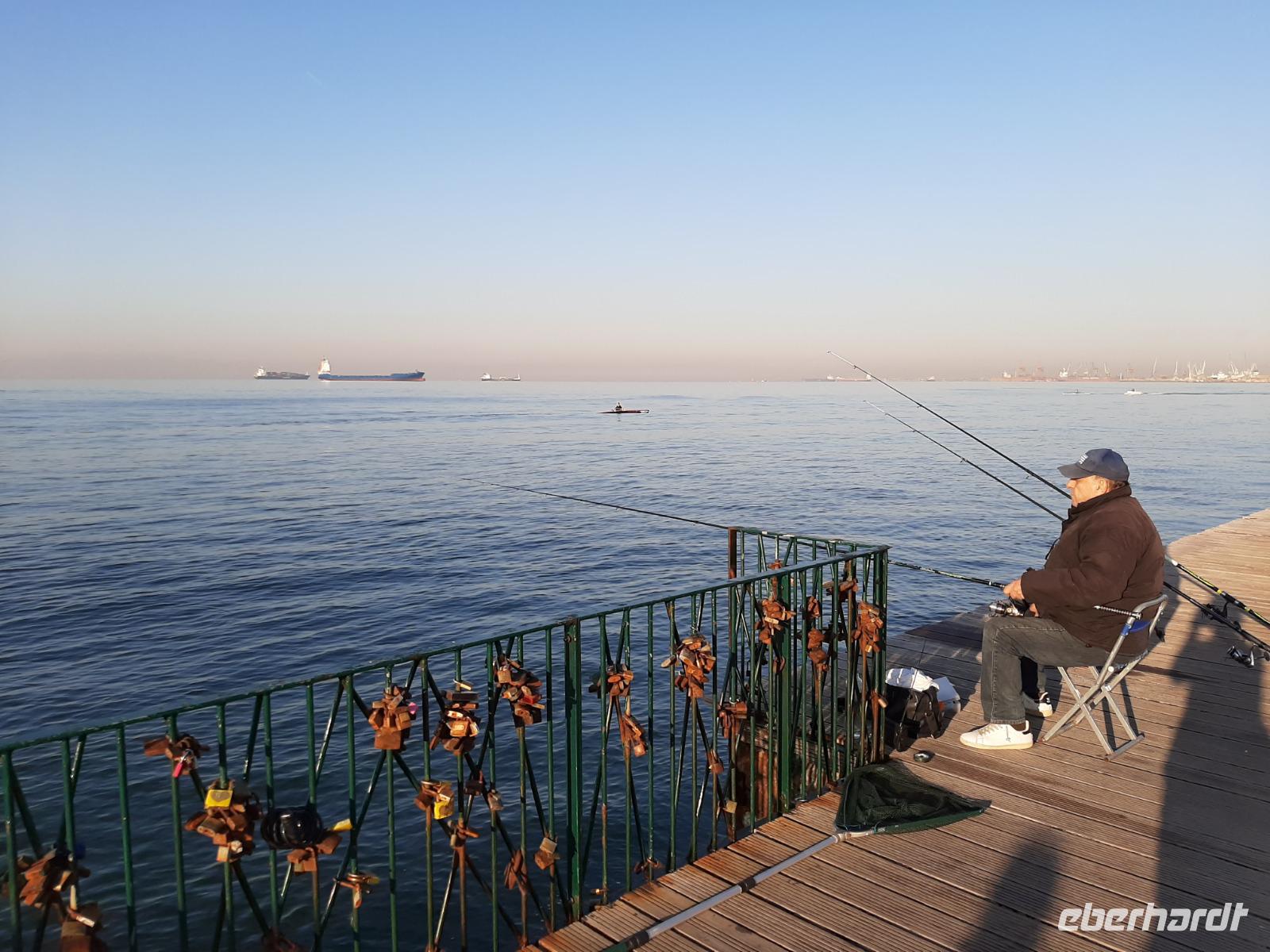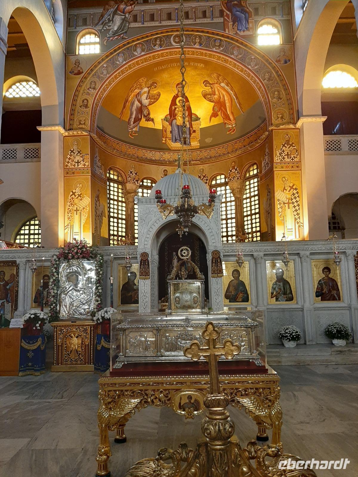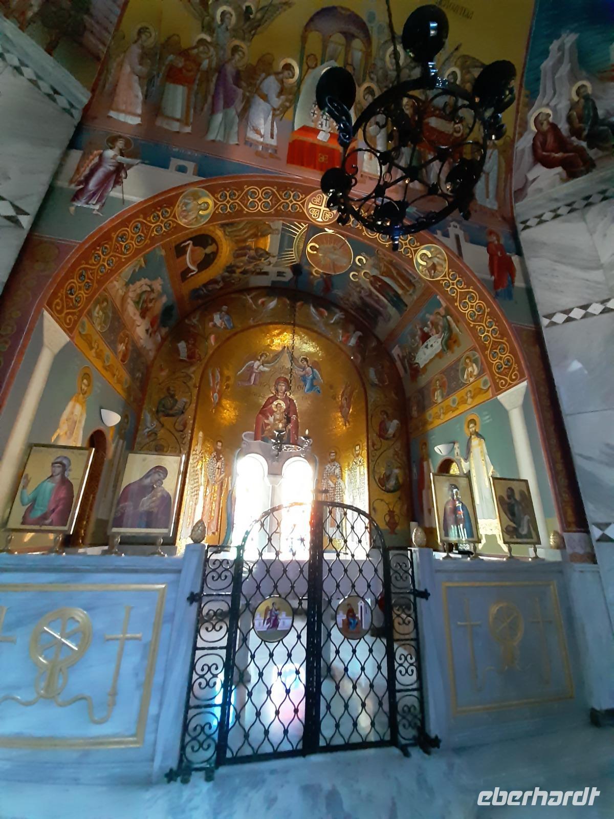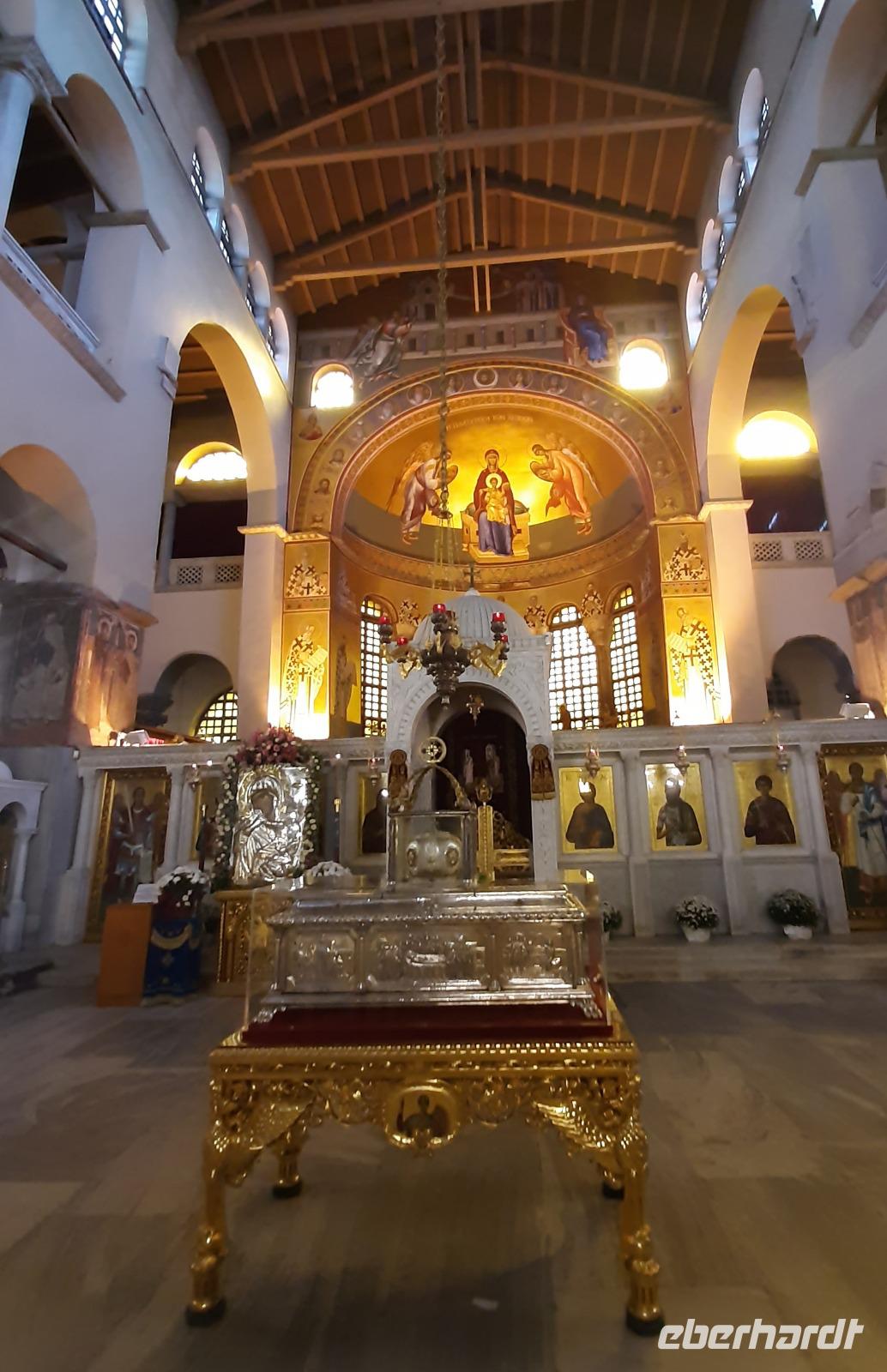 Für den heutigen Tag hatte sich der Großteil unserer Reisegruppe für den fakultativen Ausflug zum Berg Athos entschieden. Pünktlich am Morgen stand dafür ein griechischer Reisebus bereit, um uns nach Ouranopolis zu fahren. Unser Buschauffeur Jörg hatte nämlich aufgrund der gesetzlich vorgeschriebenen Lenk- und Ruhezeiten seinen ersten lenkfreien Tag! Die Fahrt führte uns in östliche Richtung und vorbei an zahlreichen Olivenhainen bis an die Westküste des sogenannten "3. Fingers" der Halbinsel Chalkidiki. Anastasia verkürzte uns die Fahrt und erklärte uns zunächst erst einmal wie der Großteil der Griechen ihren Morgen bestreitet. Sie verdeutlichte uns dies, indem sie den konstanten Streit zwischen beiden Beinen erklärte, von denen eben nur eines aufstehen möchte, während das andere unbedingt liegen bleiben möchte. Natürlich hat man bei solch einem Drama absolut keine Zeit für ein Frühstück, wie wir Deutschen es gewohnt sind. Trotzdem sollten wenig später alle auf ihre Kosten kommen - auf etwa halber Strecke zum Hafenstädtchen Ouranopolis machten wir Halt beim "Haus der Versuchungen", wie Anastasia es nannte (davon gibt es in Griechenland übrigens mehr als genug!!!). Erneut handelte es sich hier um eine Konditorei die, neben Espresso und Frappé allerlei griechische und internationale Köstlichkeiten anbietet. Gut gestärkt ging es schließlich weiter und pünktlich erreichen wir Ouranopolis, von wo aus wir zu unserem Schiffsausflug entlang der Küste der Mönchsrepublik Athos starteten. Für Frauen ist diese Art die Besichtigung auch heute noch die einzige Möglichkeit einen Blick auf die uralten Klöster und Eremitagen zu erlangen, denn es ist ihnen nach wie vor nicht gestattet, die Republik zu betreten. Aus ebendiesem Grund musste auch unser Schiff einen Mindestabstand von 500 Metern zum Festland einhalten. Es boten sich uns herrliche Impressionen bei bestem Wetter, bis wir schließlich am südlichen Ende der Landzunge den 2.033 Meter hohen Berg Athos erreichten. Nach guten drei Stunden waren wir am Hafen von Ouranopolis zurück, wo wir im Anschluss Zeit für ein gemütliches Mittagessen und einen kleinen Spaziergang durch die engen und malerischen Gassen hatten. Am späten Nachmittag traten wir dann, mit vielen schönen Eindrücken die Rückfahrt nach Thessaloniki an.