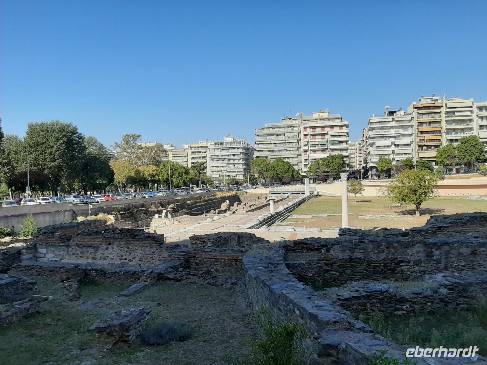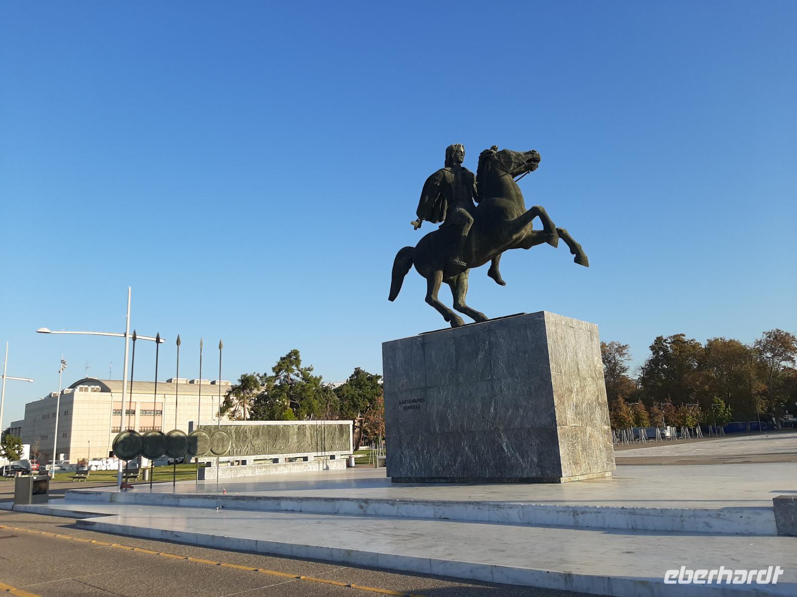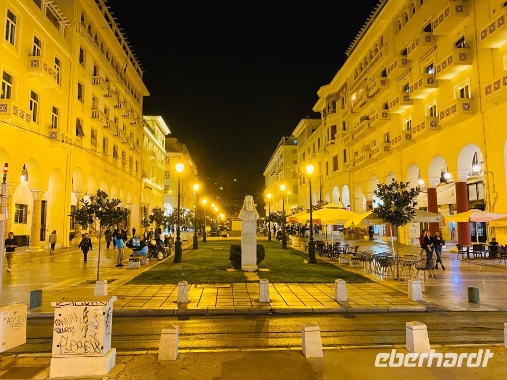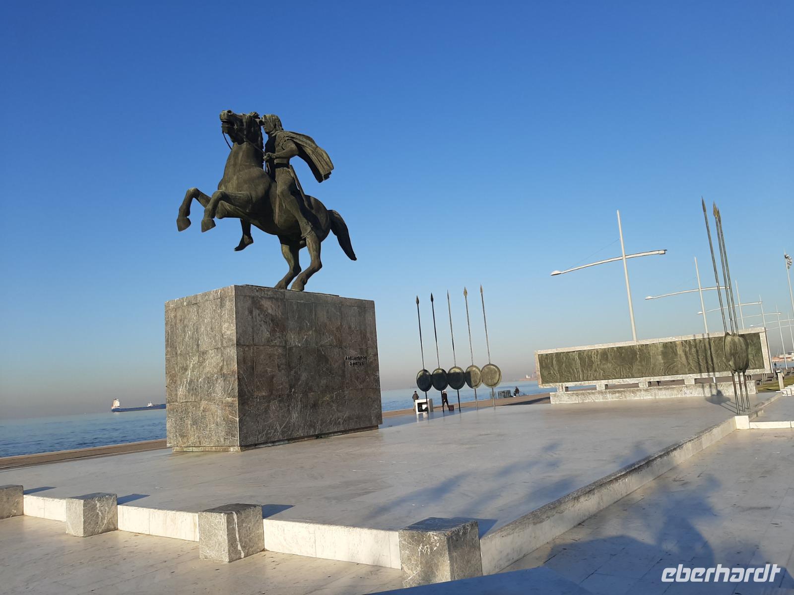 Zunächst begrüßten wir unsere 7 Fluggäste, die am Vortag aus Deutschland angereist waren und unsere Reisefamilie komplettierten. Der heutige Weg stand ganz im Zeichen der großen makedonischen Könige. Zunächst ging durch die makedonische Ebene und vorbei an unzähligen Baumwollfeldern bis nach Pella, der ehemaligen Hauptstadt des Königreiches. Sie war immerhin der Geburtsort von Phillip II. und seinem berühmten Sohn Alexander dem Großen. Diese glanzvolle Stadt wurde später durch die Römer zerstört und die wertvollen Überreste gerieten dann leider bis in die Neuzeit in Vergessenheit. Wir besuchten auch das archäologische Museum, wo die Funde der Ausgrabungen auf dem Gebiet der antiken Stadt ausgestellt sind. Den Höhepunkt bildeten die beeindruckenden Kieselsteinmosaike sowie kunstvolle Goldfunde und Grabbeigaben - wirklich faszinierend! Tief beeindruckt verließen wir Pella und erreichten wenig später Vergina, die frühere Hauptstadt Makedoniens. Hier befinden sich die berühmtesten archäologischen Funde Nordgriechenlands, denn dieser Ort diente über Jahrhunderte als Begräbnisstätte für die makedonischen Könige. Man fand immerhin neun dieser Gräber in der Umgebung von Vergina, darunter auch das ungeplünderte Grab des Makedonierkönigs Phillip II. aus dem 4. Jh. v. Chr. Heute sind diese Gräber an ihrem ursprünglichen Ort samt Museum für die Öffentlichkeit zugänglich und wie zu antiken Zeiten unter einem riesigen Grabhügel verborgen. In der authentischen Dunkelheit des Museums sind wir geblendet von den beeindruckenden Gold- und Silberschätzen! Am Nachmittag fuhren wir nach Thessaloniki zurück und hatten heute vor dem Abendessen noch die Möglichkeit einen individuellen Spaziergang in der Innenstadt zu unternehmen.