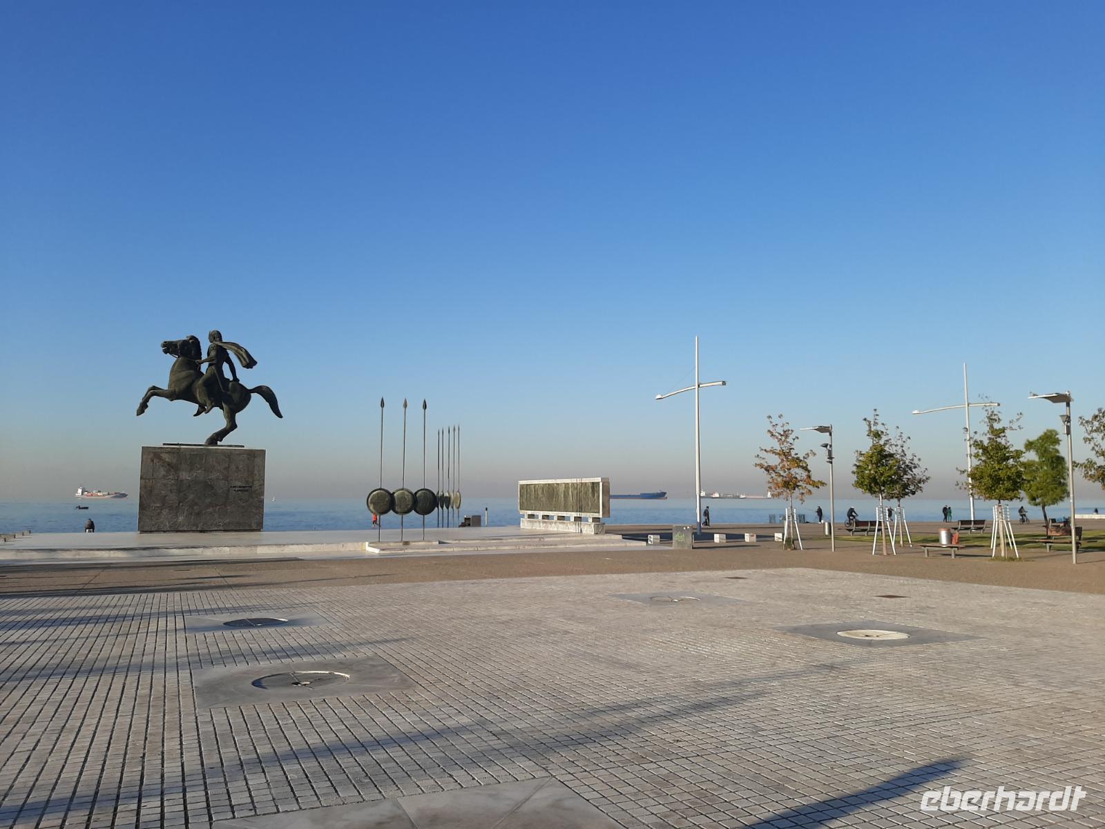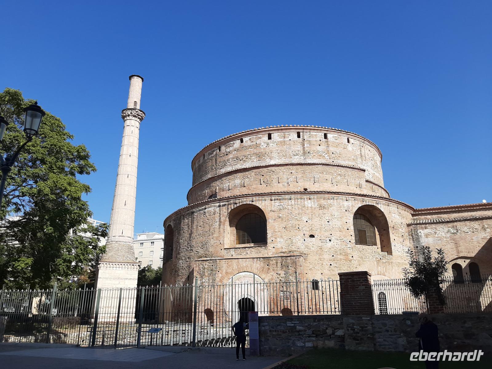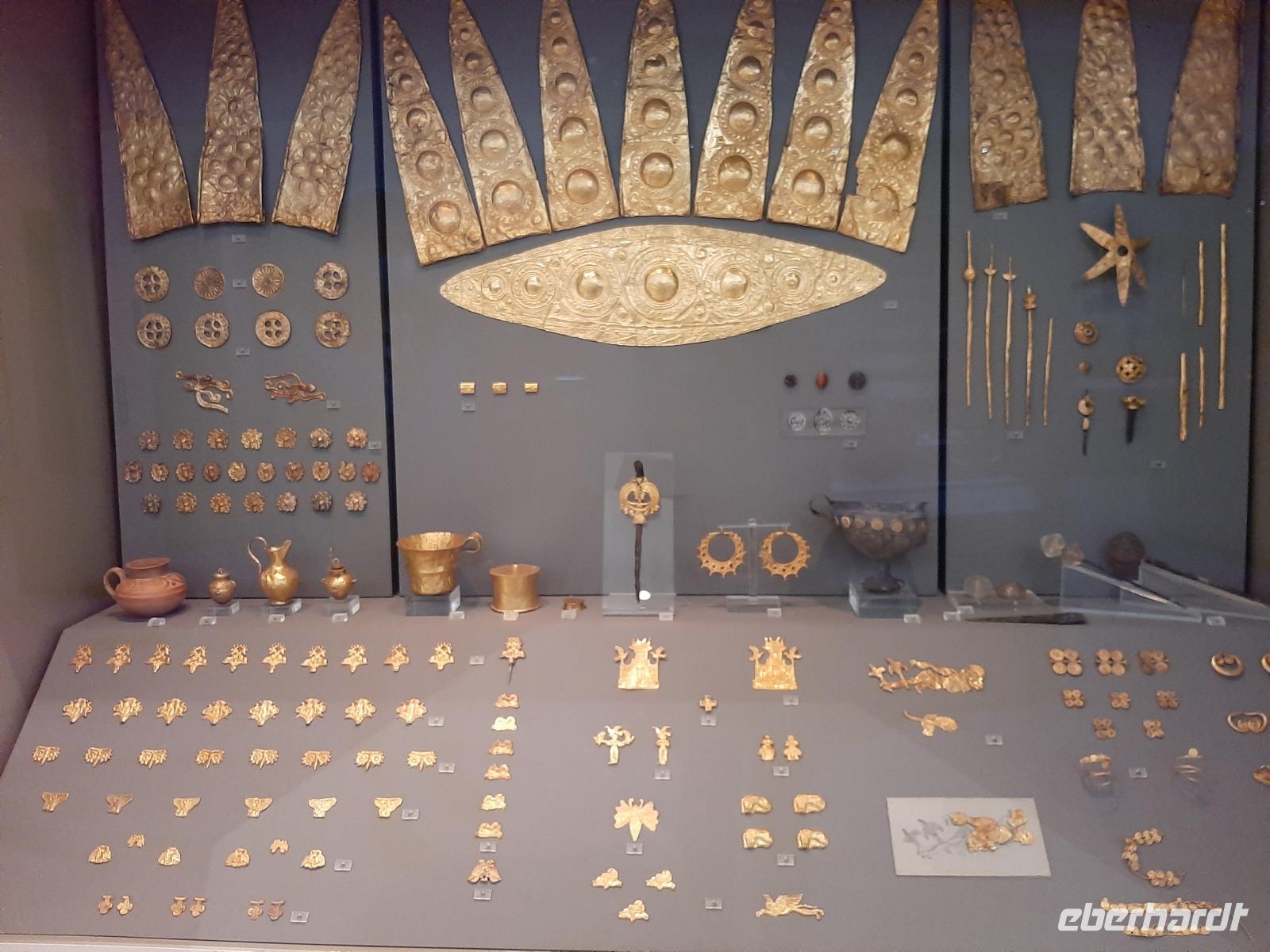 Zunächst begrüßten wir unsere 7 Fluggäste, die am Vortag aus Deutschland angereist waren und unsere Reisefamilie komplettierten. Der heutige Weg stand ganz im Zeichen der großen makedonischen Könige. Zunächst ging durch die makedonische Ebene und vorbei an unzähligen Baumwollfeldern bis nach Pella, der ehemaligen Hauptstadt des Königreiches. Sie war immerhin der Geburtsort von Phillip II. und seinem berühmten Sohn Alexander dem Großen. Diese glanzvolle Stadt wurde später durch die Römer zerstört und die wertvollen Überreste gerieten dann leider bis in die Neuzeit in Vergessenheit. Wir besuchten auch das archäologische Museum, wo die Funde der Ausgrabungen auf dem Gebiet der antiken Stadt ausgestellt sind. Den Höhepunkt bildeten die beeindruckenden Kieselsteinmosaike sowie kunstvolle Goldfunde und Grabbeigaben - wirklich faszinierend! Tief beeindruckt verließen wir Pella und erreichten wenig später Vergina, die frühere Hauptstadt Makedoniens. Hier befinden sich die berühmtesten archäologischen Funde Nordgriechenlands, denn dieser Ort diente über Jahrhunderte als Begräbnisstätte für die makedonischen Könige. Man fand immerhin neun dieser Gräber in der Umgebung von Vergina, darunter auch das ungeplünderte Grab des Makedonierkönigs Phillip II. aus dem 4. Jh. v. Chr. Heute sind diese Gräber an ihrem ursprünglichen Ort samt Museum für die Öffentlichkeit zugänglich und wie zu antiken Zeiten unter einem riesigen Grabhügel verborgen. In der authentischen Dunkelheit des Museums sind wir geblendet von den beeindruckenden Gold- und Silberschätzen! Am Nachmittag fuhren wir nach Thessaloniki zurück und hatten heute vor dem Abendessen noch die Möglichkeit einen individuellen Spaziergang in der Innenstadt zu unternehmen.
