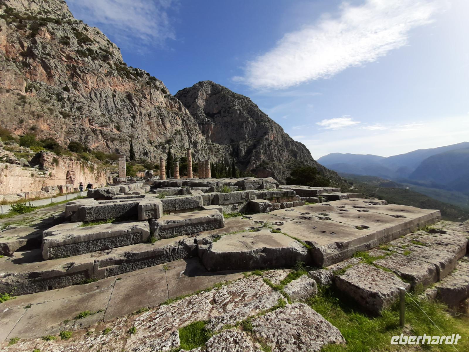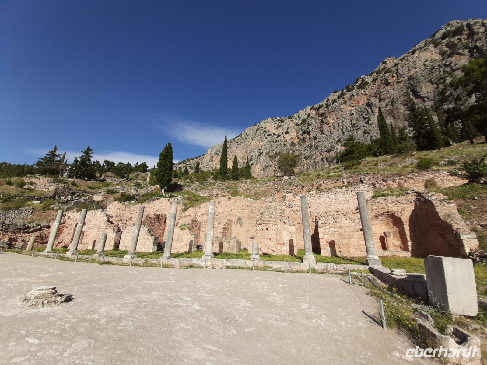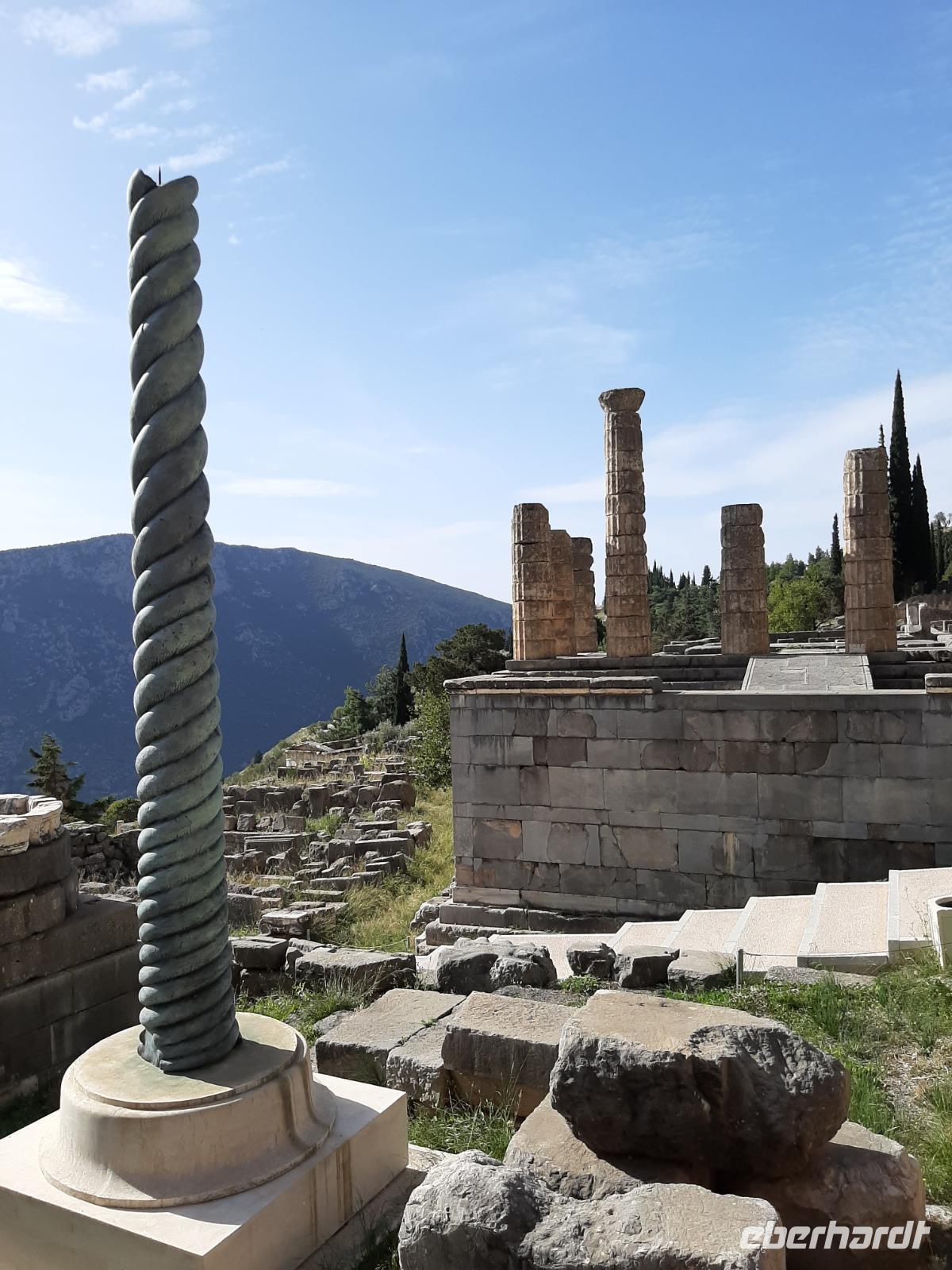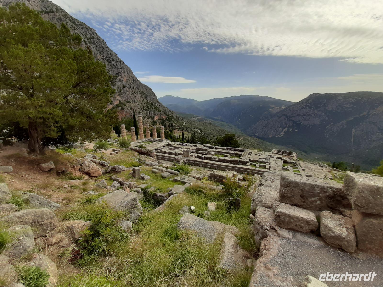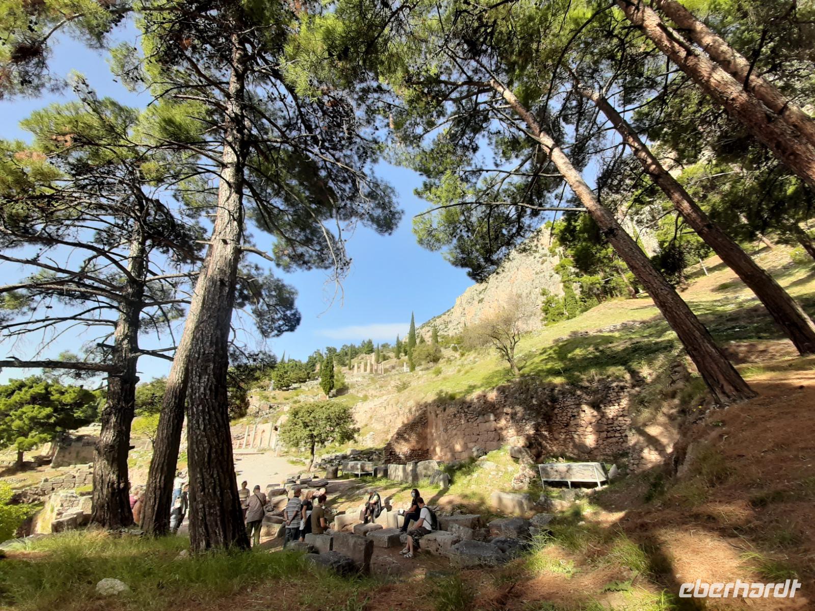 Den heutigen Tag hatten sich einige bereits herbeigesehnt, denn der Besuch von Delphi, dem "Nabel der Welt", stand an. Es handelt sich hier um das Heiligtum des Apollon und gleichzeitig um das größte und wichtigste Orakel der Antike. Zunächst durchfuhren wir die weiten Olivenhaine und schließlich die Hänge des Parnassus-Gebirges hinauf, wo wir auf etwa 700 Metern das neue Dorf Delphi erreichten. Wir besuchten zuerst die archäologische Stätte und über den ehemaligen Marktplatz gelangten wir zum heiligen Bezirk, welcher im 7. Jh. v. Chr. gegründet wurde. Hier fiel die Phytia mittels berauschender Dämpfe aus einer Erdspalte in Trance und wurde so zum Medium des Gottes Apollon, dessen Tempel wir heute zumindest noch in Teilen besichtigen konnten. Eindrücklich waren aber auch die Überreste der Schatzhäuser verschiedener griechischer Stadtstaaten, in denen die kostbaren Weihegaben aufbewahrt wurden. Wie an vielen Orten der Antike fanden auch in Delphi unweit des Heiligtums regelmäßig sportliche Wettkämpfe statt. So war Delphi mit seinen Panhellenischen Spielen der zweitwichtigste Austragungsort nach Olympia. Danach stand der Besuch des Museums auf unserem Programm, wo die Funde der langjährigen Ausgrabungen ausgestellt wurden. Besonders sehenswert waren die Überreste der Skulpturen aus den Giebelfeldern des Apollon-Tempels sowie die weltberühmte Bronzestatue des "Wagenlenkers von Delphi", die bei einem Erdbeben im 4. Jh. v. Chr. verschüttet wurde und daher in einem beeindruckenden Zustand geblieben ist. Gegen Mittag setzten wir unsere Reise durch das Parnassus-Gebirge fort und legten einen Stopp mit einer wunderbaren Aussicht auf den mondänen, aber malerisch gelegenen Wintersportort Arachova ein. Hier verbrachten wir auch unsere Mittagspause mit deutschen Würstchen, bevor wir zu unserem nächsten Ziel aufbrachen. Kurze Zeit später erreichten wir das Kloster Hosios Lukas aus dem 11. Jh., eines der drei bedeutendsten byzantinischen Klöster Griechenlands. Besonders beeindruckte uns das Katholikon, die dem Lukas geweihte Hauptkirche mit seinen fantastischen Mosaiken, deren Erhaltungszustand in Griechenland einzigartig ist. Die weitere Fahrt führte uns anschließend vorbei an Athen und Korinth bis zum "Alkyon Resort Hotel" in Vrachati, unserem Domizil für weitere vier Nächte. Hier waren wir nun auf der Halbinsel Peloponnes angekommen!