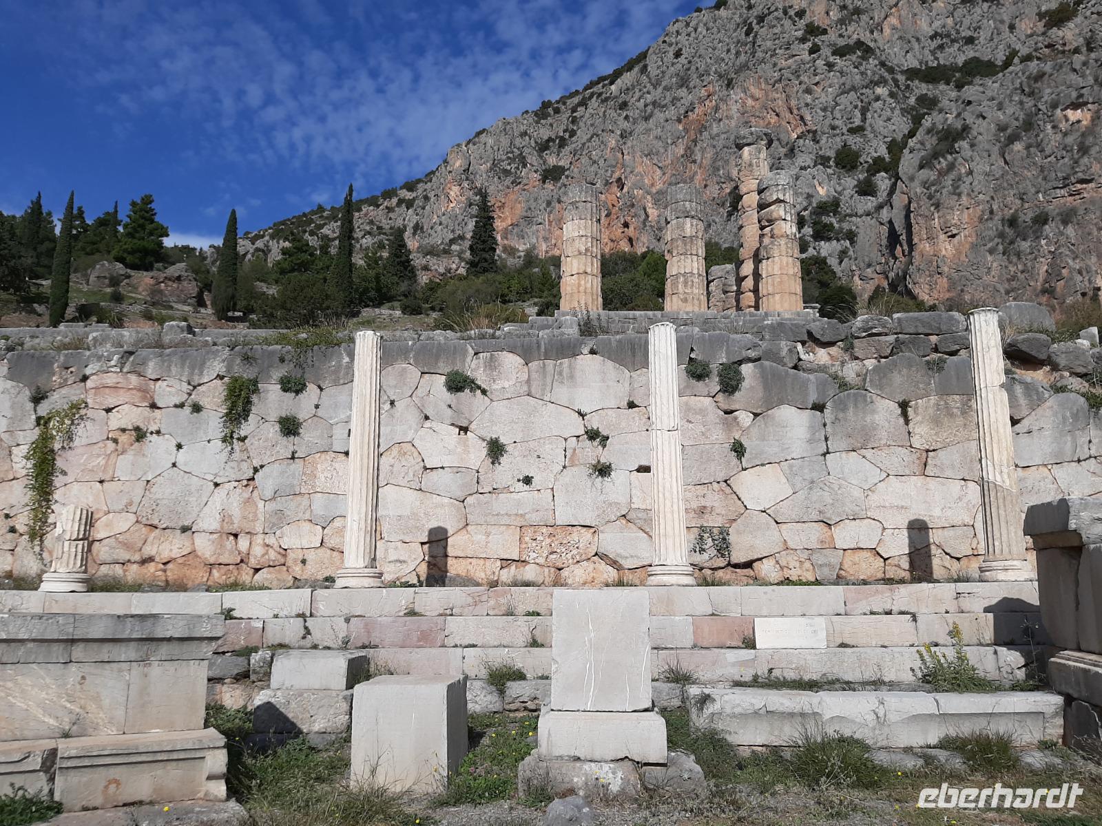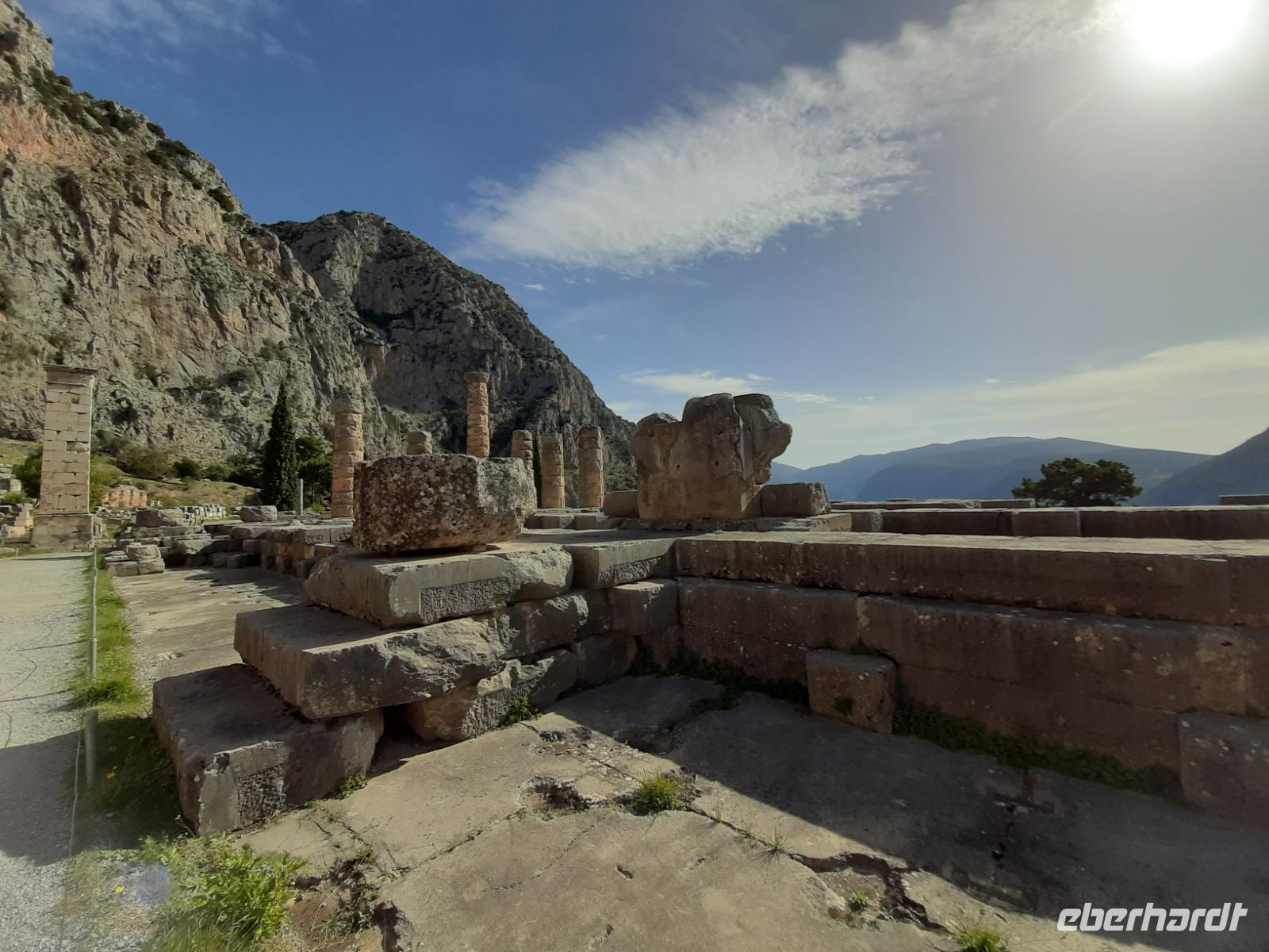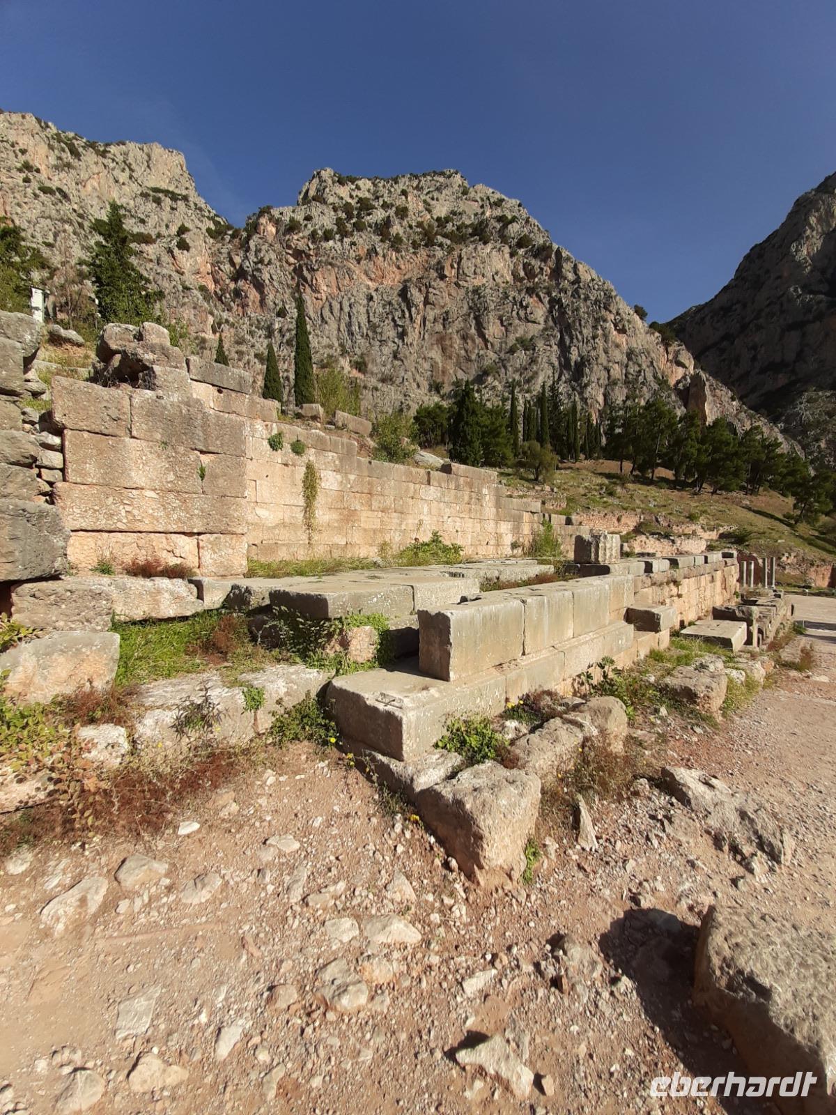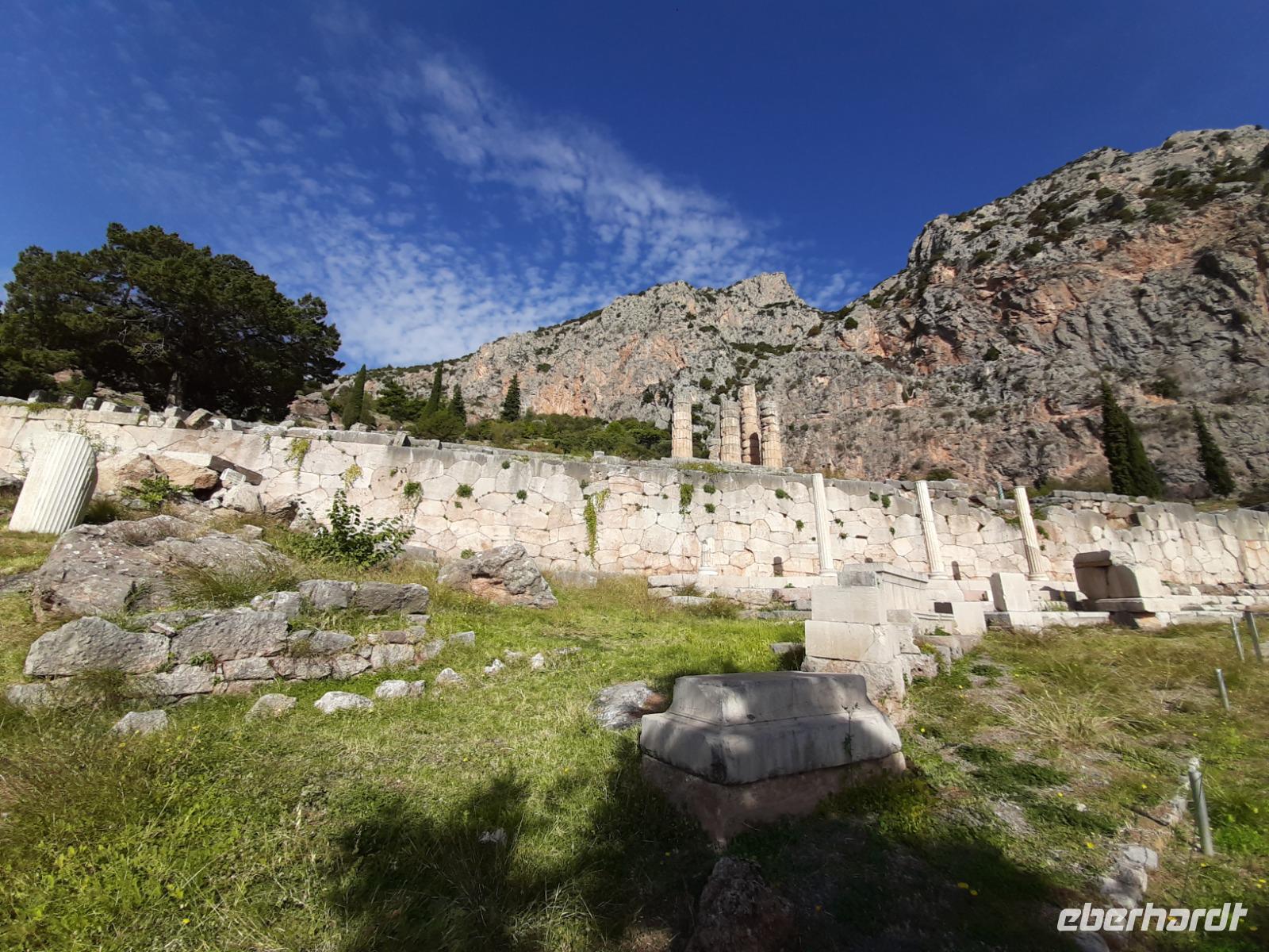 Den heutigen Tag hatten sich einige bereits herbeigesehnt, denn der Besuch von Delphi, dem "Nabel der Welt", stand an. Es handelt sich hier um das Heiligtum des Apollon und gleichzeitig um das größte und wichtigste Orakel der Antike. Zunächst durchfuhren wir die weiten Olivenhaine und schließlich die Hänge des Parnassus-Gebirges hinauf, wo wir auf etwa 700 Metern das neue Dorf Delphi erreichten. Wir besuchten zuerst die archäologische Stätte und über den ehemaligen Marktplatz gelangten wir zum heiligen Bezirk, welcher im 7. Jh. v. Chr. gegründet wurde. Hier fiel die Phytia mittels berauschender Dämpfe aus einer Erdspalte in Trance und wurde so zum Medium des Gottes Apollon, dessen Tempel wir heute zumindest noch in Teilen besichtigen konnten. Eindrücklich waren aber auch die Überreste der Schatzhäuser verschiedener griechischer Stadtstaaten, in denen die kostbaren Weihegaben aufbewahrt wurden. Wie an vielen Orten der Antike fanden auch in Delphi unweit des Heiligtums regelmäßig sportliche Wettkämpfe statt. So war Delphi mit seinen Panhellenischen Spielen der zweitwichtigste Austragungsort nach Olympia. Danach stand der Besuch des Museums auf unserem Programm, wo die Funde der langjährigen Ausgrabungen ausgestellt wurden. Besonders sehenswert waren die Überreste der Skulpturen aus den Giebelfeldern des Apollon-Tempels sowie die weltberühmte Bronzestatue des "Wagenlenkers von Delphi", die bei einem Erdbeben im 4. Jh. v. Chr. verschüttet wurde und daher in einem beeindruckenden Zustand geblieben ist. Gegen Mittag setzten wir unsere Reise durch das Parnassus-Gebirge fort und legten einen Stopp mit einer wunderbaren Aussicht auf den mondänen, aber malerisch gelegenen Wintersportort Arachova ein. Hier verbrachten wir auch unsere Mittagspause mit deutschen Würstchen, bevor wir zu unserem nächsten Ziel aufbrachen. Kurze Zeit später erreichten wir das Kloster Hosios Lukas aus dem 11. Jh., eines der drei bedeutendsten byzantinischen Klöster Griechenlands. Besonders beeindruckte uns das Katholikon, die dem Lukas geweihte Hauptkirche mit seinen fantastischen Mosaiken, deren Erhaltungszustand in Griechenland einzigartig ist. Die weitere Fahrt führte uns anschließend vorbei an Athen und Korinth bis zum "Alkyon Resort Hotel" in Vrachati, unserem Domizil für weitere vier Nächte. Hier waren wir nun auf der Halbinsel Peloponnes angekommen!