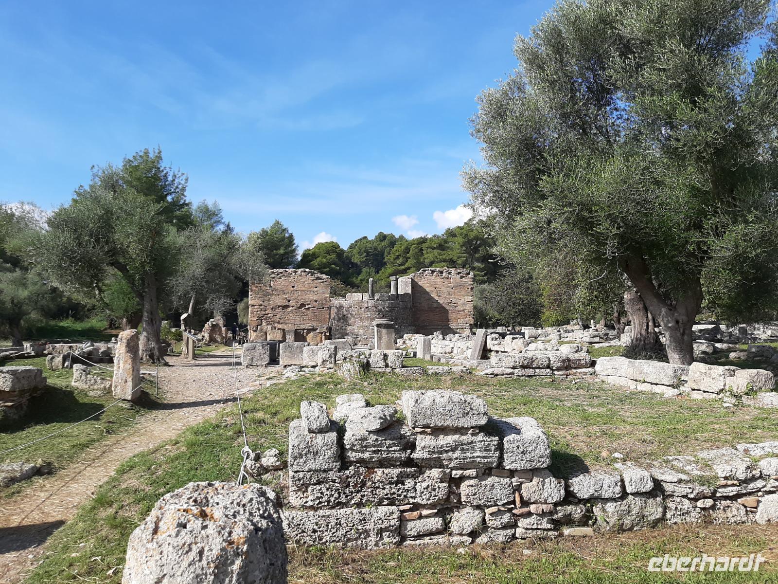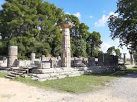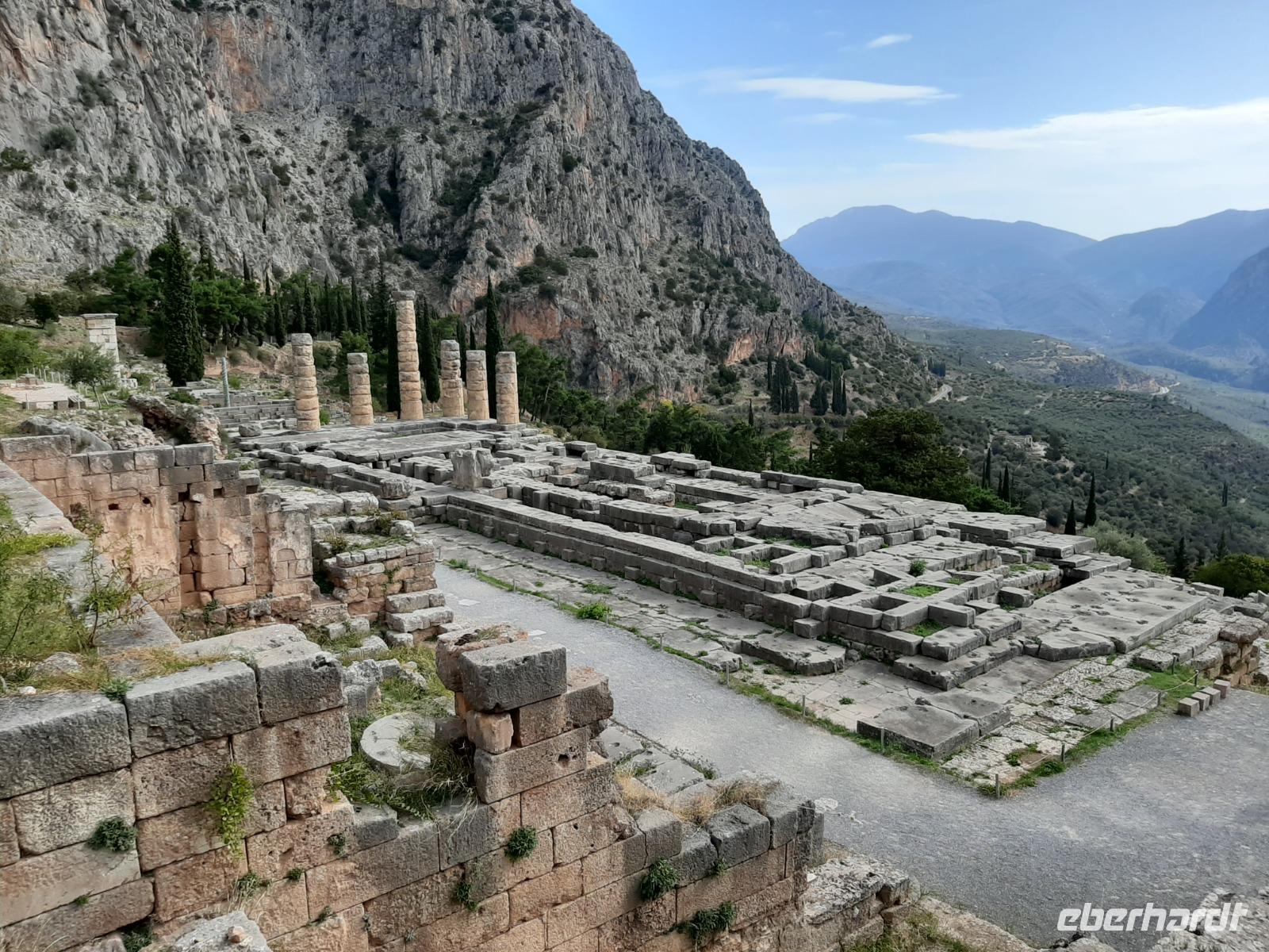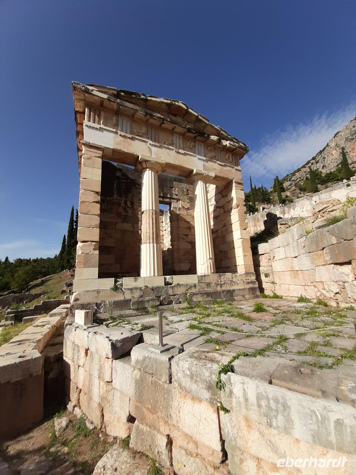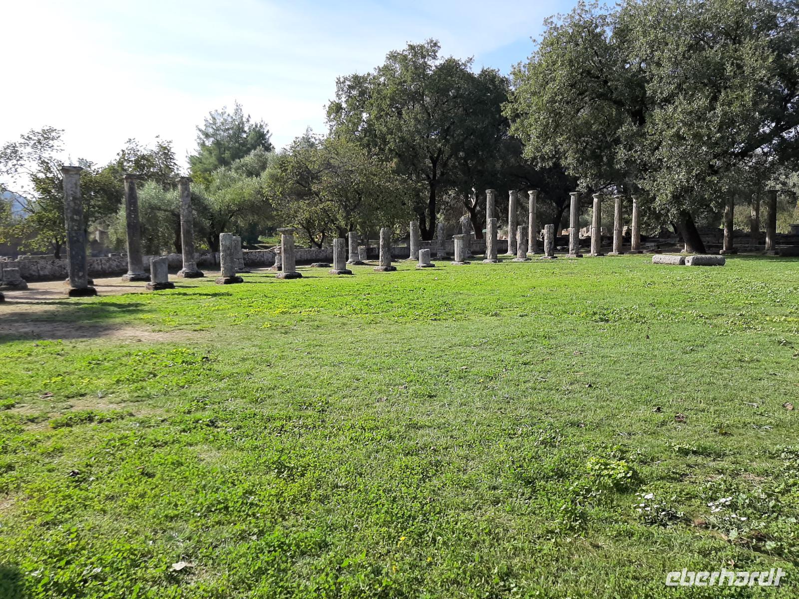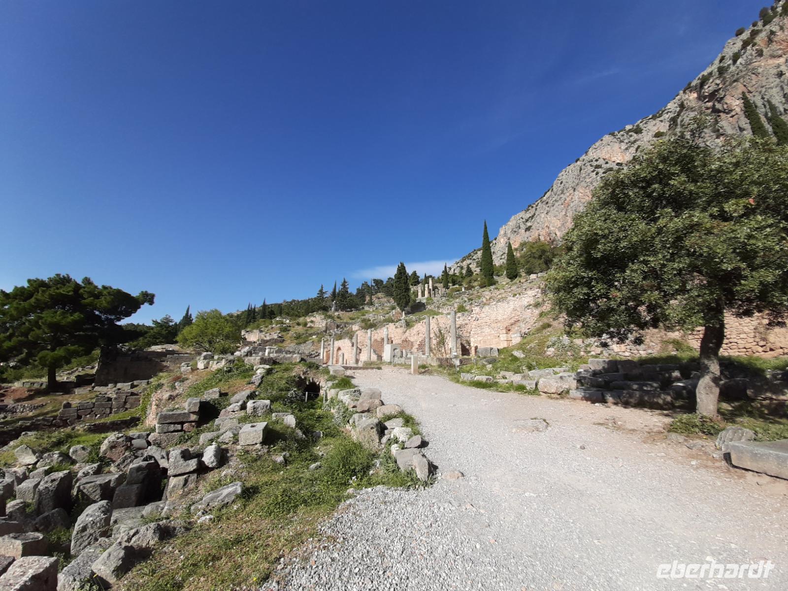 Den heutigen Tag hatten sich einige bereits herbeigesehnt, denn der Besuch von Delphi, dem "Nabel der Welt", stand an. Es handelt sich hier um das Heiligtum des Apollon und gleichzeitig um das größte und wichtigste Orakel der Antike. Zunächst durchfuhren wir die weiten Olivenhaine und schließlich die Hänge des Parnassus-Gebirges hinauf, wo wir auf etwa 700 Metern das neue Dorf Delphi erreichten. Wir besuchten zuerst die archäologische Stätte und über den ehemaligen Marktplatz gelangten wir zum heiligen Bezirk, welcher im 7. Jh. v. Chr. gegründet wurde. Hier fiel die Phytia mittels berauschender Dämpfe aus einer Erdspalte in Trance und wurde so zum Medium des Gottes Apollon, dessen Tempel wir heute zumindest noch in Teilen besichtigen konnten. Eindrücklich waren aber auch die Überreste der Schatzhäuser verschiedener griechischer Stadtstaaten, in denen die kostbaren Weihegaben aufbewahrt wurden. Wie an vielen Orten der Antike fanden auch in Delphi unweit des Heiligtums regelmäßig sportliche Wettkämpfe statt. So war Delphi mit seinen Panhellenischen Spielen der zweitwichtigste Austragungsort nach Olympia. Danach stand der Besuch des Museums auf unserem Programm, wo die Funde der langjährigen Ausgrabungen ausgestellt wurden. Besonders sehenswert waren die Überreste der Skulpturen aus den Giebelfeldern des Apollon-Tempels sowie die weltberühmte Bronzestatue des "Wagenlenkers von Delphi", die bei einem Erdbeben im 4. Jh. v. Chr. verschüttet wurde und daher in einem beeindruckenden Zustand geblieben ist. Gegen Mittag setzten wir unsere Reise durch das Parnassus-Gebirge fort und legten einen Stopp mit einer wunderbaren Aussicht auf den mondänen, aber malerisch gelegenen Wintersportort Arachova ein. Hier verbrachten wir auch unsere Mittagspause mit deutschen Würstchen, bevor wir zu unserem nächsten Ziel aufbrachen. Kurze Zeit später erreichten wir das Kloster Hosios Lukas aus dem 11. Jh., eines der drei bedeutendsten byzantinischen Klöster Griechenlands. Besonders beeindruckte uns das Katholikon, die dem Lukas geweihte Hauptkirche mit seinen fantastischen Mosaiken, deren Erhaltungszustand in Griechenland einzigartig ist. Die weitere Fahrt führte uns anschließend vorbei an Athen und Korinth bis zum "Alkyon Resort Hotel" in Vrachati, unserem Domizil für weitere vier Nächte. Hier waren wir nun auf der Halbinsel Peloponnes angekommen!