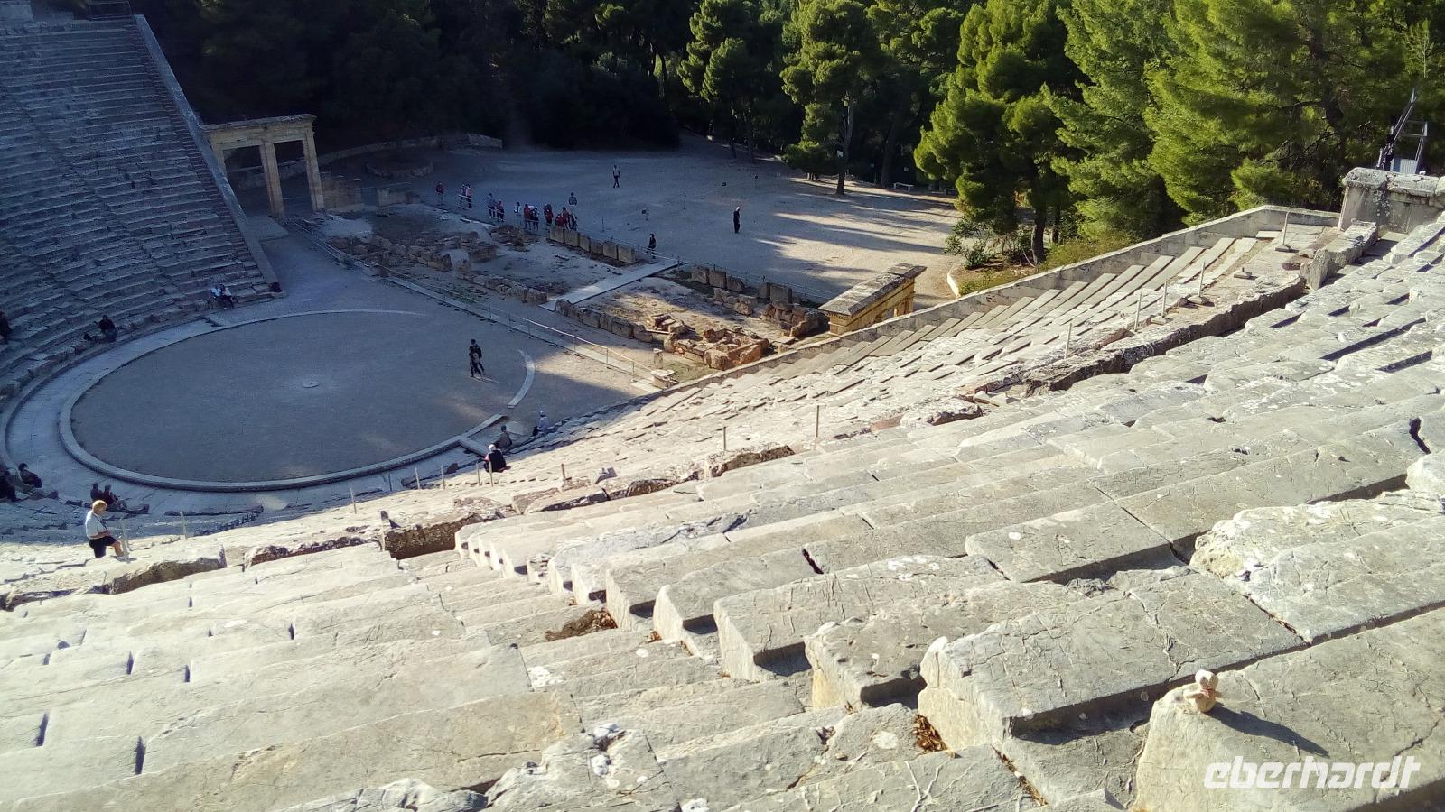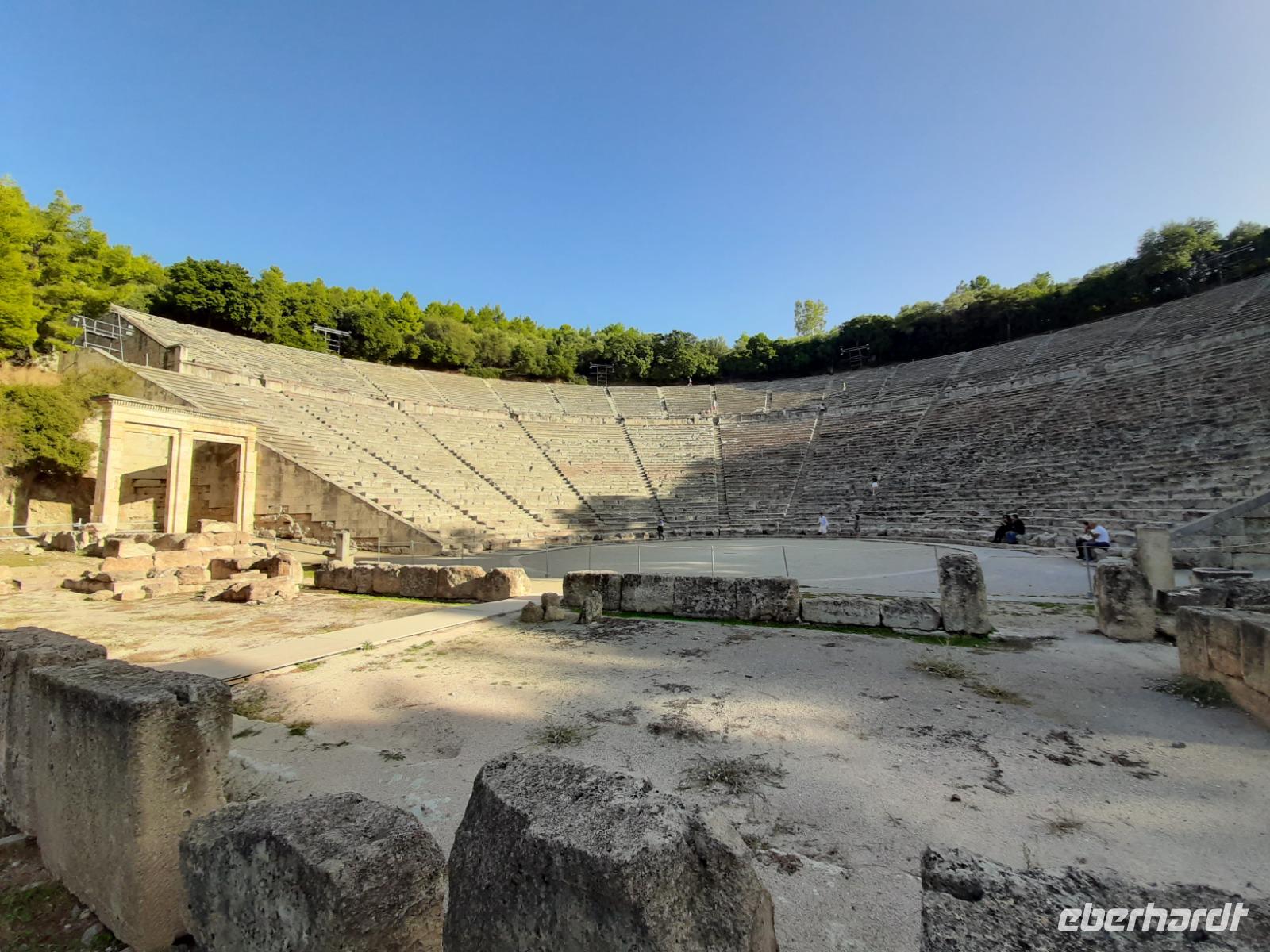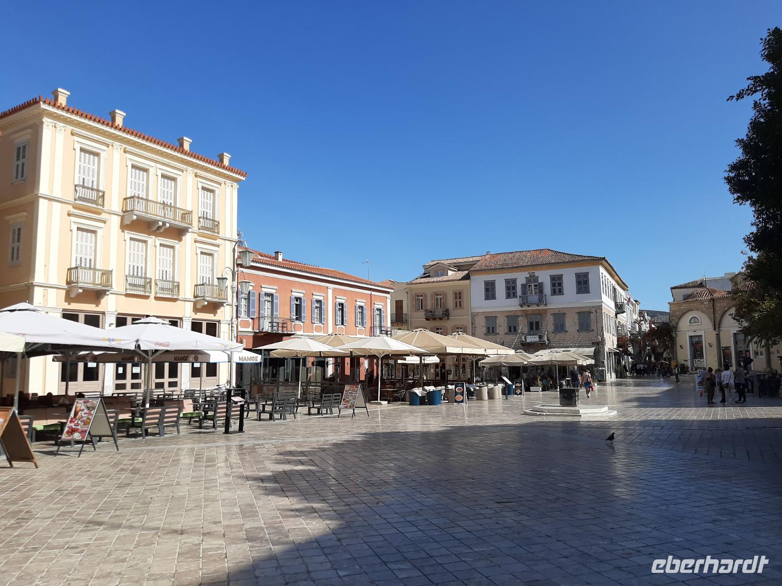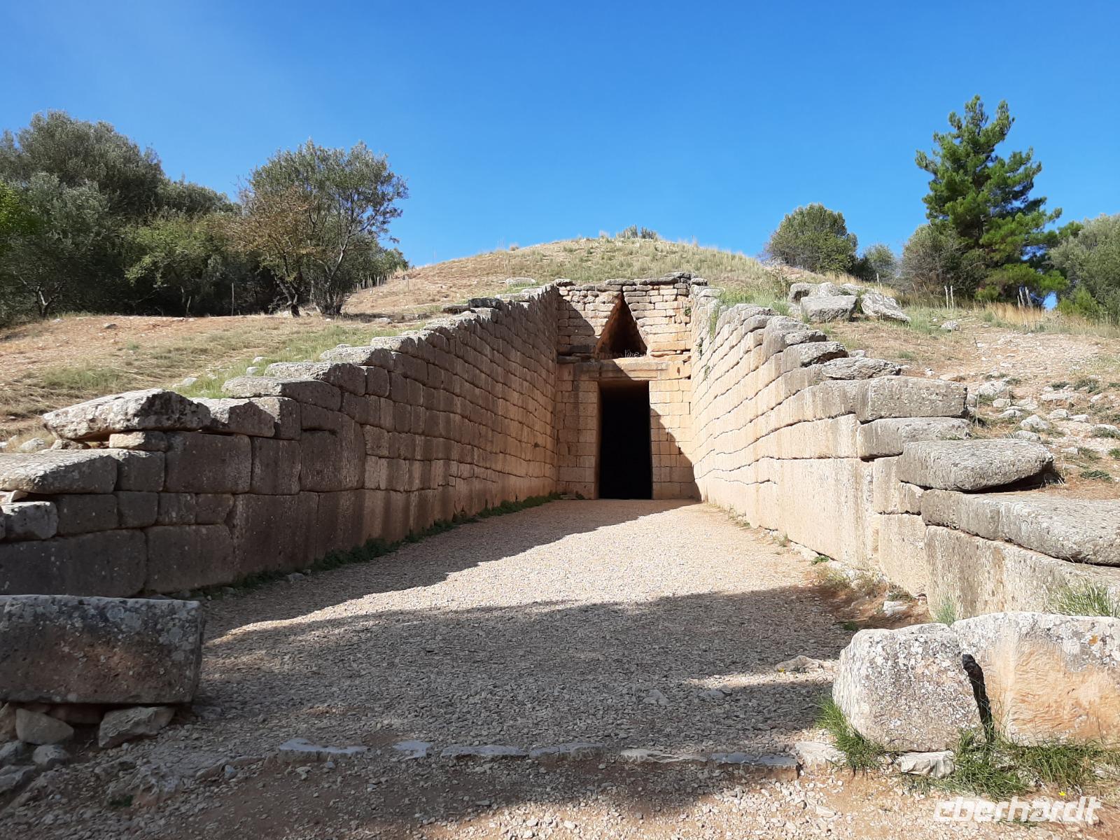 Auch heute erwarteten uns wieder wichtige antike Ausgrabungsstätten. Die Fahrt führte uns in südliche Richtung und vorbei am Weingebiet Nemea, wo überwiegend trockene Rotweine aus der Agiorgitiko-Traube gekeltert werden. Nach einer kurzweiligen Fahrt erreichten wir Mykene, die berühmte Heimatstadt des sagenumwobenen Königs Agamemnon. Sogar der bekannte deutsche Archäologe Heinrich Schliemann weilte auf der Suche der Grablege des antiken Herrschers Ende des 19. Jh.´s hier. Noch vor den Toren der Stadt besuchten wir zuerst das sogenannte "Schatzhaus des Atreus", doch in Wirklichkeit ist der riesige Tumulus eine Grabanlage. Wenig später betraten wir durch das berühmte "Löwentor" die antike Stadt Mykene und standen auch schon direkt vor den sogenannten Königsgräbern, wo Schliemann die berühmte Goldmaske des Agamemnon fand. Heute weiß man allerdings, dass die Maske, die sich heute im Nationalarchäologischen Museum in Athen befindet, aus einer früheren Ära stammt. Wer noch Ausdauer hatte, ging anschließend individuell hinauf zum Palast, zur ober- und unterirdischen Zisterne, sowie am zweiten Stadttor vorbei. Auch für einen Besuch des hiesigen kleinen Museums bot sich die Zeit und wer wollte, konnte so weitere interessante Informationen zur Geschichte der Gegend erhalten. Gegen Mittag erreichten wir Nauplia, die einstige Hauptstadt Griechenlands. Die Stadt liegt direkt am Argolischen Golf und besticht mit einem besonderen Charme. Wir flanierten durch die engen Gassen der Altstadt und über malerische Plätze. Schnell bemerkten wir die italienisch anmutende Atmosphäre, was sich besonders in der Architektur der Häuser widerspiegelte. Die mehrmalige venezianische Besatzung hatte eben deutliche Spuren hinterlassen...! Hier verbrachten wir auch unsere heutige Mittagspause in einer der zahlreichen Tavernen. Gut erholt machten wir uns schließlich weiter in Richtung Epidaurus auf, um dort die Ausgrabungsstätte des Asklepios-Heiligtums zu besichtigen. Besonders beeindruckte uns dort allerdings das sehr gut erhaltene antike Theater, welches für etwa 12.000 Besucher Platz bietet und zudem eine hervorragende Akustik aufweist. Voller schöner Eindrücke ging es über die Küstenstraße nach Vrachati zurück. Aufgrund der Tatsache, dass die Akropolis in Athen am Folgetag wegen der Erneuerung der Gehwege nicht zu besichtigen gewesen wäre, hatten wir uns kurzfristig entschieden, die Programme des 11. mit dem 12. Reisetages zu tauschen!