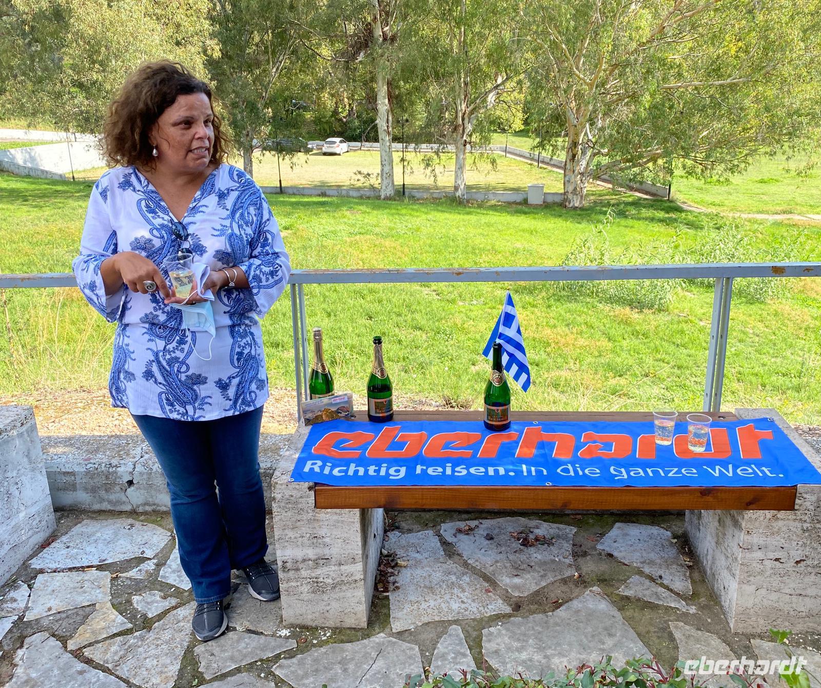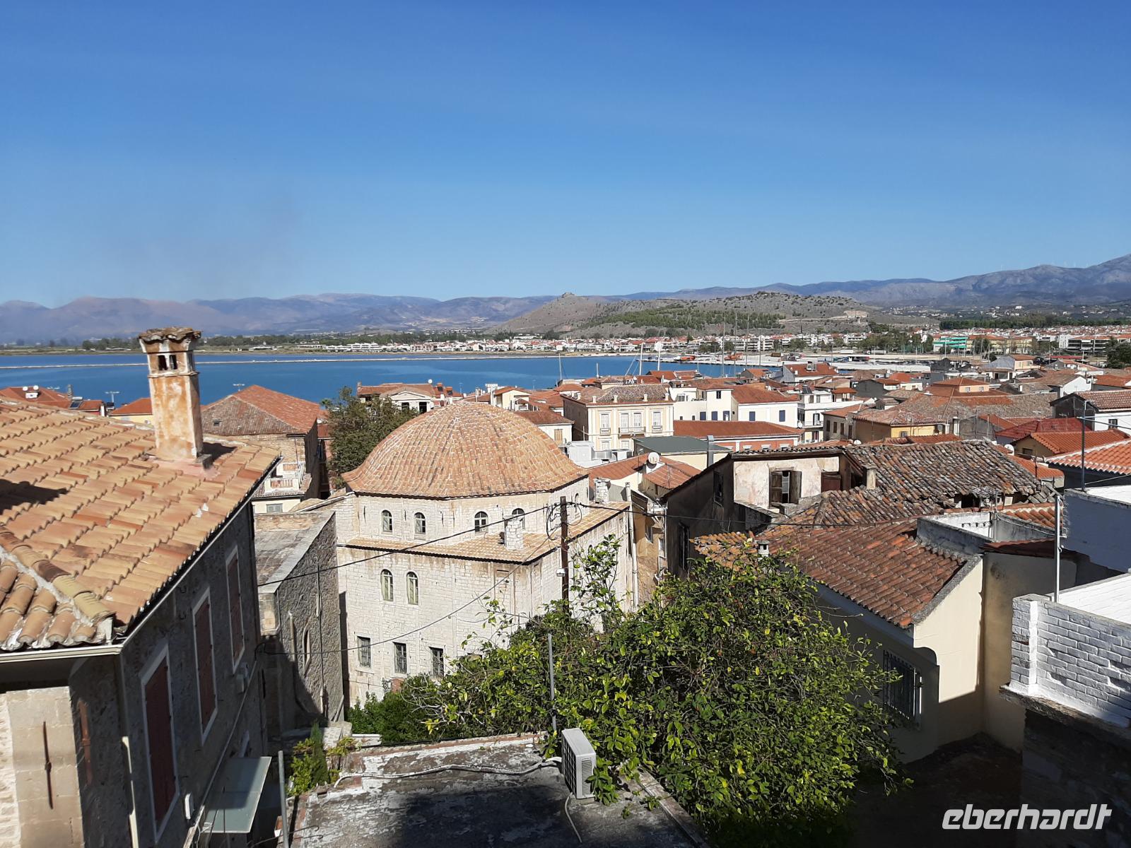 Für den heutigen Tag stand einer der großen Höhepunkte dieser Reise auf dem Programm und schon der Blick von unserem Hotel am Fuße der Meteora-Felsen machte uns neugierig. Voller Erwartungen ging es somit zu den unweit des Städtchens Kalambaka gelegenen berühmten schwebenden Klöstern und wir staunten bereits jetzt darüber, wie die jahrhundertealten Bauwerke in dieser abgeschiedenen Lage überhaupt entstehen konnten. Nach dem Frühstück fuhren wir jedoch zunächst eine kleine Runde durch den Ort und stellten fest, dass Kalambaka zum Großteil aus Tavernen und Souvenirgeschäften zu bestehen schien. Der Tourismus ist aufgrund der Lage einer der Haupteinnahmequellen der hiesigen Bevölkerung, nur in diesem Jahr scheint der Ort eher verwaist. Wenig später fuhren den Berg hinauf, wo man schon nach wenigen Minuten herrliche Ausblicke auf das Kloster Agios Nikolaos hatte. Nun reihte sich ein Fotostopp an den nächsten - die Landschaft überwältigte uns und es gab unendlich viele Fotomotive. Kurz darauf erreichten wir das Kloster Agios Stefanos, wo wir uns das Innere des Klosterhofes, die wunderschöne, mit Mosaiken ausgestaltete Kirche, sowie ein kleines Museum ansehen konnten. Heute war nun übrigens auch Bergfest, die Hälfte der Reise war bereits vorüber und das zelebrierten wir inmitten dieser herrlichen Kulisse mit Blick auf das Kloster St. Stephanus und den höchsten Bergfelsen (630 m ü. d. M.). Bei einem Ouzo und kleinen Gebäck-Spezialitäten hieß es "Jamas!" ("Prost!") und auf eine weiterhin schöne Reise! Anschließend besichtigten wir noch ein weiteres Kloster, das Kloster Varlaam. Nachdem wir die etwa 150 Stufen bewältigt hatten, erreichten wir die neue Terrasse des Klosters. Von hier aus hatten wir herrliche Ausblicke in die Umgebung und bei diesem tollen Wetter waren natürlich wiederum grandiose Fotos garantiert. Wenig später bestaunten wir in der kleinen Kirche kunstvollen Wandmalereien, die uns natürlich von Anastasia ausführlich erklärt wurden. Im Anschluss ging es nach Kalambaka zurück, wo wir in einer traditionsreichen authentischen Taverne unser Mittagessen ganz traditionell direkt aus den Töpfen in der Küche auswählen konnten. Gute lokale Küche erwartete uns, ein wahrer Gaumenschmaus! Frisch gestärkt waren wir nun für die weitere Fahrt gen Süden bereit. Wir fuhren durch die Landschaft des Parnass-Gebirges und später vorbei an unzähligen Olivenhainen bis zum Golf von Korinth, wo in im kleinen familiären Hotel "Kalafati" in Itea übernachteten. So manch einer unserer Gäste nutzte hier sogar die Gelegenheit zu einem abendlichen Strandspaziergang, denn schließlich war das Meer fast vor der Tür...!