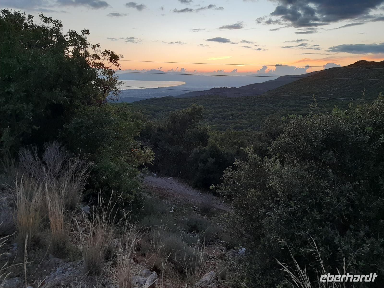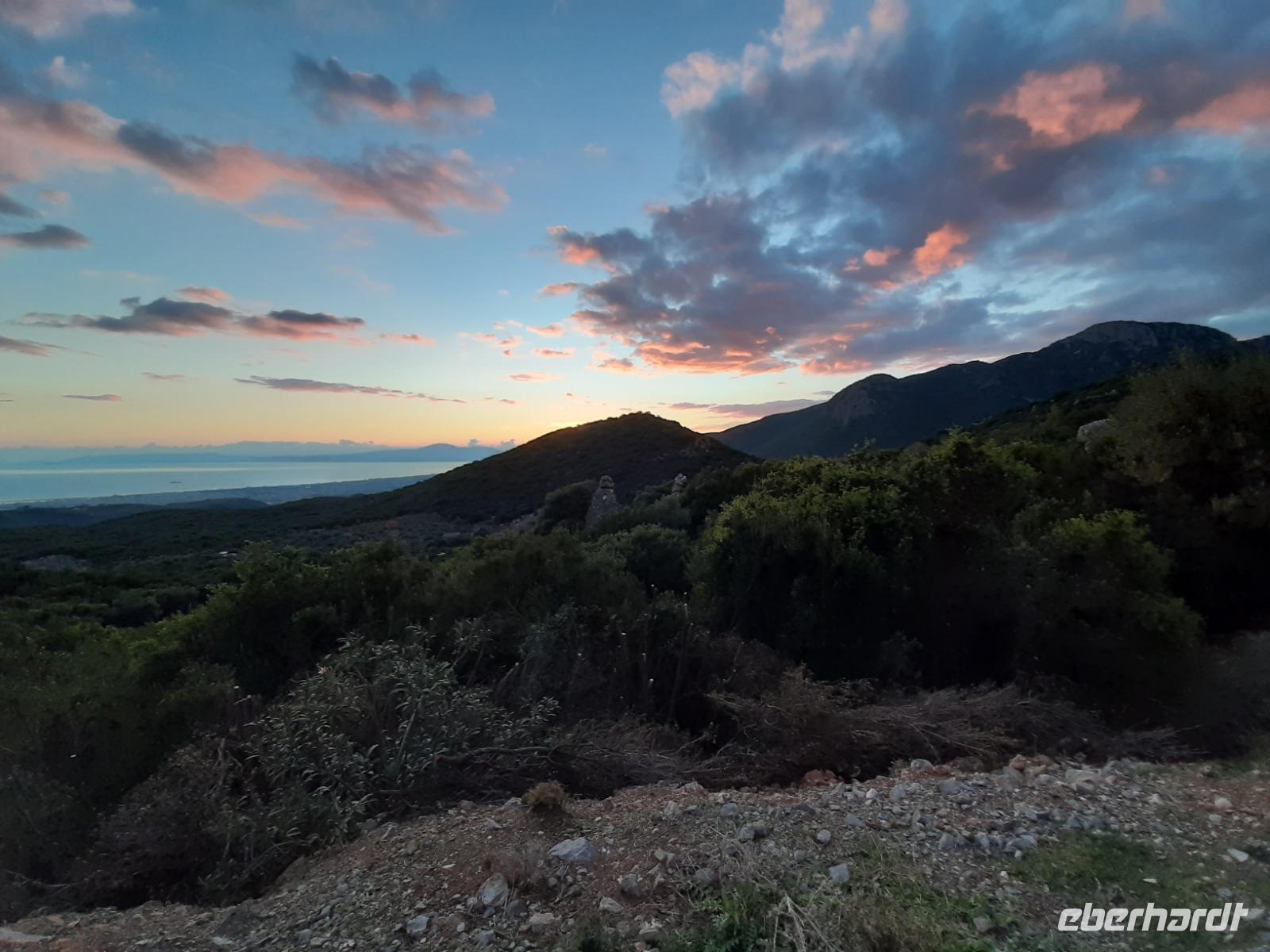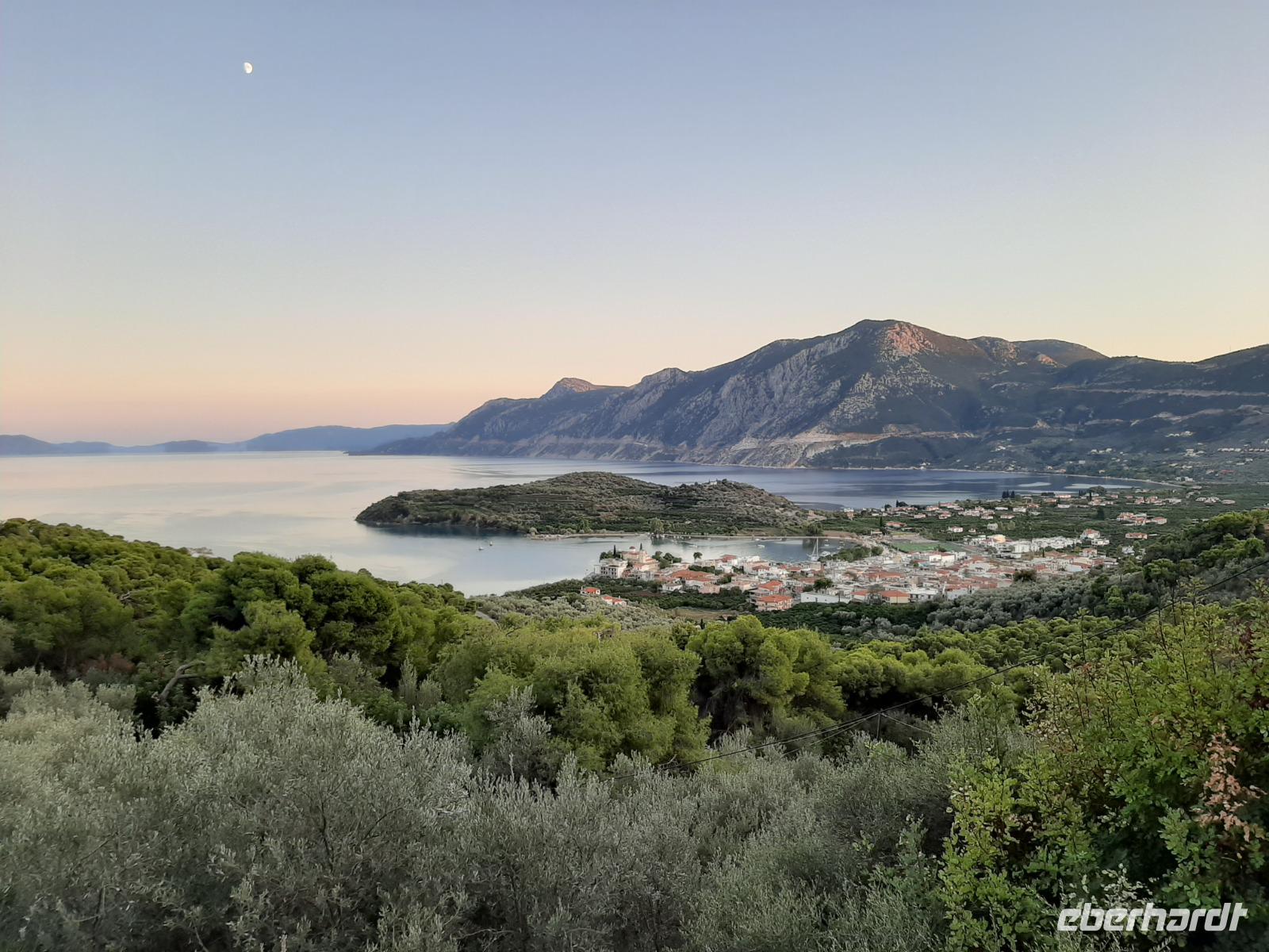 Heute hieß es wieder einmal Kofferladen, denn wir verließen unser Resort-Hotel in Vrachati, um noch ein wenig weiter in den Süden der Halbinsel Peloponnes vorzudringen. Einen kleinen Fotostopp legten wir zunächst jedoch, wie bereits in den Tagen zuvor versprochen, am weltberühmten Kanal von Korinth ein. Leider wurden aufgrund der Corona-Pandemie in diesem Jahr keinerlei Fahrten durch den Kanal angeboten, was allerdings für uns auch den einzigen Leistungsausfall auf dieser Reise darstellte. Zumindest wollten wir den Kanal sehen, der den Saronischen Golf mit dem Korinthischen Golf und damit das griechische Festland mit der Halbinsel Peloponnes, verbindet. Wir durchfuhren wenig später die berühmten Landschaften Arkadiens und Lakoniens am Rande des Taygetos-Gebirges. Bereits am späten Vormittag erreichten wir die sagenumwobene Stadt Sparta, allerdings zeugt in der neuzeitlichen Hauptstadt Lakoniens kaum noch etwas von der großartigen antiken Vergangenheit. So führte uns unser Weg schnell weiter in die mittelalterliche Nachfolgesiedlung Spartas, nach Mystras. Strategisch viel besser, am Hang des Taygetos-Gebirges gelegen, wurde diese Stadt im 13. Jh. unter dem fränkischen Grafen William II. von Villehardouin erbaut. Wir besichtigten die byzantinische Ruinenstadt vom oberen Burgtor aus und stiegen langsam den steilen Treppenpfad hinab. Dabei besichtigen wir die Kirchen Agia Sophia und Agios Nikolaos sowie den Despotenpalast. Anschließend besuchten wir das Pantanassas Kloster, das heute von sechs Nonnen bewohnt wird, welche seit der Neugründung Spartas immerhin die einzigen Bewohnerinnen der verlassenen Stadt sind. Am Ende der Besichtigung sahen wir die Metropolis, die ehemalige Hauptkirche der Stadt, wo wir uns schließlich noch ein kleines Museum ansehen konnten. Die wohlverdiente Mittagspause verbrachten wir im urigen Garten einer authentischen Taverne direkt im Stadtzentrum von Sparta, wo wir weitere Köstlichkeiten der griechischen Küche probierten. Um nach Kalamata zu gelangen, entschieden wir uns für die landschaftlich reizvolle Strecke über das Taygetos-Gebirge, der höchste Punkt der Straße lag immerhin bei etwa 1.300 m ü. d. M. und auch die Außentemperatur von nur noch 14 Grad sprach für sich! Uns erwartete eine Passstraße mit engen Serpentinen und steilen Hängen, aber dafür gab es herrliche Aussichten und ein Fotostopp folgte dem anderen. Zudem gab es einen spektakulären Sonnenuntergang und tolle Lichtspiele am Himmel. Anastasia meinte, so viele Fotostopps wie mit uns hätte sie auf dieser Strecke noch nie eingelegt... - sie amüsierte sich jedenfalls köstlich über uns und unseren unbändigen Foto-Eifer! Letztendlich erreichten wir dennoch pünktlich zum Abendessen unser Hotel "Akti Taygetos Resort" in Kalamata. Anastasia war die Erleichterung regelrecht anzusehen...!