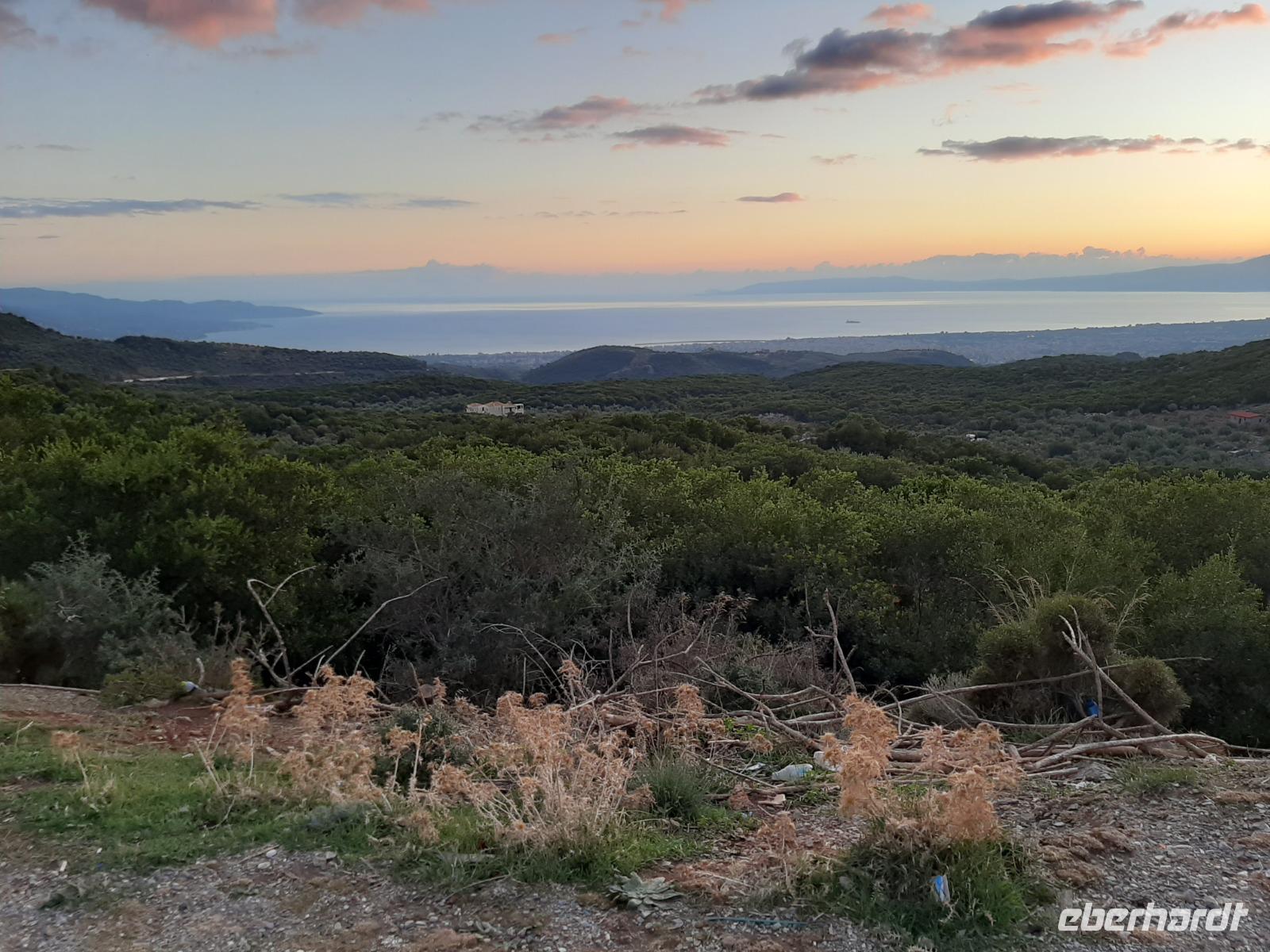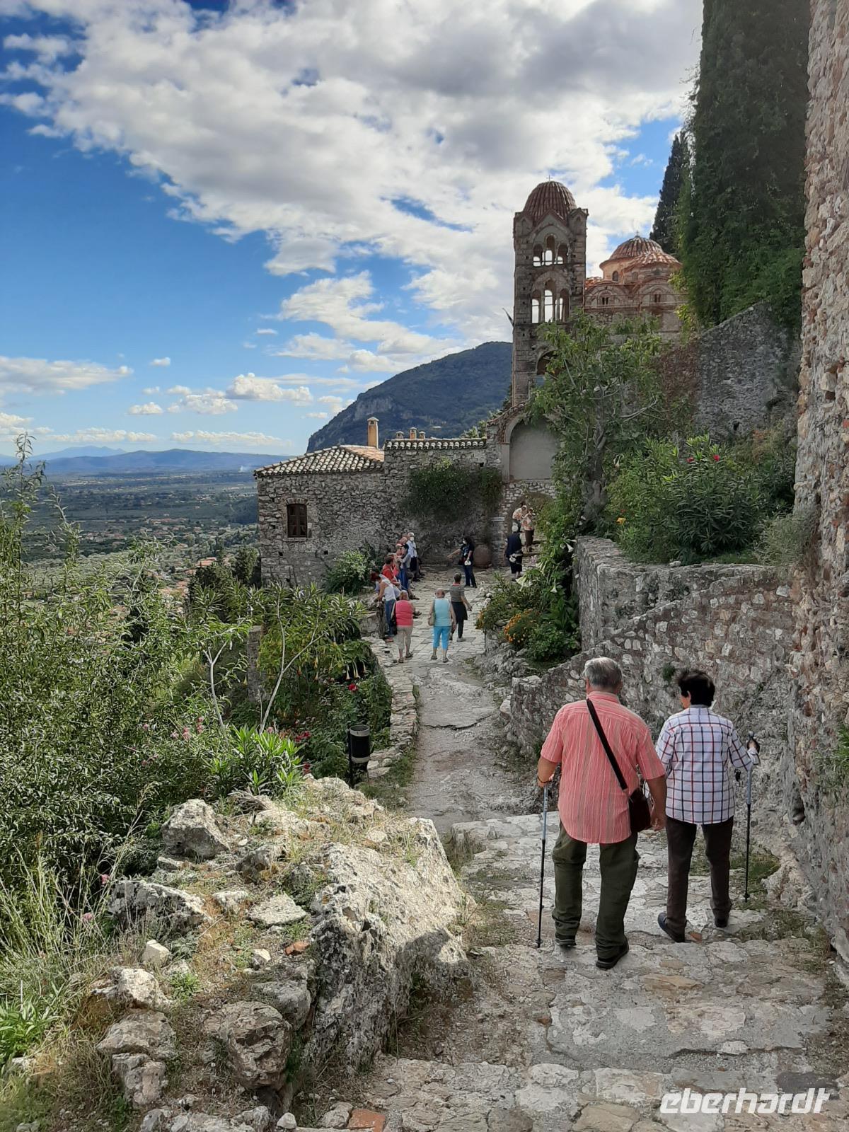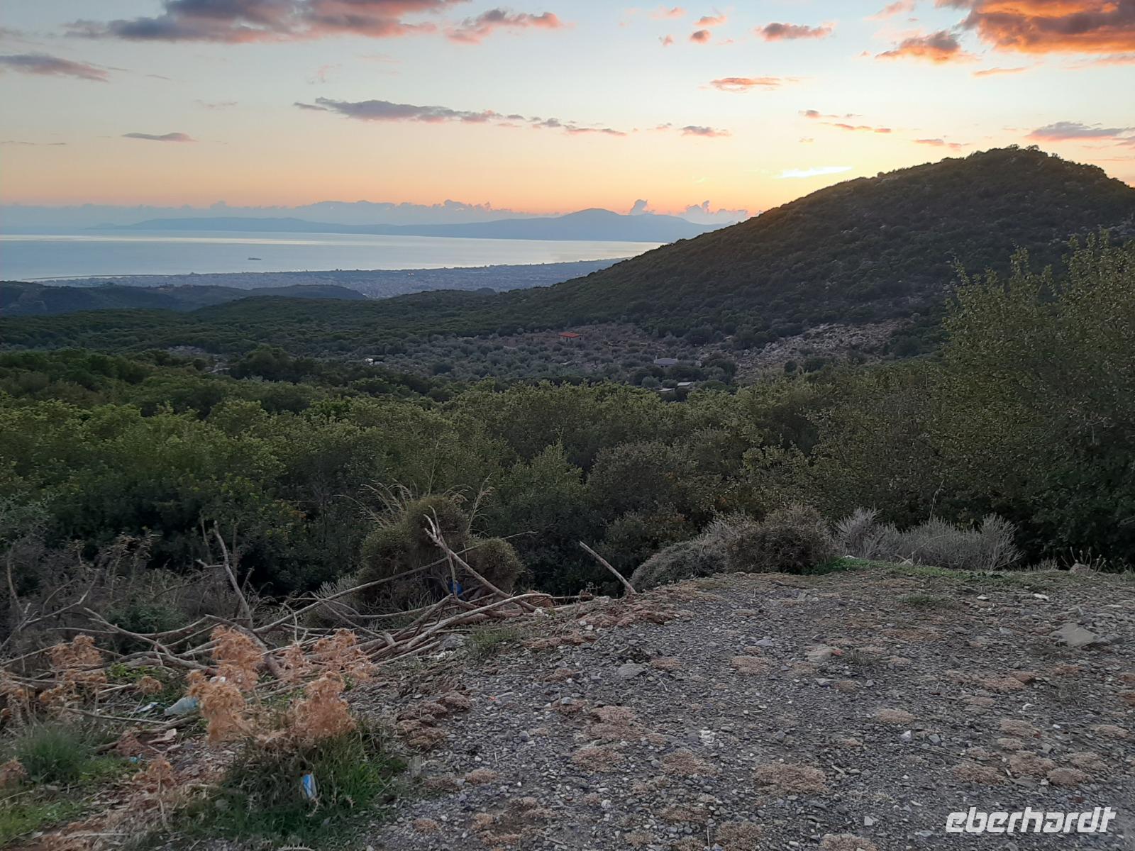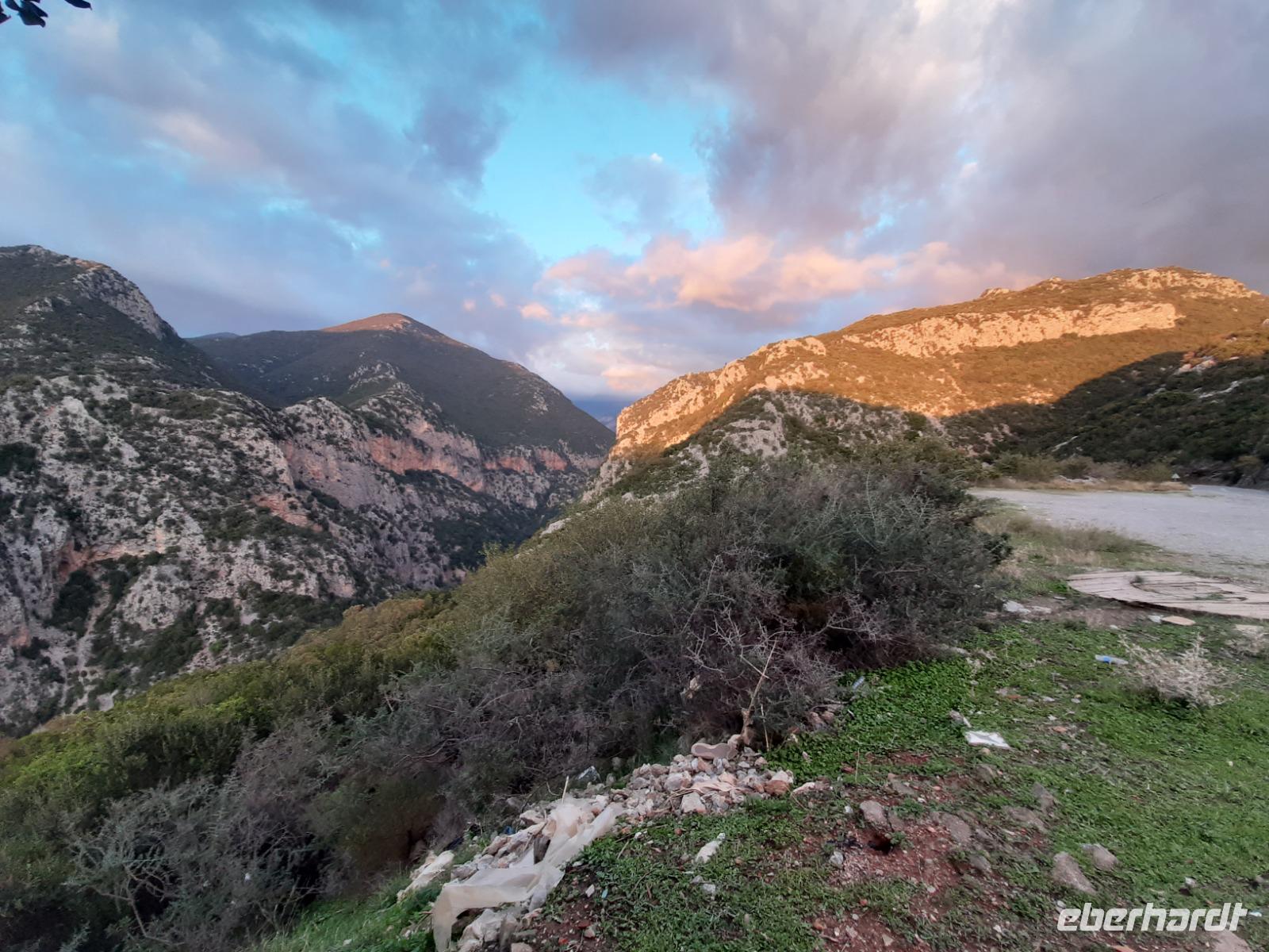 Heute hieß es wieder einmal Kofferladen, denn wir verließen unser Resort-Hotel in Vrachati, um noch ein wenig weiter in den Süden der Halbinsel Peloponnes vorzudringen. Einen kleinen Fotostopp legten wir zunächst jedoch, wie bereits in den Tagen zuvor versprochen, am weltberühmten Kanal von Korinth ein. Leider wurden aufgrund der Corona-Pandemie in diesem Jahr keinerlei Fahrten durch den Kanal angeboten, was allerdings für uns auch den einzigen Leistungsausfall auf dieser Reise darstellte. Zumindest wollten wir den Kanal sehen, der den Saronischen Golf mit dem Korinthischen Golf und damit das griechische Festland mit der Halbinsel Peloponnes, verbindet. Wir durchfuhren wenig später die berühmten Landschaften Arkadiens und Lakoniens am Rande des Taygetos-Gebirges. Bereits am späten Vormittag erreichten wir die sagenumwobene Stadt Sparta, allerdings zeugt in der neuzeitlichen Hauptstadt Lakoniens kaum noch etwas von der großartigen antiken Vergangenheit. So führte uns unser Weg schnell weiter in die mittelalterliche Nachfolgesiedlung Spartas, nach Mystras. Strategisch viel besser, am Hang des Taygetos-Gebirges gelegen, wurde diese Stadt im 13. Jh. unter dem fränkischen Grafen William II. von Villehardouin erbaut. Wir besichtigten die byzantinische Ruinenstadt vom oberen Burgtor aus und stiegen langsam den steilen Treppenpfad hinab. Dabei besichtigen wir die Kirchen Agia Sophia und Agios Nikolaos sowie den Despotenpalast. Anschließend besuchten wir das Pantanassas Kloster, das heute von sechs Nonnen bewohnt wird, welche seit der Neugründung Spartas immerhin die einzigen Bewohnerinnen der verlassenen Stadt sind. Am Ende der Besichtigung sahen wir die Metropolis, die ehemalige Hauptkirche der Stadt, wo wir uns schließlich noch ein kleines Museum ansehen konnten. Die wohlverdiente Mittagspause verbrachten wir im urigen Garten einer authentischen Taverne direkt im Stadtzentrum von Sparta, wo wir weitere Köstlichkeiten der griechischen Küche probierten. Um nach Kalamata zu gelangen, entschieden wir uns für die landschaftlich reizvolle Strecke über das Taygetos-Gebirge, der höchste Punkt der Straße lag immerhin bei etwa 1.300 m ü. d. M. und auch die Außentemperatur von nur noch 14 Grad sprach für sich! Uns erwartete eine Passstraße mit engen Serpentinen und steilen Hängen, aber dafür gab es herrliche Aussichten und ein Fotostopp folgte dem anderen. Zudem gab es einen spektakulären Sonnenuntergang und tolle Lichtspiele am Himmel. Anastasia meinte, so viele Fotostopps wie mit uns hätte sie auf dieser Strecke noch nie eingelegt... - sie amüsierte sich jedenfalls köstlich über uns und unseren unbändigen Foto-Eifer! Letztendlich erreichten wir dennoch pünktlich zum Abendessen unser Hotel "Akti Taygetos Resort" in Kalamata. Anastasia war die Erleichterung regelrecht anzusehen...!