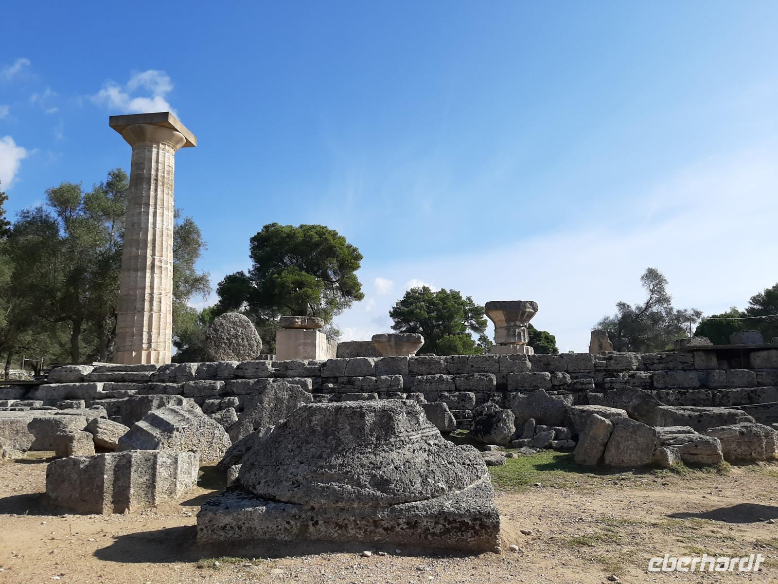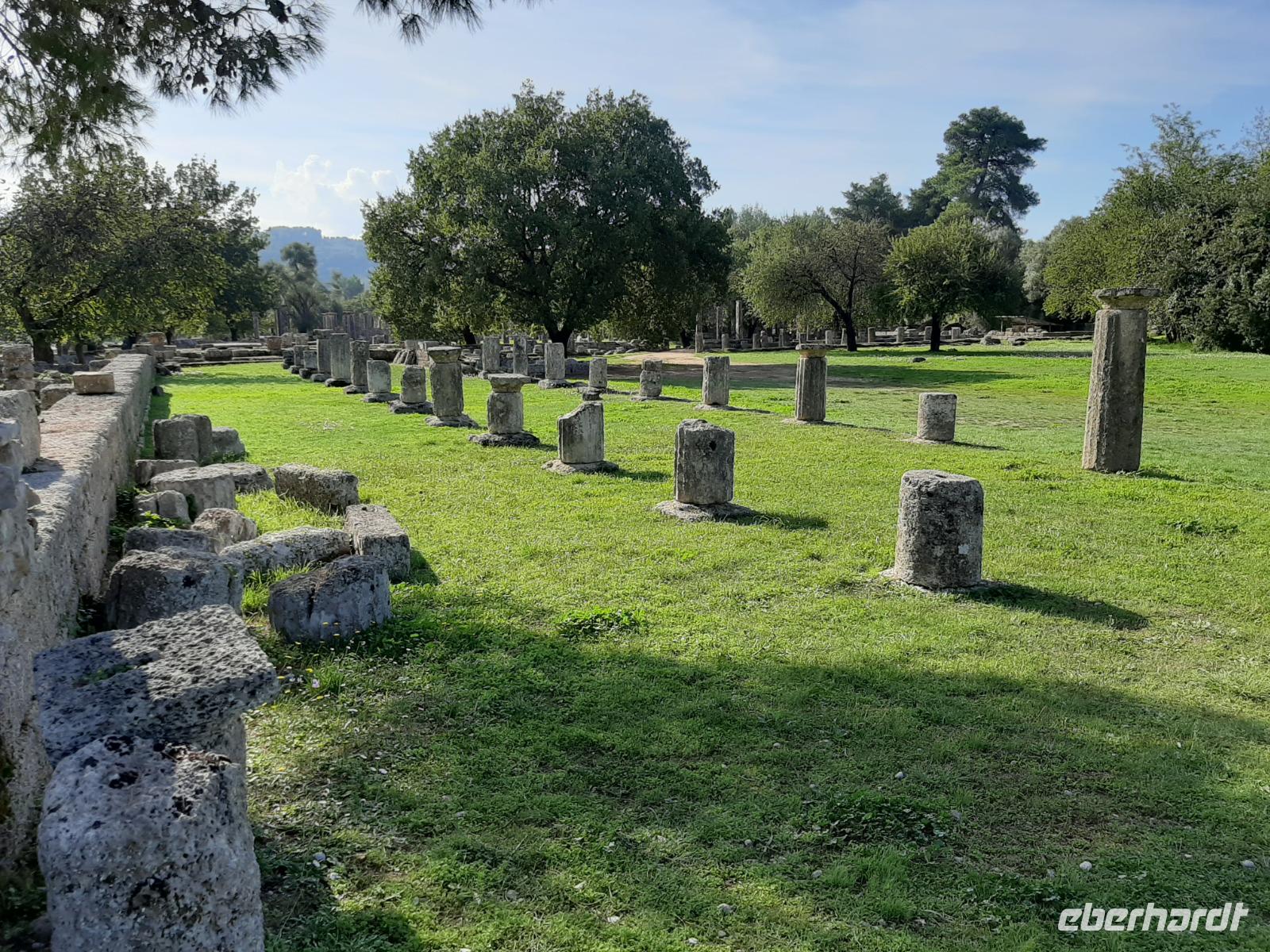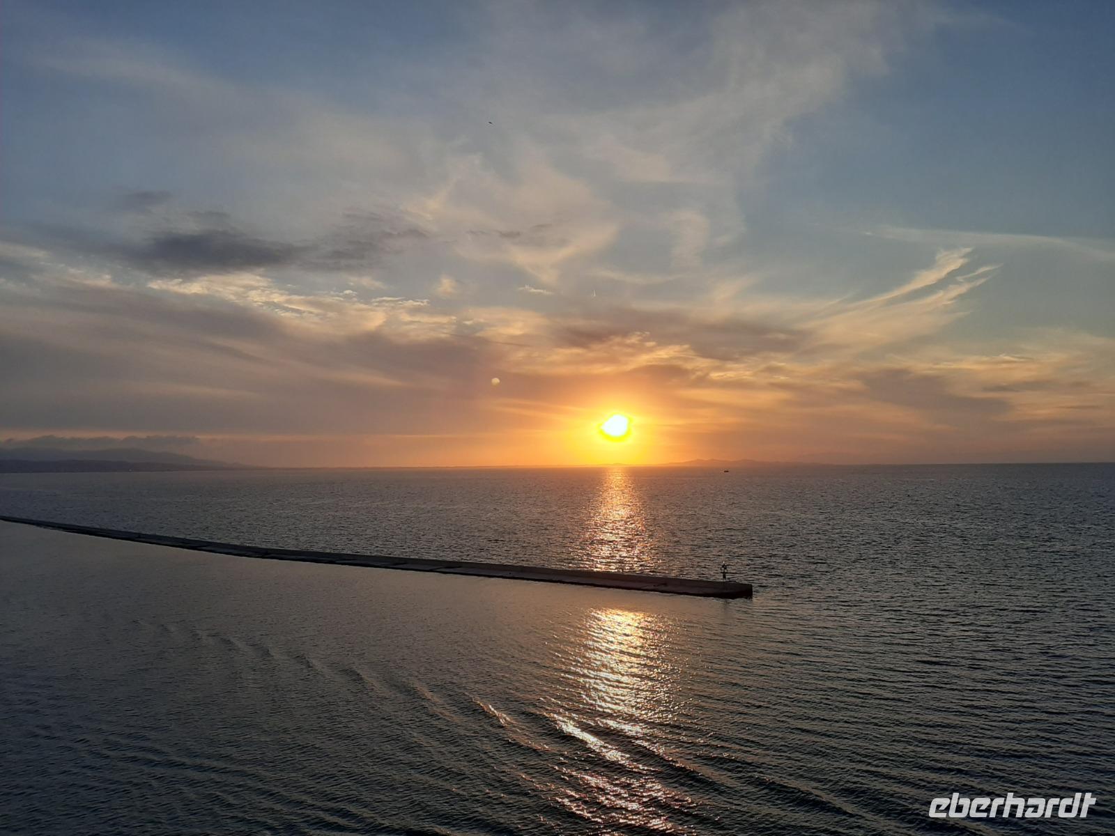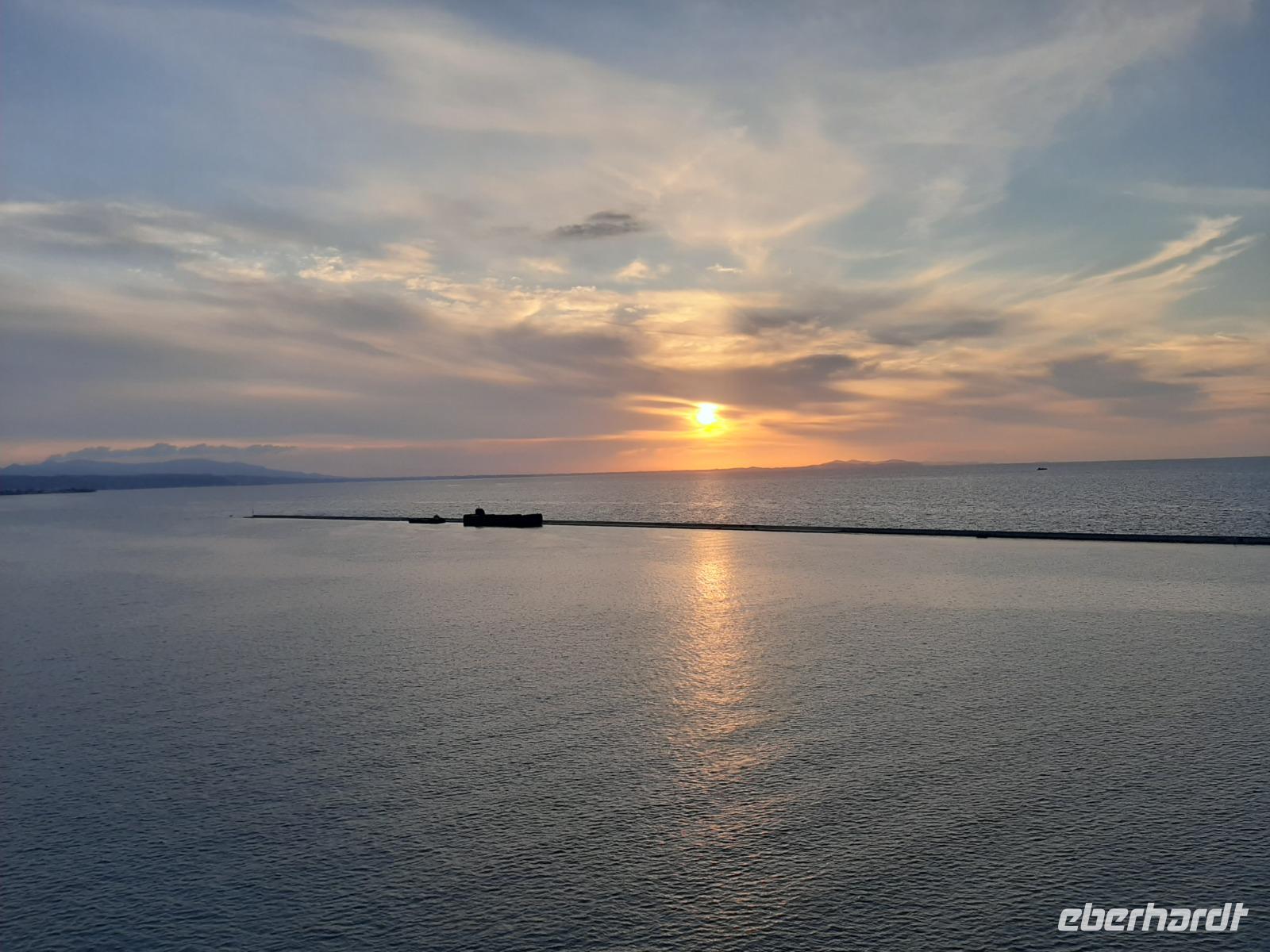 Die Zeit verging wie im Fluge und schon begann unser letzter Tag auf griechischem Boden. Wir fuhren nordwärts entlang der Westküste der Peloponnes-Halbinsel und erreichten schließlich Olympia, das sich im Nordwesten der Halbinsel Peloponnes befindet. Dort angekommen führte uns Anastasia durch die Ausgrabungsstätte, wo wir interessante Details über den einstige Austragungsort der Olympischen Spiele erfuhren. Wo einst die Olympischen Spiele zu Ehren des Zeus geboren wurden, wird die Geschichte nämlich auch heute noch lebendig und davon konnten wir uns wahrhaftig überzeugen. Noch heute wird auf dem Hera-Altar das olympische Feuer entzündet und beim Besuch des olympischen Stadions mussten wir feststellen, dass dieses noch um einiges spartanischer ausgestattet war als die heutigen Stadien. Abschließend führte uns Anastasia durch das benachbarte archäologische Museum. Eine Modelrekonstruktion der antiken Stätte ließ uns zunächst einen Eindruck bekommen, wie Olympia zu früheren Zeiten einmal ausgesehen hatte. Einige besonders interessante Funde sahen wir uns danach genauer an, vor allem beindruckten die Statuen der Giebelfelder des Zeus-Tempels sowie eine römisch-griechische Statue des Hermes. Nach diesem letzten Programmpunkt war es nun an der Zeit, sich offiziell und in einer angemessenen Form voneinander zu verabschieden und so wurde ein Sekt-Empfang mit Gebäck und kleinen Snacks vorbereitet. Ein großes Dankeschön ging hier vor allem an unsere sympathische und stets gut gelaunte Reiseleiterin Anastasia, die uns mit ihrem unglaublichen Wissen sowie ihren Geschichten der griechischen Mythologie begeisterte und der Reise einen zusätzlichen Mehrwert bescherte! Am frühen Nachmittag ging es schließlich weiter in die Hafenstadt Patras, wo wir uns nun auch von unseren Fluggästen verabschiedeten, die gemeinsam mit Anastasia in einem griechischen Minivan nach Athen zurück fuhren. Diese Gäste übernachteten heute in einem zentral gelegenen Hotel und flogen am Folgetag nach Deutschland zurück. Die anderen Gäste checkten an Bord der "Cruise Olympia" ein und diesmal legte das Schiff sogar recht pünktlich ab! Ein toller Sonnenuntergang und ein gutes Abendessen im Restaurant "Dionysus" auf Deck 10 rundeten diesen letzten Tag in Griechenland ab. Kurz vor Mitternacht legte das Schiff noch in Igoumenitsa an, um weitere unzählige Lastwagen für die Überfahrt nach Italien aufzunehmen.