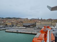 Bereits am frühen Morgen setzten wir unsere Reise entlang der Brennerautobahn in Richtung Süden fort. Der frühe Aufbruch versprach weniger Verkehr als üblich und so passierten wir recht zügig die Region Emilia-Romagna bzw. die Städte Modena und Bologna am Südrand der Po-Ebene. Von Bologna aus ging es dann vorbei an der auf einem Felsenkamm des Monte Titano liegenden Republik San Marino bis Rimini. Kurz danach passierten wir bereits die Grenze zur Region Marken und gegen 10.30 Uhr erreichten wir die Hafenstadt Ancona, auch Hauptstadt dieser Region. Bei Ankunft am Hafenbüro unserer Fährgesellschaft Superfast Ferries wurden uns sehr zügig die Bordkarten ausgehändigt. Nun mussten wir nur noch durch die Zollkontrolle und die Formalitäten waren damit bereits erledigt. Unser Fährschiff "Superfast XI" stand anschließend sofort zum Einsteigen bereit und somit hatten wir noch ausreichend Zeit zur individuellen Erkundung des Schiffes. Zudem gelangte auch unser Bus mitsamt unserem Chauffeur Andreas zügig an Bord. Fast pünktlich gegen 14 Uhr verließen wir den Hafen von Ancona. Zum Abendessen wurden wir später im Self-Service-Restaurant erwartet. Anschließend zogen wir uns nach und nach in unsere Kabinen zurück.