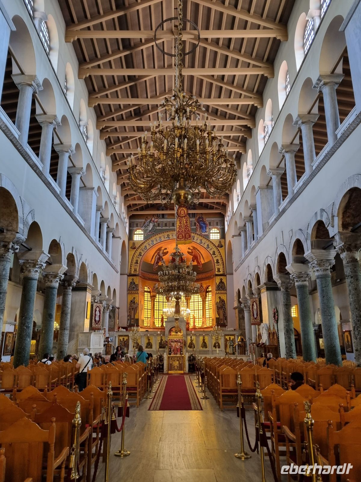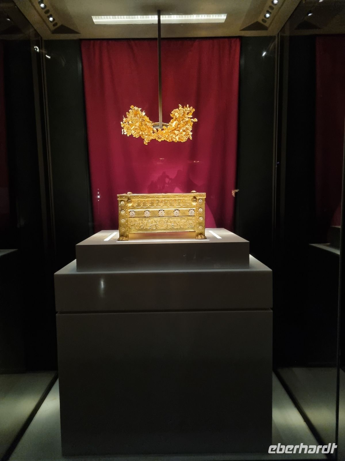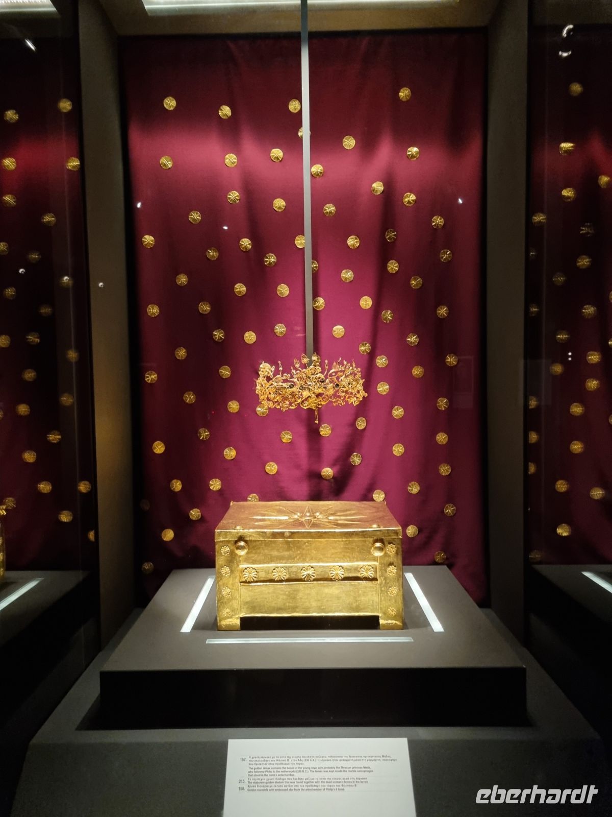 Der heutige Vormittag stand ganz im Zeichen der großen makedonischen Könige. Zunächst ging es durch die makedonische Ebene und vorbei an unzähligen Baumwollfeldern bis nach Pella, der ehemaligen Hauptstadt des Königreiches. Sie war immerhin der Geburtsort von Phillip II. und seinem berühmten Sohn Alexander dem Großen. Diese glanzvolle Stadt wurde später durch die Römer zerstört und die wertvollen Überreste gerieten dann leider bis in die Neuzeit in Vergessenheit. Den Höhepunkt bildete der Besuch des Archäologischen Museum, wo die Funde der Ausgrabungen auf dem Gebiet der antiken Stadt ausgestellt sind. Besonders beeindruckten uns die imposanten Kieselsteinmosaike sowie kunstvolle Goldfunde und Grabbeigaben – wirklich faszinierend! Tief beeindruckt verließen wir Pella und gelangten nach Thessaloniki zurück. Dort angekommen, unternahmen wir eine Stadtrundfahrt durch Thessaloniki, der Heimatstadt unserer örtlichen Reiseleiterin Anastasia. Die Fahrt führte uns zunächst entlang der kilometerlangen Hafenpromenade. Am berühmten weißen Turm, einem letzten Zeugnis der alten osmanischen Stadtmauer, machten wir Halt und flanierten zum nur wenige Meter weiter entfernten imposanten Denkmal Alexanders des Großen, der auch heute noch in Makedonien allgegenwärtig zu sein scheint. Des Weiteren besuchten wir die Hauptkirche Agios Dimitrios, eine der größten Kirchen Griechenlands. Von hier aus erkundeten wir im Anschluss den Rest der Altstadt zu Fuß. Nur wenige Meter weiter sahen wir das römische Forum und erreichten den Aristoteles-Platz, einen der schönsten Plätze Thessalonikis. Abschließend spazierten wir zur Kirche Agia Sophia, die durch ihre beindruckenden Wandmalereien besticht. Im Anschluss blieb noch etwas Zeit, um die Stadt auf eigene Faust weiter zu erkunden oder auch in eine der gemütlichen Tavernen einzukehren.