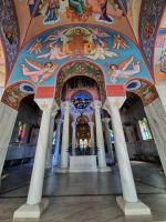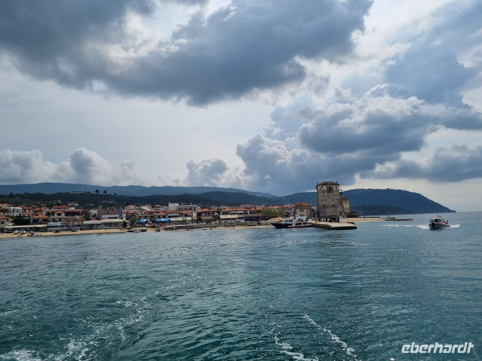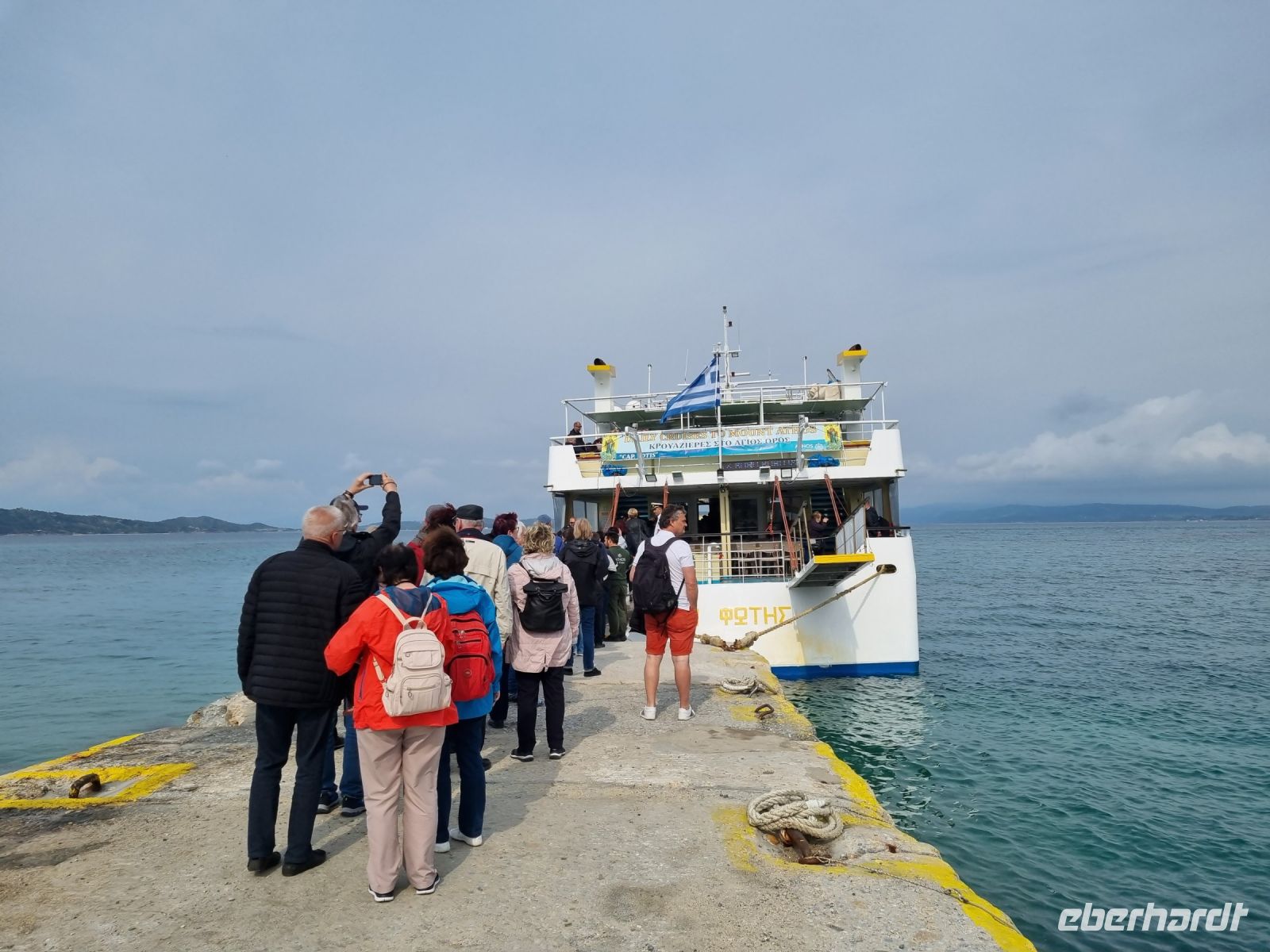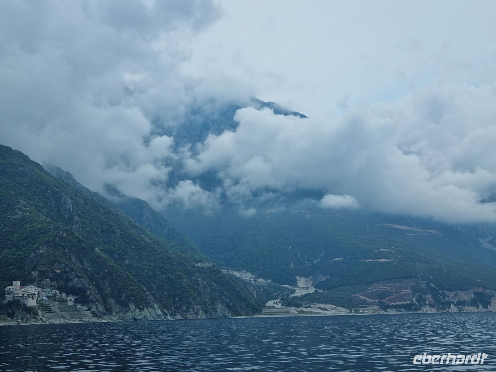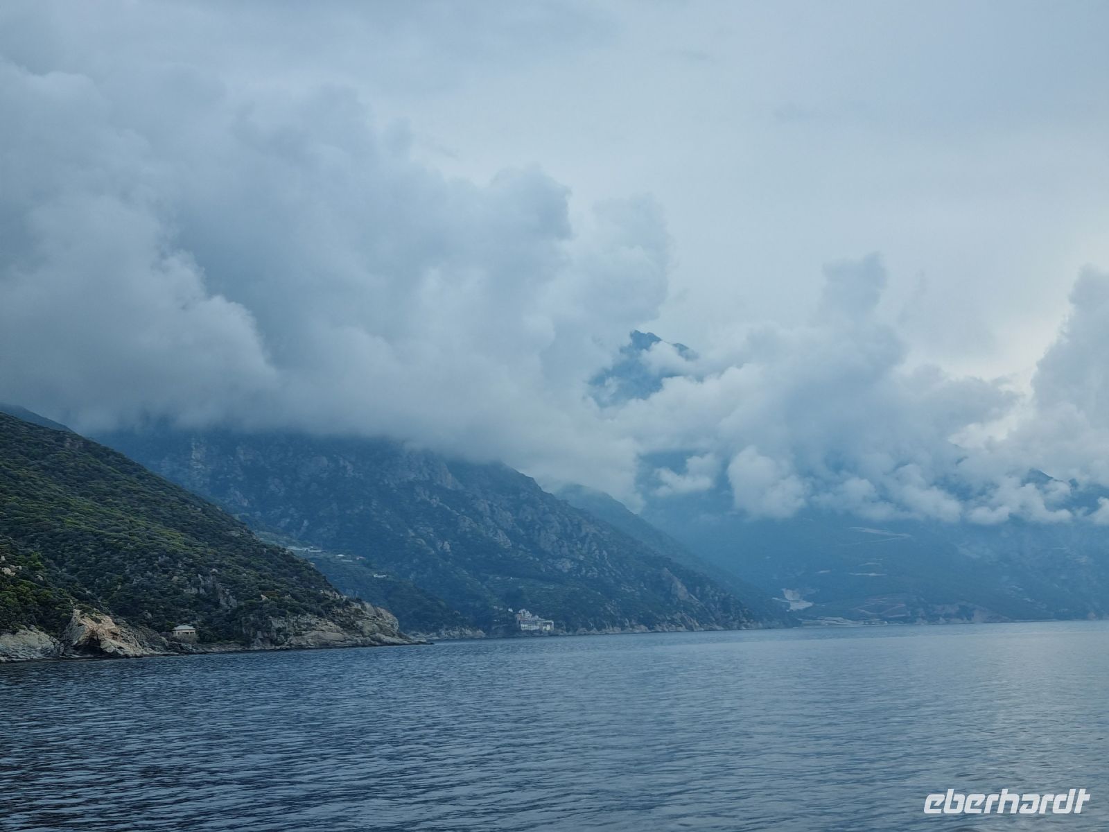Am heutigen Tag hatte sich die komplette Reisegruppe für den fakultativen Ausflug zum Berg Athos entschieden. Pünktlich am Morgen stand dafür ein griechischer Reisebus mitsamt unserem netten Buschauffeur Grigorios bereit, um uns nach Ouranopolis zu fahren. Unser Buschauffeur Andreas hatte nämlich aufgrund der gesetzlich vorgeschriebenen Lenk- und Ruhezeiten seinen ersten lenkfreien Tag! Die Fahrt führte uns erneut in östliche Richtung und vorbei an zahlreichen Olivenhainen bis an die Westküste des sogenannten "3. Fingers" der Halbinsel Chalkidiki. Anastasia verkürzte uns die Fahrt mit lockeren Erzählungen über die griechische Sprache und deren Besonderheiten. Auf etwa halber Strecke zum Hafenstädtchen Ouranopolis machten wir Halt beim "Haus der Versuchungen", wie Anastasia es nannte (davon gibt es in Griechenland übrigens mehr als genug!!!). Erneut handelte es sich hier um eine Konditorei, die – neben Espresso und Frappé – allerlei griechische und internationale Köstlichkeiten anbietet. Gut gestärkt ging es schließlich weiter und pünktlich erreichten wir Ouranopolis, von wo aus wir zu unserem Schiffsausflug entlang der Küste der Mönchsrepublik Athos starteten. Für Frauen ist diese Art die Besichtigung auch heute noch die einzige Möglichkeit einen Blick auf die uralten Klöster und Eremitagen zu erlangen, denn es ist ihnen nach wie vor nicht gestattet, die Republik zu betreten. Aus eben diesem Grund musste auch unser Schiff einen Mindestabstand von 500 Metern zum Festland einhalten. Das Wetter spielte leider nicht so ganz mit, denn dunkle Wolken begleiteten uns. Der ein oder andere Schauer war auch dabei, bis wir schließlich am südlichen Ende der Landzunge den 2.033 Meter hohen Berg Athos erreichten. Dieser versteckte sich heute unter zahlreichen dunklen Wolken. Nach guten drei Stunden waren wir am Hafen von Ouranopolis zurück, wo wir im Anschluss Zeit für ein gemütliches Mittagessen und einen kleinen Spaziergang durch die engen und malerischen Gassen des Ortes hatten. Am späten Nachmittag traten wir dann die Rückfahrt nach Thessaloniki an. Hier entschieden wir uns für die Küstenstraße bis Stavros, um letztendlich die Autobahn zu erreichen