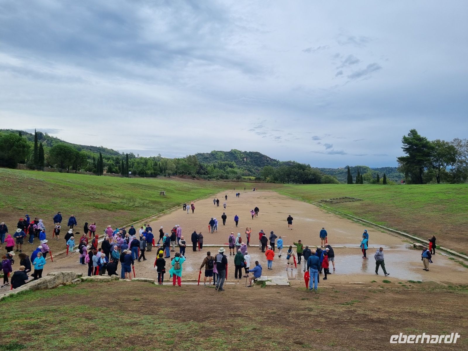 Die Zeit verging wie im Fluge und schon begann unser letzter Tag auf griechischem Boden. Wir fuhren zunächst nordwärts entlang der Westküste der Peloponnes-Halbinsel. Nach etwa knapp zwei Stunden erreichten wir schließlich Olympia, das sich im Nordwesten der Halbinsel Peloponnes befindet. Dort angekommen führte uns Anastasia zuerst durch das archäologische Museum. Eine Modelrekonstruktion der antiken Stätte ließ uns unter anderem einen Eindruck bekommen, wie Olympia zu früheren Zeiten einmal ausgesehen hatte. Einige besonders interessante Funde sahen wir unsb genauer an, vor allem beindruckten die Statuen der Giebelfelder des Zeus-Tempels sowie eine römisch-griechische Statue des Hermes. Abschließend besichtigten wir die benachbarte Ausgrabungsstätte. Hier erfuhren wir viele interessante Details über den einstige Austragungsort der Olympischen Spiele. Wo einst die Olympischen Spiele zu Ehren des Zeus geboren wurden, wird die Geschichte nämlich auch heute noch lebendig und davon konnten wir uns wahrhaftig überzeugen. Noch heute wird auf dem Hera-Altar das olympische Feuer entzündet und beim Besuch des olympischen Stadions mussten wir feststellen, dass dieses noch um einiges spartanischer ausgestattet war als die heutigen Stadien. Am frühen Nachmittag ging es schließlich weiter in die Hafenstadt Patras, wo wir uns nun auch von unseren 2 Fluggästen verabschiedeten, die gemeinsam mit Anastasia in einem griechischen Minibus nach Athen zurückfuhren. Diese Gäste übernachteten heute in einem zentral gelegenen Hotel und flogen letztendlich am Folgetag nach Deutschland zurück. Die anderen Gäste checkten an Bord der "Superfast XI" ein und wir legten schließlich gg. 18.30 Uhr mit einer etwa 1-stündigen Verspätung ab. Ein gutes Abendessen im á la carte-Restaurant rundete diesen letzten Tag in Griechenland ab. Kurz vor Mitternacht stoppte das Schiff noch in Igoumenitsa, um weitere unzählige Lastwagen für die Überfahrt nach Italien aufzunehmen.