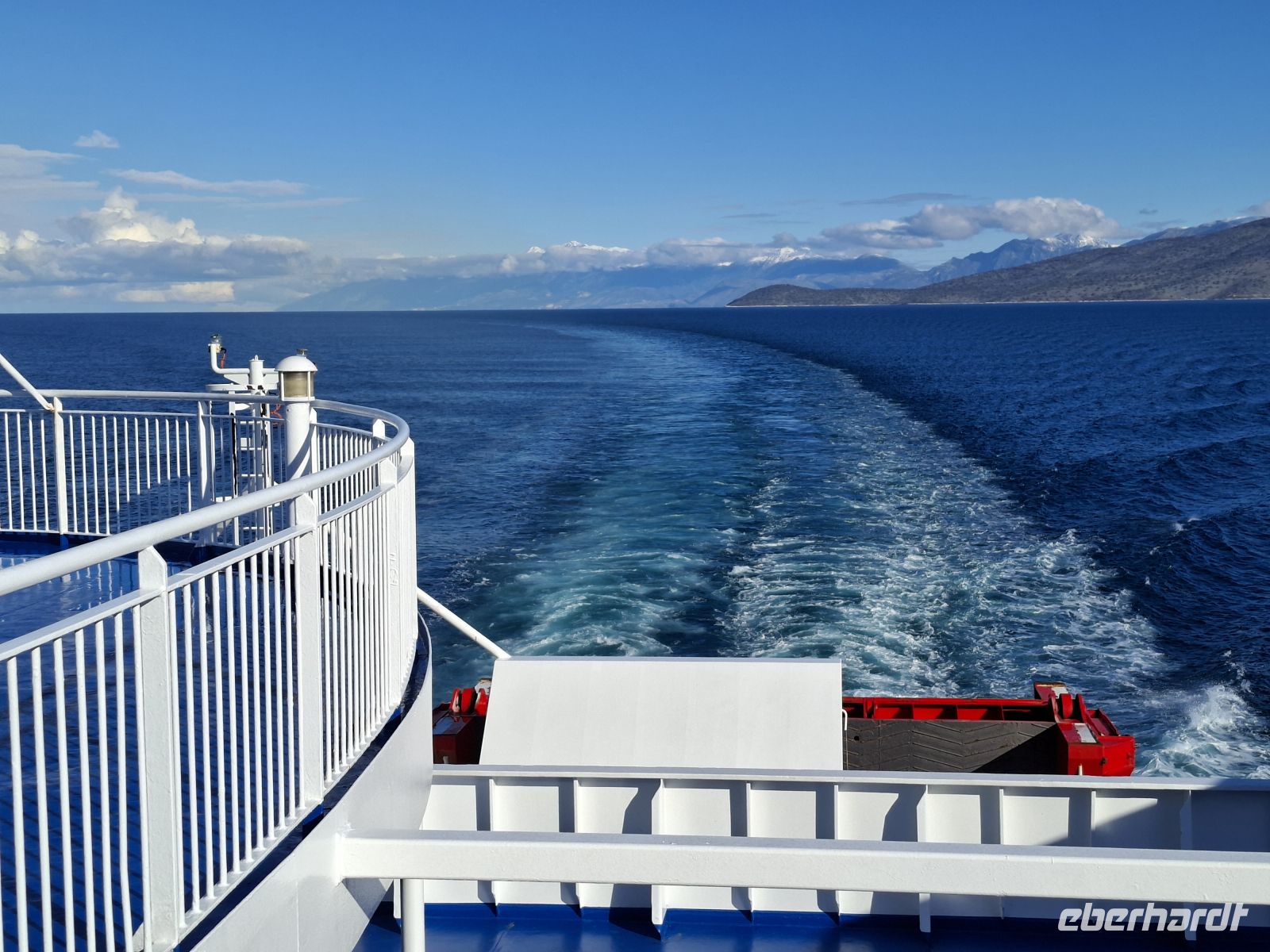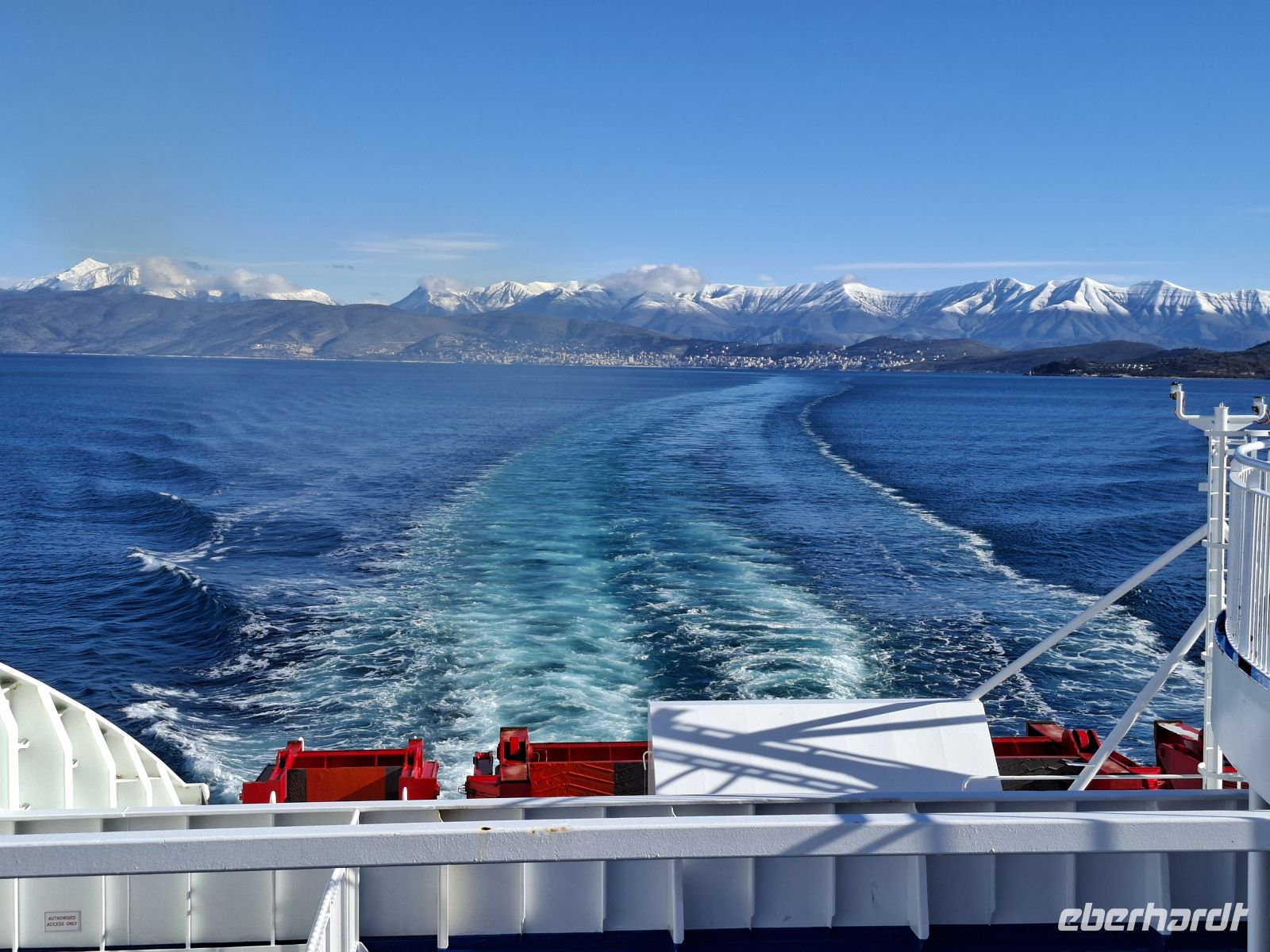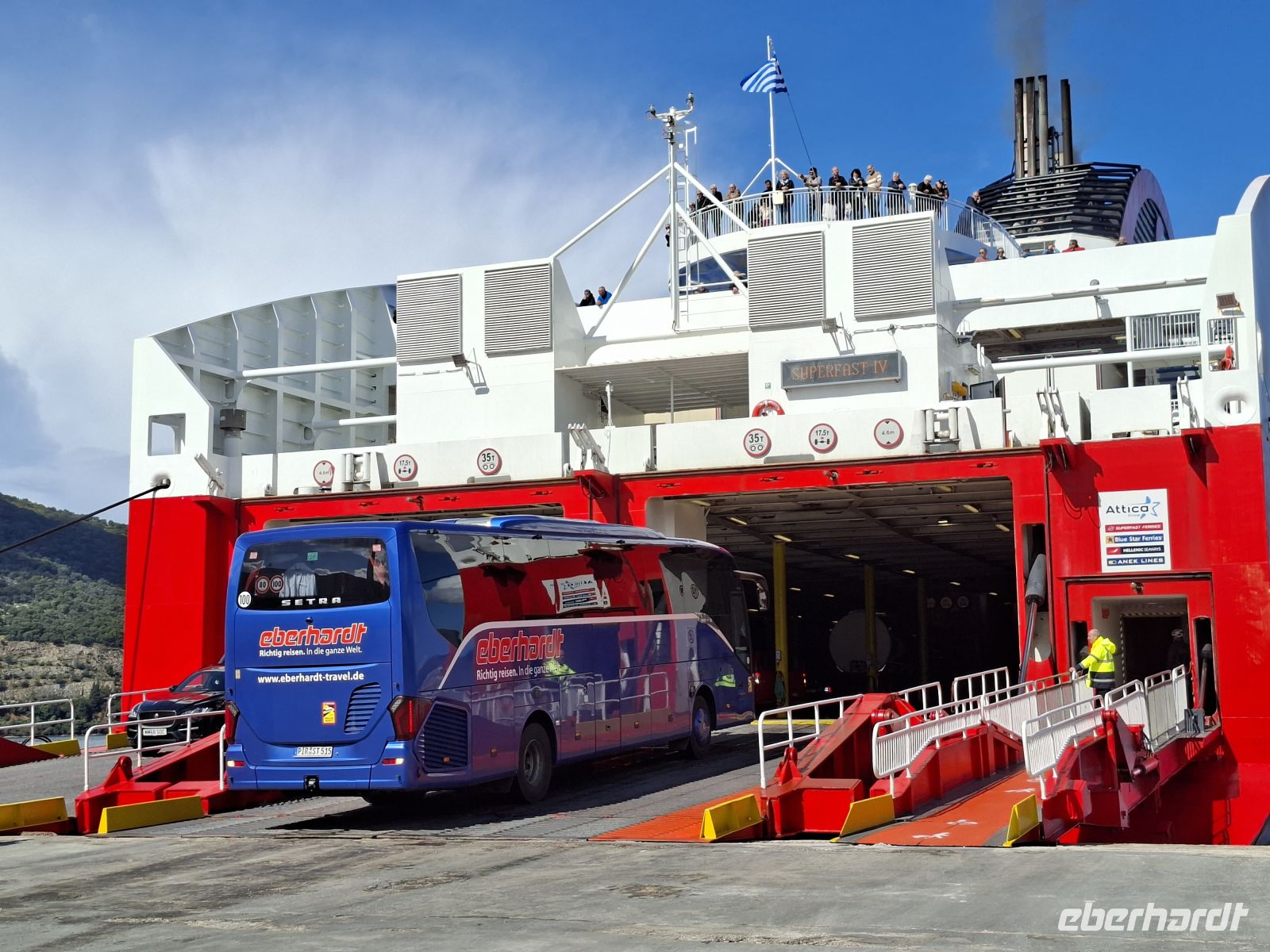 Nach einem gemütlichen Frühstück setzten wir unsere Reise auf der Brennerautobahn weiter in Richtung Süden fort. Zügig durchquerten wir die Region Emilia-Romagna und passierten dabei die Städte Modena und Bologna am südlichen Rand der Po-Ebene. Ab Bologna führte unsere Route weiter entlang der Adriaküste. Vorbei an der eindrucksvoll auf einem Felsrücken des Monte Titano gelegenen Republik San Marino erreichten wir schließlich Rimini. Kurz darauf überquerten wir die Grenze zur Region Marken, und gegen Mittag kamen wir in der Hafenstadt Ancona an, der Hauptstadt dieser Region. Am Hafenbüro unserer Fährgesellschaft Superfast Ferries erhielten wir rasch unsere Bordkarten. Anschließend war jedoch etwas Geduld gefragt, da sich die Sicherheitskontrolle verzögerte und wir erst nach einer Wartezeit an Bord unseres Fährschiffes „Superfast IV“ gehen konnten. Glücklicherweise blieb uns dennoch genügend Zeit, das Schiff auf eigene Faust zu erkunden. Am späten Nachmittag verließen wir mit leichter Verspätung den Hafen von Ancona. Begleitet von stürmischem Wetter und Regen begann unsere Überfahrt. Zum Abendessen trafen wir uns im Self-Service-Restaurant, bevor wir uns nach und nach in unsere Kabinen zurückzogen und den Tag entspannt ausklingen ließen.
