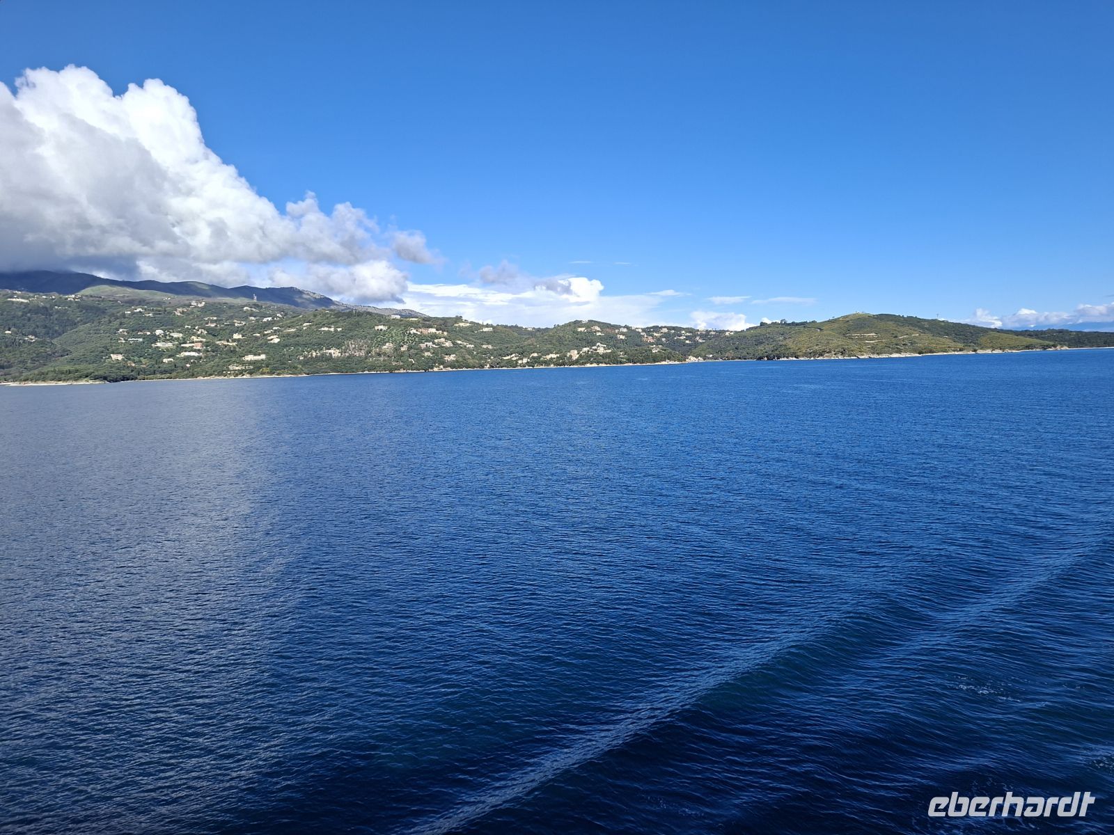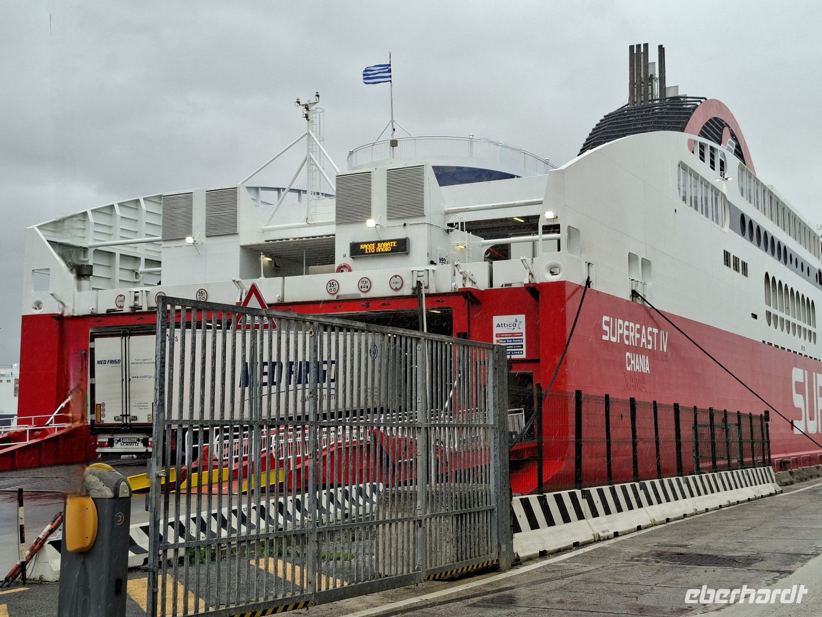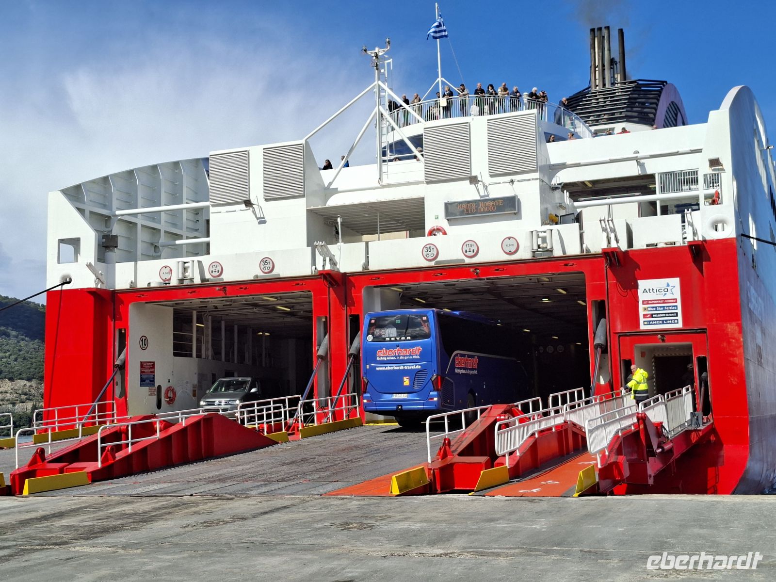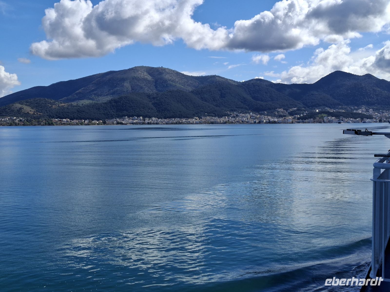 Nach einem gemütlichen Frühstück setzten wir unsere Reise auf der Brennerautobahn weiter in Richtung Süden fort. Zügig durchquerten wir die Region Emilia-Romagna und passierten dabei die Städte Modena und Bologna am südlichen Rand der Po-Ebene. Ab Bologna führte unsere Route weiter entlang der Adriaküste. Vorbei an der eindrucksvoll auf einem Felsrücken des Monte Titano gelegenen Republik San Marino erreichten wir schließlich Rimini. Kurz darauf überquerten wir die Grenze zur Region Marken, und gegen Mittag kamen wir in der Hafenstadt Ancona an, der Hauptstadt dieser Region. Am Hafenbüro unserer Fährgesellschaft Superfast Ferries erhielten wir rasch unsere Bordkarten. Anschließend war jedoch etwas Geduld gefragt, da sich die Sicherheitskontrolle verzögerte und wir erst nach einer Wartezeit an Bord unseres Fährschiffes „Superfast IV“ gehen konnten. Glücklicherweise blieb uns dennoch genügend Zeit, das Schiff auf eigene Faust zu erkunden. Am späten Nachmittag verließen wir mit leichter Verspätung den Hafen von Ancona. Begleitet von stürmischem Wetter und Regen begann unsere Überfahrt. Zum Abendessen trafen wir uns im Self-Service-Restaurant, bevor wir uns nach und nach in unsere Kabinen zurückzogen und den Tag entspannt ausklingen ließen.