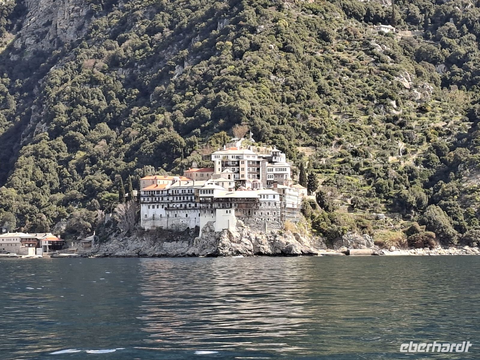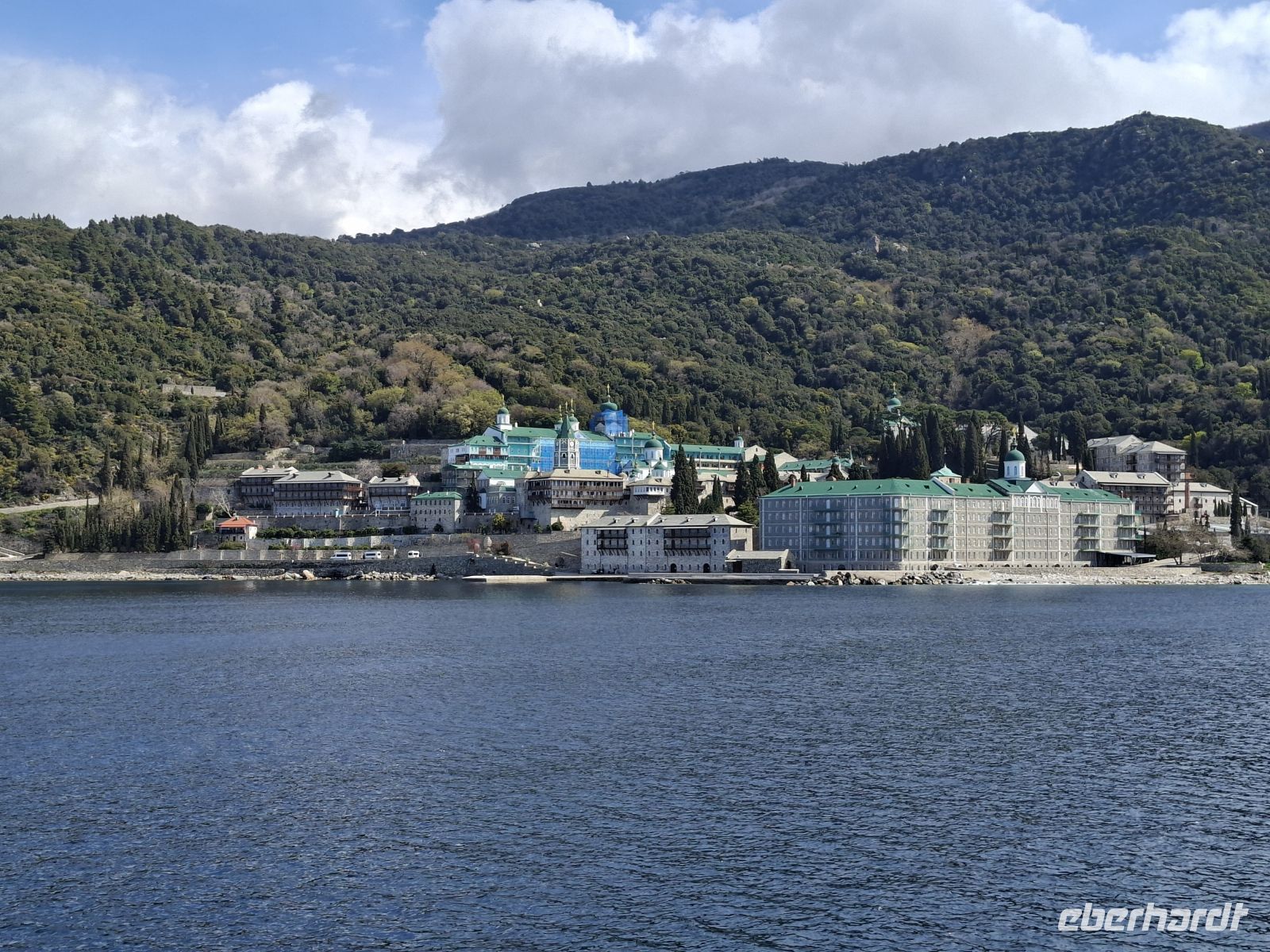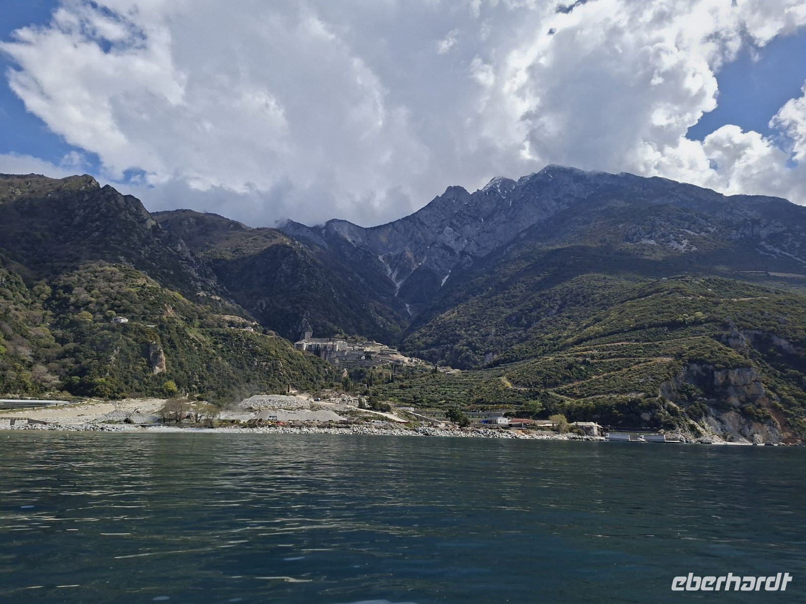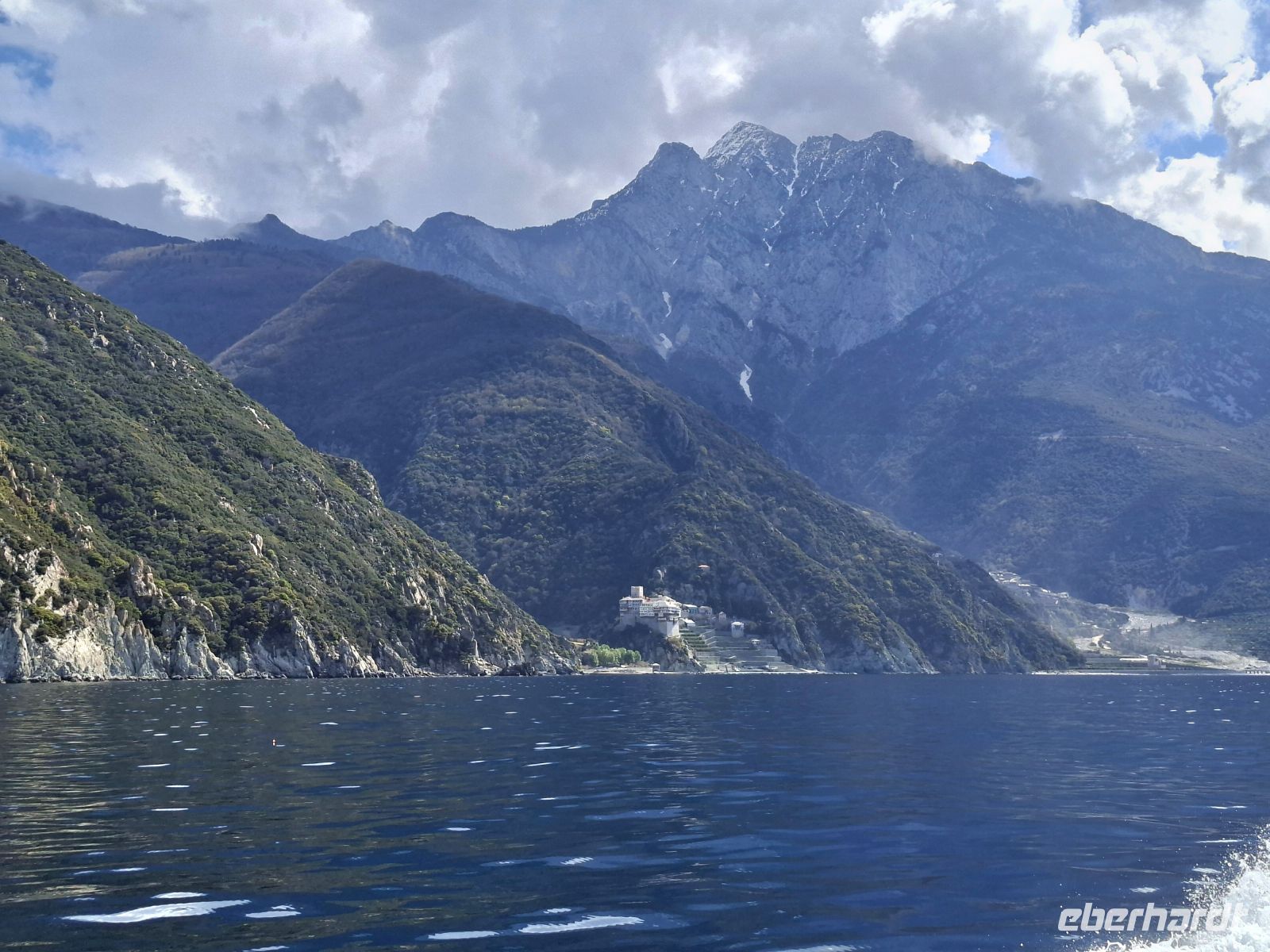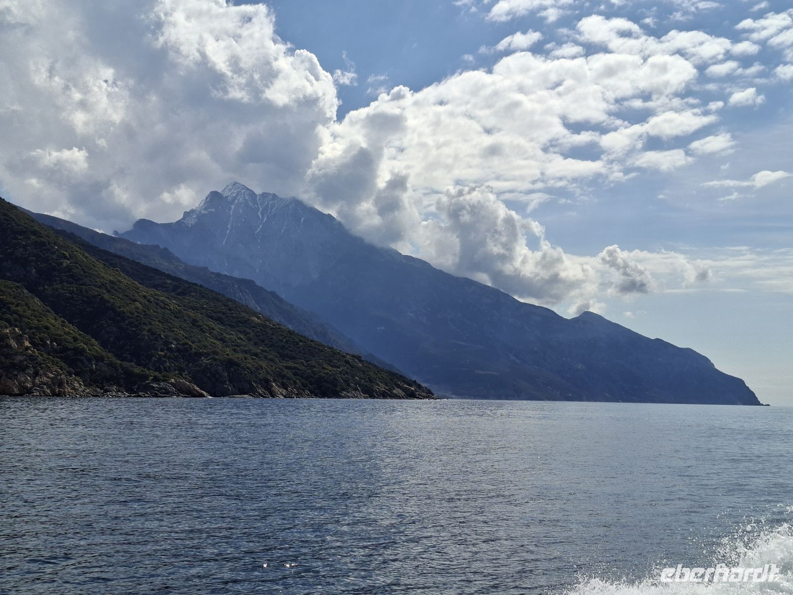 Am heutigen Tag entschied sich der Großteil unserer Reisegruppe für den fakultativen Ausflug zum Berg Athos. Früh am Morgen erwartete uns bereits ein griechischer Reisebus samt unserem freundlichen Fahrer Iordanis, der uns nach Ouranoupolis bringen sollte. Unser eigentlicher Busfahrer Andreas hatte aufgrund der gesetzlich geregelten Lenk- und Ruhezeiten einen wohlverdienten freien Tag. Die Fahrt führte uns erneut in östlicher Richtung durch die von Olivenhainen geprägte Landschaft bis an die Westküste des sogenannten „dritten Fingers“ der Halbinsel Chalkidiki. Währenddessen unterhielt uns Anastasia mit spannenden und zugleich unterhaltsamen Einblicken in die griechische Kaffeekultur. Etwa auf halber Strecke legten wir eine Pause an einer Konditorei ein, die neben Espresso und Frappé auch eine Vielzahl griechischer und internationaler Leckereien bereithielt. Frisch gestärkt setzten wir unsere Fahrt über Stavros bzw. entlang der landschaftlich reizvollen Ostuferstraße Chalkidikis fort und erreichten pünktlich Ouranoupolis, den Ausgangspunkt für unseren Schiffsausflug entlang der Küste der Mönchsrepublik Athos. Besonders für Frauen ist dies bis heute die einzige Möglichkeit, einen Blick auf die jahrhundertealten Klöster und Einsiedeleien zu werfen, da ihnen der Zutritt zur autonomen Mönchsrepublik weiterhin verwehrt ist. Aus diesem Grund hielt auch unser Schiff stets einen Mindestabstand von etwa 500 Metern zur Küste ein. Entgegen aller Prognosen zeigte sich das Wetter von seiner besten Seite: Ein angenehmer Mix aus Sonne und Wolken ermöglichte es uns sogar, die Außenplätze auf dem Schiff zu nutzen. Nach etwa 90 Minuten Fahrt entlang der Küste, vorbei an zahlreichen eindrucksvollen Klosteranlagen, erreichten wir schließlich den am südlichen Ende der Landzunge gelegenen Berg Athos. Der 2.033 Meter hohe Gipfel, der oft von Wolken verhüllt ist, präsentierte sich uns an diesem Tag überraschend klar und majestätisch. Nach knapp drei Stunden legten wir wieder im Hafen von Ouranoupolis an. Dort blieb uns ausreichend Zeit für ein entspanntes Mittagessen in einer der zahlreichen Tavernen sowie einen gemütlichen Spaziergang durch die engen, malerischen Gassen des Ortes. Am Nachmittag machten wir uns schließlich auf den Rückweg nach Thessaloniki, wo wir diesen wundervollen Tag bei einem schmackhaften Abendessen vom umfangreichen Buffet ausklingen ließen. Unterwegs holte uns dann schließlich doch noch der von den Meteorologen angekündigte Regen ein.