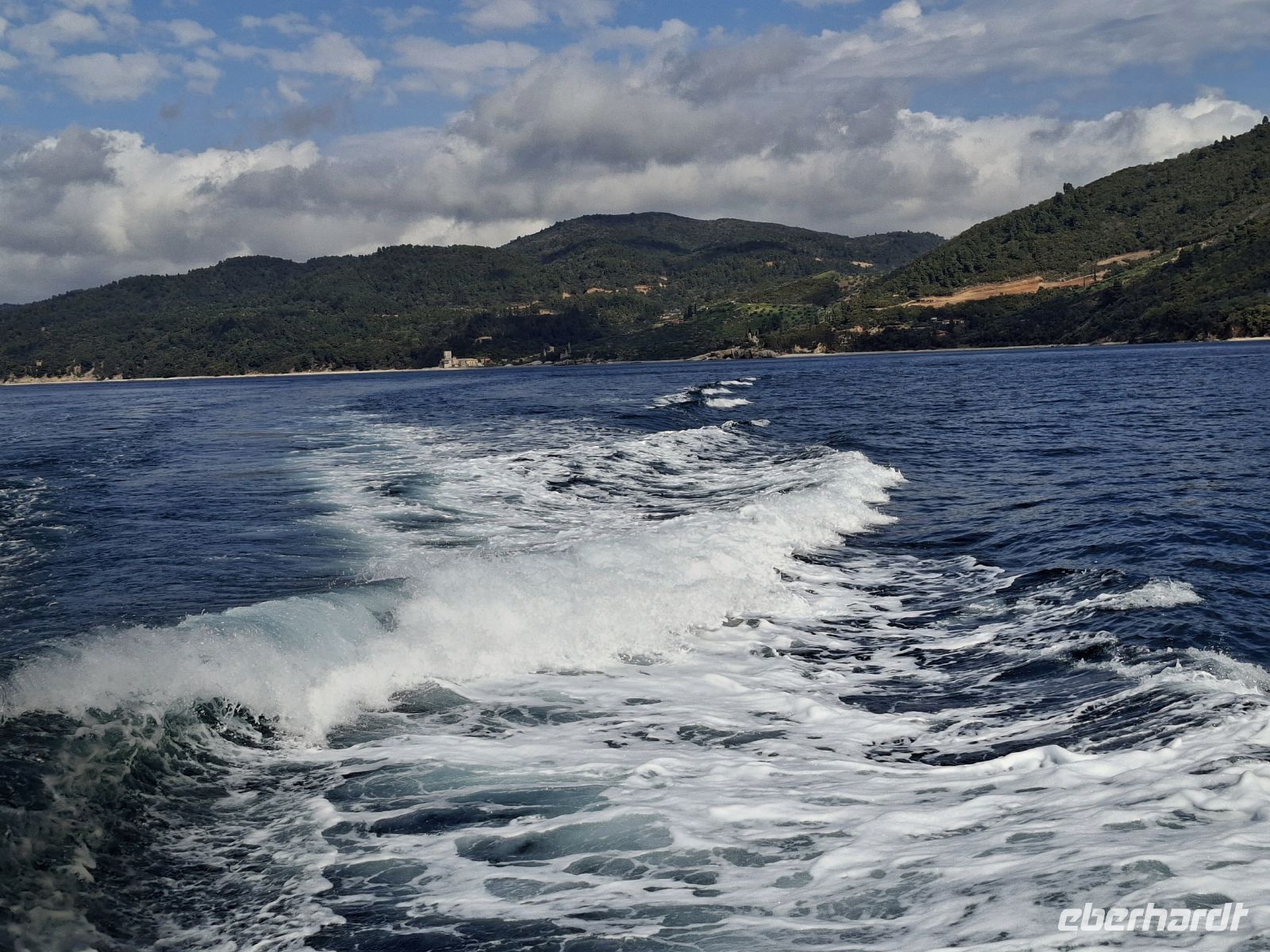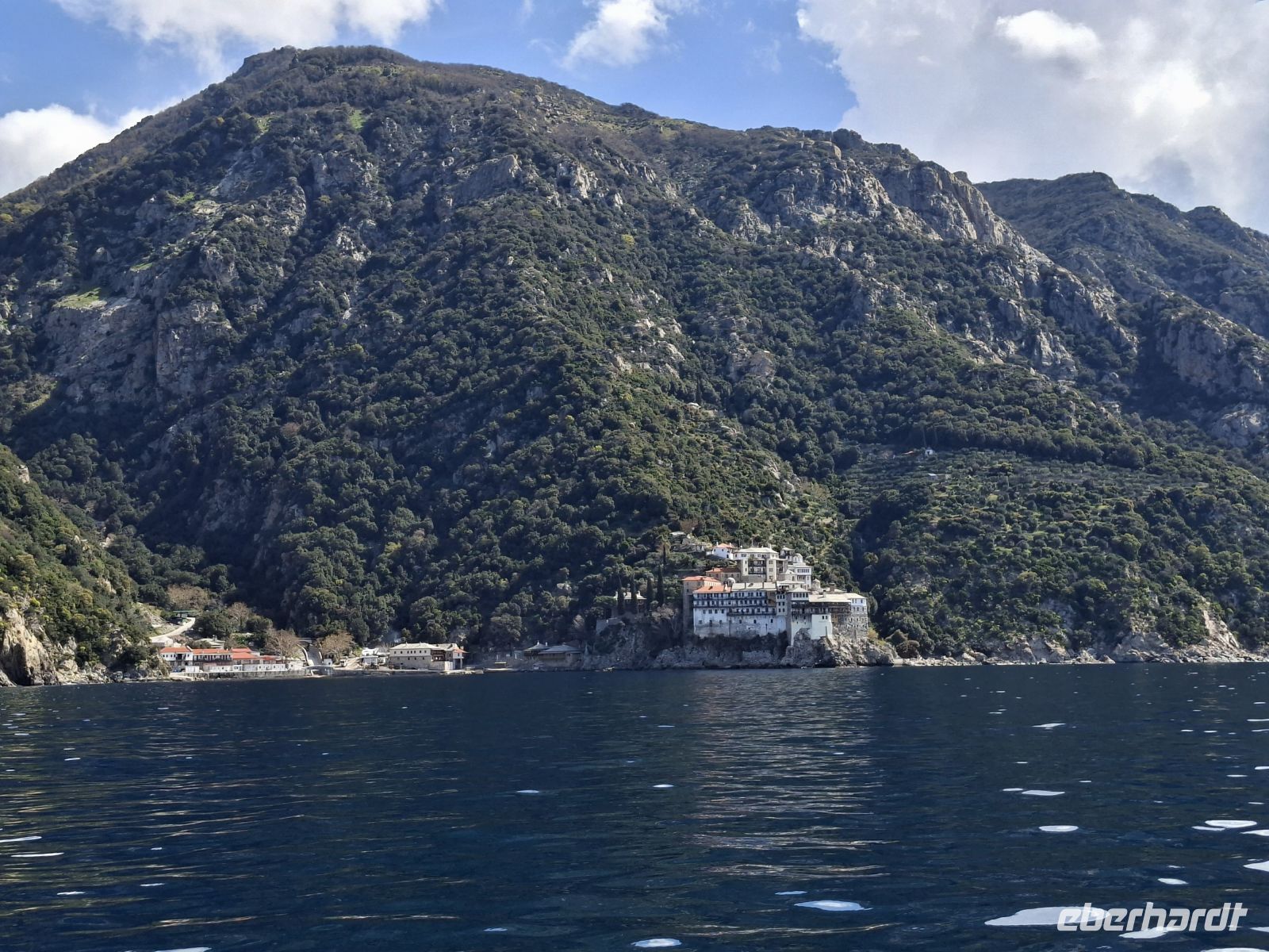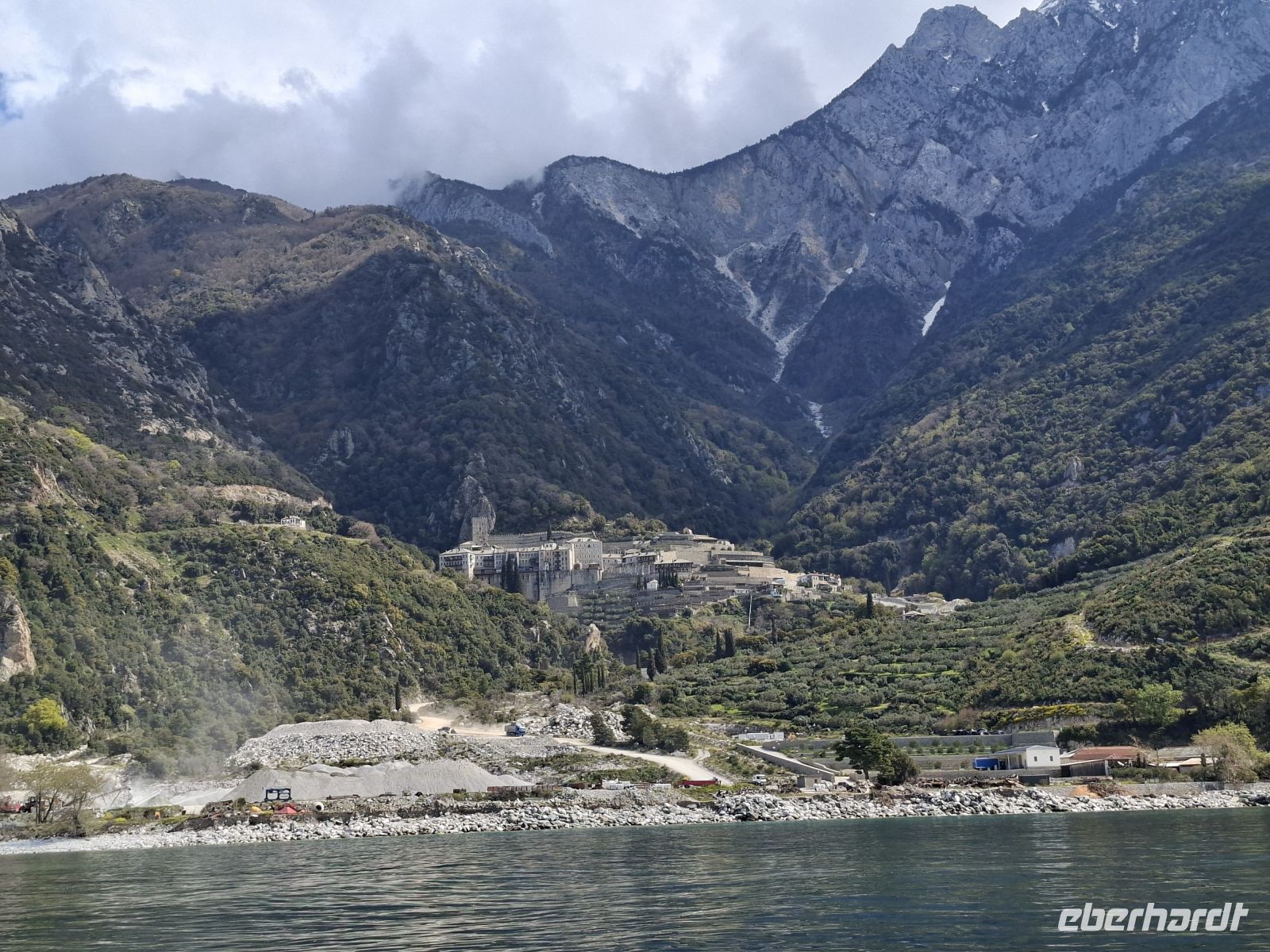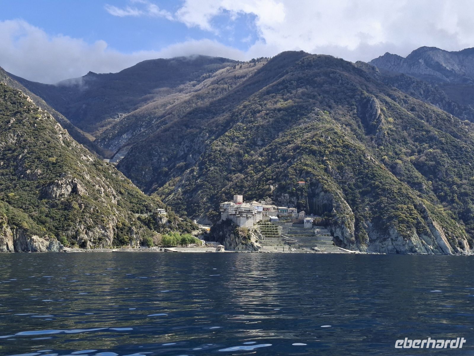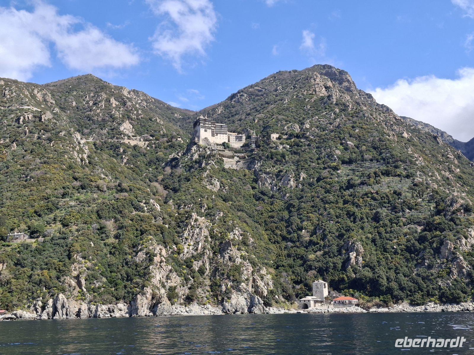 Am heutigen Tag entschied sich der Großteil unserer Reisegruppe für den fakultativen Ausflug zum Berg Athos. Früh am Morgen erwartete uns bereits ein griechischer Reisebus samt unserem freundlichen Fahrer Iordanis, der uns nach Ouranoupolis bringen sollte. Unser eigentlicher Busfahrer Andreas hatte aufgrund der gesetzlich geregelten Lenk- und Ruhezeiten einen wohlverdienten freien Tag. Die Fahrt führte uns erneut in östlicher Richtung durch die von Olivenhainen geprägte Landschaft bis an die Westküste des sogenannten „dritten Fingers“ der Halbinsel Chalkidiki. Währenddessen unterhielt uns Anastasia mit spannenden und zugleich unterhaltsamen Einblicken in die griechische Kaffeekultur. Etwa auf halber Strecke legten wir eine Pause an einer Konditorei ein, die neben Espresso und Frappé auch eine Vielzahl griechischer und internationaler Leckereien bereithielt. Frisch gestärkt setzten wir unsere Fahrt über Stavros bzw. entlang der landschaftlich reizvollen Ostuferstraße Chalkidikis fort und erreichten pünktlich Ouranoupolis, den Ausgangspunkt für unseren Schiffsausflug entlang der Küste der Mönchsrepublik Athos. Besonders für Frauen ist dies bis heute die einzige Möglichkeit, einen Blick auf die jahrhundertealten Klöster und Einsiedeleien zu werfen, da ihnen der Zutritt zur autonomen Mönchsrepublik weiterhin verwehrt ist. Aus diesem Grund hielt auch unser Schiff stets einen Mindestabstand von etwa 500 Metern zur Küste ein. Entgegen aller Prognosen zeigte sich das Wetter von seiner besten Seite: Ein angenehmer Mix aus Sonne und Wolken ermöglichte es uns sogar, die Außenplätze auf dem Schiff zu nutzen. Nach etwa 90 Minuten Fahrt entlang der Küste, vorbei an zahlreichen eindrucksvollen Klosteranlagen, erreichten wir schließlich den am südlichen Ende der Landzunge gelegenen Berg Athos. Der 2.033 Meter hohe Gipfel, der oft von Wolken verhüllt ist, präsentierte sich uns an diesem Tag überraschend klar und majestätisch. Nach knapp drei Stunden legten wir wieder im Hafen von Ouranoupolis an. Dort blieb uns ausreichend Zeit für ein entspanntes Mittagessen in einer der zahlreichen Tavernen sowie einen gemütlichen Spaziergang durch die engen, malerischen Gassen des Ortes. Am Nachmittag machten wir uns schließlich auf den Rückweg nach Thessaloniki, wo wir diesen wundervollen Tag bei einem schmackhaften Abendessen vom umfangreichen Buffet ausklingen ließen. Unterwegs holte uns dann schließlich doch noch der von den Meteorologen angekündigte Regen ein.