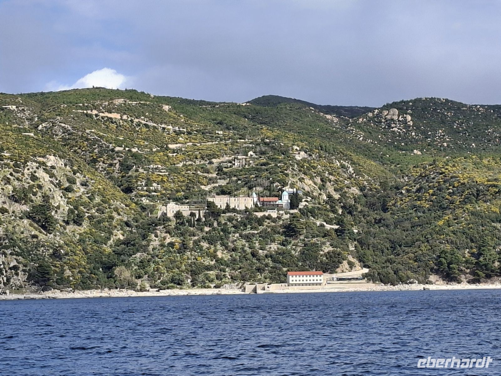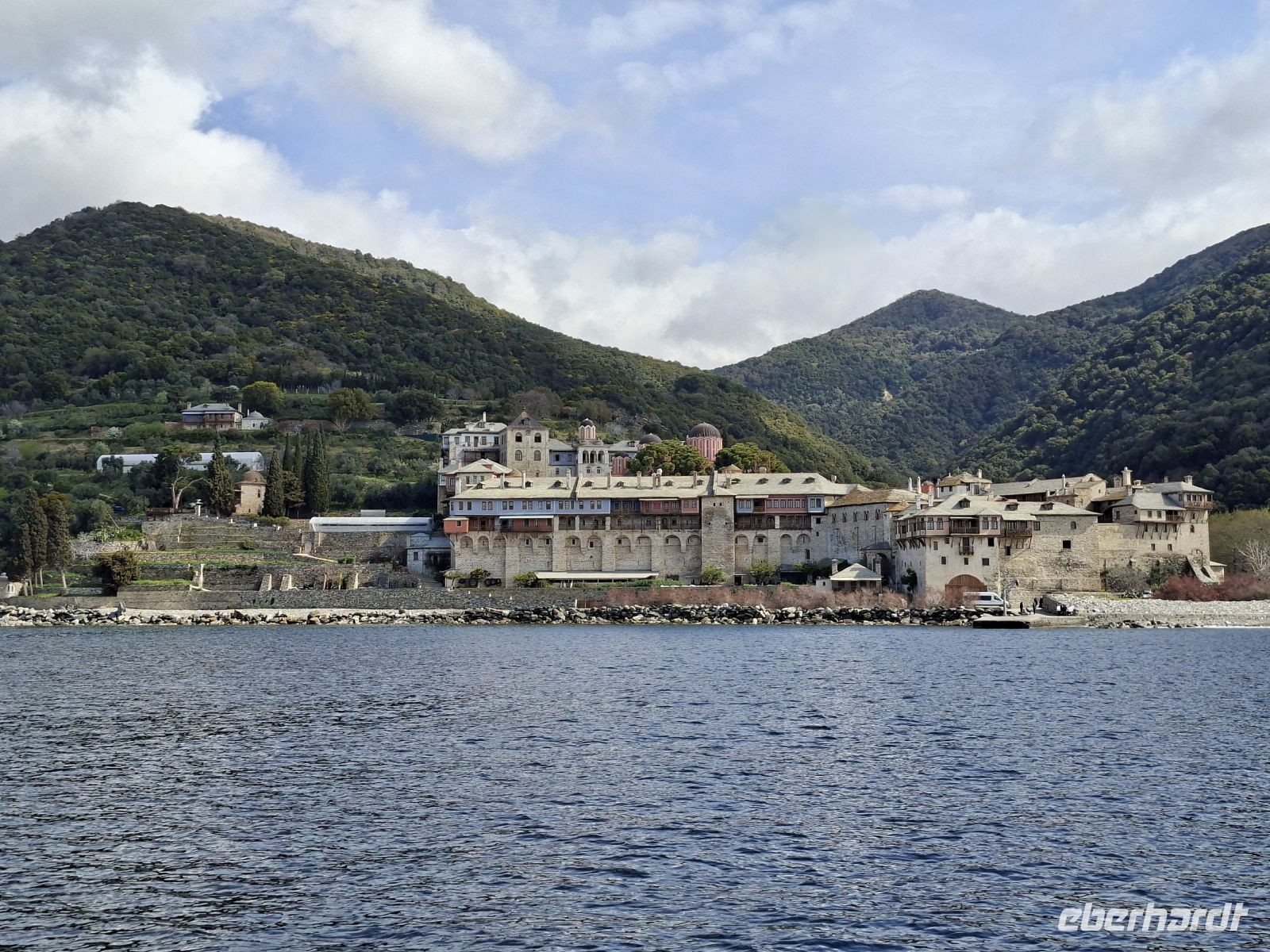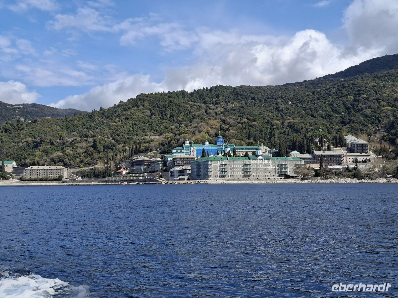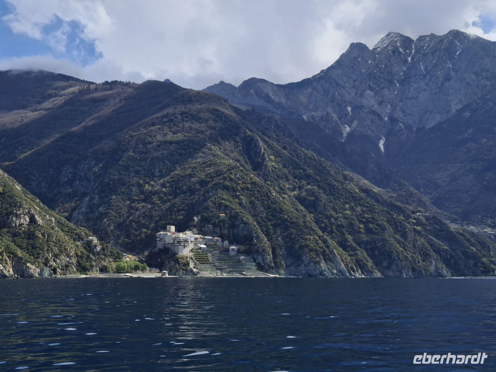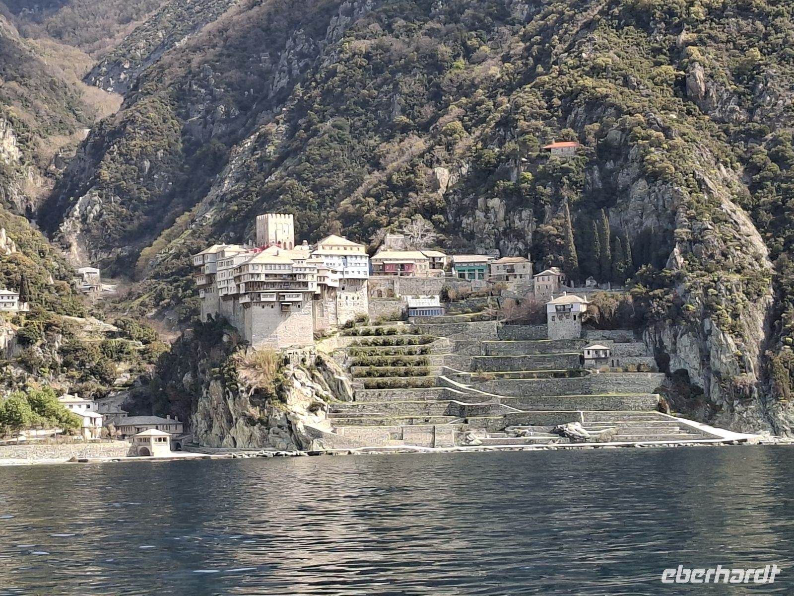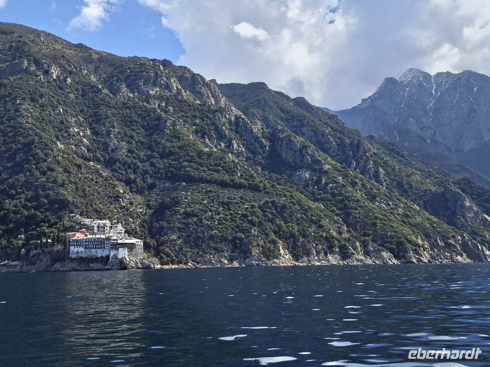Am heutigen Tag entschied sich der Großteil unserer Reisegruppe für den fakultativen Ausflug zum Berg Athos. Früh am Morgen erwartete uns bereits ein griechischer Reisebus samt unserem freundlichen Fahrer Iordanis, der uns nach Ouranoupolis bringen sollte. Unser eigentlicher Busfahrer Andreas hatte aufgrund der gesetzlich geregelten Lenk- und Ruhezeiten einen wohlverdienten freien Tag. Die Fahrt führte uns erneut in östlicher Richtung durch die von Olivenhainen geprägte Landschaft bis an die Westküste des sogenannten „dritten Fingers“ der Halbinsel Chalkidiki. Währenddessen unterhielt uns Anastasia mit spannenden und zugleich unterhaltsamen Einblicken in die griechische Kaffeekultur. Etwa auf halber Strecke legten wir eine Pause an einer Konditorei ein, die neben Espresso und Frappé auch eine Vielzahl griechischer und internationaler Leckereien bereithielt. Frisch gestärkt setzten wir unsere Fahrt über Stavros bzw. entlang der landschaftlich reizvollen Ostuferstraße Chalkidikis fort und erreichten pünktlich Ouranoupolis, den Ausgangspunkt für unseren Schiffsausflug entlang der Küste der Mönchsrepublik Athos. Besonders für Frauen ist dies bis heute die einzige Möglichkeit, einen Blick auf die jahrhundertealten Klöster und Einsiedeleien zu werfen, da ihnen der Zutritt zur autonomen Mönchsrepublik weiterhin verwehrt ist. Aus diesem Grund hielt auch unser Schiff stets einen Mindestabstand von etwa 500 Metern zur Küste ein. Entgegen aller Prognosen zeigte sich das Wetter von seiner besten Seite: Ein angenehmer Mix aus Sonne und Wolken ermöglichte es uns sogar, die Außenplätze auf dem Schiff zu nutzen. Nach etwa 90 Minuten Fahrt entlang der Küste, vorbei an zahlreichen eindrucksvollen Klosteranlagen, erreichten wir schließlich den am südlichen Ende der Landzunge gelegenen Berg Athos. Der 2.033 Meter hohe Gipfel, der oft von Wolken verhüllt ist, präsentierte sich uns an diesem Tag überraschend klar und majestätisch. Nach knapp drei Stunden legten wir wieder im Hafen von Ouranoupolis an. Dort blieb uns ausreichend Zeit für ein entspanntes Mittagessen in einer der zahlreichen Tavernen sowie einen gemütlichen Spaziergang durch die engen, malerischen Gassen des Ortes. Am Nachmittag machten wir uns schließlich auf den Rückweg nach Thessaloniki, wo wir diesen wundervollen Tag bei einem schmackhaften Abendessen vom umfangreichen Buffet ausklingen ließen. Unterwegs holte uns dann schließlich doch noch der von den Meteorologen angekündigte Regen ein.