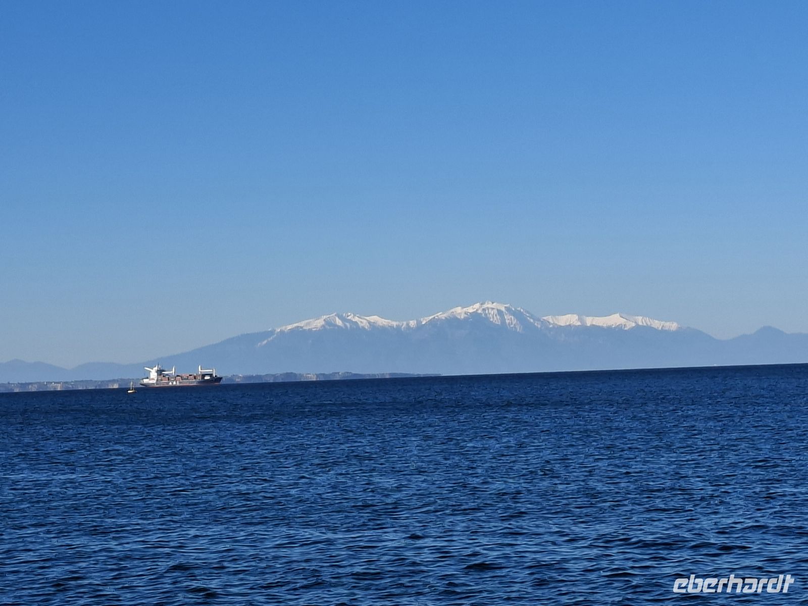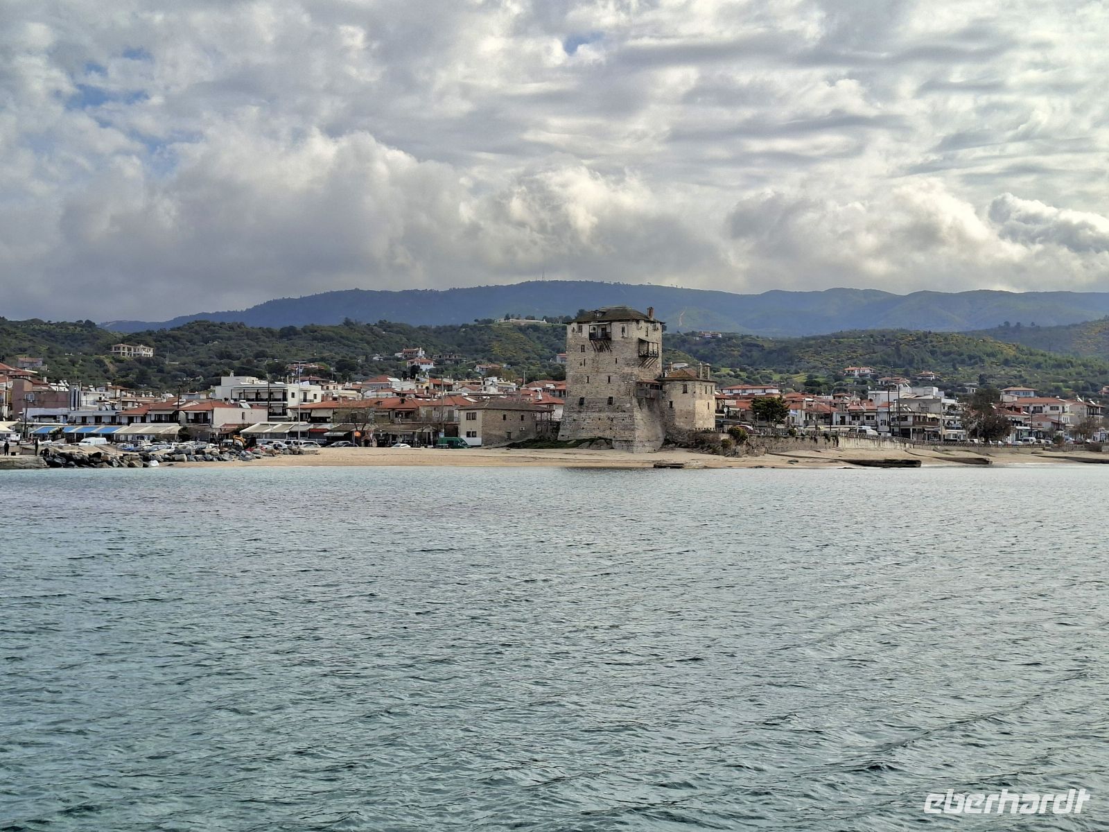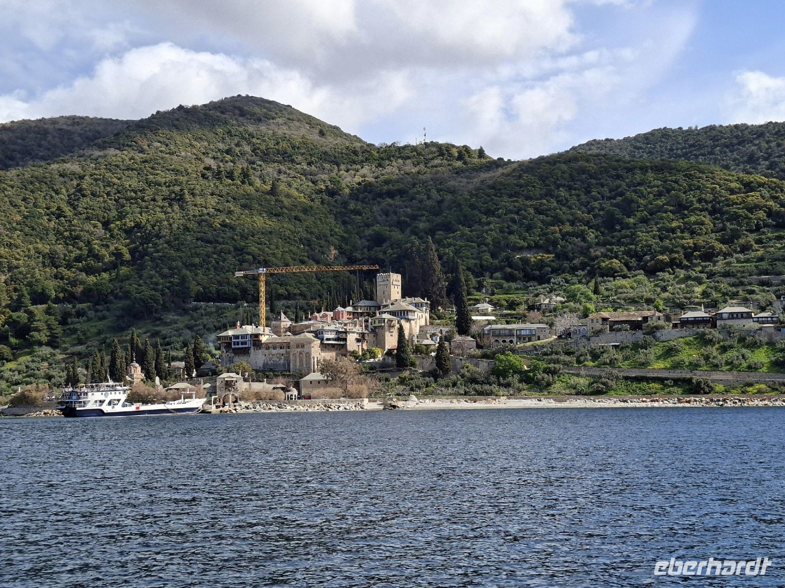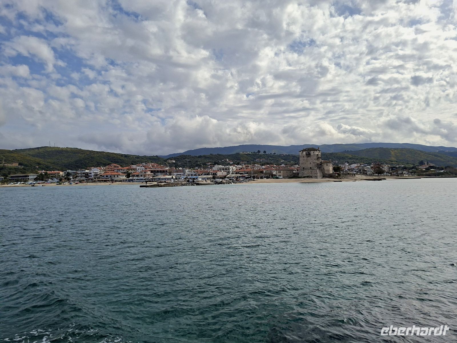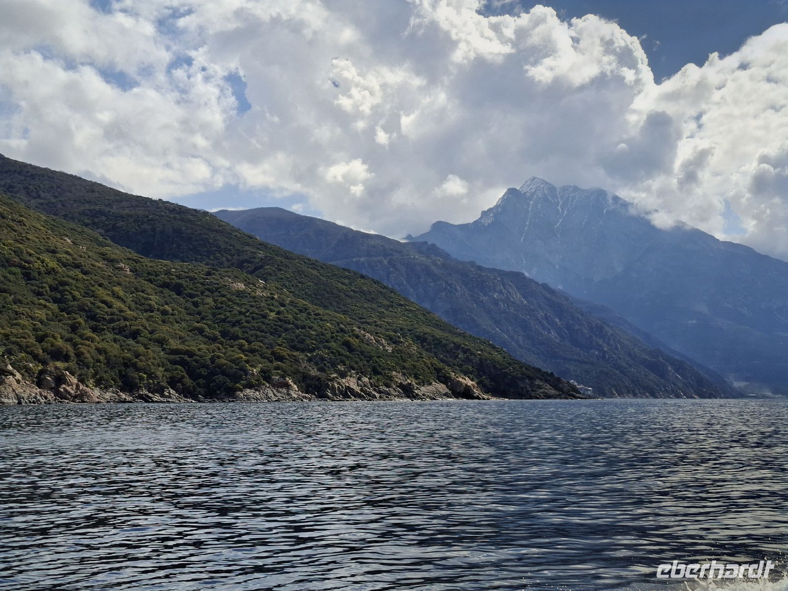 Am heutigen Tag entschied sich der Großteil unserer Reisegruppe für den fakultativen Ausflug zum Berg Athos. Früh am Morgen erwartete uns bereits ein griechischer Reisebus samt unserem freundlichen Fahrer Iordanis, der uns nach Ouranoupolis bringen sollte. Unser eigentlicher Busfahrer Andreas hatte aufgrund der gesetzlich geregelten Lenk- und Ruhezeiten einen wohlverdienten freien Tag. Die Fahrt führte uns erneut in östlicher Richtung durch die von Olivenhainen geprägte Landschaft bis an die Westküste des sogenannten „dritten Fingers“ der Halbinsel Chalkidiki. Währenddessen unterhielt uns Anastasia mit spannenden und zugleich unterhaltsamen Einblicken in die griechische Kaffeekultur. Etwa auf halber Strecke legten wir eine Pause an einer Konditorei ein, die neben Espresso und Frappé auch eine Vielzahl griechischer und internationaler Leckereien bereithielt. Frisch gestärkt setzten wir unsere Fahrt über Stavros bzw. entlang der landschaftlich reizvollen Ostuferstraße Chalkidikis fort und erreichten pünktlich Ouranoupolis, den Ausgangspunkt für unseren Schiffsausflug entlang der Küste der Mönchsrepublik Athos. Besonders für Frauen ist dies bis heute die einzige Möglichkeit, einen Blick auf die jahrhundertealten Klöster und Einsiedeleien zu werfen, da ihnen der Zutritt zur autonomen Mönchsrepublik weiterhin verwehrt ist. Aus diesem Grund hielt auch unser Schiff stets einen Mindestabstand von etwa 500 Metern zur Küste ein. Entgegen aller Prognosen zeigte sich das Wetter von seiner besten Seite: Ein angenehmer Mix aus Sonne und Wolken ermöglichte es uns sogar, die Außenplätze auf dem Schiff zu nutzen. Nach etwa 90 Minuten Fahrt entlang der Küste, vorbei an zahlreichen eindrucksvollen Klosteranlagen, erreichten wir schließlich den am südlichen Ende der Landzunge gelegenen Berg Athos. Der 2.033 Meter hohe Gipfel, der oft von Wolken verhüllt ist, präsentierte sich uns an diesem Tag überraschend klar und majestätisch. Nach knapp drei Stunden legten wir wieder im Hafen von Ouranoupolis an. Dort blieb uns ausreichend Zeit für ein entspanntes Mittagessen in einer der zahlreichen Tavernen sowie einen gemütlichen Spaziergang durch die engen, malerischen Gassen des Ortes. Am Nachmittag machten wir uns schließlich auf den Rückweg nach Thessaloniki, wo wir diesen wundervollen Tag bei einem schmackhaften Abendessen vom umfangreichen Buffet ausklingen ließen. Unterwegs holte uns dann schließlich doch noch der von den Meteorologen angekündigte Regen ein.