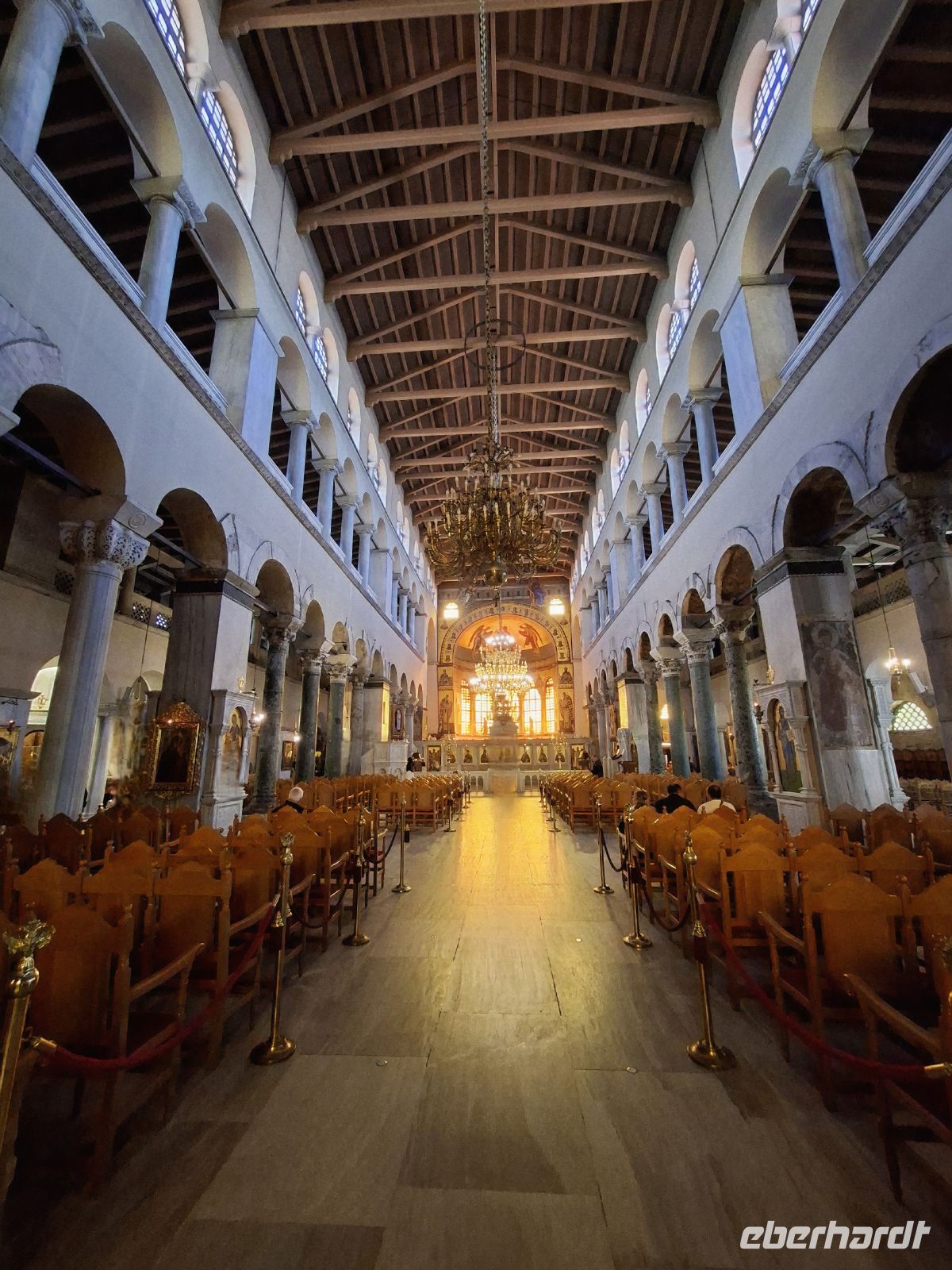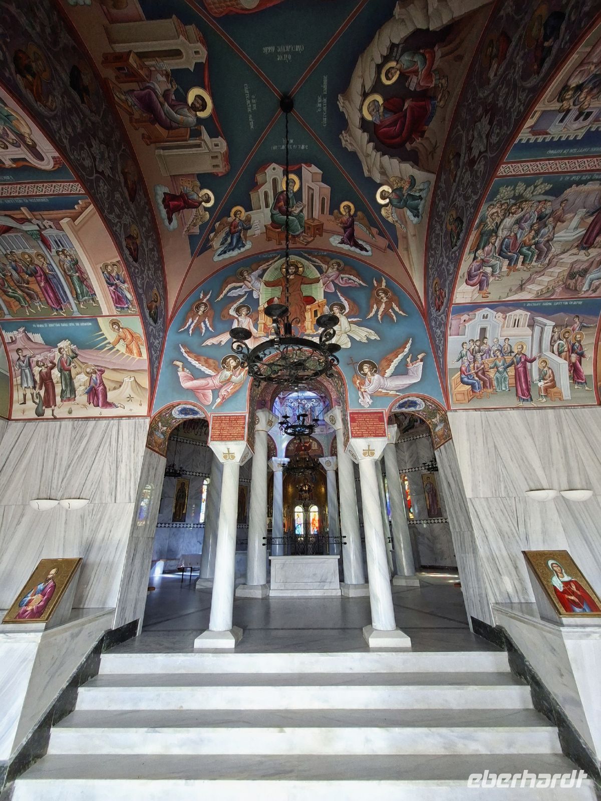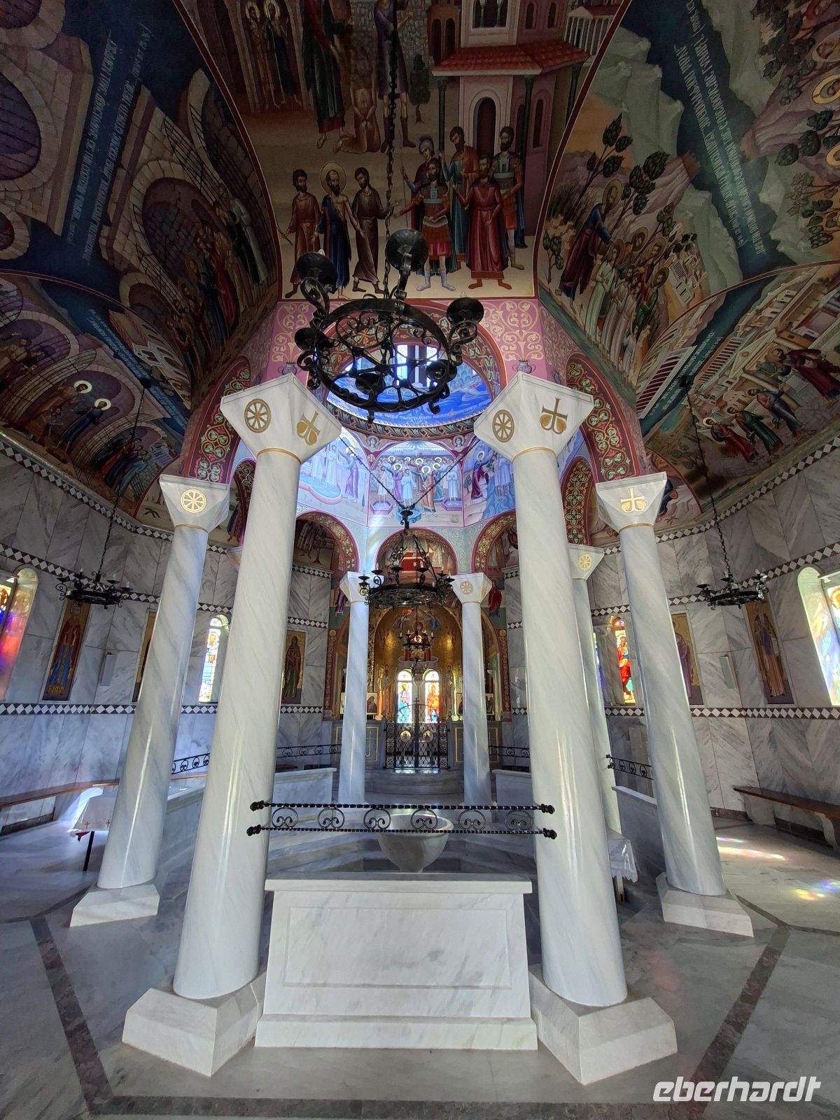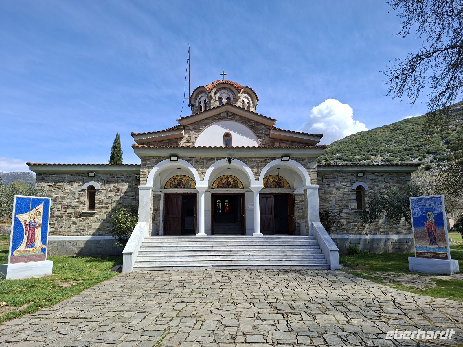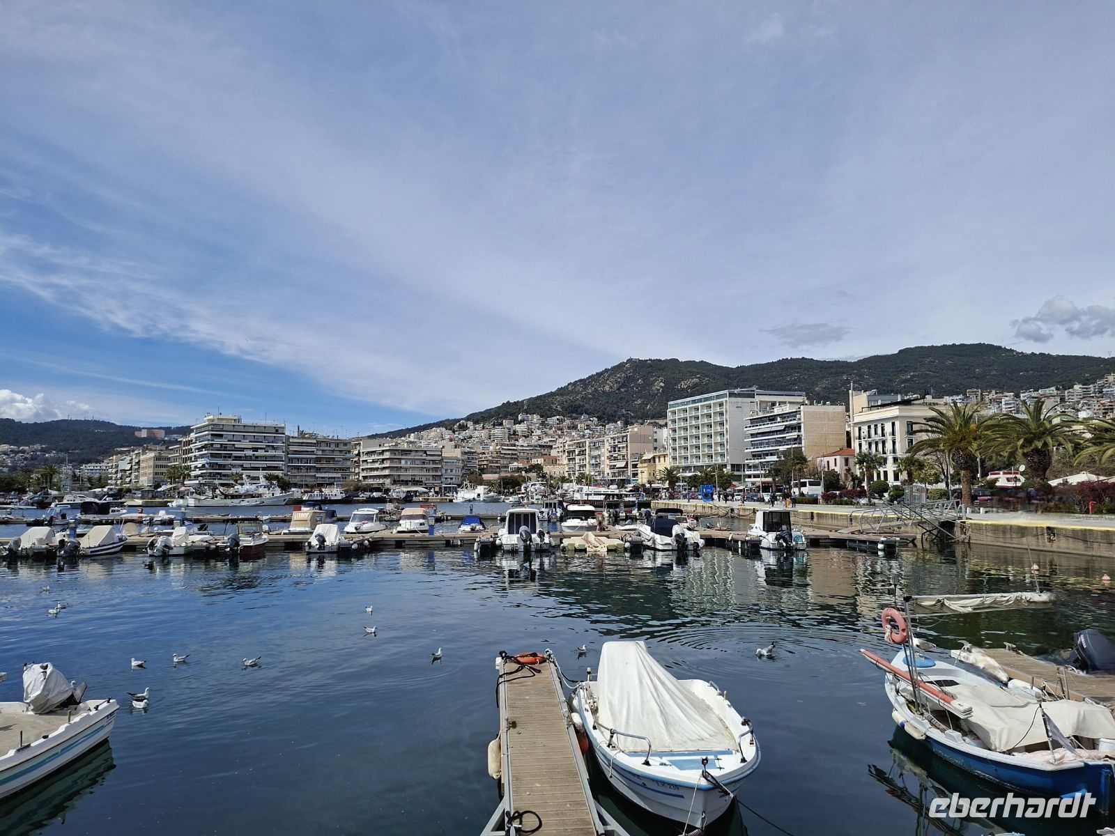 Am heutigen Tag entschied sich der Großteil unserer Reisegruppe für den fakultativen Ausflug zum Berg Athos. Früh am Morgen erwartete uns bereits ein griechischer Reisebus samt unserem freundlichen Fahrer Iordanis, der uns nach Ouranoupolis bringen sollte. Unser eigentlicher Busfahrer Andreas hatte aufgrund der gesetzlich geregelten Lenk- und Ruhezeiten einen wohlverdienten freien Tag. Die Fahrt führte uns erneut in östlicher Richtung durch die von Olivenhainen geprägte Landschaft bis an die Westküste des sogenannten „dritten Fingers“ der Halbinsel Chalkidiki. Währenddessen unterhielt uns Anastasia mit spannenden und zugleich unterhaltsamen Einblicken in die griechische Kaffeekultur. Etwa auf halber Strecke legten wir eine Pause an einer Konditorei ein, die neben Espresso und Frappé auch eine Vielzahl griechischer und internationaler Leckereien bereithielt. Frisch gestärkt setzten wir unsere Fahrt über Stavros bzw. entlang der landschaftlich reizvollen Ostuferstraße Chalkidikis fort und erreichten pünktlich Ouranoupolis, den Ausgangspunkt für unseren Schiffsausflug entlang der Küste der Mönchsrepublik Athos. Besonders für Frauen ist dies bis heute die einzige Möglichkeit, einen Blick auf die jahrhundertealten Klöster und Einsiedeleien zu werfen, da ihnen der Zutritt zur autonomen Mönchsrepublik weiterhin verwehrt ist. Aus diesem Grund hielt auch unser Schiff stets einen Mindestabstand von etwa 500 Metern zur Küste ein. Entgegen aller Prognosen zeigte sich das Wetter von seiner besten Seite: Ein angenehmer Mix aus Sonne und Wolken ermöglichte es uns sogar, die Außenplätze auf dem Schiff zu nutzen. Nach etwa 90 Minuten Fahrt entlang der Küste, vorbei an zahlreichen eindrucksvollen Klosteranlagen, erreichten wir schließlich den am südlichen Ende der Landzunge gelegenen Berg Athos. Der 2.033 Meter hohe Gipfel, der oft von Wolken verhüllt ist, präsentierte sich uns an diesem Tag überraschend klar und majestätisch. Nach knapp drei Stunden legten wir wieder im Hafen von Ouranoupolis an. Dort blieb uns ausreichend Zeit für ein entspanntes Mittagessen in einer der zahlreichen Tavernen sowie einen gemütlichen Spaziergang durch die engen, malerischen Gassen des Ortes. Am Nachmittag machten wir uns schließlich auf den Rückweg nach Thessaloniki, wo wir diesen wundervollen Tag bei einem schmackhaften Abendessen vom umfangreichen Buffet ausklingen ließen. Unterwegs holte uns dann schließlich doch noch der von den Meteorologen angekündigte Regen ein.