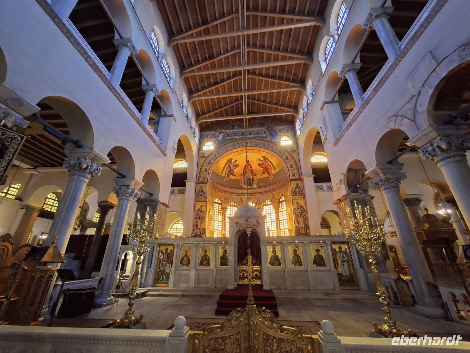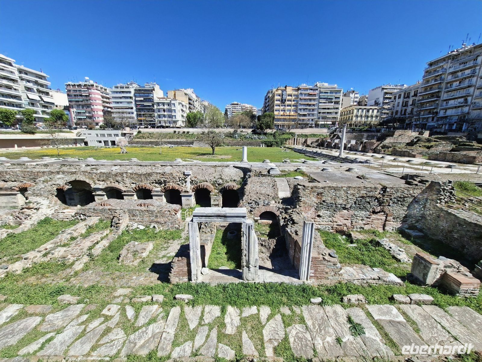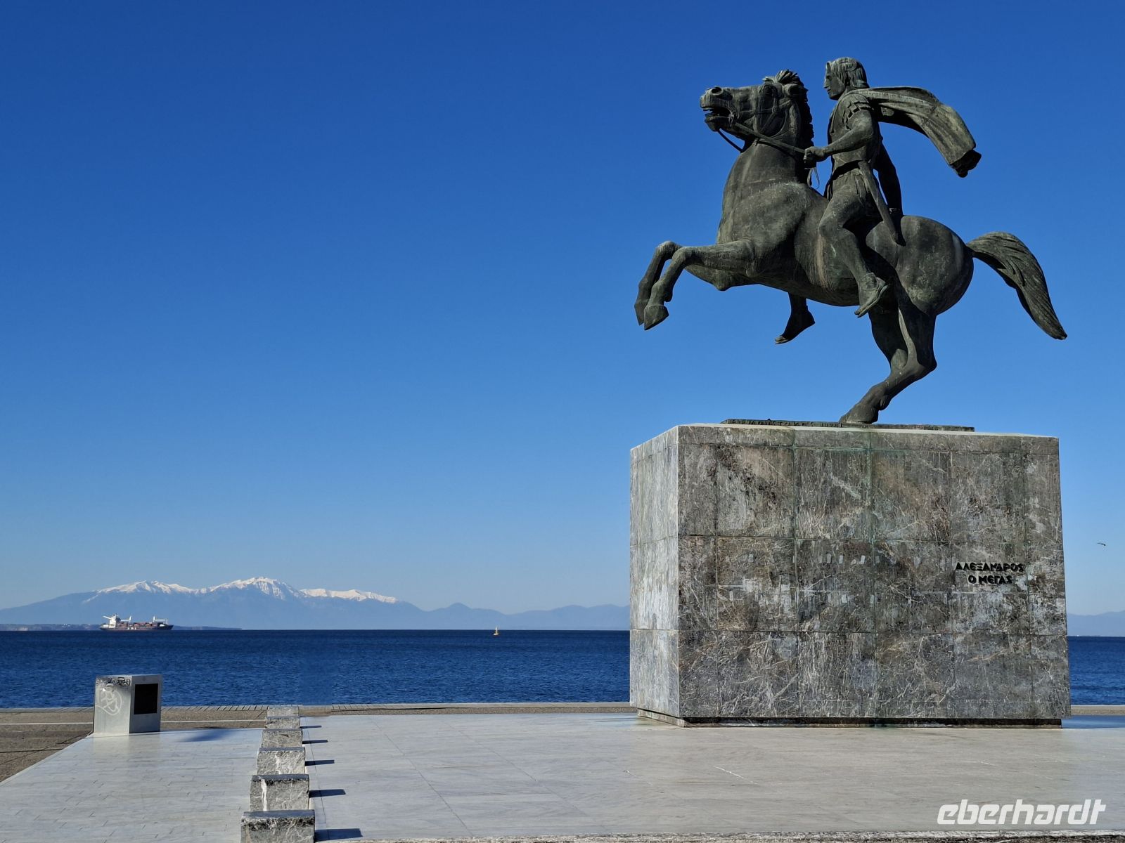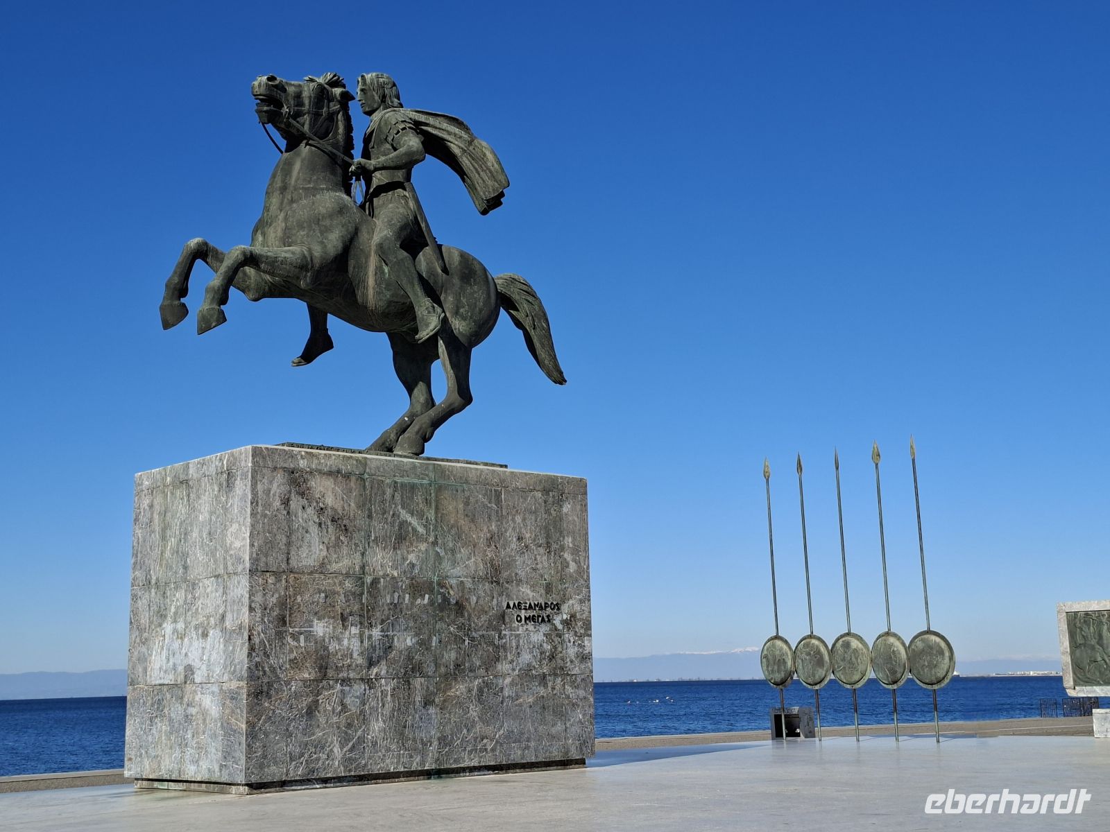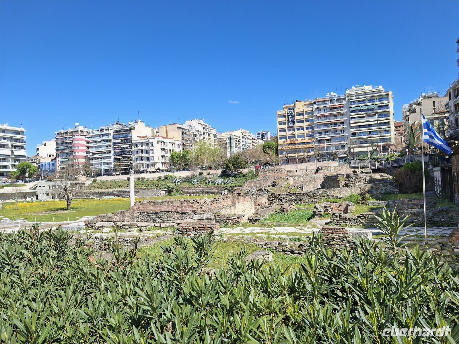 An diesem sonnigen Vormittag erkundeten wir Thessaloniki bei einer abwechslungsreichen Stadtrundfahrt – der Heimat unserer Reiseleiterin Anastasia. Zunächst führte uns die Strecke entlang der weitläufigen Hafenpromenade. Am markanten Weißer Turm, einem der letzten Überreste der osmanischen Stadtbefestigung, legten wir einen Halt ein. Von dort spazierten wir weiter zum eindrucksvollen Denkmal von Alexander der Große, der bis heute eine allgegenwärtige Figur in Makedonien ist. Im Anschluss ging es quer durch die Stadt, u. a. vorbei am Galeriusbogen und der Rotunde, hinauf zur alten Zitadelle oberhalb der Altstadt. Von hier bot sich uns ein herrlicher Panoramablick über die zweitgrößte Stadt Griechenlands, die von ihren Bewohnern auch liebevoll Saloniki genannt wird. Zurück im Zentrum besichtigten wir die imposante Kirche Agios Dimitrios, eines der bedeutendsten Gotteshäuser des Landes. Danach setzten wir unsere Erkundung zu Fuß fort: Nur wenige Schritte entfernt entdeckten wir das römische Forum und gelangten schließlich zum lebhaften Aristoteles-Platz, einem der schönsten Plätze der Stadt. Den Abschluss bildete ein Spaziergang über den geschäftigen Kapani-Markt mit seinem bunten Treiben. In einer traditionellen Ouzerie ließen wir die Eindrücke bei einem Glas Ouzo und köstlichen kleinen Speisen entspannt ausklingen. Am Nachmittag blieb schließlich noch Zeit, die Stadt individuell weiter zu entdecken oder in einer der zahlreichen gemütlichen Tavernen einzukehren.