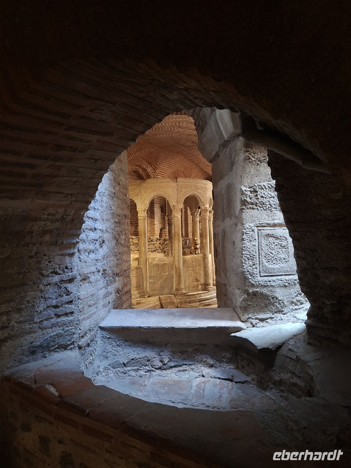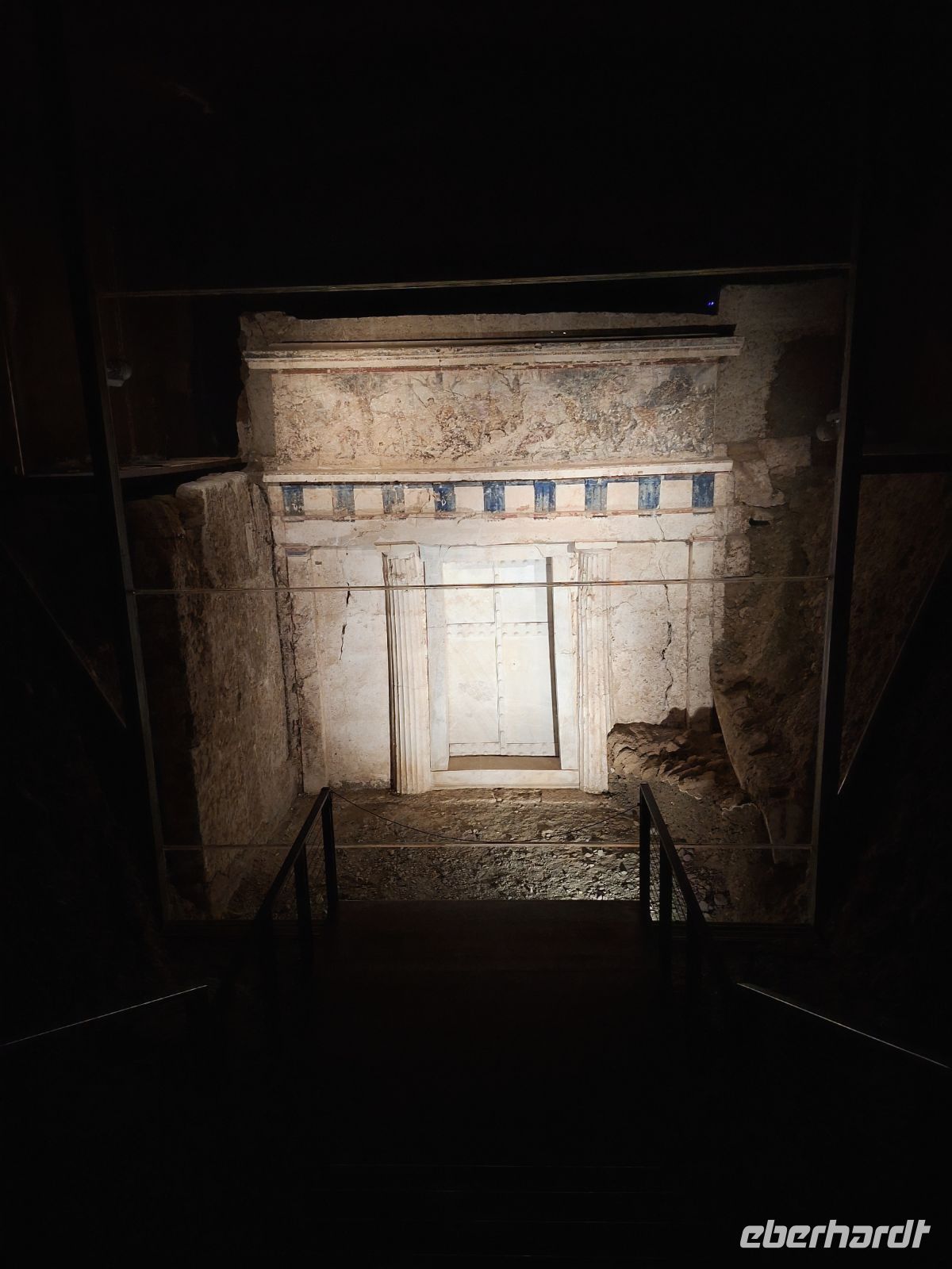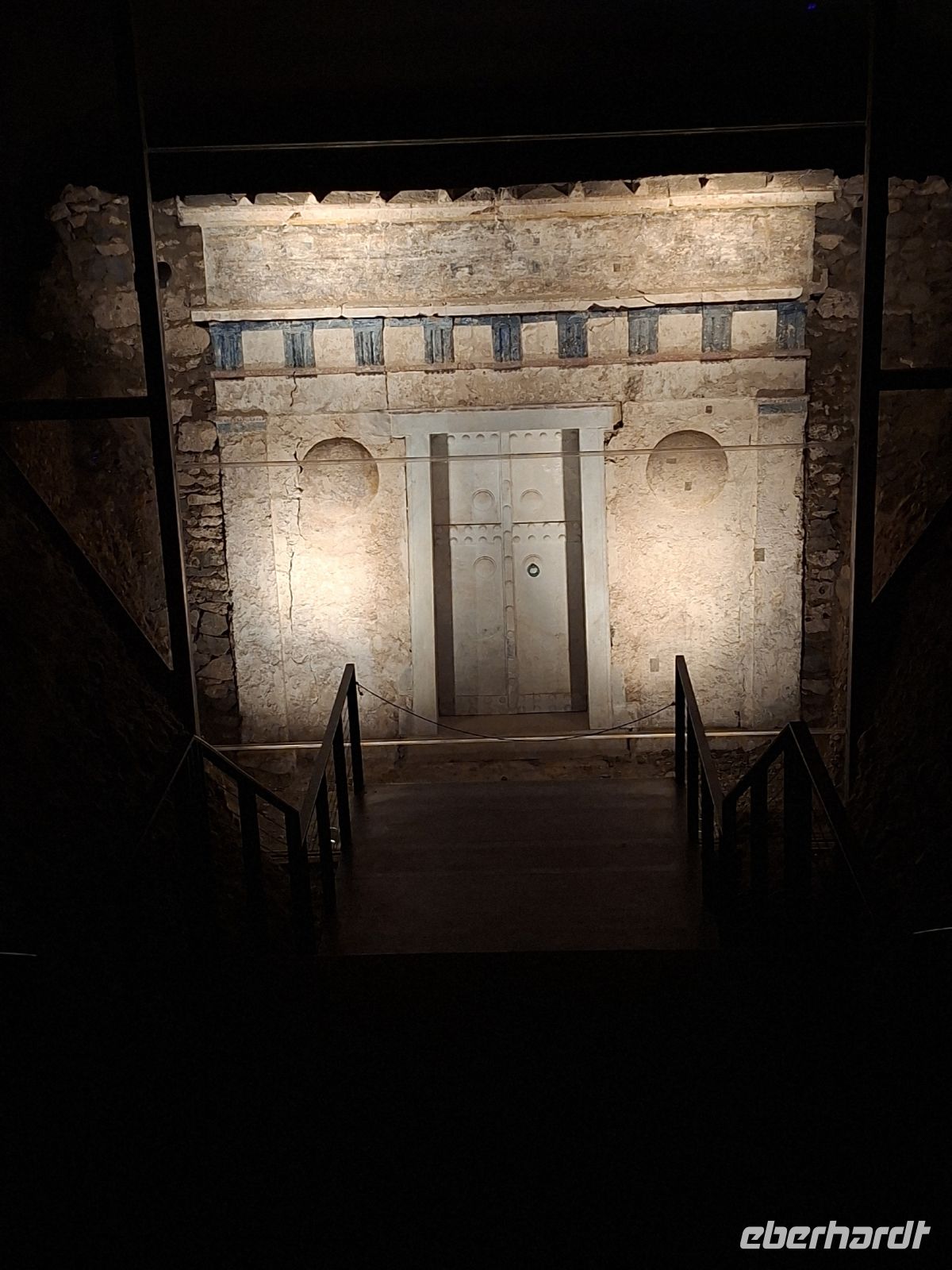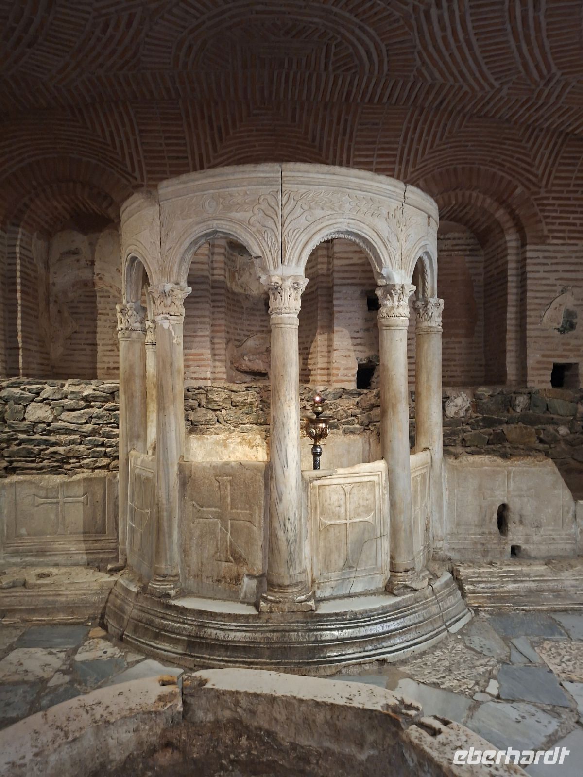 Trotz der leicht bewegten See verlief die nächtliche Überfahrt insgesamt ruhig, sodass wir uns am Morgen gut erholt zu einem gemeinsamen Frühstück trafen. Schon bald kamen die ersten Küstenlinien in Sicht: Wir erblickten Albanien und sogar die griechische Insel Korfu am Horizont. Mit etwas mehr als 30 Minuten Verspätung erreichten wir schließlich den Hafen von Igoumenitsa, wo uns unsere örtliche Reiseleiterin Anastasia bereits herzlich und bei Sonnenschein empfing. Auf der anschließenden Fahrt durch die beeindruckende Berglandschaft der Region Epirus stellte sie sich vor und erzählte unterhaltsam, warum Deutsch für sie nicht Mutter-, sondern „Großmuttersprache“ ist. Neben persönlichen Einblicken erhielten wir auch viele interessante Informationen über das Leben in Griechenland. Nach kurzweiliger Fahrt erreichten wir unser erstes Ziel, die Stadt Ioannina. Dort wurden wir jedoch zunächst durch eine Straßensperrung aufgehalten, die unserem Busfahrer Andreas einiges an Geduld im lebhaften griechischen Verkehr abverlangte. Als es dabei sogar zu einer leichten Kollision mit einem Pkw kam, mussten wir auf die Polizei warten. Kurzerhand zogen wir unsere Mittagspause vor, und nach etwa einer Stunde konnten wir unser Programm glücklicherweise fortsetzen. In Ioannina begaben wir uns fortan auf eine kleine Zeitreise in die Epoche, als Griechenland Teil des Osmanischen Reiches war. Bei einem Rundgang erkundeten wir die malerische Burgstadt mit ihrer Akropolis, der Zitadelle, dem Normannischen Turm, der Fetije-Moschee sowie den Überresten des Ali-Pascha-Mausoleums. Mittlerweile war es Nachmittag geworden, und noch rund 250 Kilometer lagen vor uns, bevor wir Thessaloniki erreichten. Dort bezogen wir unsere Zimmer im zentral gelegenen, modernen „Capsis Hotel“, das für die kommenden vier Nächte unser Ausgangspunkt sein sollte. Außerdem begrüßten wir vier weitere Reiseteilnehmer, die im Laufe des Tages aus Deutschland eingeflogen waren und unsere Gruppe komplettierten. Ein gemeinsames Abendessen vom reichhaltigen Buffet bildete schließlich einen gelungenen Abschluss dieses ereignisreichen Tages.