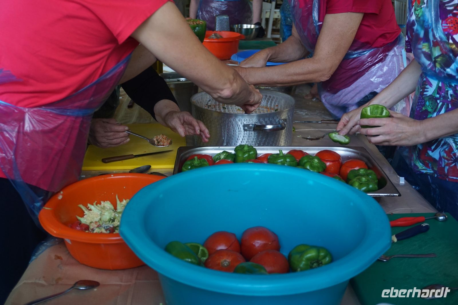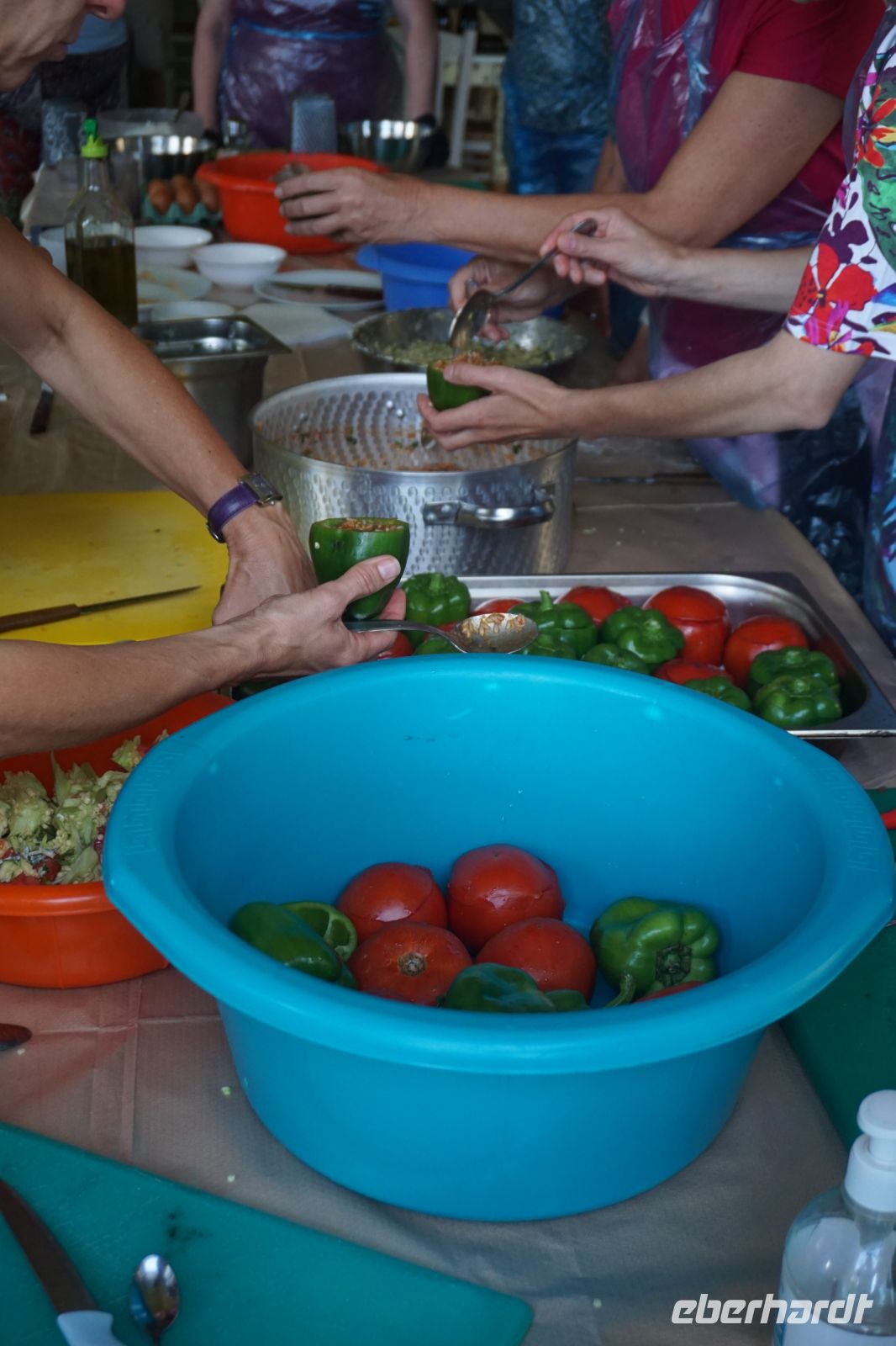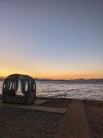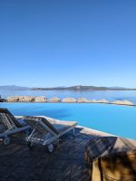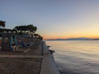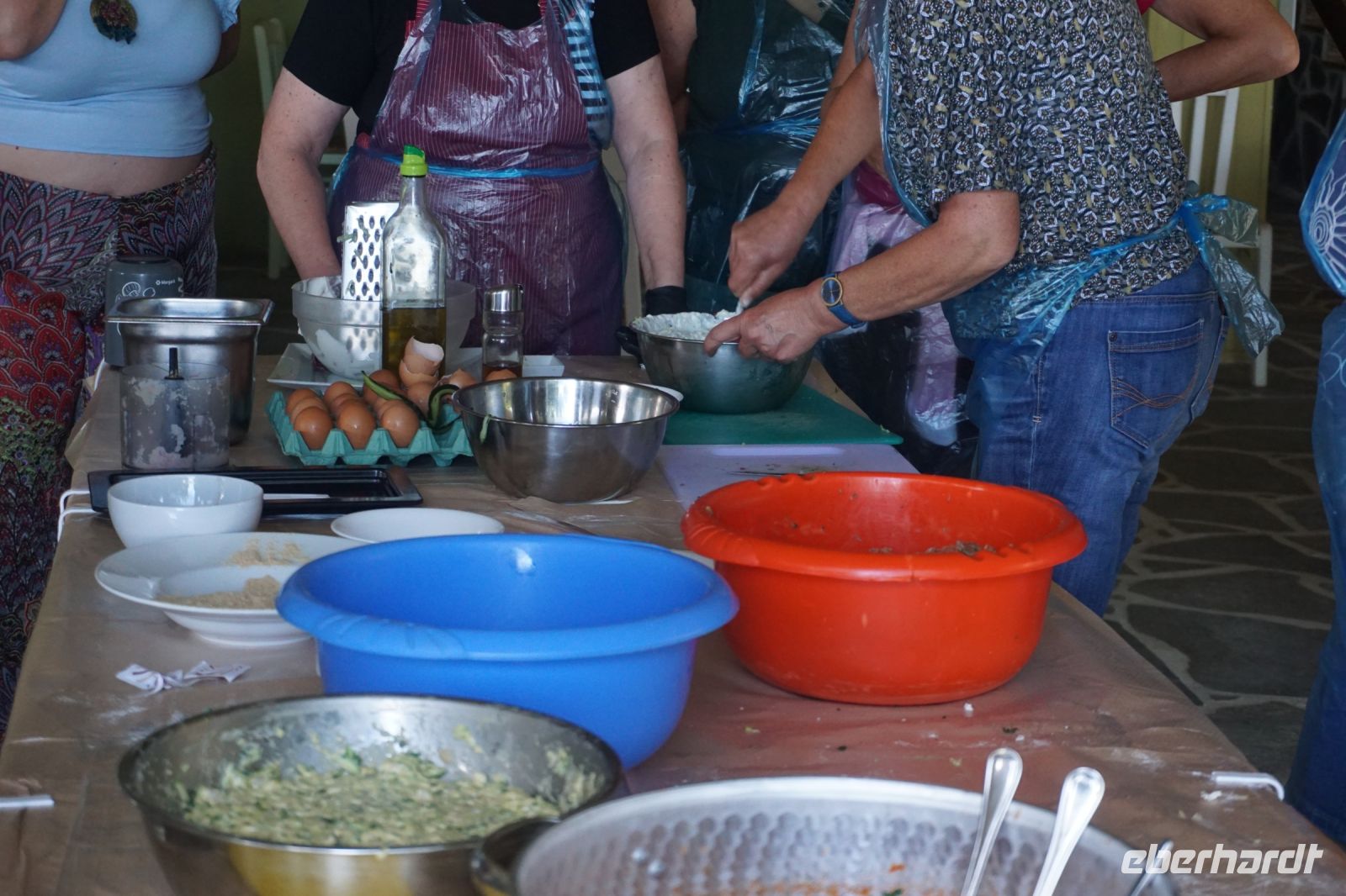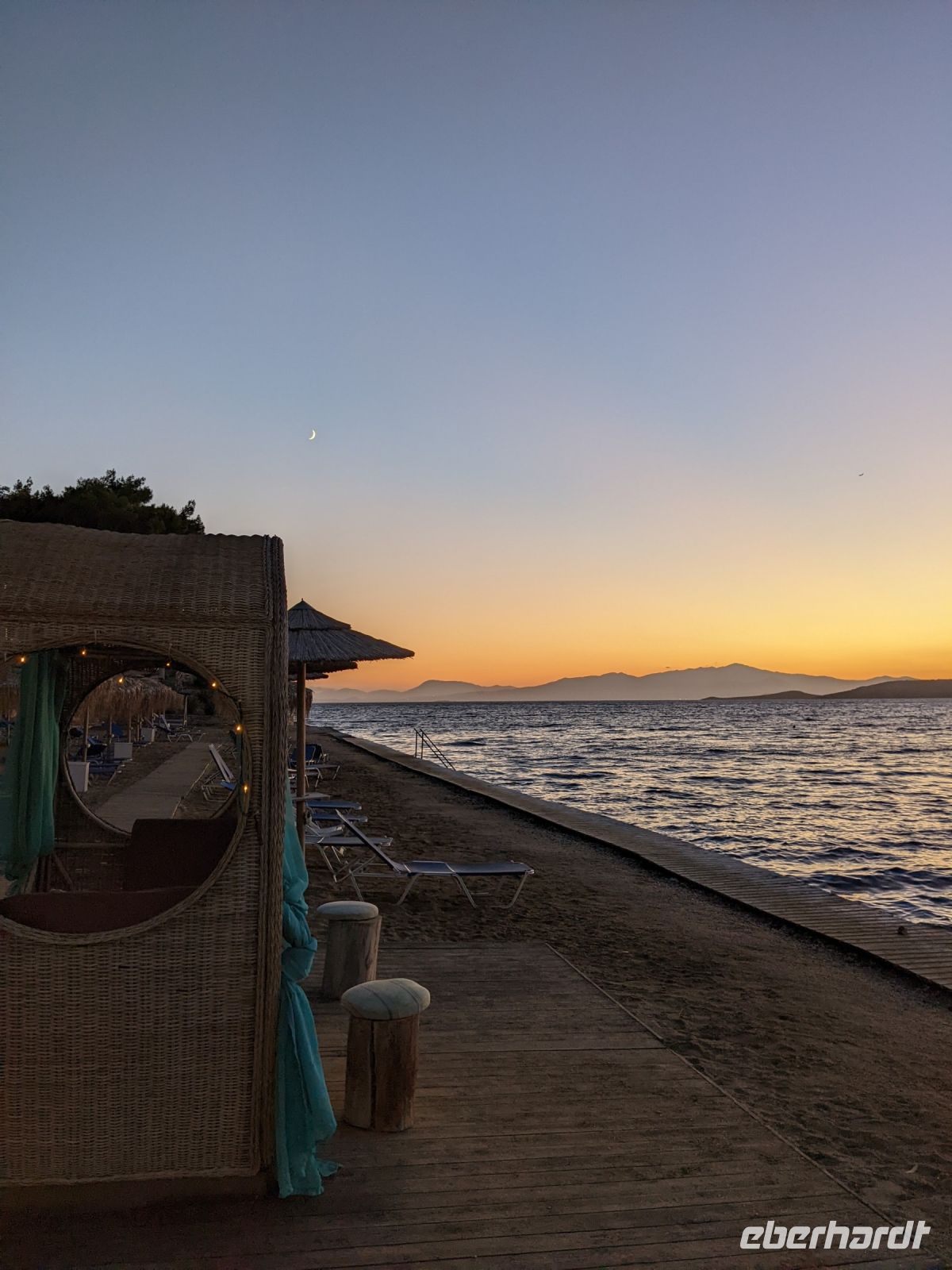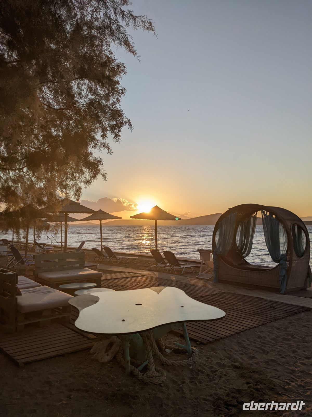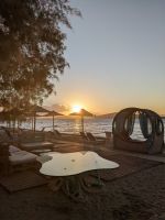 Anfangs noch etwas kalt morgens wurde uns schnell wärmer bei der gemeinsamen Yogastunde am Strand mit wunderschönem Ausblick. Spätestens als die ersten Sonnenstrahlen auf die Matten fielen und unsere Yogalehrerin mit verschiedenen Übungen versuchte uns mit uns selbst in Einklang zu bringen, trat ein sehr entspannendes Gefühl auf. Auch ohne Yogaerfahrung war diese Stunde machbar. Anschließend ging es ganz gemütlich zum Frühstück. Das Buffet bot jeden Tag eine Auswahl an Brötchen/Toast mit verschiedenen herzhaften und süßen Möglichkeiten zum Belegen sowie diverse Eivariationen, Quark, Yogurt, Müsli, Kuchen und Kekse. Um die Mittagszeit herum hatten wir einen Kochkurs auf dem Programm stehen. Hier bereiteten wir typische griechische Spezialitäten unter Anleitung der Hotelköchin zu. Dazu zählten gefüllte Paprika/Tomate, Tsatsiki, Fleisch- sowie Zucchinibällchen. Beim anschließenden gemeinsamen Verzehr konnten wir sehr stolz auf unsere Kochkünste sein. Alles hat hervorragend geschmeckt und als das Angebot kam, uns die genauen Rezepte zu geben, war die Begeisterung groß. Danach konnten wir den Nachmittag ganz nach unseren individuellen Wünschen gestalten. Einige gingen an den Strand oder die Hotelbar, um einen Kaffee zu trinken. Andere wiederum liefen in die Stadt auf der Suche nach Andenken, Mitbringseln oder Snacks. Man kann sich auch in eines der Cafés setzen und ein Eis bestellen. Generell gilt es jedoch zu beachten, dass von 14 bis 17.30 Uhr eine Siesta abgehalten wird - hier sind zwar noch einige Restaurants und Cafés geöffnet, aber bei Supermärkten und Geschäften steht man zumeist vor geschlossenen Türen. Wieder zurück im Hotel war der Sonnenuntergang auch perfekt von den Zimmern mit Meerblick zu beobachten. Auf der Sitzbank mit gemütlichem Polster lässt es sich hier wunderbar lesen oder einfach verträumt auf das Meer schauen. Die Hotelanlage selbst ist sehr schön gestaltet. So finden sich immer wieder liebevolle Details wie eine mit Treibholz dekorierte Dusche zum Abbrausen, wenn man vom Strand kommt. Nach dem Abendessen ging es dann daran einige Cocktails der Karte zu probieren und in großer Runde wurden Geschichten und Erfahrungen ausgetauscht.